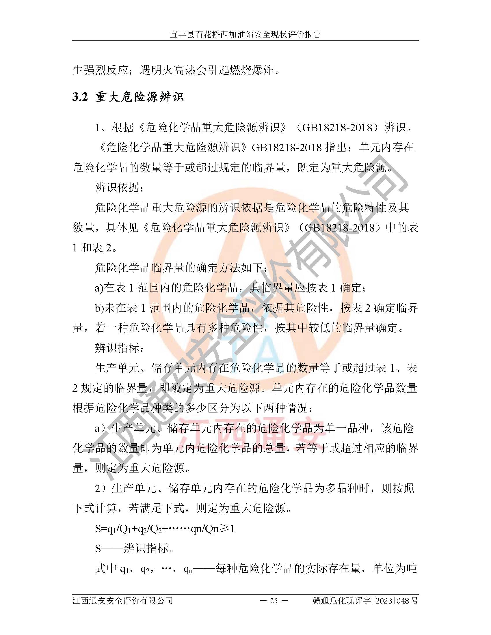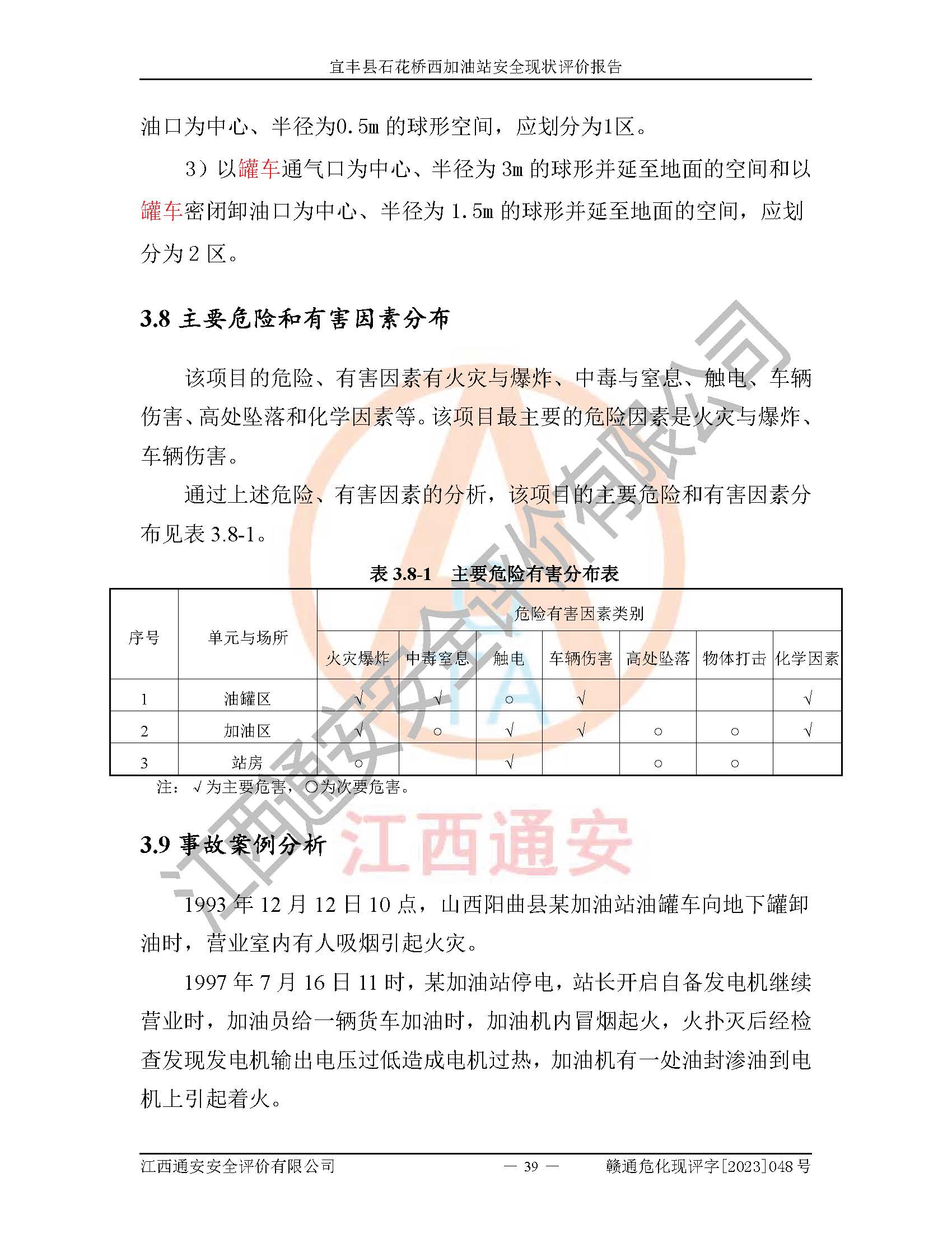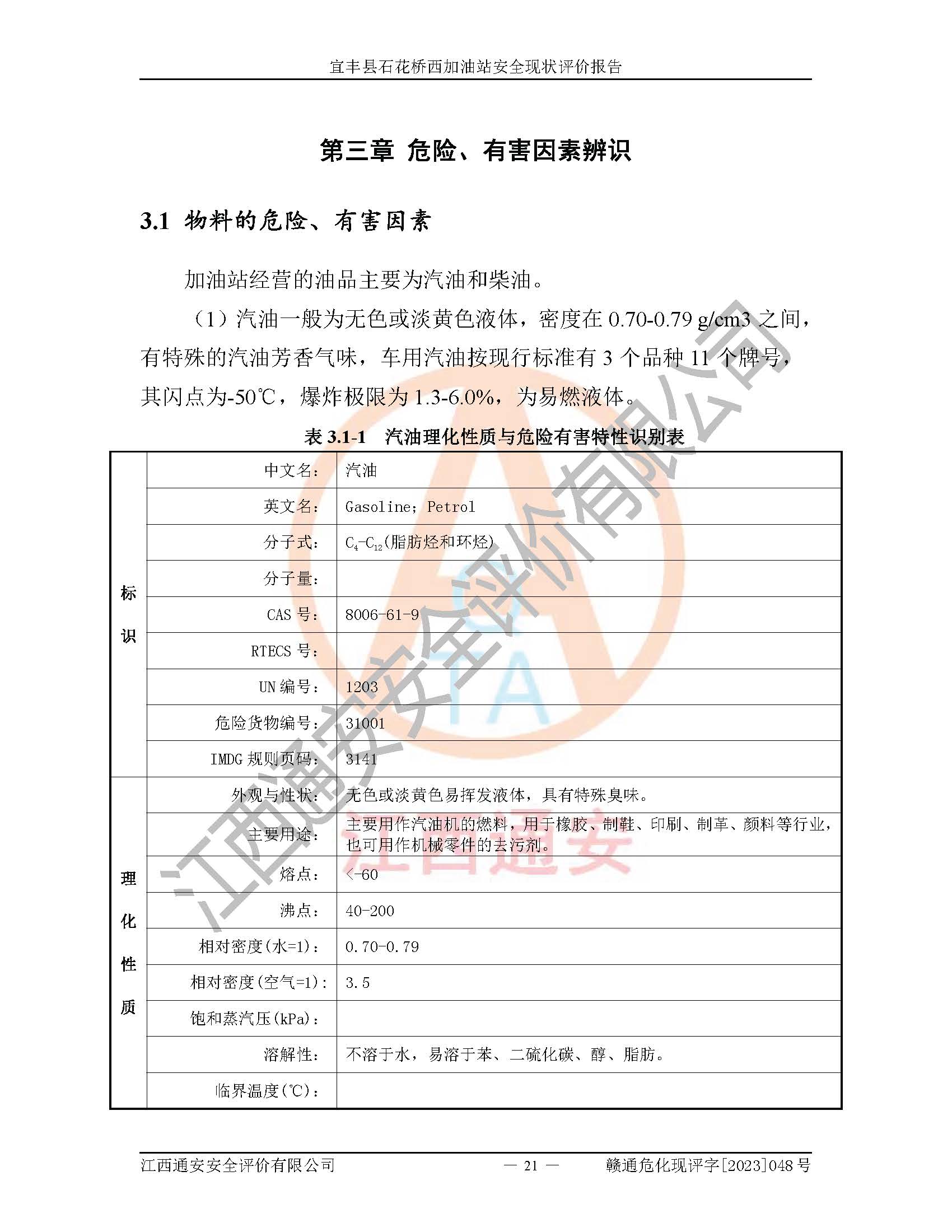 项目简介 | 本报告为宜丰县石花桥西加油站安全现状评价报告。宜丰县石花桥西加油站成立于2017年10月31日,位于江西省宜春市宜丰县桥西乡龚家坪,法定**人为李友根,现有员工6人,其中安全管理人员1人。该站主要经营0#柴油、92#汽油、95#汽油,站内设3台油罐,分别为容积40m3的0#柴油埋地卧式贮罐1台、容积30m3的92#汽油埋地卧式贮罐1台、容积30m3的95#汽油埋地卧式贮罐1台,*大存储量为100m³,实际油品折算总容量为80m3(柴油折半),属于三级加油站,该站危险化学品经营许可证**期限为2020年10月26日至2023年10月25日。 汽油和柴油均是化学品液体。汽油、柴油均为危险化学品,其中汽油火险分级为甲B类,其蒸汽与空气形成爆炸性气体,遇明火、高热易燃烧爆炸;柴油火险分级为丙A类,遇明火、高热或与氧化剂接触,有引起燃烧爆炸的危险。 | ||||