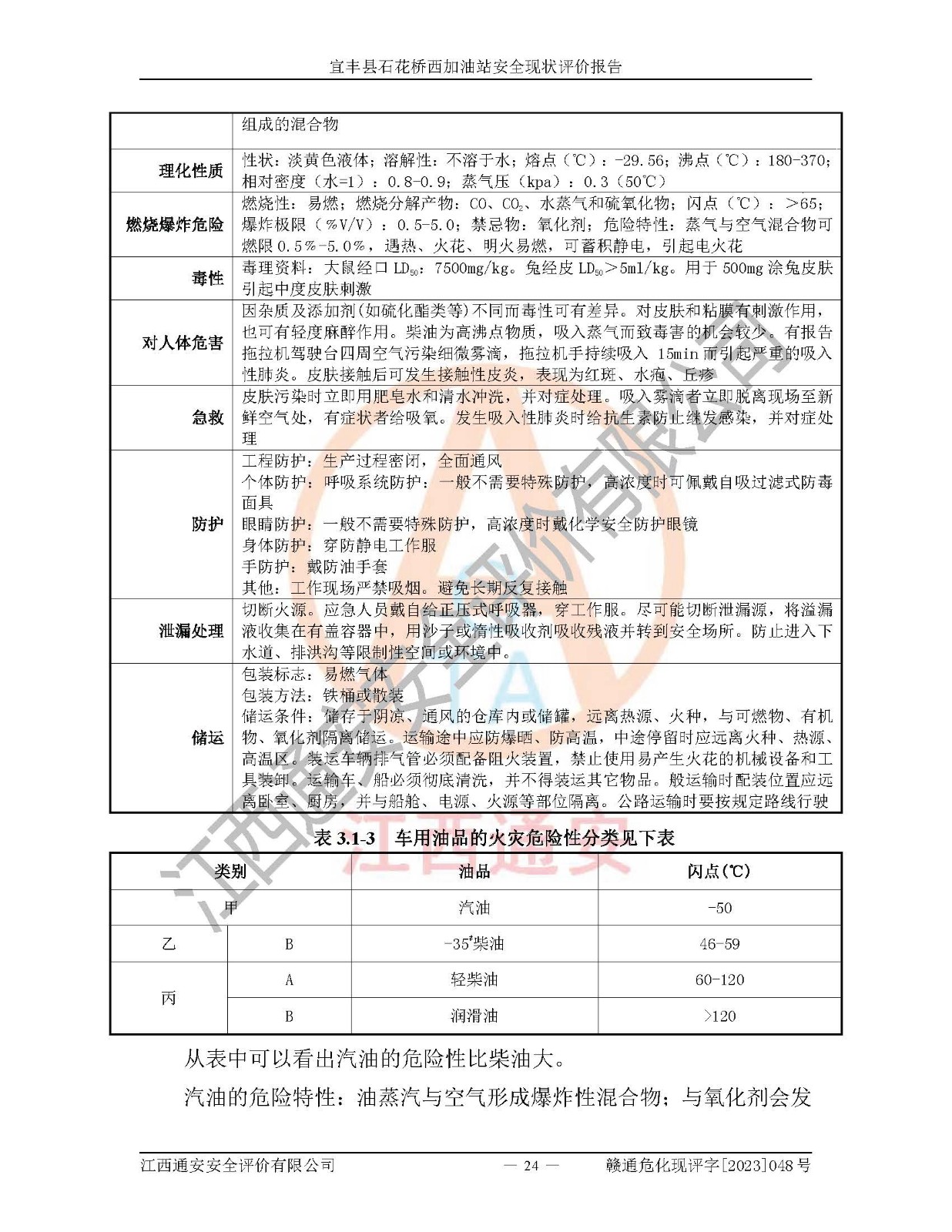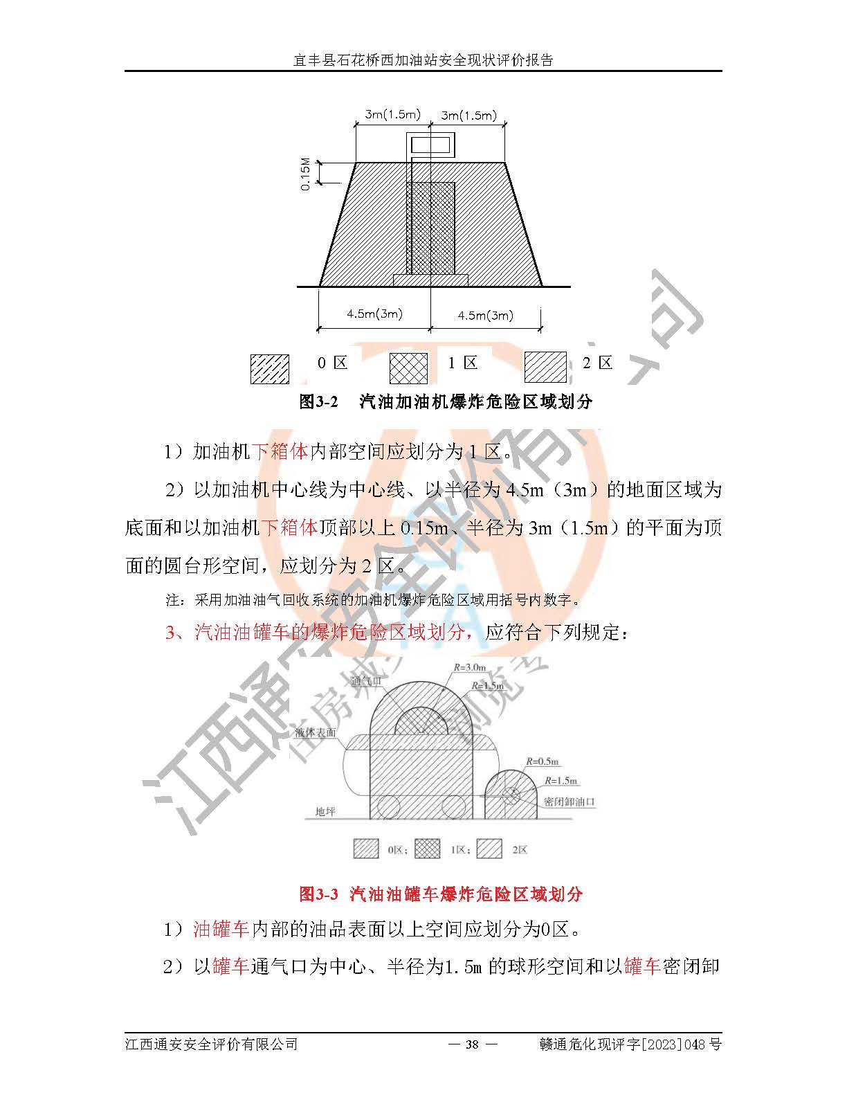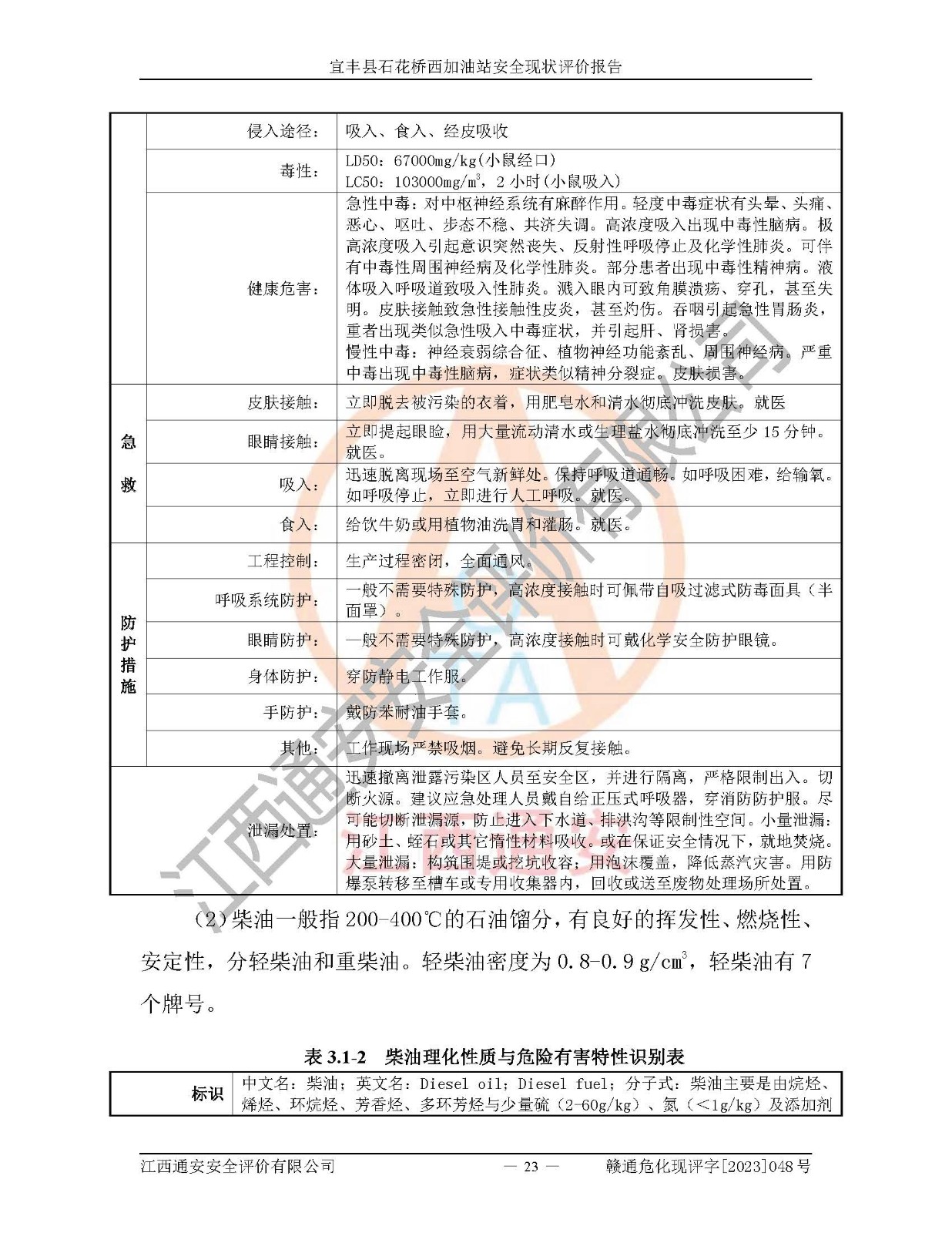 项目简介 | 本报告为宜丰县石花桥西加油站安全现状评价报告。宜丰县石花桥西加油站成立于2017年10月31日,位于江西省宜春市宜丰县桥西乡龚家坪,法定**人为李友根,现有员工6人,其中安全管理人员1人。该站主要经营0#柴油、92#汽油、95#汽油,站内设3台油罐,分别为容积40m3的0#柴油埋地卧式贮罐1台、容积30m3的92#汽油埋地卧式贮罐1台、容积30m3的95#汽油埋地卧式贮罐1台,*大存储量为100m³,实际油品折算总容量为80m3(柴油折半),属于三级加油站,该站危险化学品经营许可证**期限为2020年10月26日至2023年10月25日。 汽油和柴油均是化学品液体。汽油、柴油均为危险化学品,其中汽油火险分级为甲B类,其蒸汽与空气形成爆炸性气体,遇明火、高热易燃烧爆炸;柴油火险分级为丙A类,遇明火、高热或与氧化剂接触,有引起燃烧爆炸的危险。 | ||||