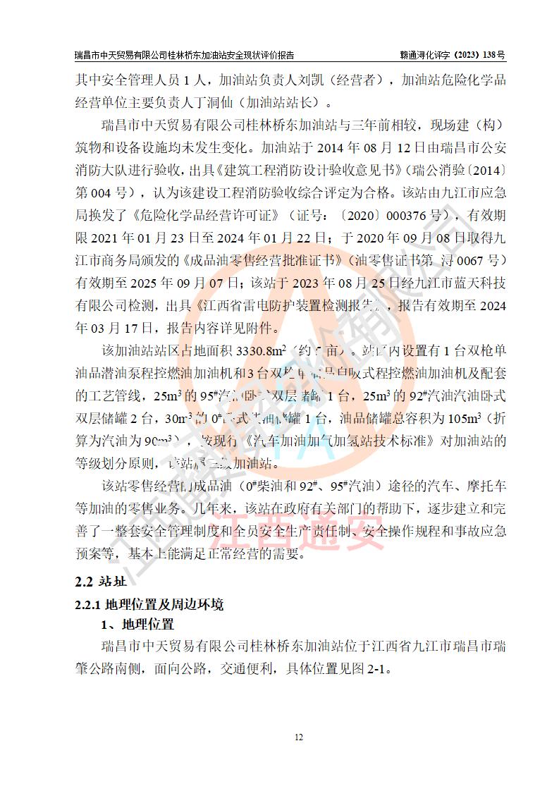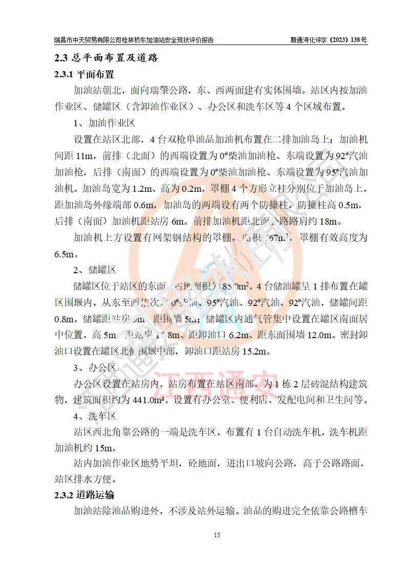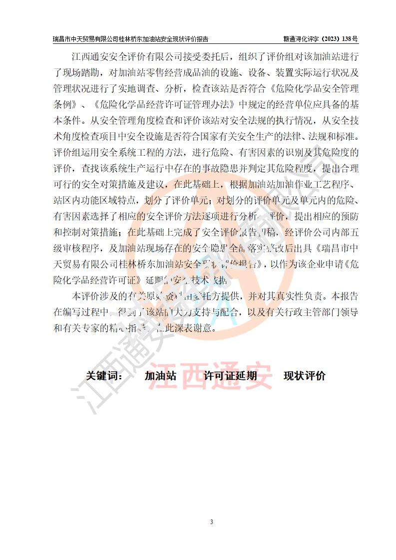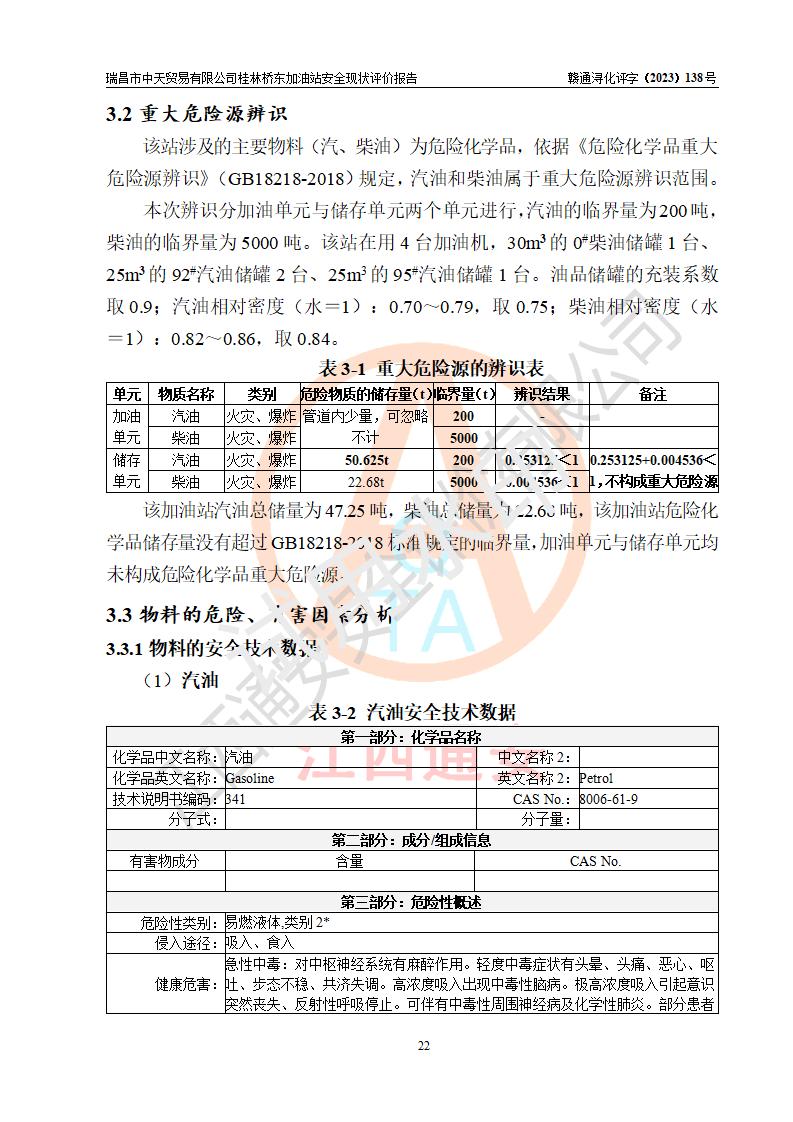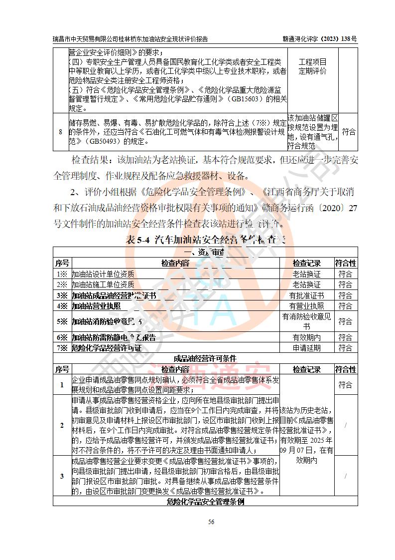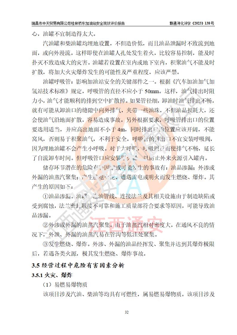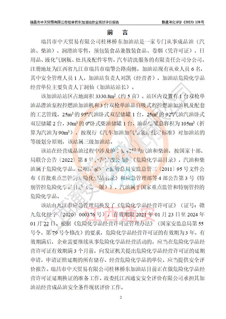 瑞昌市中天贸易有限公司桂林桥东加油站是一家专门从事成品油(汽油、柴油)、润滑油零售,预包装食品兼散装食品、卷烟(凭许可证)、日用品、液化气钢瓶、灶具及配件零售,汽车清洗服务的有限责任公司分公司,注册地址为江西省九江市瑞昌市瑞肇公路南侧。加油站现有从业人员6名,其中安全管理人员1人,加油站负责人刘凯(经营者),加油站危险化学品经营单位主要负责人丁洞仙(加油站站长)。 该加油站站区占地面积3330.8m2(约5亩)。站区内设置有1台双枪单油品潜油泵程控燃油加油机和3台双枪单油品自吸式程控燃油加油机及配套的工艺管线,25m3的95#汽油卧式双层储罐1台,25m3的92#汽油汽油卧式双层储罐2台,30m3的0#卧式柴油储罐1台,油品储罐总容积为105m3(折算为汽油为90m3),按现行《汽车加油加气加氢站技术标准》对加油站的等级划分原则,该站属三级加油站。 该站在经营成品油过程中涉及的主要物料为汽油和柴油,按**十部、局联合公告〔2022〕第8号公告修改公布的《危险化学品目录》,汽油和柴油属于危险化学品。根据**安全监管总局安监总管三〔2011〕95号文件公布《首批重点监管的危险化学品名录》和应急管理部等4部公告第3号《特别管控危险化学品目录(**版)》,汽油属于**重点监管和特别管控的危险化学品。 该站由九江市应急管理局换发了《危险化学品经营许可证》(证号:赣九危化经字〔2020〕000376号),**期限2021年01月23日至2024年01月22日。根据《危险化学品经营许可证管理办法》(**安监总局第55号令,第79号令修改)的要求,危险化学品经营许可证的**期为3年。**期满后,企业需要继续从事危险化学品经营活动的,应当在危险化学品经营许可证**期满3个月前,向发证机关提出危险化学品经营许可证的延期申请,申请证照延期的所有储存、经营危险化学品的单位,应当提供安全评价报告。瑞昌市中天贸易有限公司桂林桥东加油站目前正在做危险化学品经营许可证延期换证的准备工作,故委托江西通安安全评价有限公司承担其加油站经营成品油安全条件现状评价工作。 江西通安安全评价有限公司接受委托后,组织了评价组对该加油站进行了现场踏勘,对加油站零售经营成品油的设施、设备、装置实际运行状况及管理状况进行了实地调查、分析,检查该站是否符合《危险化学品安全管理条例》、《危险化学品经营许可证管理办法》中规定的经营单位应具备的基本条件。从安全管理角度检查和评价该站对安全法规的执行情况,从安全技术角度检查项目中安全设施是否符合**有关安全生产的法律、法规和标准。评价组运用安全系统工程的方法,进行危险、有害因素的识别及其危险度的评价,查找该系统生产运行中存在的事故隐患并判定其危险程度,提出合理可行的安全对策措施及建议,在此基础上,根据加油站加油作业工艺程序、站区内功能区域特点,划分了评价单元;对划分的评价单元及单元内的危险、有害因素选择了相应的安全评价方法逐项进行分析、评价,提出相应的预防和控制对策措施;在此基础上完成了安全评价报告初稿,经评价公司内部五级审核程序,及加油站现场存在的安全隐患**落实整改后出具《瑞昌市中天贸易有限公司桂林桥东加油站安全现状评价报告》,以作为该企业申请《危险化学品经营许可证》延期的安全技术依据。 |