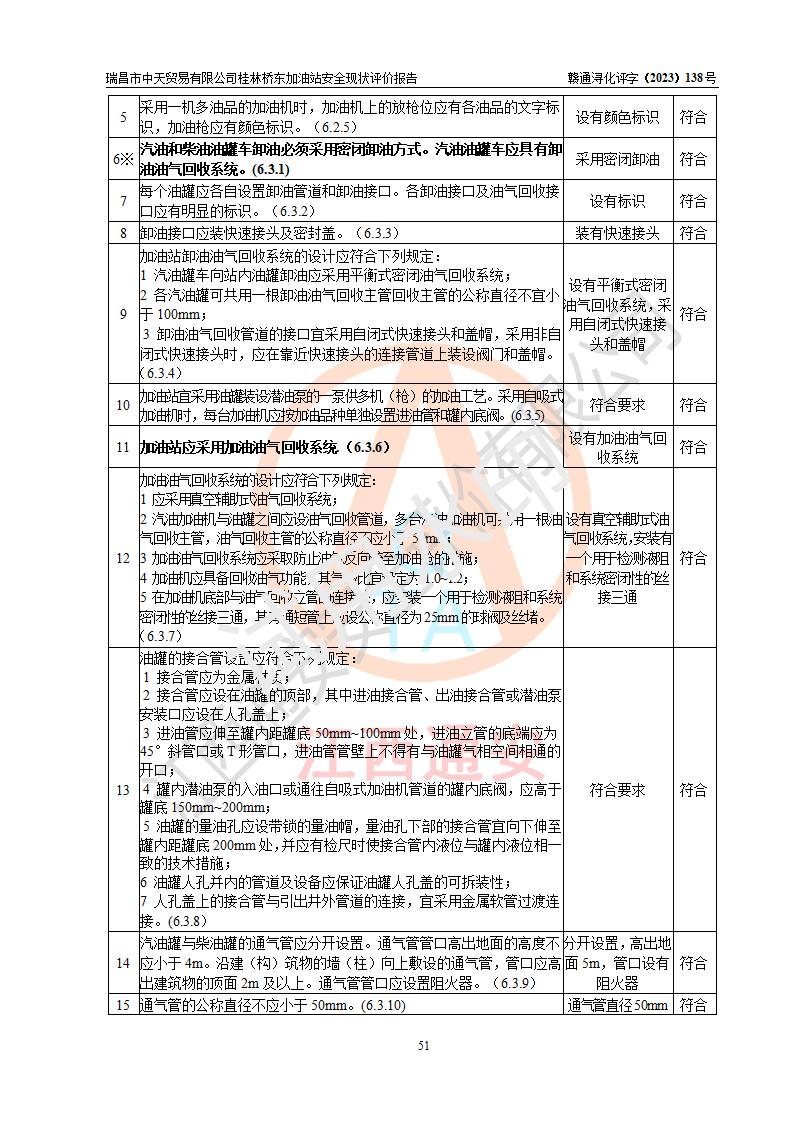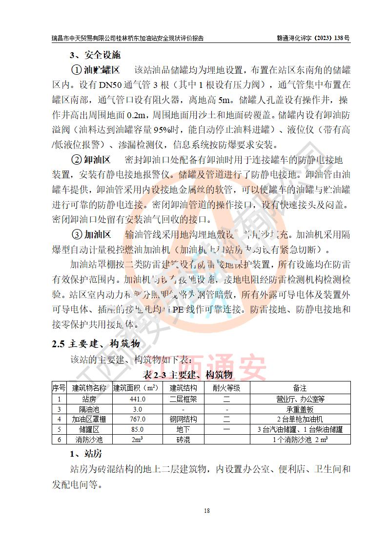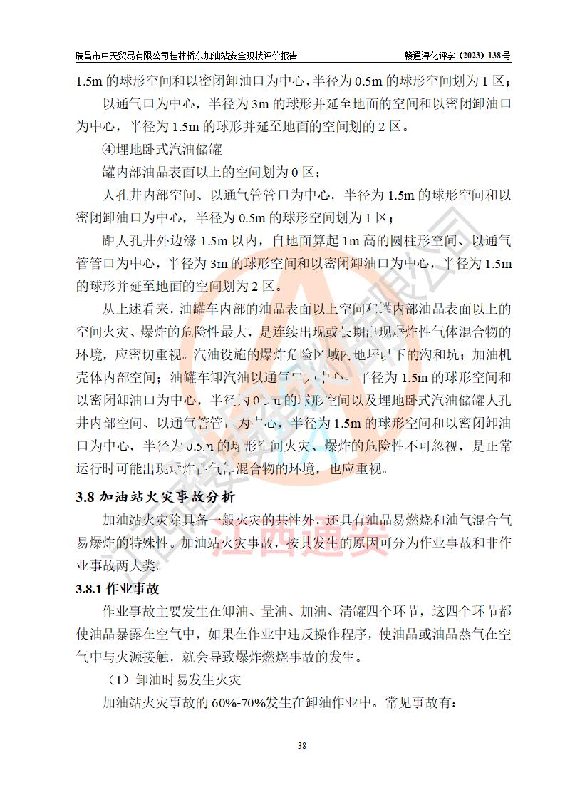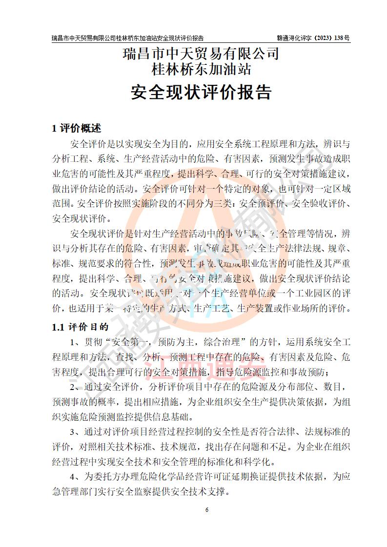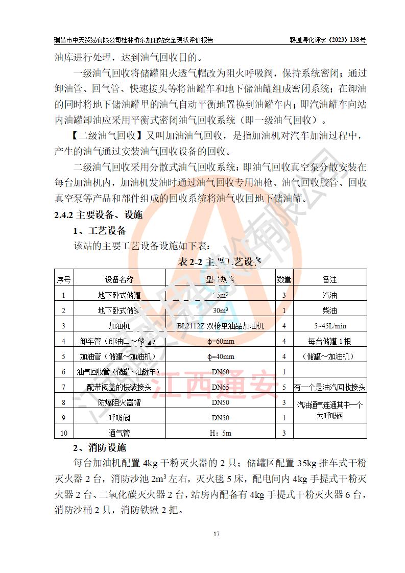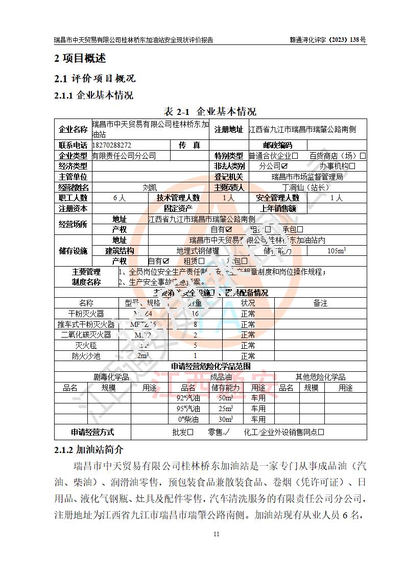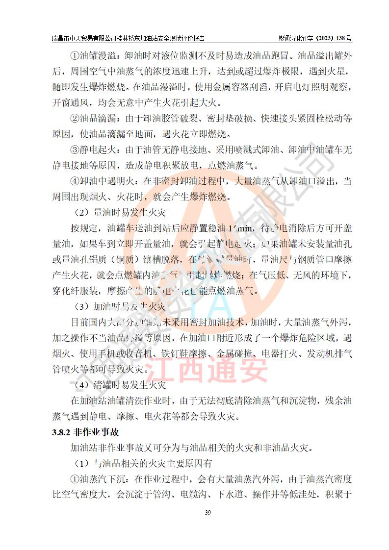 瑞昌市中天贸易有限公司桂林桥东加油站是一家专门从事成品油(汽油、柴油)、润滑油零售,预包装食品兼散装食品、卷烟(凭许可证)、日用品、液化气钢瓶、灶具及配件零售,汽车清洗服务的有限责任公司分公司,注册地址为江西省九江市瑞昌市瑞肇公路南侧。加油站现有从业人员6名,其中安全管理人员1人,加油站负责人刘凯(经营者),加油站危险化学品经营单位主要负责人丁洞仙(加油站站长)。 该加油站站区占地面积3330.8m2(约5亩)。站区内设置有1台双枪单油品潜油泵程控燃油加油机和3台双枪单油品自吸式程控燃油加油机及配套的工艺管线,25m3的95#汽油卧式双层储罐1台,25m3的92#汽油汽油卧式双层储罐2台,30m3的0#卧式柴油储罐1台,油品储罐总容积为105m3(折算为汽油为90m3),按现行《汽车加油加气加氢站技术标准》对加油站的等级划分原则,该站属三级加油站。 该站在经营成品油过程中涉及的主要物料为汽油和柴油,按**十部、局联合公告〔2022〕第8号公告修改公布的《危险化学品目录》,汽油和柴油属于危险化学品。根据**安全监管总局安监总管三〔2011〕95号文件公布《首批重点监管的危险化学品名录》和应急管理部等4部公告第3号《特别管控危险化学品目录(**版)》,汽油属于**重点监管和特别管控的危险化学品。 该站由九江市应急管理局换发了《危险化学品经营许可证》(证号:赣九危化经字〔2020〕000376号),**期限2021年01月23日至2024年01月22日。根据《危险化学品经营许可证管理办法》(**安监总局第55号令,第79号令修改)的要求,危险化学品经营许可证的**期为3年。**期满后,企业需要继续从事危险化学品经营活动的,应当在危险化学品经营许可证**期满3个月前,向发证机关提出危险化学品经营许可证的延期申请,申请证照延期的所有储存、经营危险化学品的单位,应当提供安全评价报告。瑞昌市中天贸易有限公司桂林桥东加油站目前正在做危险化学品经营许可证延期换证的准备工作,故委托江西通安安全评价有限公司承担其加油站经营成品油安全条件现状评价工作。 江西通安安全评价有限公司接受委托后,组织了评价组对该加油站进行了现场踏勘,对加油站零售经营成品油的设施、设备、装置实际运行状况及管理状况进行了实地调查、分析,检查该站是否符合《危险化学品安全管理条例》、《危险化学品经营许可证管理办法》中规定的经营单位应具备的基本条件。从安全管理角度检查和评价该站对安全法规的执行情况,从安全技术角度检查项目中安全设施是否符合**有关安全生产的法律、法规和标准。评价组运用安全系统工程的方法,进行危险、有害因素的识别及其危险度的评价,查找该系统生产运行中存在的事故隐患并判定其危险程度,提出合理可行的安全对策措施及建议,在此基础上,根据加油站加油作业工艺程序、站区内功能区域特点,划分了评价单元;对划分的评价单元及单元内的危险、有害因素选择了相应的安全评价方法逐项进行分析、评价,提出相应的预防和控制对策措施;在此基础上完成了安全评价报告初稿,经评价公司内部五级审核程序,及加油站现场存在的安全隐患**落实整改后出具《瑞昌市中天贸易有限公司桂林桥东加油站安全现状评价报告》,以作为该企业申请《危险化学品经营许可证》延期的安全技术依据。 |