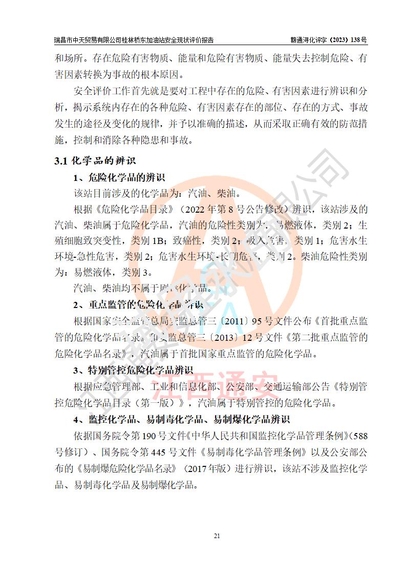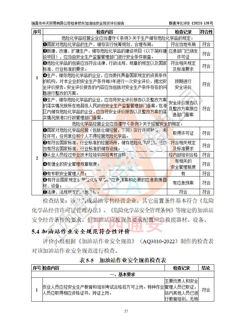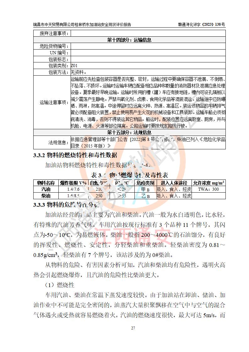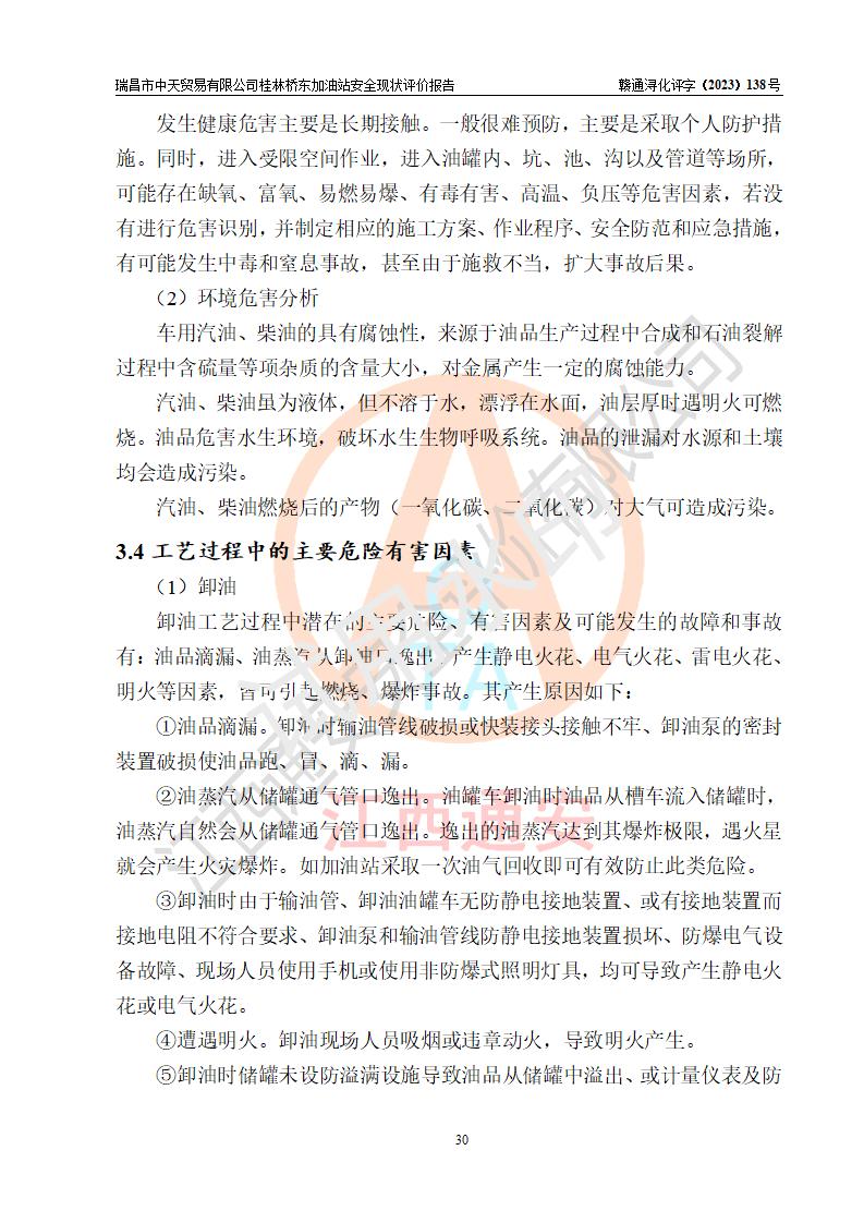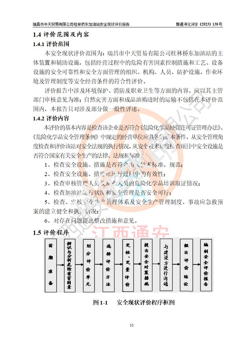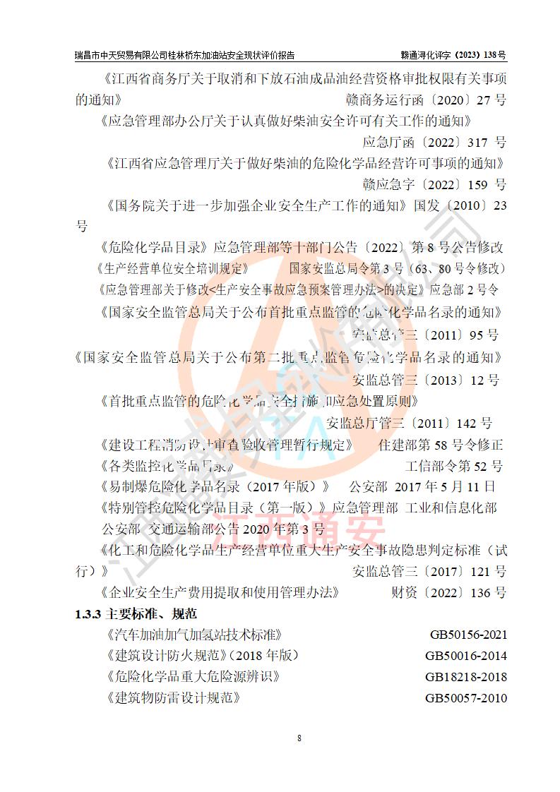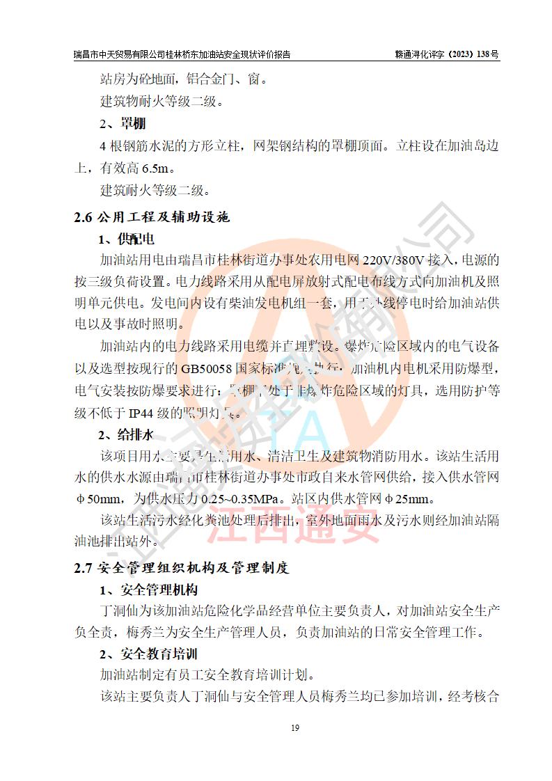 瑞昌市中天贸易有限公司桂林桥东加油站是一家专门从事成品油(汽油、柴油)、润滑油零售,预包装食品兼散装食品、卷烟(凭许可证)、日用品、液化气钢瓶、灶具及配件零售,汽车清洗服务的有限责任公司分公司,注册地址为江西省九江市瑞昌市瑞肇公路南侧。加油站现有从业人员6名,其中安全管理人员1人,加油站负责人刘凯(经营者),加油站危险化学品经营单位主要负责人丁洞仙(加油站站长)。 该加油站站区占地面积3330.8m2(约5亩)。站区内设置有1台双枪单油品潜油泵程控燃油加油机和3台双枪单油品自吸式程控燃油加油机及配套的工艺管线,25m3的95#汽油卧式双层储罐1台,25m3的92#汽油汽油卧式双层储罐2台,30m3的0#卧式柴油储罐1台,油品储罐总容积为105m3(折算为汽油为90m3),按现行《汽车加油加气加氢站技术标准》对加油站的等级划分原则,该站属三级加油站。 该站在经营成品油过程中涉及的主要物料为汽油和柴油,按**十部、局联合公告〔2022〕第8号公告修改公布的《危险化学品目录》,汽油和柴油属于危险化学品。根据**安全监管总局安监总管三〔2011〕95号文件公布《首批重点监管的危险化学品名录》和应急管理部等4部公告第3号《特别管控危险化学品目录(**版)》,汽油属于**重点监管和特别管控的危险化学品。 该站由九江市应急管理局换发了《危险化学品经营许可证》(证号:赣九危化经字〔2020〕000376号),**期限2021年01月23日至2024年01月22日。根据《危险化学品经营许可证管理办法》(**安监总局第55号令,第79号令修改)的要求,危险化学品经营许可证的**期为3年。**期满后,企业需要继续从事危险化学品经营活动的,应当在危险化学品经营许可证**期满3个月前,向发证机关提出危险化学品经营许可证的延期申请,申请证照延期的所有储存、经营危险化学品的单位,应当提供安全评价报告。瑞昌市中天贸易有限公司桂林桥东加油站目前正在做危险化学品经营许可证延期换证的准备工作,故委托江西通安安全评价有限公司承担其加油站经营成品油安全条件现状评价工作。 江西通安安全评价有限公司接受委托后,组织了评价组对该加油站进行了现场踏勘,对加油站零售经营成品油的设施、设备、装置实际运行状况及管理状况进行了实地调查、分析,检查该站是否符合《危险化学品安全管理条例》、《危险化学品经营许可证管理办法》中规定的经营单位应具备的基本条件。从安全管理角度检查和评价该站对安全法规的执行情况,从安全技术角度检查项目中安全设施是否符合**有关安全生产的法律、法规和标准。评价组运用安全系统工程的方法,进行危险、有害因素的识别及其危险度的评价,查找该系统生产运行中存在的事故隐患并判定其危险程度,提出合理可行的安全对策措施及建议,在此基础上,根据加油站加油作业工艺程序、站区内功能区域特点,划分了评价单元;对划分的评价单元及单元内的危险、有害因素选择了相应的安全评价方法逐项进行分析、评价,提出相应的预防和控制对策措施;在此基础上完成了安全评价报告初稿,经评价公司内部五级审核程序,及加油站现场存在的安全隐患**落实整改后出具《瑞昌市中天贸易有限公司桂林桥东加油站安全现状评价报告》,以作为该企业申请《危险化学品经营许可证》延期的安全技术依据。 |