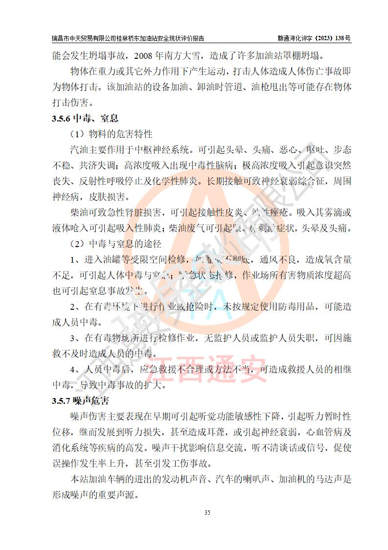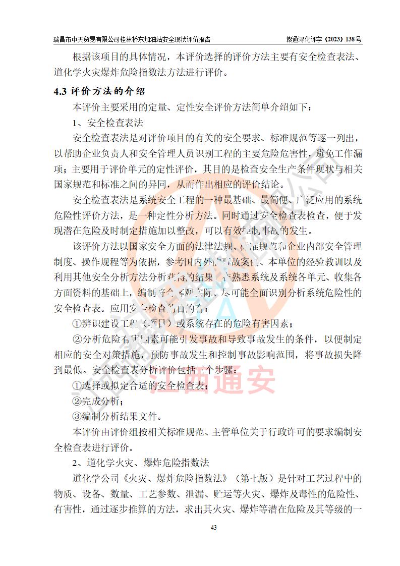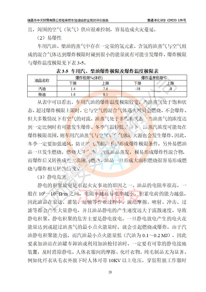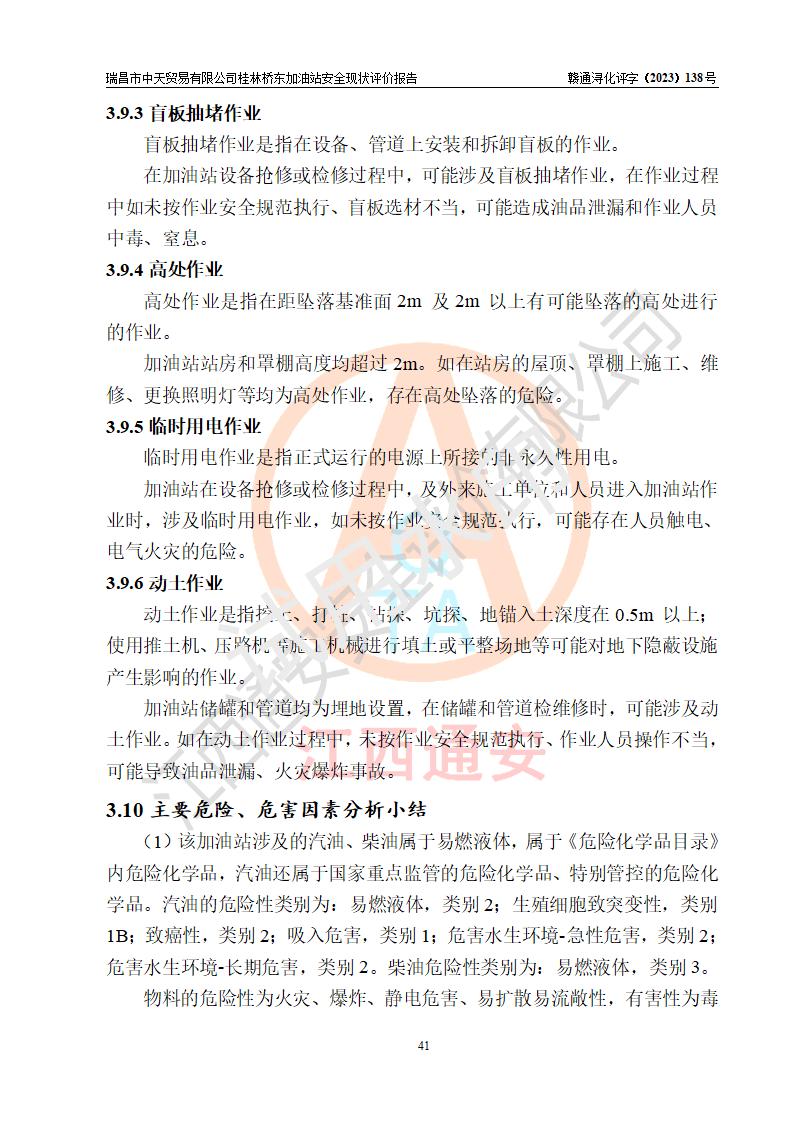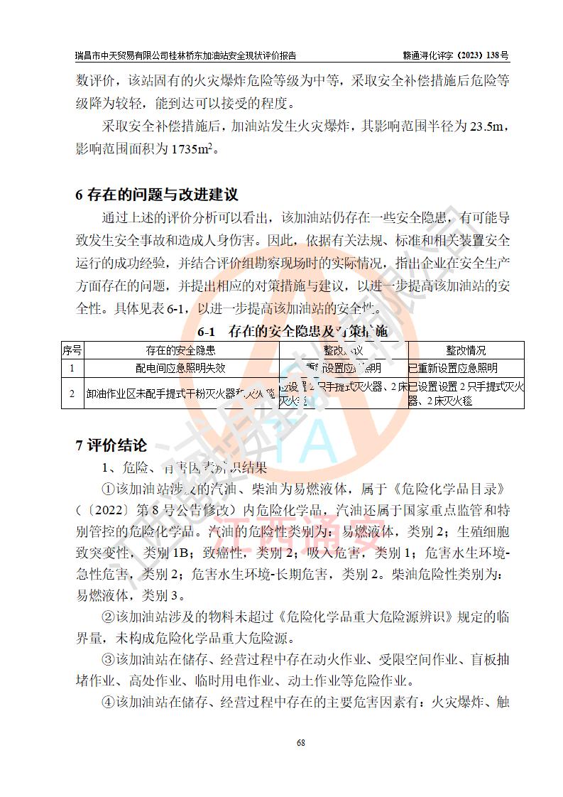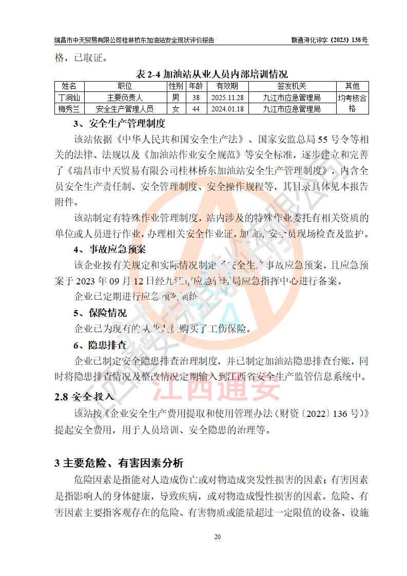 瑞昌市中天贸易有限公司桂林桥东加油站是一家专门从事成品油(汽油、柴油)、润滑油零售,预包装食品兼散装食品、卷烟(凭许可证)、日用品、液化气钢瓶、灶具及配件零售,汽车清洗服务的有限责任公司分公司,注册地址为江西省九江市瑞昌市瑞肇公路南侧。加油站现有从业人员6名,其中安全管理人员1人,加油站负责人刘凯(经营者),加油站危险化学品经营单位主要负责人丁洞仙(加油站站长)。 该加油站站区占地面积3330.8m2(约5亩)。站区内设置有1台双枪单油品潜油泵程控燃油加油机和3台双枪单油品自吸式程控燃油加油机及配套的工艺管线,25m3的95#汽油卧式双层储罐1台,25m3的92#汽油汽油卧式双层储罐2台,30m3的0#卧式柴油储罐1台,油品储罐总容积为105m3(折算为汽油为90m3),按现行《汽车加油加气加氢站技术标准》对加油站的等级划分原则,该站属三级加油站。 该站在经营成品油过程中涉及的主要物料为汽油和柴油,按**十部、局联合公告〔2022〕第8号公告修改公布的《危险化学品目录》,汽油和柴油属于危险化学品。根据**安全监管总局安监总管三〔2011〕95号文件公布《首批重点监管的危险化学品名录》和应急管理部等4部公告第3号《特别管控危险化学品目录(**版)》,汽油属于**重点监管和特别管控的危险化学品。 该站由九江市应急管理局换发了《危险化学品经营许可证》(证号:赣九危化经字〔2020〕000376号),**期限2021年01月23日至2024年01月22日。根据《危险化学品经营许可证管理办法》(**安监总局第55号令,第79号令修改)的要求,危险化学品经营许可证的**期为3年。**期满后,企业需要继续从事危险化学品经营活动的,应当在危险化学品经营许可证**期满3个月前,向发证机关提出危险化学品经营许可证的延期申请,申请证照延期的所有储存、经营危险化学品的单位,应当提供安全评价报告。瑞昌市中天贸易有限公司桂林桥东加油站目前正在做危险化学品经营许可证延期换证的准备工作,故委托江西通安安全评价有限公司承担其加油站经营成品油安全条件现状评价工作。 江西通安安全评价有限公司接受委托后,组织了评价组对该加油站进行了现场踏勘,对加油站零售经营成品油的设施、设备、装置实际运行状况及管理状况进行了实地调查、分析,检查该站是否符合《危险化学品安全管理条例》、《危险化学品经营许可证管理办法》中规定的经营单位应具备的基本条件。从安全管理角度检查和评价该站对安全法规的执行情况,从安全技术角度检查项目中安全设施是否符合**有关安全生产的法律、法规和标准。评价组运用安全系统工程的方法,进行危险、有害因素的识别及其危险度的评价,查找该系统生产运行中存在的事故隐患并判定其危险程度,提出合理可行的安全对策措施及建议,在此基础上,根据加油站加油作业工艺程序、站区内功能区域特点,划分了评价单元;对划分的评价单元及单元内的危险、有害因素选择了相应的安全评价方法逐项进行分析、评价,提出相应的预防和控制对策措施;在此基础上完成了安全评价报告初稿,经评价公司内部五级审核程序,及加油站现场存在的安全隐患**落实整改后出具《瑞昌市中天贸易有限公司桂林桥东加油站安全现状评价报告》,以作为该企业申请《危险化学品经营许可证》延期的安全技术依据。 |