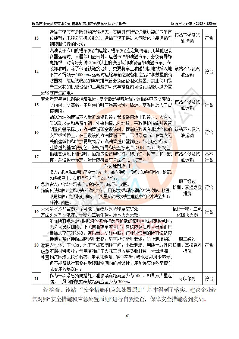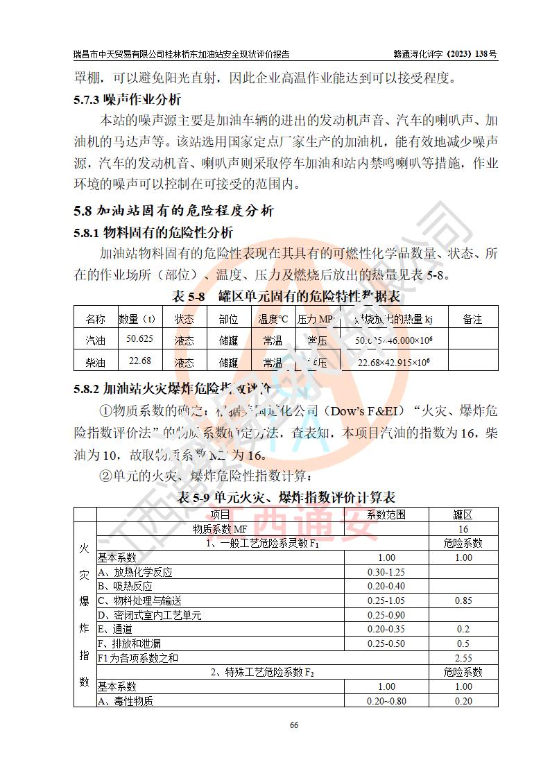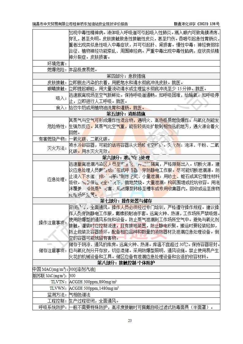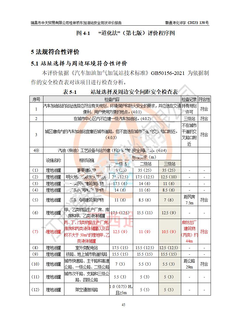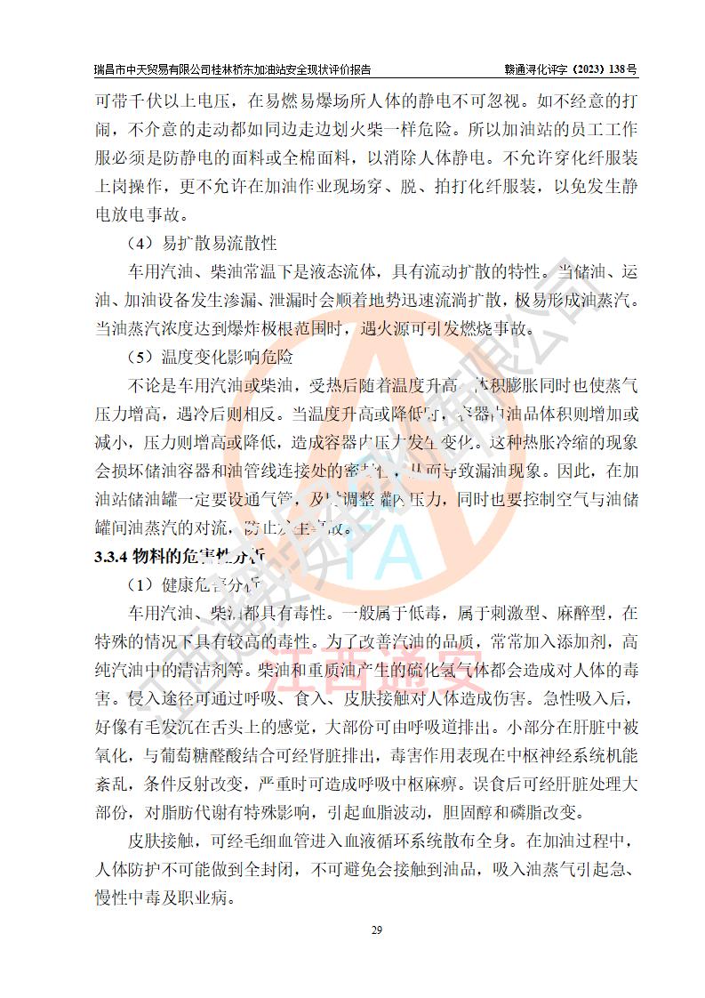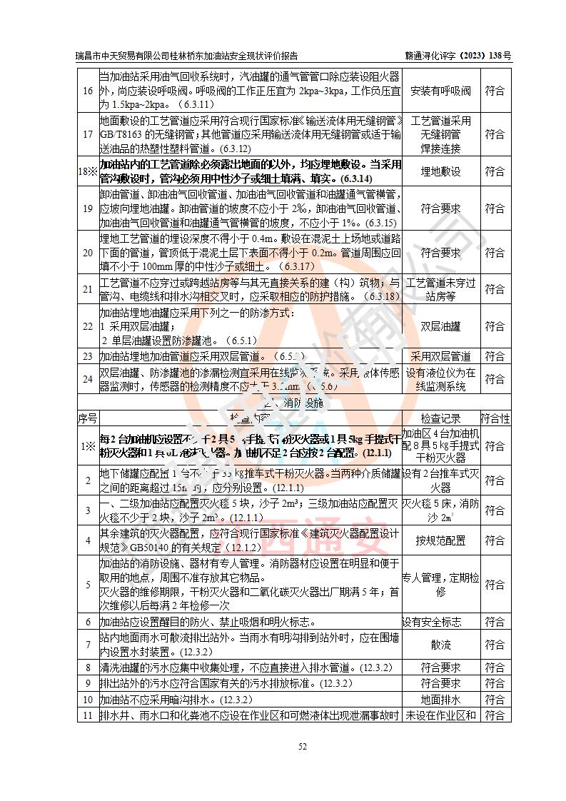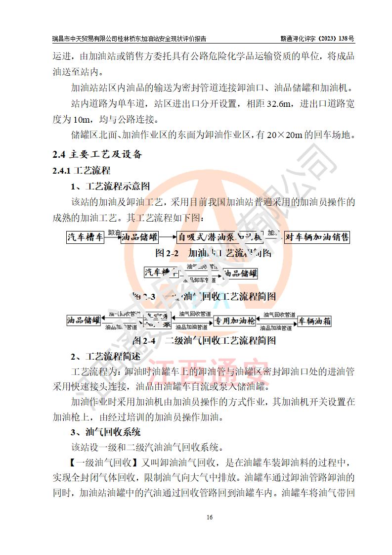 瑞昌市中天贸易有限公司桂林桥东加油站是一家专门从事成品油(汽油、柴油)、润滑油零售,预包装食品兼散装食品、卷烟(凭许可证)、日用品、液化气钢瓶、灶具及配件零售,汽车清洗服务的有限责任公司分公司,注册地址为江西省九江市瑞昌市瑞肇公路南侧。加油站现有从业人员6名,其中安全管理人员1人,加油站负责人刘凯(经营者),加油站危险化学品经营单位主要负责人丁洞仙(加油站站长)。 该加油站站区占地面积3330.8m2(约5亩)。站区内设置有1台双枪单油品潜油泵程控燃油加油机和3台双枪单油品自吸式程控燃油加油机及配套的工艺管线,25m3的95#汽油卧式双层储罐1台,25m3的92#汽油汽油卧式双层储罐2台,30m3的0#卧式柴油储罐1台,油品储罐总容积为105m3(折算为汽油为90m3),按现行《汽车加油加气加氢站技术标准》对加油站的等级划分原则,该站属三级加油站。 该站在经营成品油过程中涉及的主要物料为汽油和柴油,按**十部、局联合公告〔2022〕第8号公告修改公布的《危险化学品目录》,汽油和柴油属于危险化学品。根据**安全监管总局安监总管三〔2011〕95号文件公布《首批重点监管的危险化学品名录》和应急管理部等4部公告第3号《特别管控危险化学品目录(**版)》,汽油属于**重点监管和特别管控的危险化学品。 该站由九江市应急管理局换发了《危险化学品经营许可证》(证号:赣九危化经字〔2020〕000376号),**期限2021年01月23日至2024年01月22日。根据《危险化学品经营许可证管理办法》(**安监总局第55号令,第79号令修改)的要求,危险化学品经营许可证的**期为3年。**期满后,企业需要继续从事危险化学品经营活动的,应当在危险化学品经营许可证**期满3个月前,向发证机关提出危险化学品经营许可证的延期申请,申请证照延期的所有储存、经营危险化学品的单位,应当提供安全评价报告。瑞昌市中天贸易有限公司桂林桥东加油站目前正在做危险化学品经营许可证延期换证的准备工作,故委托江西通安安全评价有限公司承担其加油站经营成品油安全条件现状评价工作。 江西通安安全评价有限公司接受委托后,组织了评价组对该加油站进行了现场踏勘,对加油站零售经营成品油的设施、设备、装置实际运行状况及管理状况进行了实地调查、分析,检查该站是否符合《危险化学品安全管理条例》、《危险化学品经营许可证管理办法》中规定的经营单位应具备的基本条件。从安全管理角度检查和评价该站对安全法规的执行情况,从安全技术角度检查项目中安全设施是否符合**有关安全生产的法律、法规和标准。评价组运用安全系统工程的方法,进行危险、有害因素的识别及其危险度的评价,查找该系统生产运行中存在的事故隐患并判定其危险程度,提出合理可行的安全对策措施及建议,在此基础上,根据加油站加油作业工艺程序、站区内功能区域特点,划分了评价单元;对划分的评价单元及单元内的危险、有害因素选择了相应的安全评价方法逐项进行分析、评价,提出相应的预防和控制对策措施;在此基础上完成了安全评价报告初稿,经评价公司内部五级审核程序,及加油站现场存在的安全隐患**落实整改后出具《瑞昌市中天贸易有限公司桂林桥东加油站安全现状评价报告》,以作为该企业申请《危险化学品经营许可证》延期的安全技术依据。 |