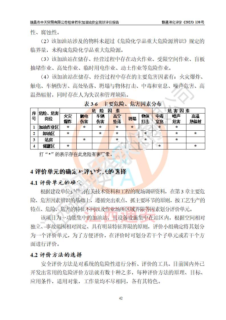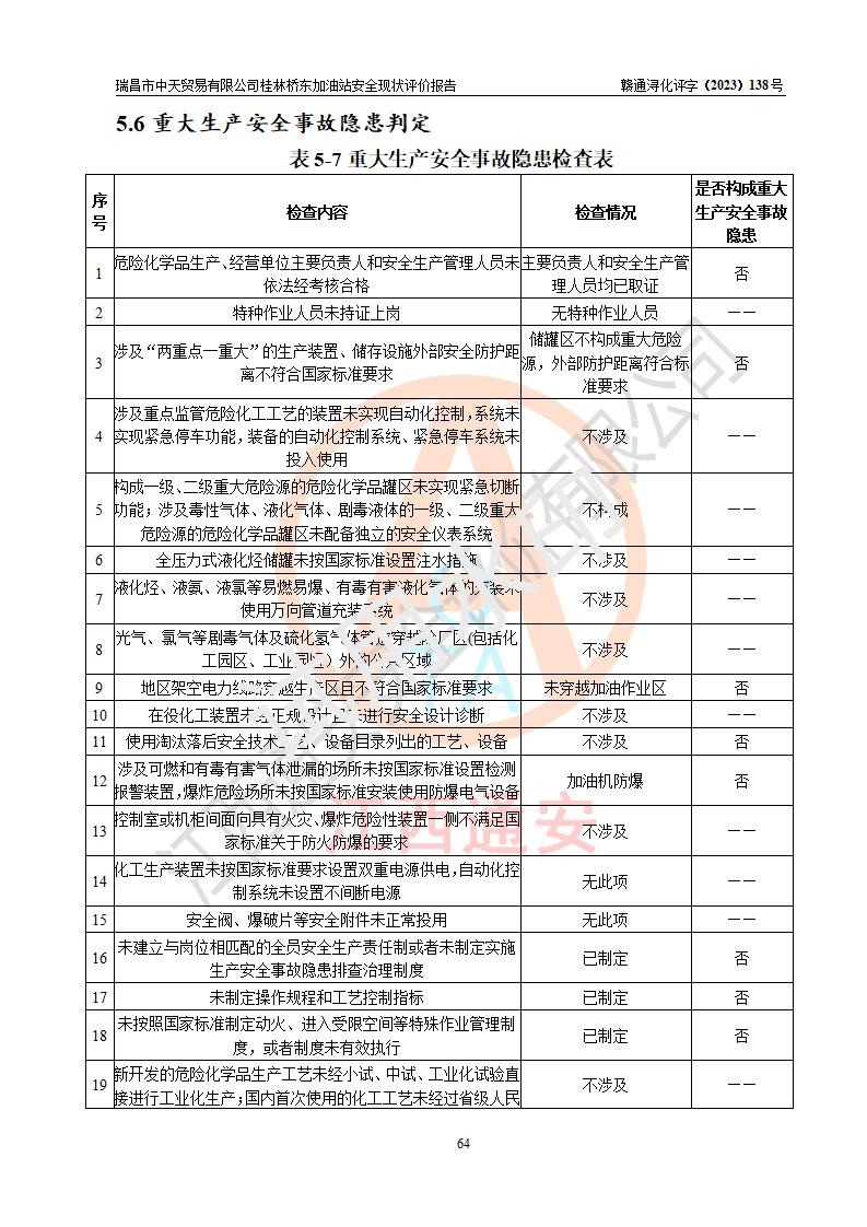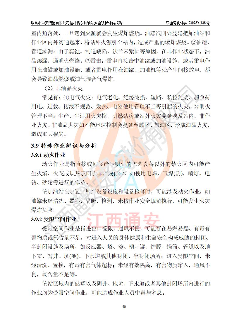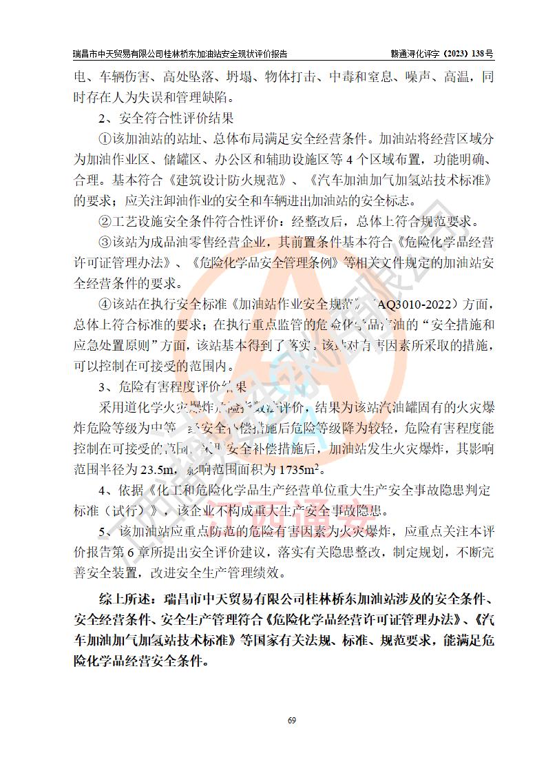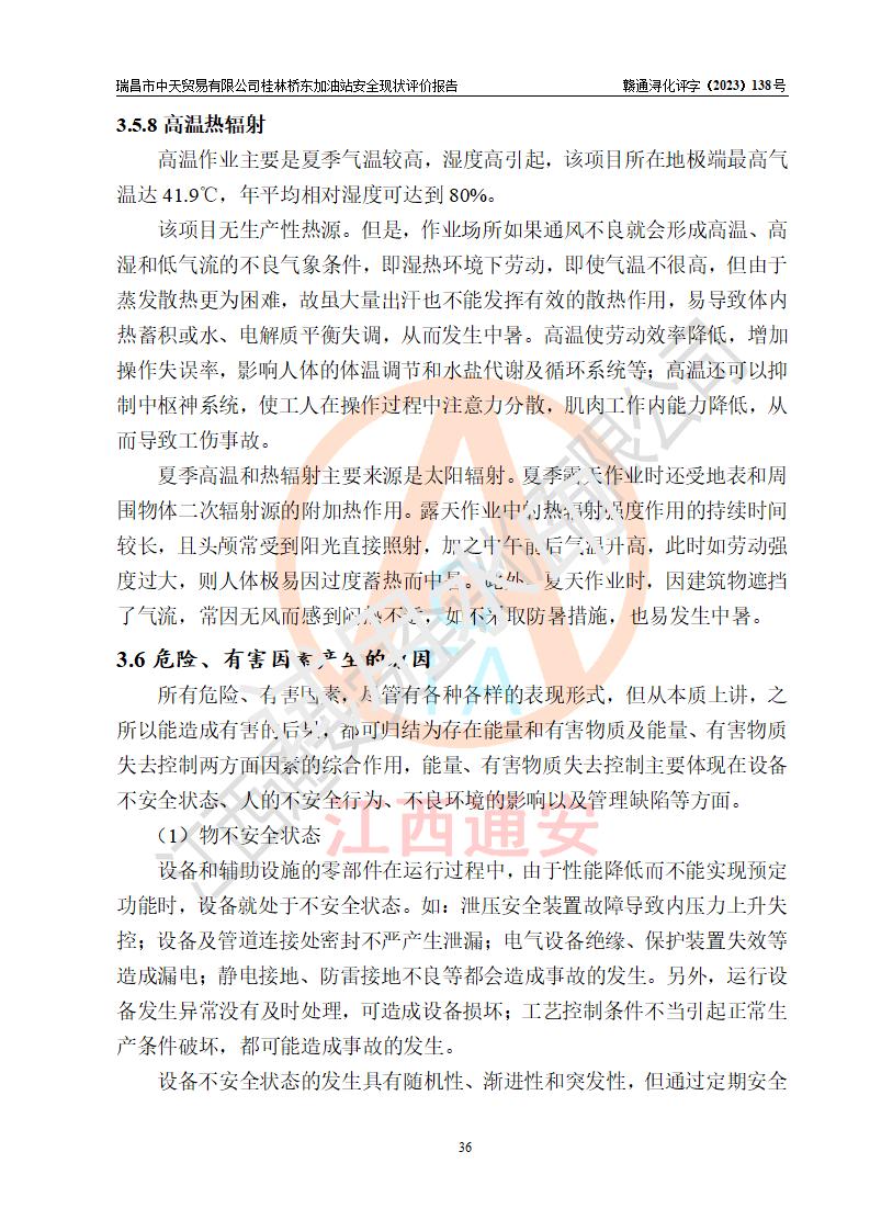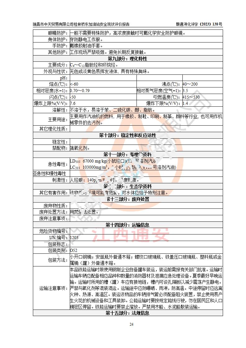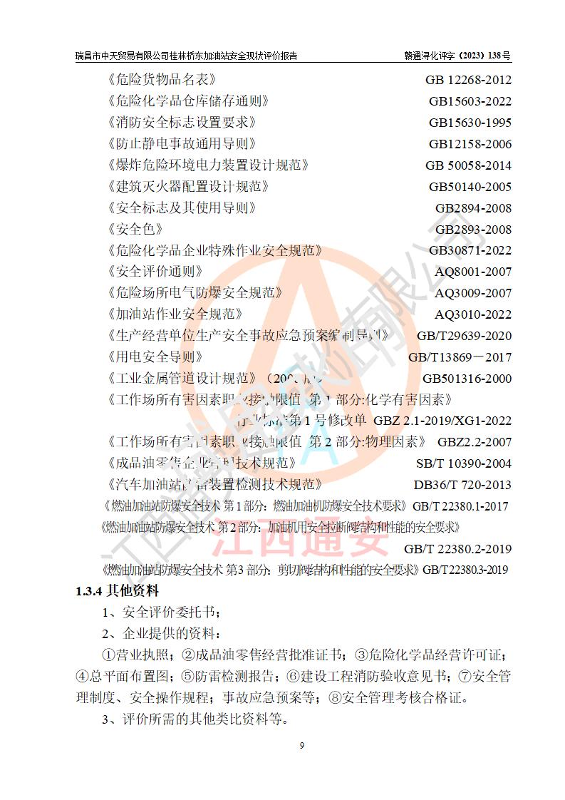 瑞昌市中天贸易有限公司桂林桥东加油站是一家专门从事成品油(汽油、柴油)、润滑油零售,预包装食品兼散装食品、卷烟(凭许可证)、日用品、液化气钢瓶、灶具及配件零售,汽车清洗服务的有限责任公司分公司,注册地址为江西省九江市瑞昌市瑞肇公路南侧。加油站现有从业人员6名,其中安全管理人员1人,加油站负责人刘凯(经营者),加油站危险化学品经营单位主要负责人丁洞仙(加油站站长)。 该加油站站区占地面积3330.8m2(约5亩)。站区内设置有1台双枪单油品潜油泵程控燃油加油机和3台双枪单油品自吸式程控燃油加油机及配套的工艺管线,25m3的95#汽油卧式双层储罐1台,25m3的92#汽油汽油卧式双层储罐2台,30m3的0#卧式柴油储罐1台,油品储罐总容积为105m3(折算为汽油为90m3),按现行《汽车加油加气加氢站技术标准》对加油站的等级划分原则,该站属三级加油站。 该站在经营成品油过程中涉及的主要物料为汽油和柴油,按**十部、局联合公告〔2022〕第8号公告修改公布的《危险化学品目录》,汽油和柴油属于危险化学品。根据**安全监管总局安监总管三〔2011〕95号文件公布《首批重点监管的危险化学品名录》和应急管理部等4部公告第3号《特别管控危险化学品目录(**版)》,汽油属于**重点监管和特别管控的危险化学品。 该站由九江市应急管理局换发了《危险化学品经营许可证》(证号:赣九危化经字〔2020〕000376号),**期限2021年01月23日至2024年01月22日。根据《危险化学品经营许可证管理办法》(**安监总局第55号令,第79号令修改)的要求,危险化学品经营许可证的**期为3年。**期满后,企业需要继续从事危险化学品经营活动的,应当在危险化学品经营许可证**期满3个月前,向发证机关提出危险化学品经营许可证的延期申请,申请证照延期的所有储存、经营危险化学品的单位,应当提供安全评价报告。瑞昌市中天贸易有限公司桂林桥东加油站目前正在做危险化学品经营许可证延期换证的准备工作,故委托江西通安安全评价有限公司承担其加油站经营成品油安全条件现状评价工作。 江西通安安全评价有限公司接受委托后,组织了评价组对该加油站进行了现场踏勘,对加油站零售经营成品油的设施、设备、装置实际运行状况及管理状况进行了实地调查、分析,检查该站是否符合《危险化学品安全管理条例》、《危险化学品经营许可证管理办法》中规定的经营单位应具备的基本条件。从安全管理角度检查和评价该站对安全法规的执行情况,从安全技术角度检查项目中安全设施是否符合**有关安全生产的法律、法规和标准。评价组运用安全系统工程的方法,进行危险、有害因素的识别及其危险度的评价,查找该系统生产运行中存在的事故隐患并判定其危险程度,提出合理可行的安全对策措施及建议,在此基础上,根据加油站加油作业工艺程序、站区内功能区域特点,划分了评价单元;对划分的评价单元及单元内的危险、有害因素选择了相应的安全评价方法逐项进行分析、评价,提出相应的预防和控制对策措施;在此基础上完成了安全评价报告初稿,经评价公司内部五级审核程序,及加油站现场存在的安全隐患**落实整改后出具《瑞昌市中天贸易有限公司桂林桥东加油站安全现状评价报告》,以作为该企业申请《危险化学品经营许可证》延期的安全技术依据。 |