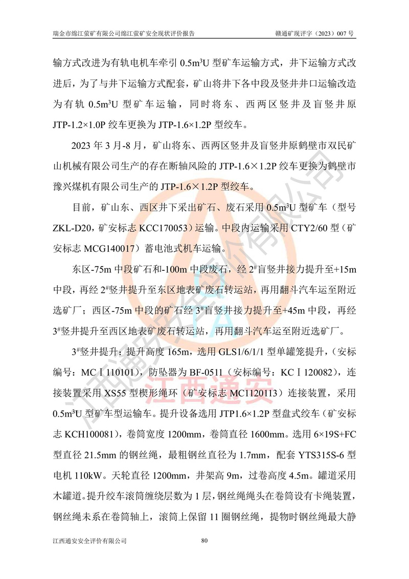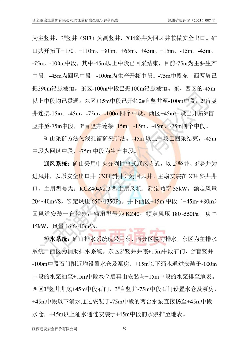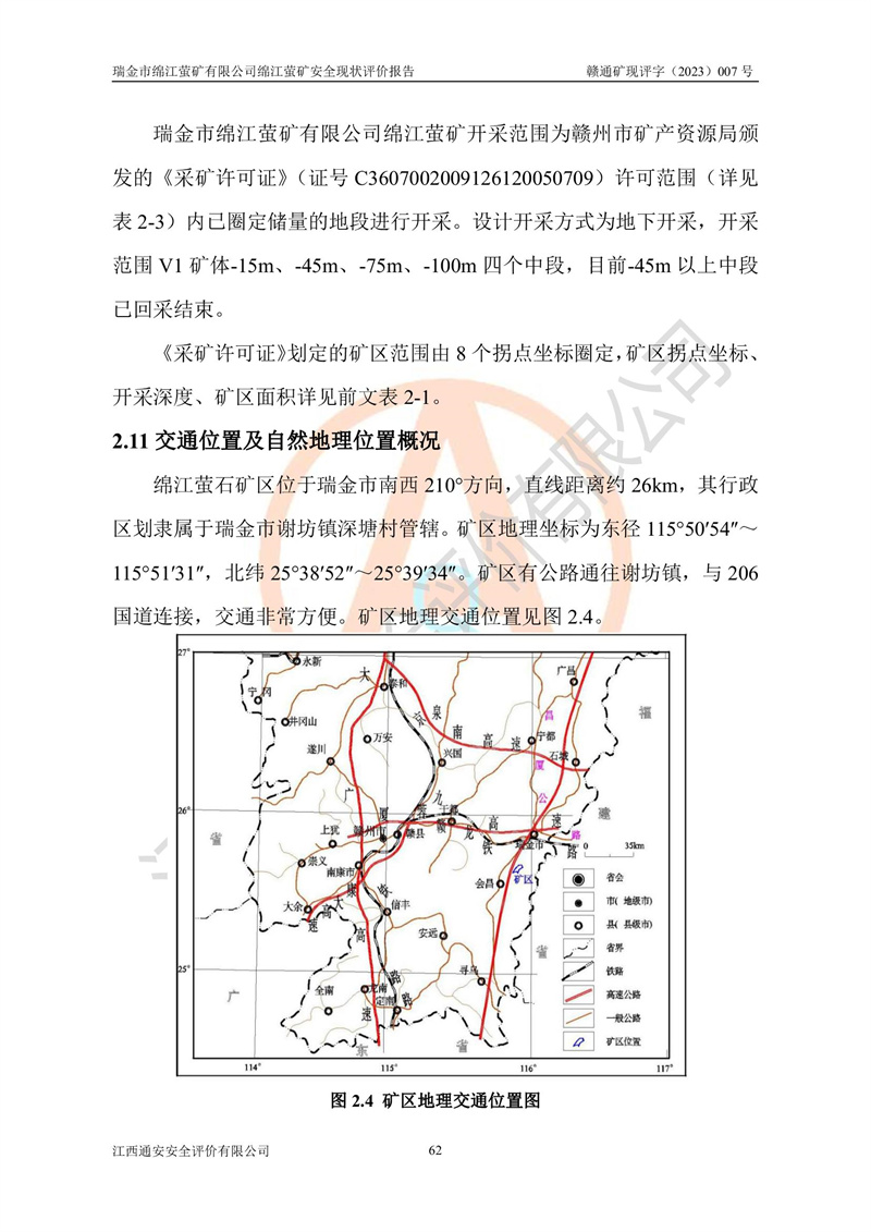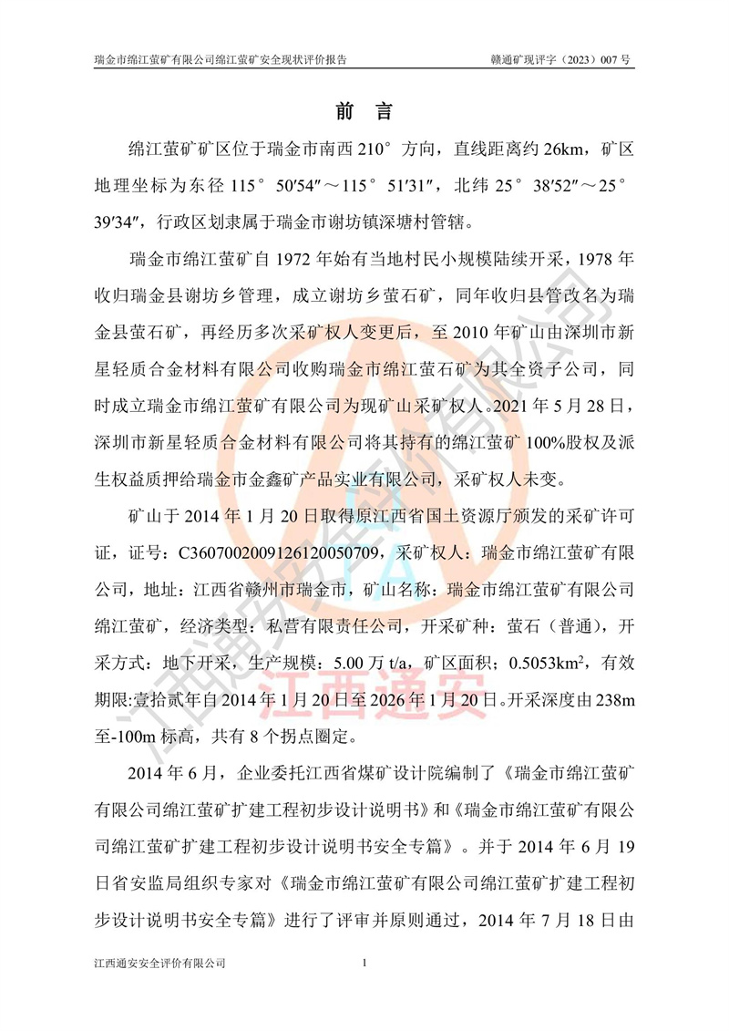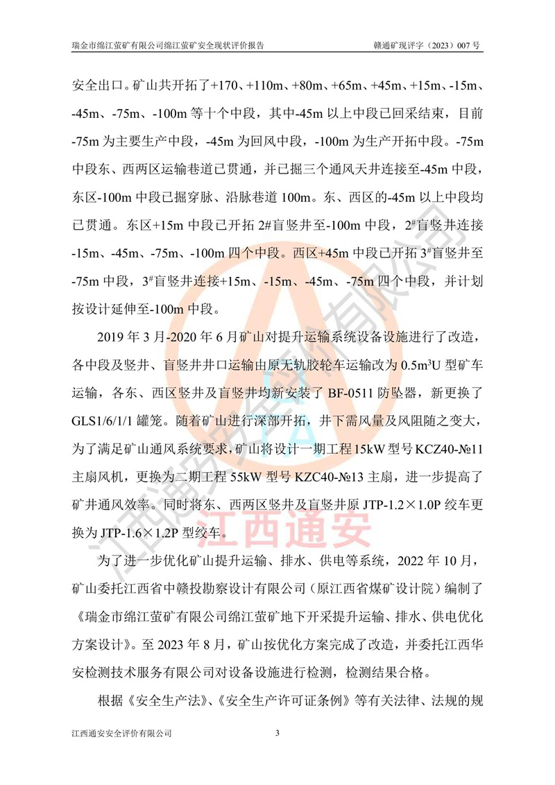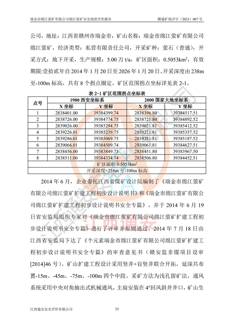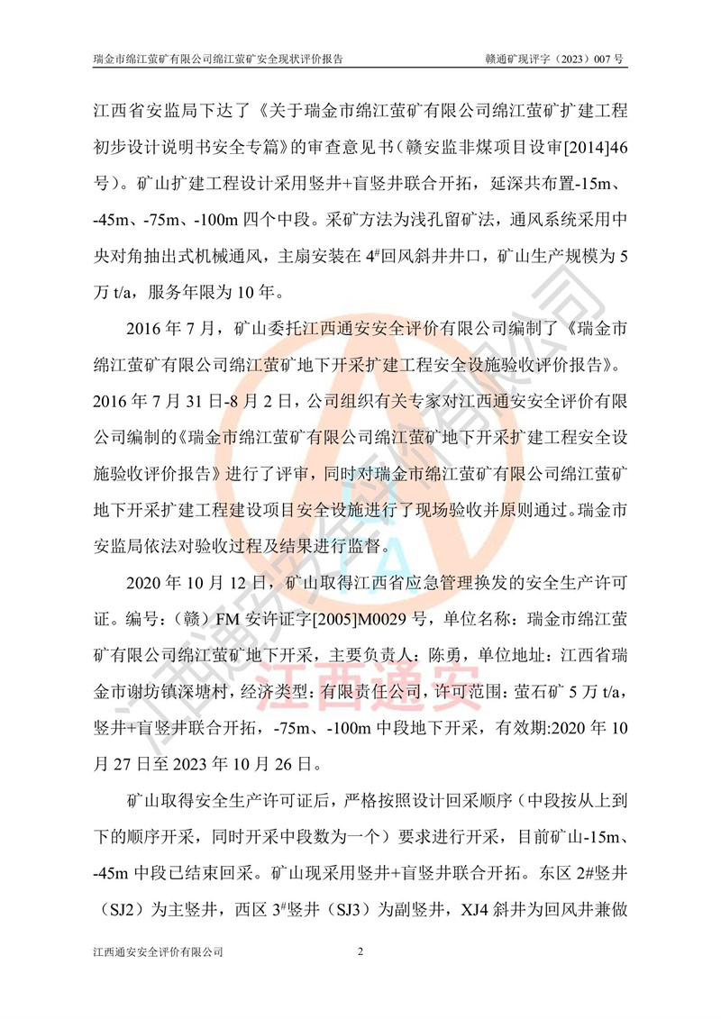 绵江萤矿矿区位于瑞金市南西210°方向,直线距离约26km,矿区地理坐标为东径115°50′54″~115°51′31″,北纬25°38′52″~25°39′34″,行政区划隶属于瑞金市谢坊镇深塘村管辖。 瑞金市绵江萤矿自1972年始有当地村民小规模陆续开采,1978年收归瑞金县谢坊乡管理,成立谢坊乡萤石矿,同年收归县管改名为瑞金县萤石矿,再经历多次采矿权人变更后,至2010年矿山由深圳市新星轻质合金材料有限公司收购瑞金市绵江萤石矿为其全资子公司,同时成立瑞金市绵江萤矿有限公司为现矿山采矿权人。2021年5月28日,深圳市新星轻质合金材料有限公司将其持有的绵江萤矿****股权及派生权益质押给瑞金市金鑫矿产品实业有限公司,采矿权人未变。 矿山于2014年1月20日取得原江西省国土资源厅颁发的采矿许可证,证号:C3607002009126120050709,采矿权人:瑞金市绵江萤矿有限公司,地址:江西省赣州市瑞金市,矿山名称:瑞金市绵江萤矿有限公司绵江萤矿,经济类型:私营有限责任公司,开采矿种:萤石(普通),开采方式:地下开采,生产规模:5.00万t/a,矿区面积;0.5053km2,**期限:壹拾贰年自2014年1月20日至2026年1月20日。开采深度由238m至-100m标高,共有8个拐点圈定。 2014年6月,企业委托江西省煤矿设计院编制了《瑞金市绵江萤矿有限公司绵江萤矿扩建工程初步设计说明书》和《瑞金市绵江萤矿有限公司绵江萤矿扩建工程初步设计说明书安全专篇》。并于2014年6月19日省安监局组织专家对《瑞金市绵江萤矿有限公司绵江萤矿扩建工程初步设计说明书安全专篇》进行了评审并原则通过,2014年7月18日由江西省安监局下达了《关于瑞金市绵江萤矿有限公司绵江萤矿扩建工程初步设计说明书安全专篇》的审查意见书(赣安监非煤项目设审[2014]46号)。矿山扩建工程设计采用竖井+盲竖井联合开拓,延深共布置-15m、-45m、-75m、-100m四个中段。采矿方法为浅孔留矿法,通风系统采用中央对角抽出式机械通风,主扇安装在4#回风斜井井口,矿山生产规模为5万t/a,服务年限为10年。 2016年7月,矿山委托江西通安安全评价有限公司编制了《瑞金市绵江萤矿有限公司绵江萤矿地下开采扩建工程安全设施验收评价报告》。2016年7月31日-8月2日,公司组织有关专家对江西通安安全评价有限公司编制的《瑞金市绵江萤矿有限公司绵江萤矿地下开采扩建工程安全设施验收评价报告》进行了评审,同时对瑞金市绵江萤矿有限公司绵江萤矿地下开采扩建工程建设项目安全设施进行了现场验收并原则通过。瑞金市安监局依法对验收过程及结果进行监督。 2020年10月12日,矿山取得江西省应急管理换发的安全生产许可证。编号:(赣)FM安许证字[2005]M0029号,单位名称:瑞金市绵江萤矿有限公司绵江萤矿地下开采,主要负责人:陈勇,单位地址:江西省瑞金市谢坊镇深塘村,经济类型:有限责任公司,许可范围:萤石矿5万t/a,竖井+盲竖井联合开拓,-75m、-100m中段地下开采,**期:2020年10月27日至2023年10月26日。 矿山取得安全生产许可证后,严格按照设计回采顺序(中段按从上到下的顺序开采,同时开采中段数为一个)要求进行开采,目前矿山-15m、-45m中段已结束回采。矿山现采用竖井+盲竖井联合开拓。东区2#竖井(SJ2)为主竖井,西区3#竖井(SJ3)为副竖井,XJ4斜井为回风井兼做安全出口。矿山共开拓了+170、+110m、+80m、+65m、+45m、+15m、-15m、-45m、-75m、-100m等十个中段,其中-45m以上中段已回采结束,目前-75m为主要生产中段,-45m为回风中段,-100m为生产开拓中段。-75m中段东、西两区运输巷道已贯通,并已掘三个通风天井连接至-45m中段,东区-100m中段已掘穿脉、沿脉巷道100m。东、西区的-45m以上中段均已贯通。东区+15m中段已开拓2#盲竖井至-100m中段,2#盲竖井连接-15m、-45m、-75m、-100m四个中段。西区+45m中段已开拓3#盲竖井至-75m中段,3#盲竖井连接+15m、-15m、-45m、-75m四个中段,并计划按设计延伸至-100m中段。 2019年3月-2020年6月矿山对提升运输系统设备设施进行了改造,各中段及竖井、盲竖井井口运输由原无轨胶轮车运输改为0.5m3U型矿车运输,各东、西区竖井及盲竖井均新安装了BF-0511防坠器,新更换了GLS1/6/1/1罐笼。随着矿山进行深部开拓,井下需风量及风阻随之变大,为了满足矿山通风系统要求,矿山将设计一期工程15kW型号KCZ40-№11主扇风机,更换为二期工程55kW型号KZC40-№13主扇,进一步提高了矿井通风效率。同时将东、西两区竖井及盲竖井原JTP-1.2×1.0P绞车更换为JTP-1.6×1.2P型绞车。 为了进一步优化矿山提升运输、排水、供电等系统,2022年10月,矿山委托江西省中赣投勘察设计有限公司(原江西省煤矿设计院)编制了《瑞金市绵江萤矿有限公司绵江萤矿地下开采提升运输、排水、供电优化方案设计》。至2023年8月,矿山按优化方案完成了改造,并委托江西华安检测技术服务有限公司对设备设施进行检测,检测结果合格。 根据《安全生产法》、《安全生产许可证条例》等有关法律、法规的规定以及《关于做好非煤矿矿山企业安全生产许可证延期换证工作的通知》的要求,2023年4月,瑞金市绵江萤矿有限公司委托我公司(江西通安安全评价有限公司)对绵江萤矿进行安全现状评价。 |