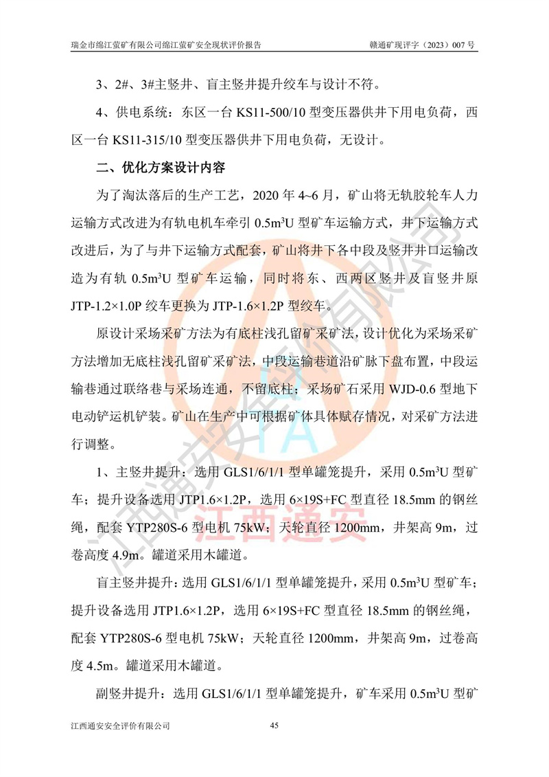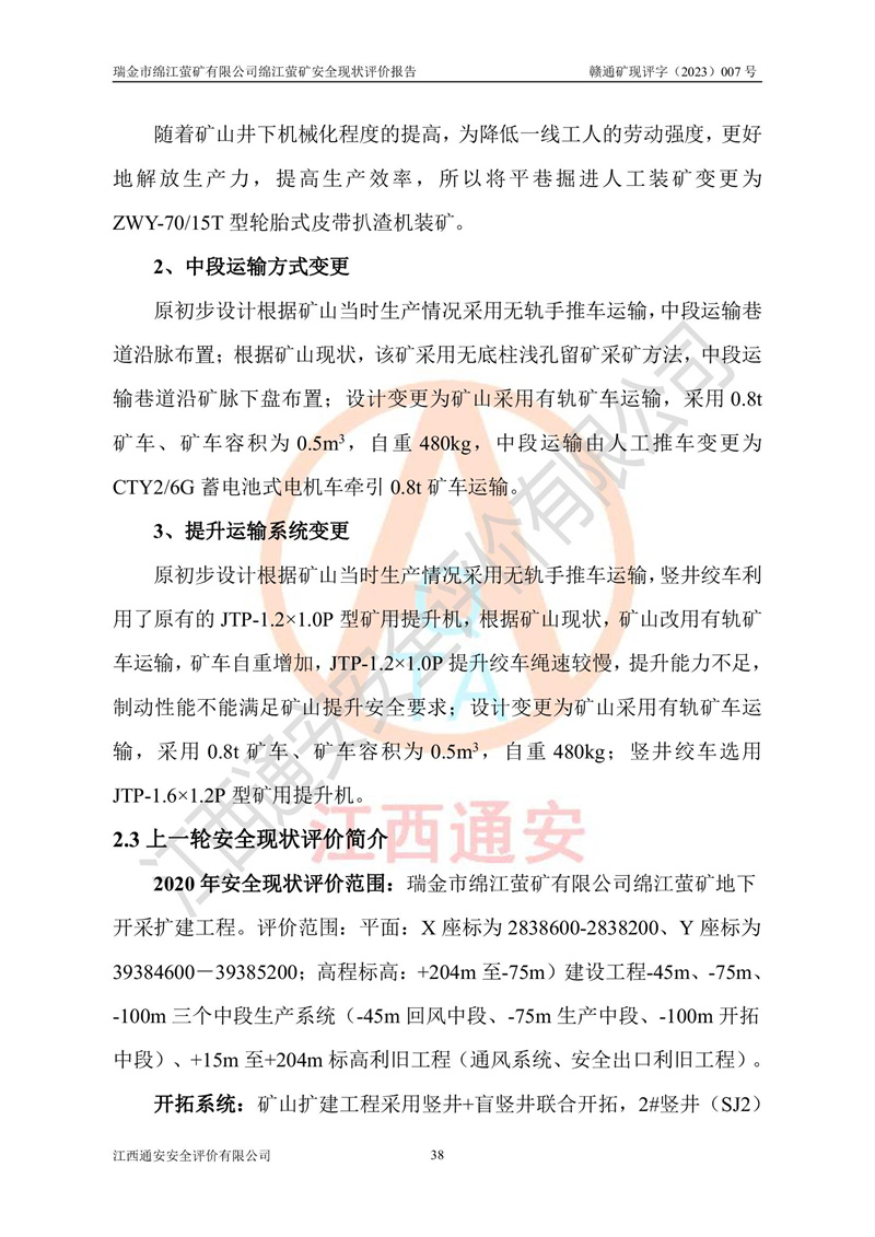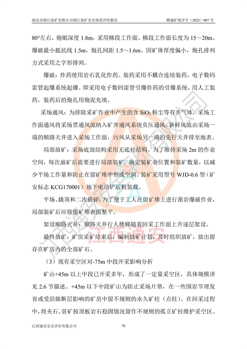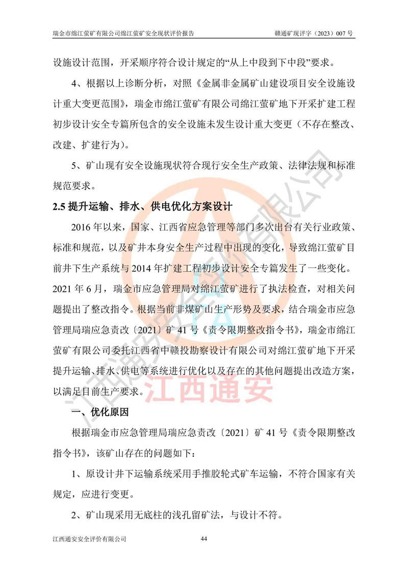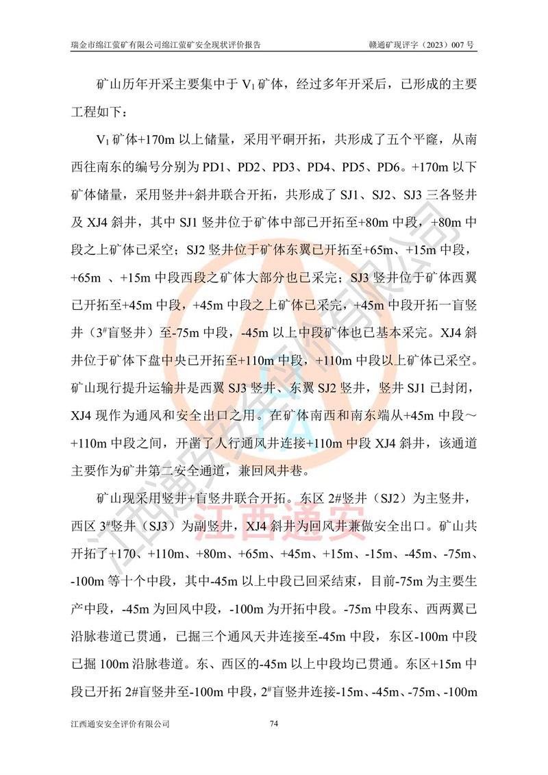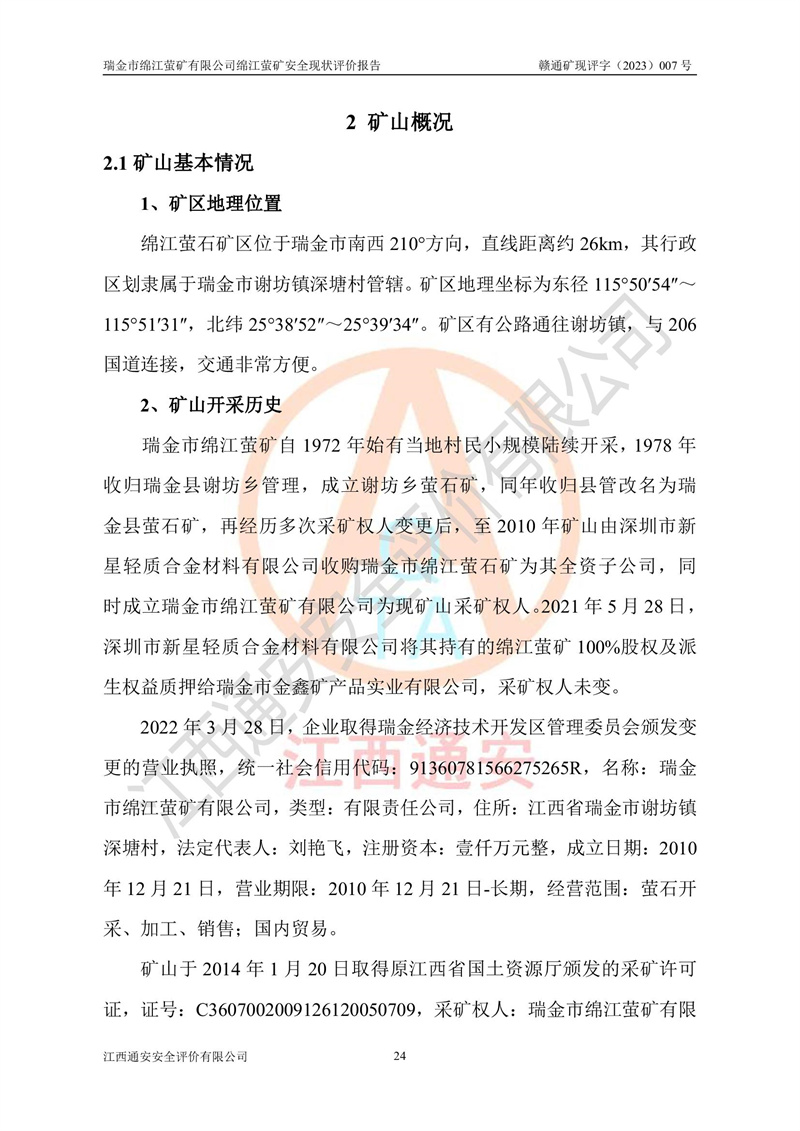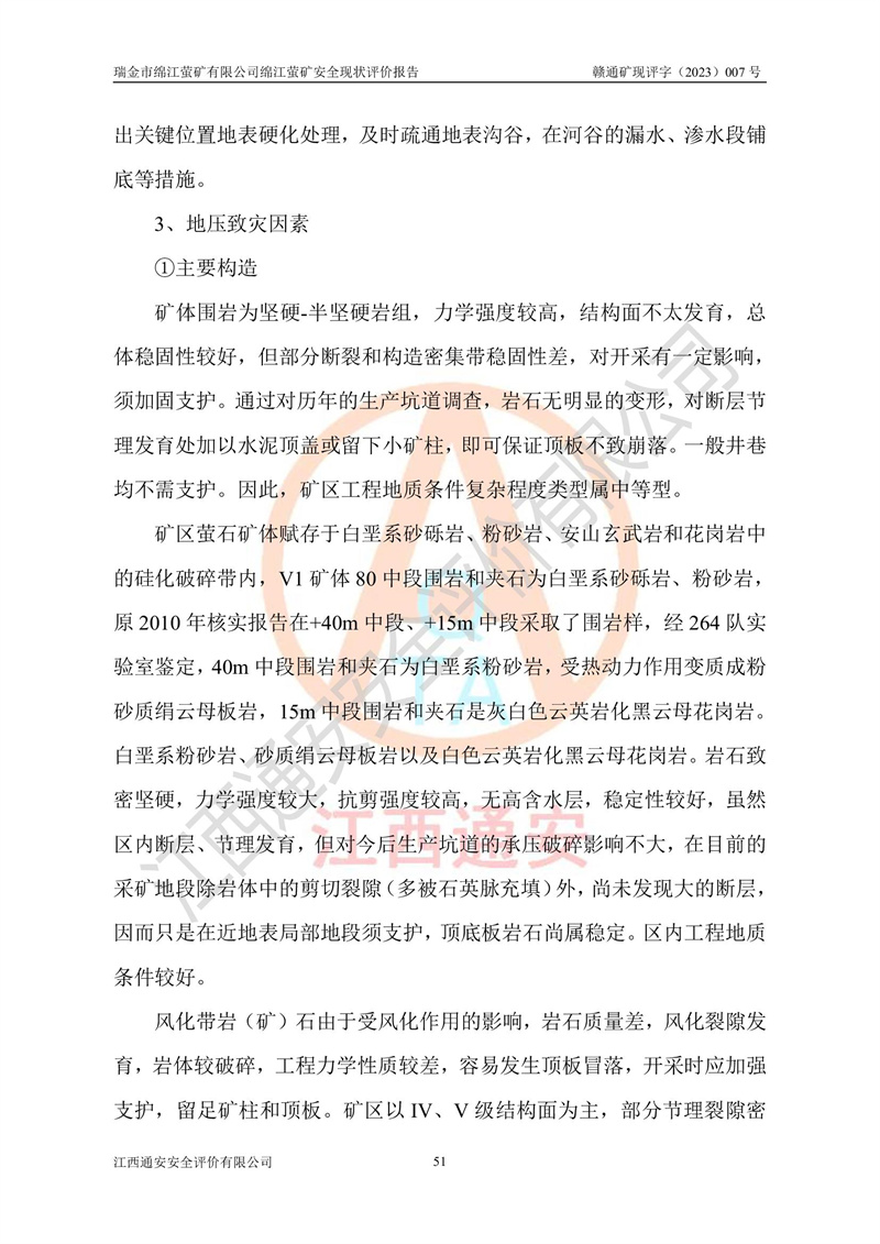 绵江萤矿矿区位于瑞金市南西210°方向,直线距离约26km,矿区地理坐标为东径115°50′54″~115°51′31″,北纬25°38′52″~25°39′34″,行政区划隶属于瑞金市谢坊镇深塘村管辖。 瑞金市绵江萤矿自1972年始有当地村民小规模陆续开采,1978年收归瑞金县谢坊乡管理,成立谢坊乡萤石矿,同年收归县管改名为瑞金县萤石矿,再经历多次采矿权人变更后,至2010年矿山由深圳市新星轻质合金材料有限公司收购瑞金市绵江萤石矿为其全资子公司,同时成立瑞金市绵江萤矿有限公司为现矿山采矿权人。2021年5月28日,深圳市新星轻质合金材料有限公司将其持有的绵江萤矿****股权及派生权益质押给瑞金市金鑫矿产品实业有限公司,采矿权人未变。 矿山于2014年1月20日取得原江西省国土资源厅颁发的采矿许可证,证号:C3607002009126120050709,采矿权人:瑞金市绵江萤矿有限公司,地址:江西省赣州市瑞金市,矿山名称:瑞金市绵江萤矿有限公司绵江萤矿,经济类型:私营有限责任公司,开采矿种:萤石(普通),开采方式:地下开采,生产规模:5.00万t/a,矿区面积;0.5053km2,**期限:壹拾贰年自2014年1月20日至2026年1月20日。开采深度由238m至-100m标高,共有8个拐点圈定。 2014年6月,企业委托江西省煤矿设计院编制了《瑞金市绵江萤矿有限公司绵江萤矿扩建工程初步设计说明书》和《瑞金市绵江萤矿有限公司绵江萤矿扩建工程初步设计说明书安全专篇》。并于2014年6月19日省安监局组织专家对《瑞金市绵江萤矿有限公司绵江萤矿扩建工程初步设计说明书安全专篇》进行了评审并原则通过,2014年7月18日由江西省安监局下达了《关于瑞金市绵江萤矿有限公司绵江萤矿扩建工程初步设计说明书安全专篇》的审查意见书(赣安监非煤项目设审[2014]46号)。矿山扩建工程设计采用竖井+盲竖井联合开拓,延深共布置-15m、-45m、-75m、-100m四个中段。采矿方法为浅孔留矿法,通风系统采用中央对角抽出式机械通风,主扇安装在4#回风斜井井口,矿山生产规模为5万t/a,服务年限为10年。 2016年7月,矿山委托江西通安安全评价有限公司编制了《瑞金市绵江萤矿有限公司绵江萤矿地下开采扩建工程安全设施验收评价报告》。2016年7月31日-8月2日,公司组织有关专家对江西通安安全评价有限公司编制的《瑞金市绵江萤矿有限公司绵江萤矿地下开采扩建工程安全设施验收评价报告》进行了评审,同时对瑞金市绵江萤矿有限公司绵江萤矿地下开采扩建工程建设项目安全设施进行了现场验收并原则通过。瑞金市安监局依法对验收过程及结果进行监督。 2020年10月12日,矿山取得江西省应急管理换发的安全生产许可证。编号:(赣)FM安许证字[2005]M0029号,单位名称:瑞金市绵江萤矿有限公司绵江萤矿地下开采,主要负责人:陈勇,单位地址:江西省瑞金市谢坊镇深塘村,经济类型:有限责任公司,许可范围:萤石矿5万t/a,竖井+盲竖井联合开拓,-75m、-100m中段地下开采,**期:2020年10月27日至2023年10月26日。 矿山取得安全生产许可证后,严格按照设计回采顺序(中段按从上到下的顺序开采,同时开采中段数为一个)要求进行开采,目前矿山-15m、-45m中段已结束回采。矿山现采用竖井+盲竖井联合开拓。东区2#竖井(SJ2)为主竖井,西区3#竖井(SJ3)为副竖井,XJ4斜井为回风井兼做安全出口。矿山共开拓了+170、+110m、+80m、+65m、+45m、+15m、-15m、-45m、-75m、-100m等十个中段,其中-45m以上中段已回采结束,目前-75m为主要生产中段,-45m为回风中段,-100m为生产开拓中段。-75m中段东、西两区运输巷道已贯通,并已掘三个通风天井连接至-45m中段,东区-100m中段已掘穿脉、沿脉巷道100m。东、西区的-45m以上中段均已贯通。东区+15m中段已开拓2#盲竖井至-100m中段,2#盲竖井连接-15m、-45m、-75m、-100m四个中段。西区+45m中段已开拓3#盲竖井至-75m中段,3#盲竖井连接+15m、-15m、-45m、-75m四个中段,并计划按设计延伸至-100m中段。 2019年3月-2020年6月矿山对提升运输系统设备设施进行了改造,各中段及竖井、盲竖井井口运输由原无轨胶轮车运输改为0.5m3U型矿车运输,各东、西区竖井及盲竖井均新安装了BF-0511防坠器,新更换了GLS1/6/1/1罐笼。随着矿山进行深部开拓,井下需风量及风阻随之变大,为了满足矿山通风系统要求,矿山将设计一期工程15kW型号KCZ40-№11主扇风机,更换为二期工程55kW型号KZC40-№13主扇,进一步提高了矿井通风效率。同时将东、西两区竖井及盲竖井原JTP-1.2×1.0P绞车更换为JTP-1.6×1.2P型绞车。 为了进一步优化矿山提升运输、排水、供电等系统,2022年10月,矿山委托江西省中赣投勘察设计有限公司(原江西省煤矿设计院)编制了《瑞金市绵江萤矿有限公司绵江萤矿地下开采提升运输、排水、供电优化方案设计》。至2023年8月,矿山按优化方案完成了改造,并委托江西华安检测技术服务有限公司对设备设施进行检测,检测结果合格。 根据《安全生产法》、《安全生产许可证条例》等有关法律、法规的规定以及《关于做好非煤矿矿山企业安全生产许可证延期换证工作的通知》的要求,2023年4月,瑞金市绵江萤矿有限公司委托我公司(江西通安安全评价有限公司)对绵江萤矿进行安全现状评价。 |