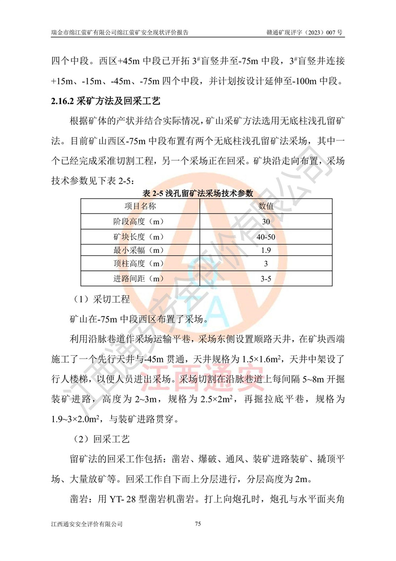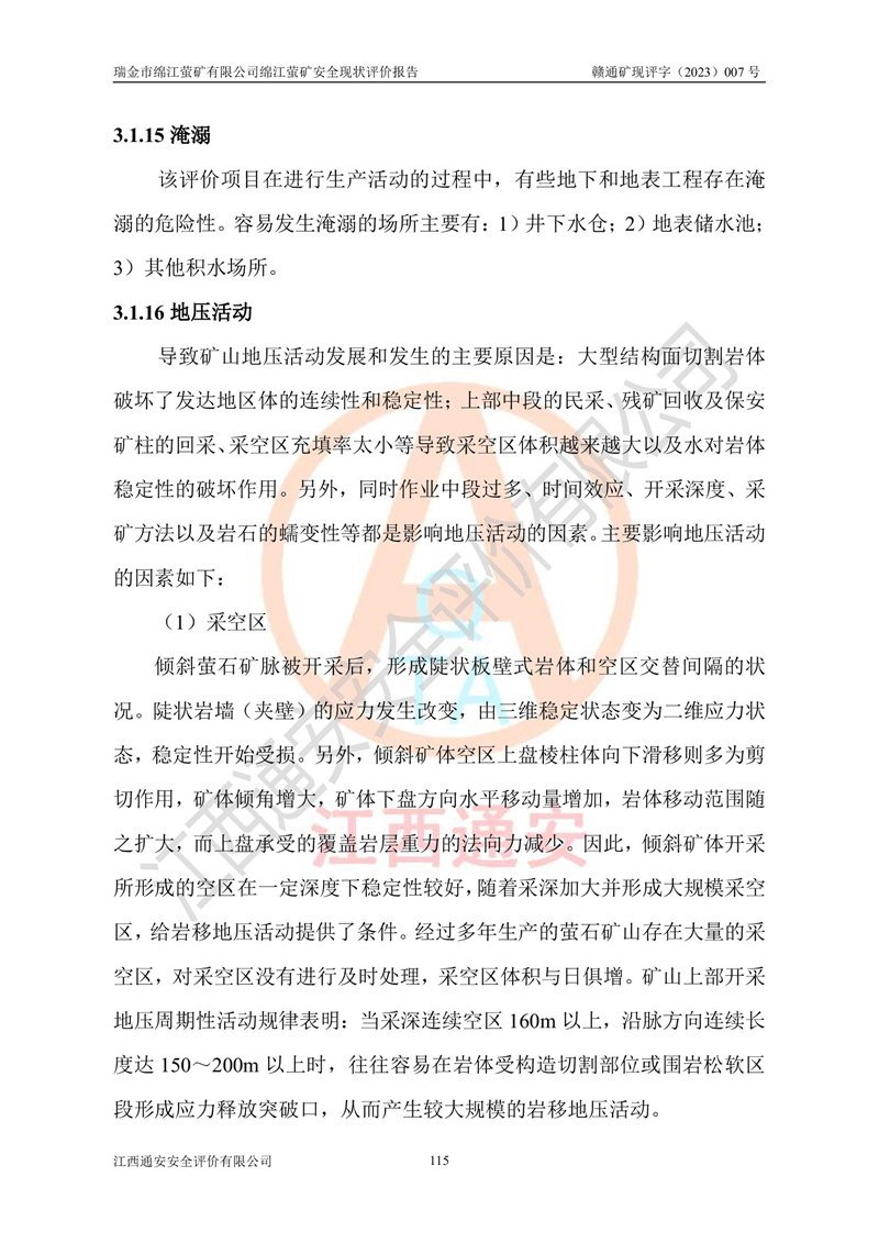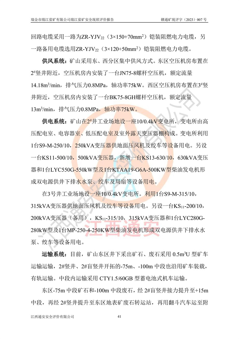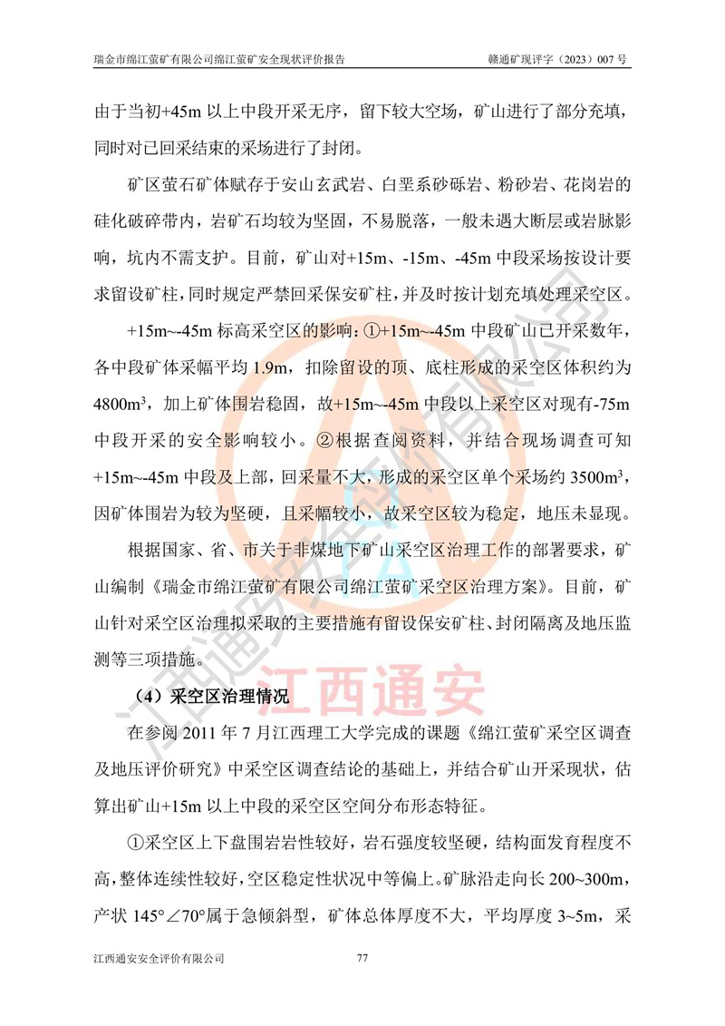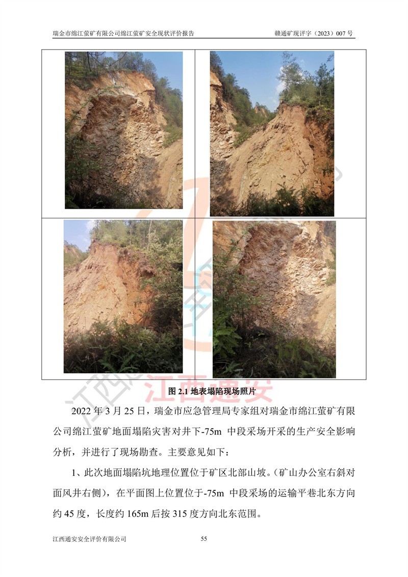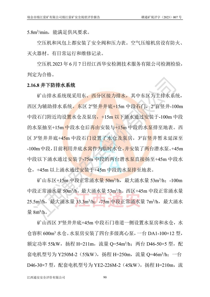 绵江萤矿矿区位于瑞金市南西210°方向,直线距离约26km,矿区地理坐标为东径115°50′54″~115°51′31″,北纬25°38′52″~25°39′34″,行政区划隶属于瑞金市谢坊镇深塘村管辖。 瑞金市绵江萤矿自1972年始有当地村民小规模陆续开采,1978年收归瑞金县谢坊乡管理,成立谢坊乡萤石矿,同年收归县管改名为瑞金县萤石矿,再经历多次采矿权人变更后,至2010年矿山由深圳市新星轻质合金材料有限公司收购瑞金市绵江萤石矿为其全资子公司,同时成立瑞金市绵江萤矿有限公司为现矿山采矿权人。2021年5月28日,深圳市新星轻质合金材料有限公司将其持有的绵江萤矿****股权及派生权益质押给瑞金市金鑫矿产品实业有限公司,采矿权人未变。 矿山于2014年1月20日取得原江西省国土资源厅颁发的采矿许可证,证号:C3607002009126120050709,采矿权人:瑞金市绵江萤矿有限公司,地址:江西省赣州市瑞金市,矿山名称:瑞金市绵江萤矿有限公司绵江萤矿,经济类型:私营有限责任公司,开采矿种:萤石(普通),开采方式:地下开采,生产规模:5.00万t/a,矿区面积;0.5053km2,**期限:壹拾贰年自2014年1月20日至2026年1月20日。开采深度由238m至-100m标高,共有8个拐点圈定。 2014年6月,企业委托江西省煤矿设计院编制了《瑞金市绵江萤矿有限公司绵江萤矿扩建工程初步设计说明书》和《瑞金市绵江萤矿有限公司绵江萤矿扩建工程初步设计说明书安全专篇》。并于2014年6月19日省安监局组织专家对《瑞金市绵江萤矿有限公司绵江萤矿扩建工程初步设计说明书安全专篇》进行了评审并原则通过,2014年7月18日由江西省安监局下达了《关于瑞金市绵江萤矿有限公司绵江萤矿扩建工程初步设计说明书安全专篇》的审查意见书(赣安监非煤项目设审[2014]46号)。矿山扩建工程设计采用竖井+盲竖井联合开拓,延深共布置-15m、-45m、-75m、-100m四个中段。采矿方法为浅孔留矿法,通风系统采用中央对角抽出式机械通风,主扇安装在4#回风斜井井口,矿山生产规模为5万t/a,服务年限为10年。 2016年7月,矿山委托江西通安安全评价有限公司编制了《瑞金市绵江萤矿有限公司绵江萤矿地下开采扩建工程安全设施验收评价报告》。2016年7月31日-8月2日,公司组织有关专家对江西通安安全评价有限公司编制的《瑞金市绵江萤矿有限公司绵江萤矿地下开采扩建工程安全设施验收评价报告》进行了评审,同时对瑞金市绵江萤矿有限公司绵江萤矿地下开采扩建工程建设项目安全设施进行了现场验收并原则通过。瑞金市安监局依法对验收过程及结果进行监督。 2020年10月12日,矿山取得江西省应急管理换发的安全生产许可证。编号:(赣)FM安许证字[2005]M0029号,单位名称:瑞金市绵江萤矿有限公司绵江萤矿地下开采,主要负责人:陈勇,单位地址:江西省瑞金市谢坊镇深塘村,经济类型:有限责任公司,许可范围:萤石矿5万t/a,竖井+盲竖井联合开拓,-75m、-100m中段地下开采,**期:2020年10月27日至2023年10月26日。 矿山取得安全生产许可证后,严格按照设计回采顺序(中段按从上到下的顺序开采,同时开采中段数为一个)要求进行开采,目前矿山-15m、-45m中段已结束回采。矿山现采用竖井+盲竖井联合开拓。东区2#竖井(SJ2)为主竖井,西区3#竖井(SJ3)为副竖井,XJ4斜井为回风井兼做安全出口。矿山共开拓了+170、+110m、+80m、+65m、+45m、+15m、-15m、-45m、-75m、-100m等十个中段,其中-45m以上中段已回采结束,目前-75m为主要生产中段,-45m为回风中段,-100m为生产开拓中段。-75m中段东、西两区运输巷道已贯通,并已掘三个通风天井连接至-45m中段,东区-100m中段已掘穿脉、沿脉巷道100m。东、西区的-45m以上中段均已贯通。东区+15m中段已开拓2#盲竖井至-100m中段,2#盲竖井连接-15m、-45m、-75m、-100m四个中段。西区+45m中段已开拓3#盲竖井至-75m中段,3#盲竖井连接+15m、-15m、-45m、-75m四个中段,并计划按设计延伸至-100m中段。 2019年3月-2020年6月矿山对提升运输系统设备设施进行了改造,各中段及竖井、盲竖井井口运输由原无轨胶轮车运输改为0.5m3U型矿车运输,各东、西区竖井及盲竖井均新安装了BF-0511防坠器,新更换了GLS1/6/1/1罐笼。随着矿山进行深部开拓,井下需风量及风阻随之变大,为了满足矿山通风系统要求,矿山将设计一期工程15kW型号KCZ40-№11主扇风机,更换为二期工程55kW型号KZC40-№13主扇,进一步提高了矿井通风效率。同时将东、西两区竖井及盲竖井原JTP-1.2×1.0P绞车更换为JTP-1.6×1.2P型绞车。 为了进一步优化矿山提升运输、排水、供电等系统,2022年10月,矿山委托江西省中赣投勘察设计有限公司(原江西省煤矿设计院)编制了《瑞金市绵江萤矿有限公司绵江萤矿地下开采提升运输、排水、供电优化方案设计》。至2023年8月,矿山按优化方案完成了改造,并委托江西华安检测技术服务有限公司对设备设施进行检测,检测结果合格。 根据《安全生产法》、《安全生产许可证条例》等有关法律、法规的规定以及《关于做好非煤矿矿山企业安全生产许可证延期换证工作的通知》的要求,2023年4月,瑞金市绵江萤矿有限公司委托我公司(江西通安安全评价有限公司)对绵江萤矿进行安全现状评价。 |
