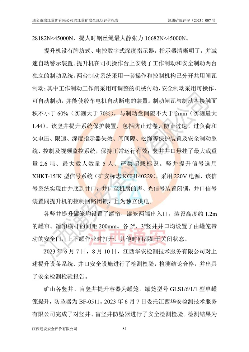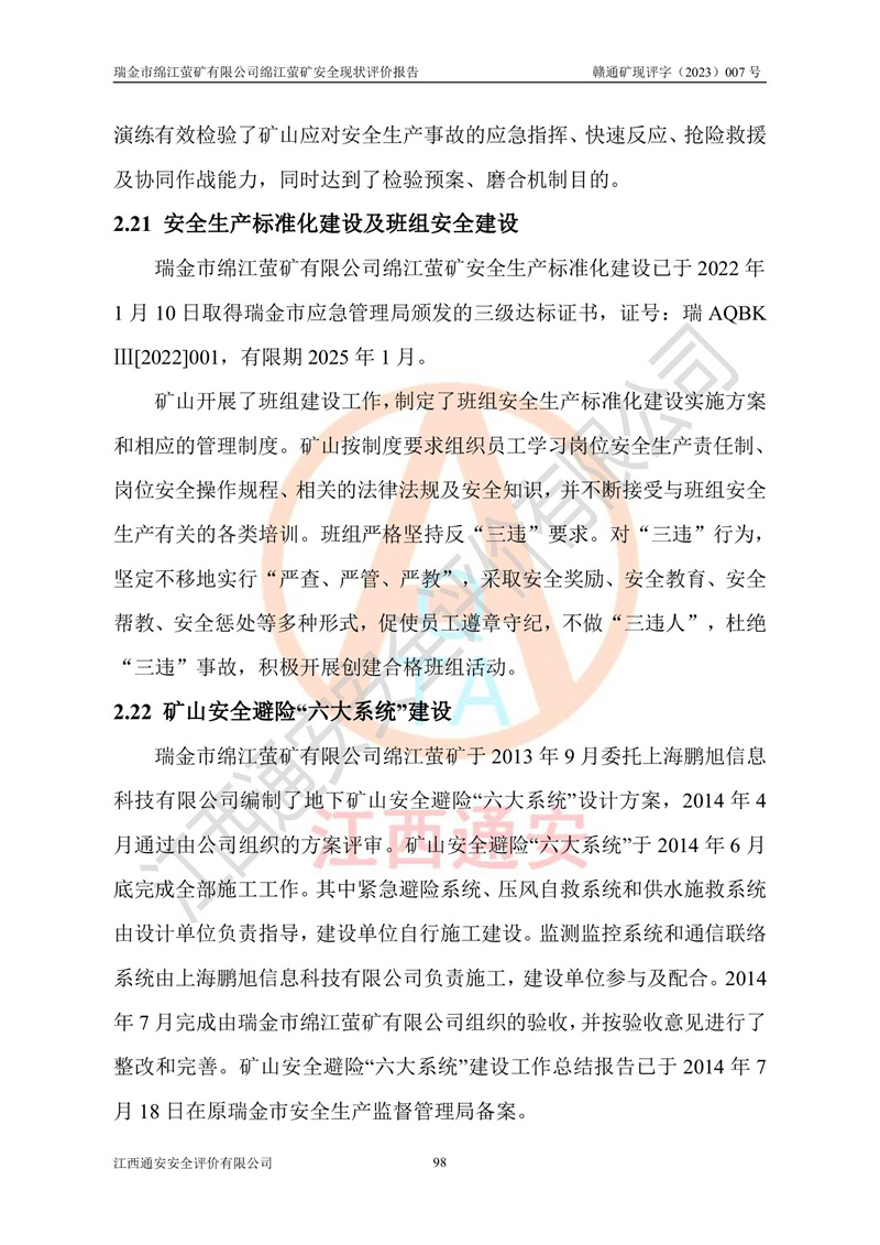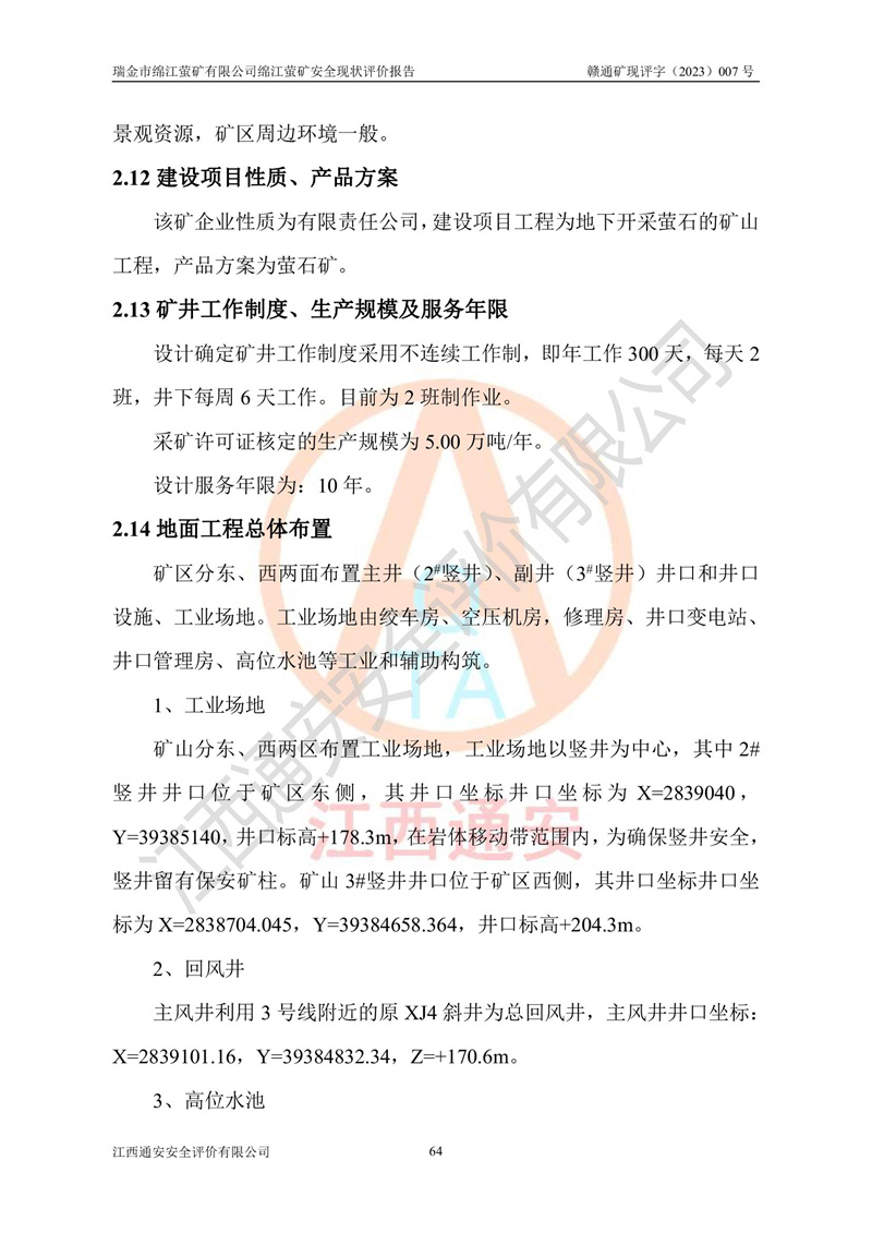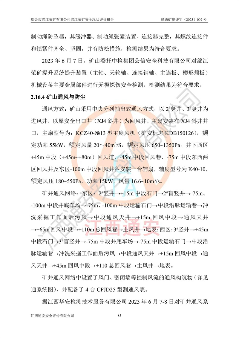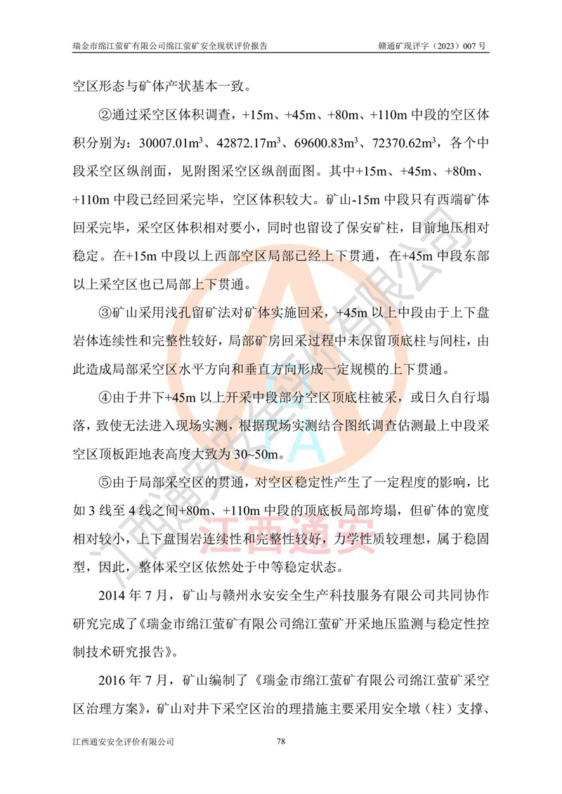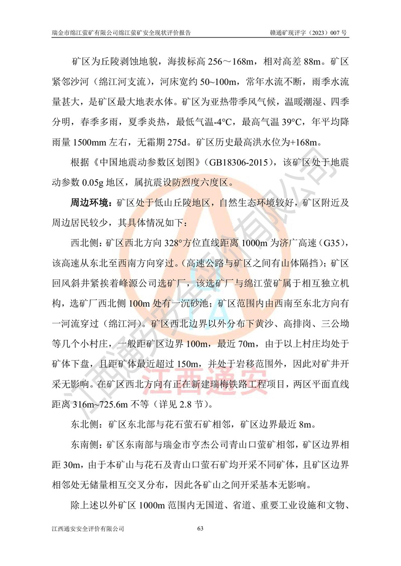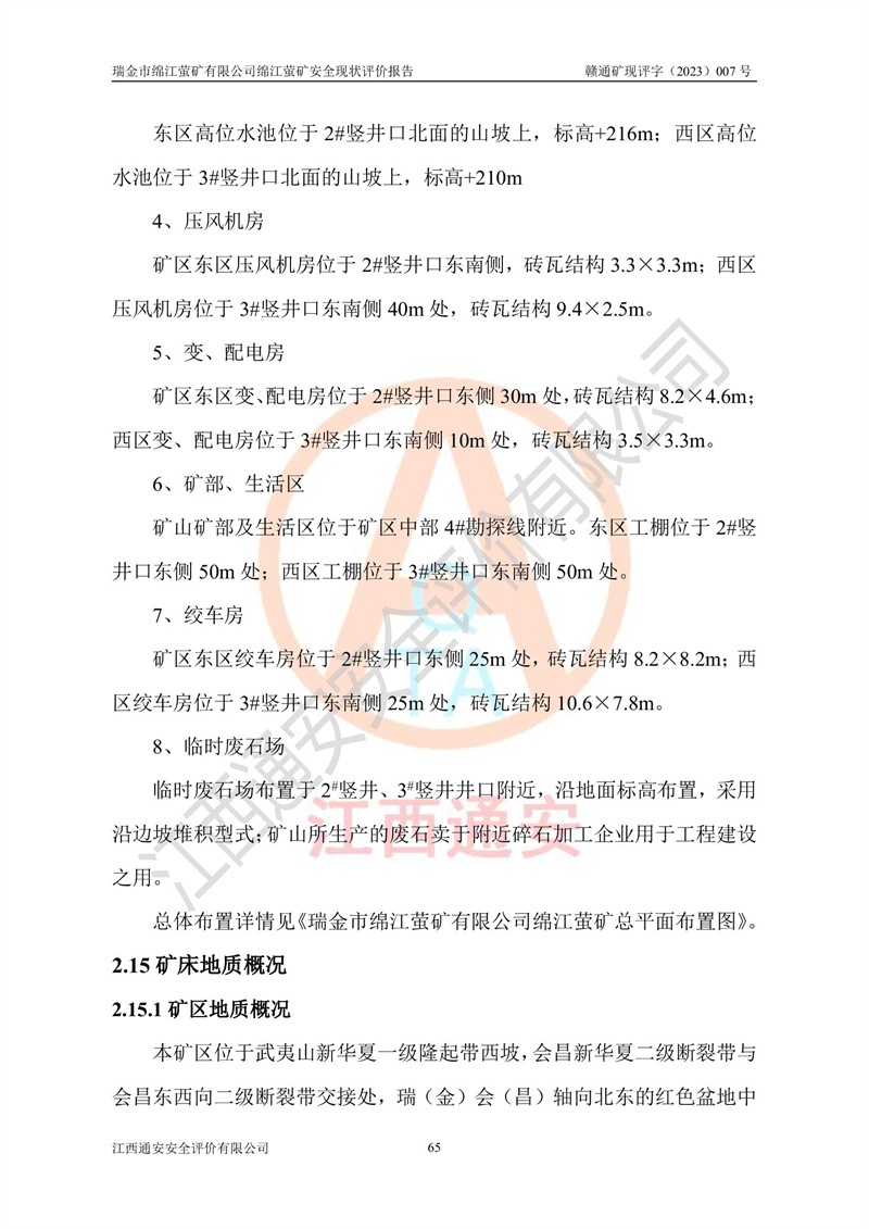 绵江萤矿矿区位于瑞金市南西210°方向,直线距离约26km,矿区地理坐标为东径115°50′54″~115°51′31″,北纬25°38′52″~25°39′34″,行政区划隶属于瑞金市谢坊镇深塘村管辖。 瑞金市绵江萤矿自1972年始有当地村民小规模陆续开采,1978年收归瑞金县谢坊乡管理,成立谢坊乡萤石矿,同年收归县管改名为瑞金县萤石矿,再经历多次采矿权人变更后,至2010年矿山由深圳市新星轻质合金材料有限公司收购瑞金市绵江萤石矿为其全资子公司,同时成立瑞金市绵江萤矿有限公司为现矿山采矿权人。2021年5月28日,深圳市新星轻质合金材料有限公司将其持有的绵江萤矿****股权及派生权益质押给瑞金市金鑫矿产品实业有限公司,采矿权人未变。 矿山于2014年1月20日取得原江西省国土资源厅颁发的采矿许可证,证号:C3607002009126120050709,采矿权人:瑞金市绵江萤矿有限公司,地址:江西省赣州市瑞金市,矿山名称:瑞金市绵江萤矿有限公司绵江萤矿,经济类型:私营有限责任公司,开采矿种:萤石(普通),开采方式:地下开采,生产规模:5.00万t/a,矿区面积;0.5053km2,**期限:壹拾贰年自2014年1月20日至2026年1月20日。开采深度由238m至-100m标高,共有8个拐点圈定。 2014年6月,企业委托江西省煤矿设计院编制了《瑞金市绵江萤矿有限公司绵江萤矿扩建工程初步设计说明书》和《瑞金市绵江萤矿有限公司绵江萤矿扩建工程初步设计说明书安全专篇》。并于2014年6月19日省安监局组织专家对《瑞金市绵江萤矿有限公司绵江萤矿扩建工程初步设计说明书安全专篇》进行了评审并原则通过,2014年7月18日由江西省安监局下达了《关于瑞金市绵江萤矿有限公司绵江萤矿扩建工程初步设计说明书安全专篇》的审查意见书(赣安监非煤项目设审[2014]46号)。矿山扩建工程设计采用竖井+盲竖井联合开拓,延深共布置-15m、-45m、-75m、-100m四个中段。采矿方法为浅孔留矿法,通风系统采用中央对角抽出式机械通风,主扇安装在4#回风斜井井口,矿山生产规模为5万t/a,服务年限为10年。 2016年7月,矿山委托江西通安安全评价有限公司编制了《瑞金市绵江萤矿有限公司绵江萤矿地下开采扩建工程安全设施验收评价报告》。2016年7月31日-8月2日,公司组织有关专家对江西通安安全评价有限公司编制的《瑞金市绵江萤矿有限公司绵江萤矿地下开采扩建工程安全设施验收评价报告》进行了评审,同时对瑞金市绵江萤矿有限公司绵江萤矿地下开采扩建工程建设项目安全设施进行了现场验收并原则通过。瑞金市安监局依法对验收过程及结果进行监督。 2020年10月12日,矿山取得江西省应急管理换发的安全生产许可证。编号:(赣)FM安许证字[2005]M0029号,单位名称:瑞金市绵江萤矿有限公司绵江萤矿地下开采,主要负责人:陈勇,单位地址:江西省瑞金市谢坊镇深塘村,经济类型:有限责任公司,许可范围:萤石矿5万t/a,竖井+盲竖井联合开拓,-75m、-100m中段地下开采,**期:2020年10月27日至2023年10月26日。 矿山取得安全生产许可证后,严格按照设计回采顺序(中段按从上到下的顺序开采,同时开采中段数为一个)要求进行开采,目前矿山-15m、-45m中段已结束回采。矿山现采用竖井+盲竖井联合开拓。东区2#竖井(SJ2)为主竖井,西区3#竖井(SJ3)为副竖井,XJ4斜井为回风井兼做安全出口。矿山共开拓了+170、+110m、+80m、+65m、+45m、+15m、-15m、-45m、-75m、-100m等十个中段,其中-45m以上中段已回采结束,目前-75m为主要生产中段,-45m为回风中段,-100m为生产开拓中段。-75m中段东、西两区运输巷道已贯通,并已掘三个通风天井连接至-45m中段,东区-100m中段已掘穿脉、沿脉巷道100m。东、西区的-45m以上中段均已贯通。东区+15m中段已开拓2#盲竖井至-100m中段,2#盲竖井连接-15m、-45m、-75m、-100m四个中段。西区+45m中段已开拓3#盲竖井至-75m中段,3#盲竖井连接+15m、-15m、-45m、-75m四个中段,并计划按设计延伸至-100m中段。 2019年3月-2020年6月矿山对提升运输系统设备设施进行了改造,各中段及竖井、盲竖井井口运输由原无轨胶轮车运输改为0.5m3U型矿车运输,各东、西区竖井及盲竖井均新安装了BF-0511防坠器,新更换了GLS1/6/1/1罐笼。随着矿山进行深部开拓,井下需风量及风阻随之变大,为了满足矿山通风系统要求,矿山将设计一期工程15kW型号KCZ40-№11主扇风机,更换为二期工程55kW型号KZC40-№13主扇,进一步提高了矿井通风效率。同时将东、西两区竖井及盲竖井原JTP-1.2×1.0P绞车更换为JTP-1.6×1.2P型绞车。 为了进一步优化矿山提升运输、排水、供电等系统,2022年10月,矿山委托江西省中赣投勘察设计有限公司(原江西省煤矿设计院)编制了《瑞金市绵江萤矿有限公司绵江萤矿地下开采提升运输、排水、供电优化方案设计》。至2023年8月,矿山按优化方案完成了改造,并委托江西华安检测技术服务有限公司对设备设施进行检测,检测结果合格。 根据《安全生产法》、《安全生产许可证条例》等有关法律、法规的规定以及《关于做好非煤矿矿山企业安全生产许可证延期换证工作的通知》的要求,2023年4月,瑞金市绵江萤矿有限公司委托我公司(江西通安安全评价有限公司)对绵江萤矿进行安全现状评价。 |