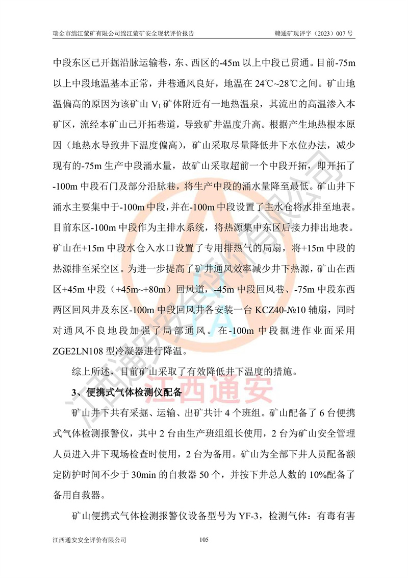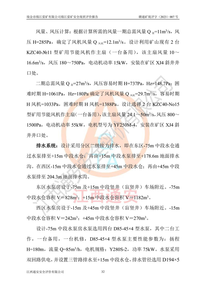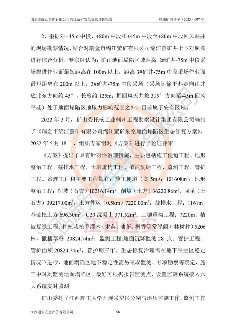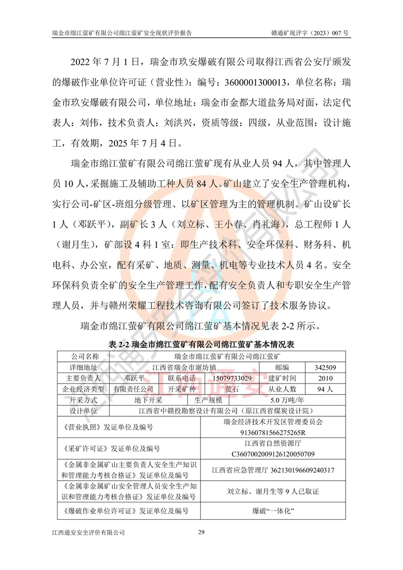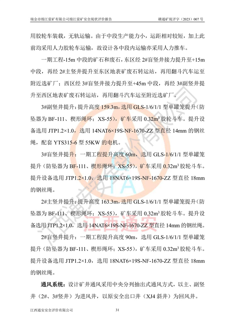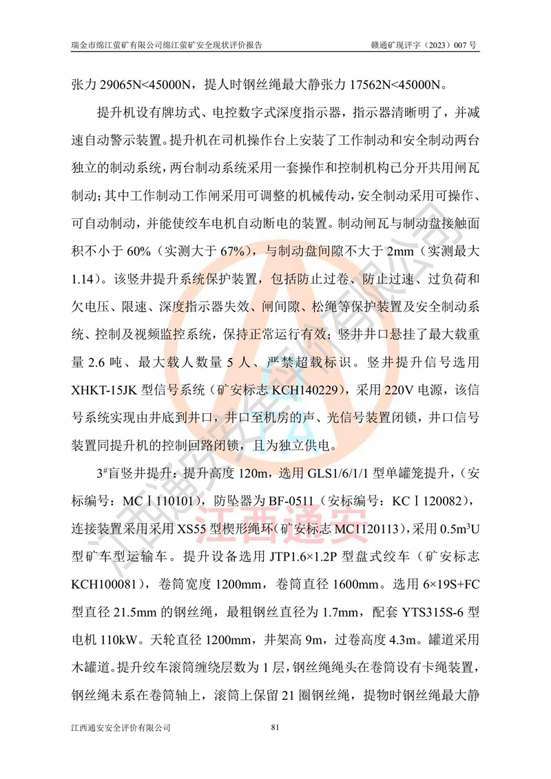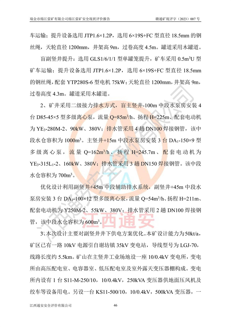 绵江萤矿矿区位于瑞金市南西210°方向,直线距离约26km,矿区地理坐标为东径115°50′54″~115°51′31″,北纬25°38′52″~25°39′34″,行政区划隶属于瑞金市谢坊镇深塘村管辖。 瑞金市绵江萤矿自1972年始有当地村民小规模陆续开采,1978年收归瑞金县谢坊乡管理,成立谢坊乡萤石矿,同年收归县管改名为瑞金县萤石矿,再经历多次采矿权人变更后,至2010年矿山由深圳市新星轻质合金材料有限公司收购瑞金市绵江萤石矿为其全资子公司,同时成立瑞金市绵江萤矿有限公司为现矿山采矿权人。2021年5月28日,深圳市新星轻质合金材料有限公司将其持有的绵江萤矿****股权及派生权益质押给瑞金市金鑫矿产品实业有限公司,采矿权人未变。 矿山于2014年1月20日取得原江西省国土资源厅颁发的采矿许可证,证号:C3607002009126120050709,采矿权人:瑞金市绵江萤矿有限公司,地址:江西省赣州市瑞金市,矿山名称:瑞金市绵江萤矿有限公司绵江萤矿,经济类型:私营有限责任公司,开采矿种:萤石(普通),开采方式:地下开采,生产规模:5.00万t/a,矿区面积;0.5053km2,**期限:壹拾贰年自2014年1月20日至2026年1月20日。开采深度由238m至-100m标高,共有8个拐点圈定。 2014年6月,企业委托江西省煤矿设计院编制了《瑞金市绵江萤矿有限公司绵江萤矿扩建工程初步设计说明书》和《瑞金市绵江萤矿有限公司绵江萤矿扩建工程初步设计说明书安全专篇》。并于2014年6月19日省安监局组织专家对《瑞金市绵江萤矿有限公司绵江萤矿扩建工程初步设计说明书安全专篇》进行了评审并原则通过,2014年7月18日由江西省安监局下达了《关于瑞金市绵江萤矿有限公司绵江萤矿扩建工程初步设计说明书安全专篇》的审查意见书(赣安监非煤项目设审[2014]46号)。矿山扩建工程设计采用竖井+盲竖井联合开拓,延深共布置-15m、-45m、-75m、-100m四个中段。采矿方法为浅孔留矿法,通风系统采用中央对角抽出式机械通风,主扇安装在4#回风斜井井口,矿山生产规模为5万t/a,服务年限为10年。 2016年7月,矿山委托江西通安安全评价有限公司编制了《瑞金市绵江萤矿有限公司绵江萤矿地下开采扩建工程安全设施验收评价报告》。2016年7月31日-8月2日,公司组织有关专家对江西通安安全评价有限公司编制的《瑞金市绵江萤矿有限公司绵江萤矿地下开采扩建工程安全设施验收评价报告》进行了评审,同时对瑞金市绵江萤矿有限公司绵江萤矿地下开采扩建工程建设项目安全设施进行了现场验收并原则通过。瑞金市安监局依法对验收过程及结果进行监督。 2020年10月12日,矿山取得江西省应急管理换发的安全生产许可证。编号:(赣)FM安许证字[2005]M0029号,单位名称:瑞金市绵江萤矿有限公司绵江萤矿地下开采,主要负责人:陈勇,单位地址:江西省瑞金市谢坊镇深塘村,经济类型:有限责任公司,许可范围:萤石矿5万t/a,竖井+盲竖井联合开拓,-75m、-100m中段地下开采,**期:2020年10月27日至2023年10月26日。 矿山取得安全生产许可证后,严格按照设计回采顺序(中段按从上到下的顺序开采,同时开采中段数为一个)要求进行开采,目前矿山-15m、-45m中段已结束回采。矿山现采用竖井+盲竖井联合开拓。东区2#竖井(SJ2)为主竖井,西区3#竖井(SJ3)为副竖井,XJ4斜井为回风井兼做安全出口。矿山共开拓了+170、+110m、+80m、+65m、+45m、+15m、-15m、-45m、-75m、-100m等十个中段,其中-45m以上中段已回采结束,目前-75m为主要生产中段,-45m为回风中段,-100m为生产开拓中段。-75m中段东、西两区运输巷道已贯通,并已掘三个通风天井连接至-45m中段,东区-100m中段已掘穿脉、沿脉巷道100m。东、西区的-45m以上中段均已贯通。东区+15m中段已开拓2#盲竖井至-100m中段,2#盲竖井连接-15m、-45m、-75m、-100m四个中段。西区+45m中段已开拓3#盲竖井至-75m中段,3#盲竖井连接+15m、-15m、-45m、-75m四个中段,并计划按设计延伸至-100m中段。 2019年3月-2020年6月矿山对提升运输系统设备设施进行了改造,各中段及竖井、盲竖井井口运输由原无轨胶轮车运输改为0.5m3U型矿车运输,各东、西区竖井及盲竖井均新安装了BF-0511防坠器,新更换了GLS1/6/1/1罐笼。随着矿山进行深部开拓,井下需风量及风阻随之变大,为了满足矿山通风系统要求,矿山将设计一期工程15kW型号KCZ40-№11主扇风机,更换为二期工程55kW型号KZC40-№13主扇,进一步提高了矿井通风效率。同时将东、西两区竖井及盲竖井原JTP-1.2×1.0P绞车更换为JTP-1.6×1.2P型绞车。 为了进一步优化矿山提升运输、排水、供电等系统,2022年10月,矿山委托江西省中赣投勘察设计有限公司(原江西省煤矿设计院)编制了《瑞金市绵江萤矿有限公司绵江萤矿地下开采提升运输、排水、供电优化方案设计》。至2023年8月,矿山按优化方案完成了改造,并委托江西华安检测技术服务有限公司对设备设施进行检测,检测结果合格。 根据《安全生产法》、《安全生产许可证条例》等有关法律、法规的规定以及《关于做好非煤矿矿山企业安全生产许可证延期换证工作的通知》的要求,2023年4月,瑞金市绵江萤矿有限公司委托我公司(江西通安安全评价有限公司)对绵江萤矿进行安全现状评价。 |