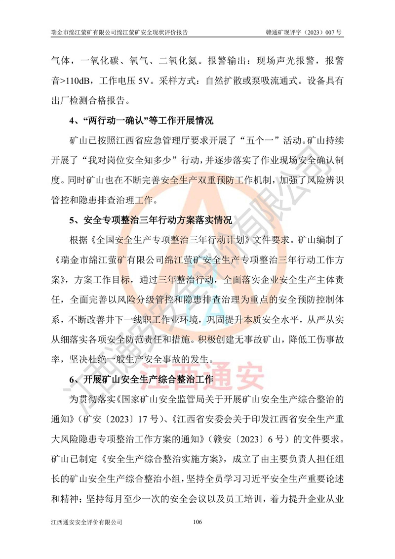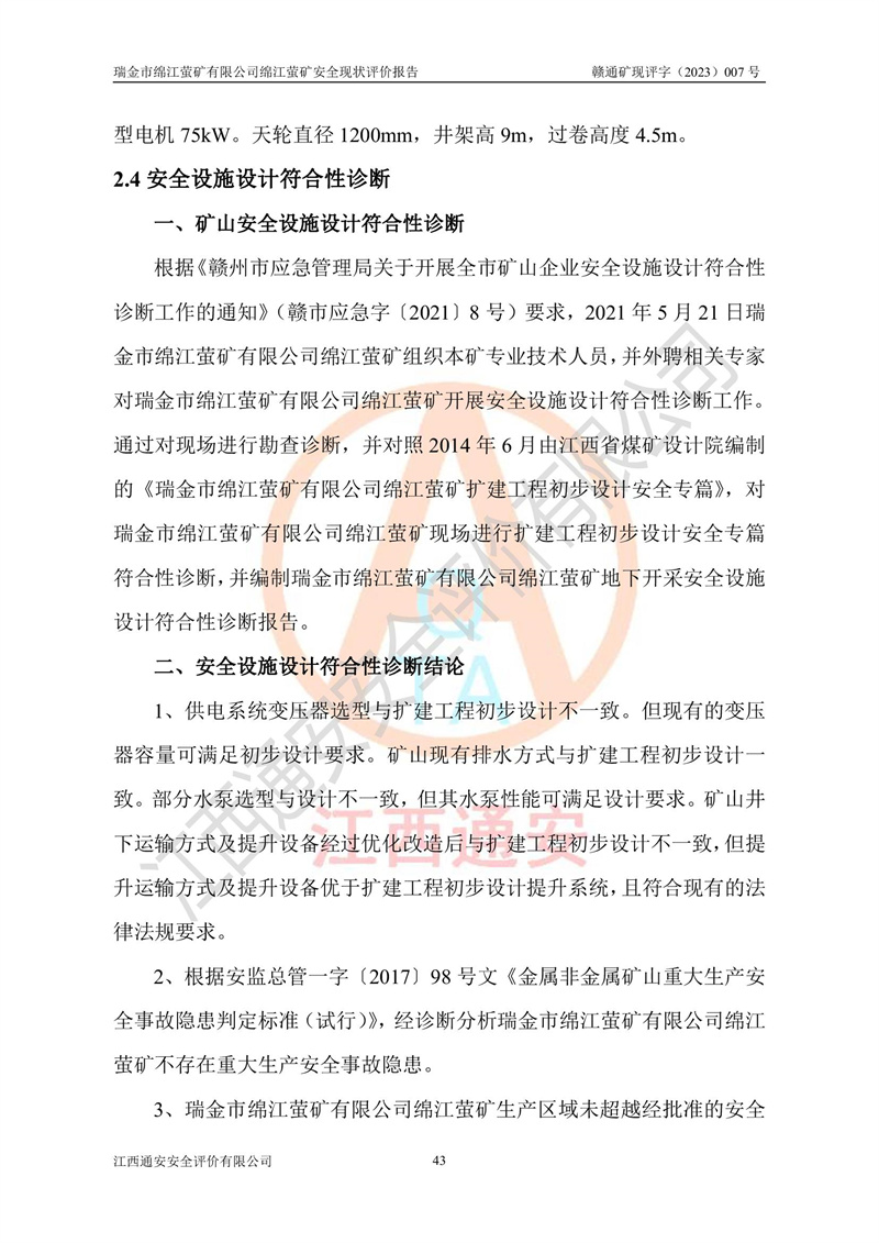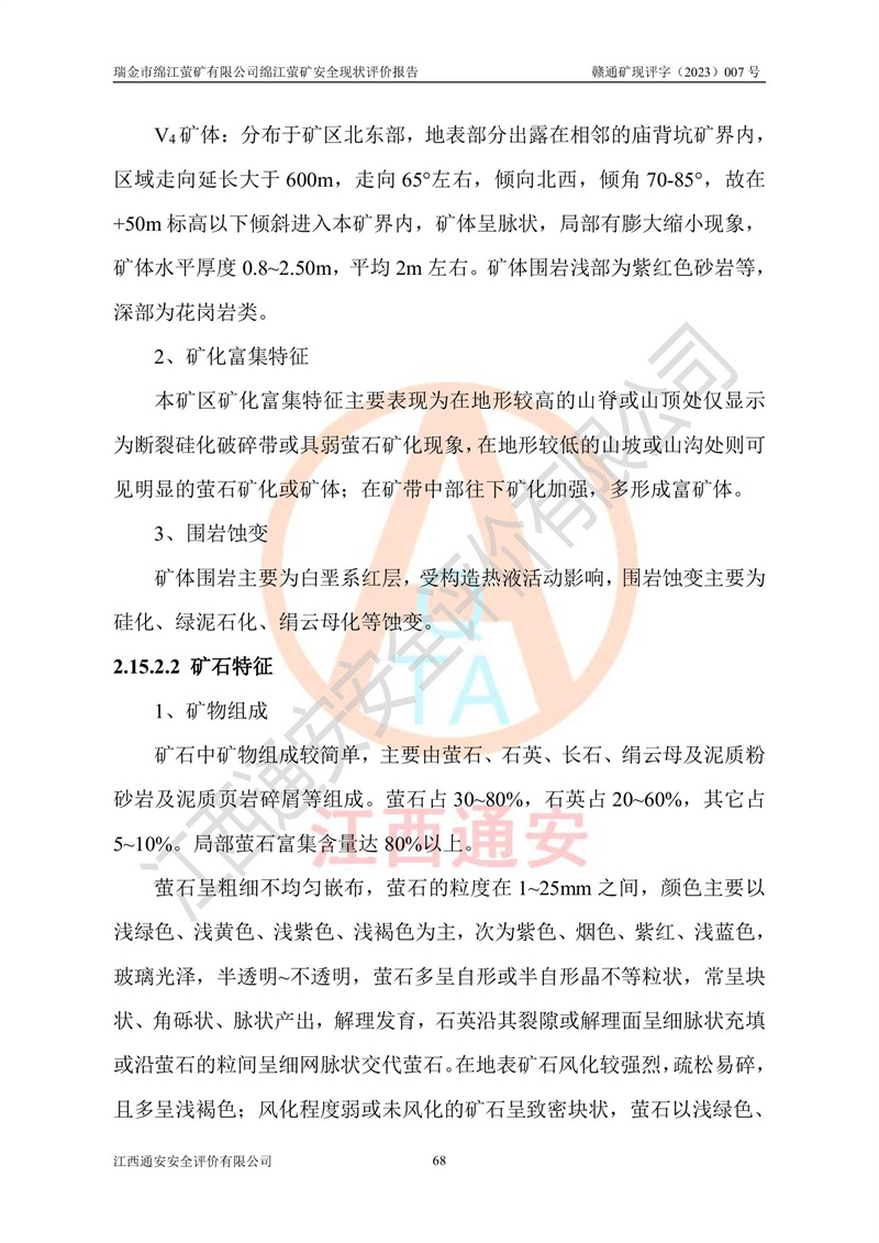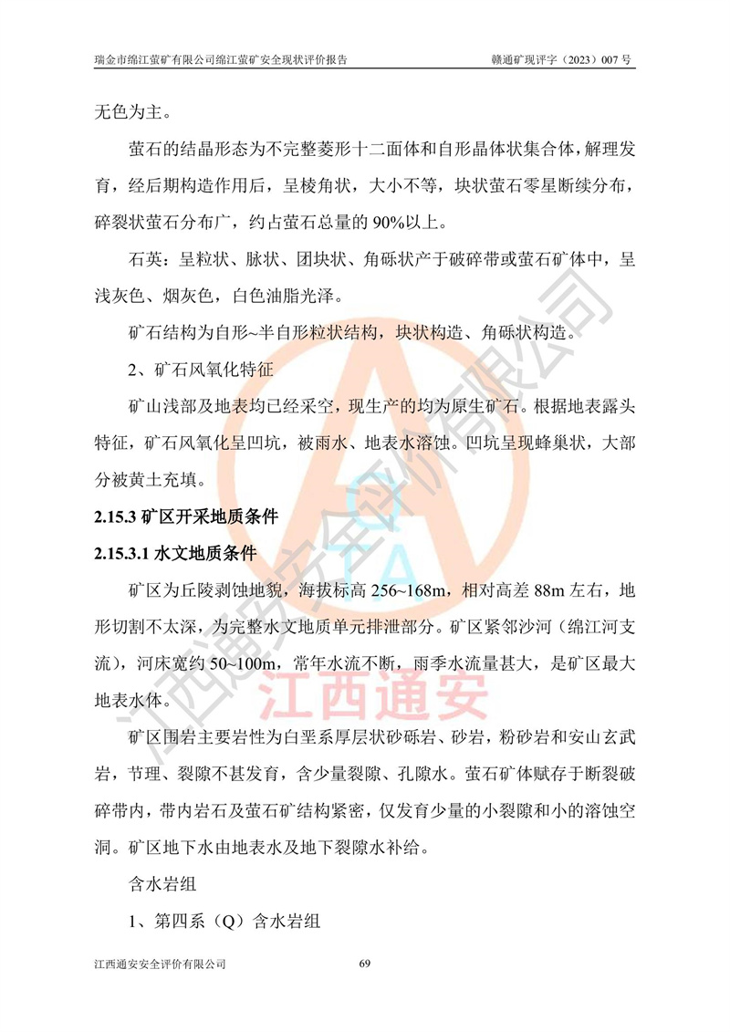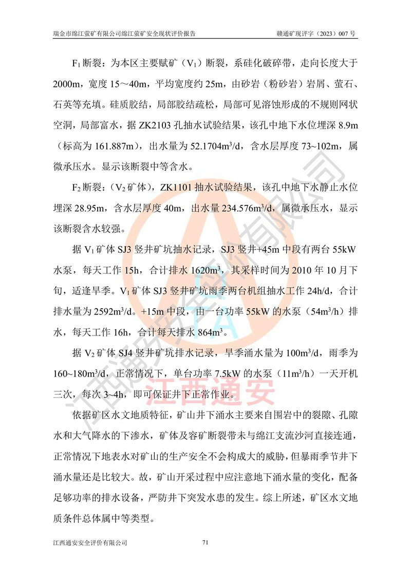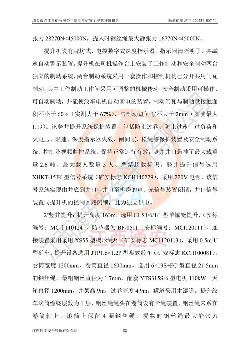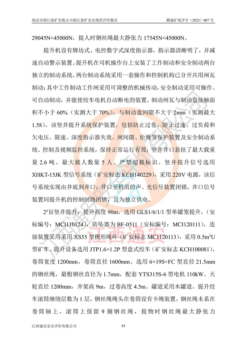 绵江萤矿矿区位于瑞金市南西210°方向,直线距离约26km,矿区地理坐标为东径115°50′54″~115°51′31″,北纬25°38′52″~25°39′34″,行政区划隶属于瑞金市谢坊镇深塘村管辖。 瑞金市绵江萤矿自1972年始有当地村民小规模陆续开采,1978年收归瑞金县谢坊乡管理,成立谢坊乡萤石矿,同年收归县管改名为瑞金县萤石矿,再经历多次采矿权人变更后,至2010年矿山由深圳市新星轻质合金材料有限公司收购瑞金市绵江萤石矿为其全资子公司,同时成立瑞金市绵江萤矿有限公司为现矿山采矿权人。2021年5月28日,深圳市新星轻质合金材料有限公司将其持有的绵江萤矿****股权及派生权益质押给瑞金市金鑫矿产品实业有限公司,采矿权人未变。 矿山于2014年1月20日取得原江西省国土资源厅颁发的采矿许可证,证号:C3607002009126120050709,采矿权人:瑞金市绵江萤矿有限公司,地址:江西省赣州市瑞金市,矿山名称:瑞金市绵江萤矿有限公司绵江萤矿,经济类型:私营有限责任公司,开采矿种:萤石(普通),开采方式:地下开采,生产规模:5.00万t/a,矿区面积;0.5053km2,**期限:壹拾贰年自2014年1月20日至2026年1月20日。开采深度由238m至-100m标高,共有8个拐点圈定。 2014年6月,企业委托江西省煤矿设计院编制了《瑞金市绵江萤矿有限公司绵江萤矿扩建工程初步设计说明书》和《瑞金市绵江萤矿有限公司绵江萤矿扩建工程初步设计说明书安全专篇》。并于2014年6月19日省安监局组织专家对《瑞金市绵江萤矿有限公司绵江萤矿扩建工程初步设计说明书安全专篇》进行了评审并原则通过,2014年7月18日由江西省安监局下达了《关于瑞金市绵江萤矿有限公司绵江萤矿扩建工程初步设计说明书安全专篇》的审查意见书(赣安监非煤项目设审[2014]46号)。矿山扩建工程设计采用竖井+盲竖井联合开拓,延深共布置-15m、-45m、-75m、-100m四个中段。采矿方法为浅孔留矿法,通风系统采用中央对角抽出式机械通风,主扇安装在4#回风斜井井口,矿山生产规模为5万t/a,服务年限为10年。 2016年7月,矿山委托江西通安安全评价有限公司编制了《瑞金市绵江萤矿有限公司绵江萤矿地下开采扩建工程安全设施验收评价报告》。2016年7月31日-8月2日,公司组织有关专家对江西通安安全评价有限公司编制的《瑞金市绵江萤矿有限公司绵江萤矿地下开采扩建工程安全设施验收评价报告》进行了评审,同时对瑞金市绵江萤矿有限公司绵江萤矿地下开采扩建工程建设项目安全设施进行了现场验收并原则通过。瑞金市安监局依法对验收过程及结果进行监督。 2020年10月12日,矿山取得江西省应急管理换发的安全生产许可证。编号:(赣)FM安许证字[2005]M0029号,单位名称:瑞金市绵江萤矿有限公司绵江萤矿地下开采,主要负责人:陈勇,单位地址:江西省瑞金市谢坊镇深塘村,经济类型:有限责任公司,许可范围:萤石矿5万t/a,竖井+盲竖井联合开拓,-75m、-100m中段地下开采,**期:2020年10月27日至2023年10月26日。 矿山取得安全生产许可证后,严格按照设计回采顺序(中段按从上到下的顺序开采,同时开采中段数为一个)要求进行开采,目前矿山-15m、-45m中段已结束回采。矿山现采用竖井+盲竖井联合开拓。东区2#竖井(SJ2)为主竖井,西区3#竖井(SJ3)为副竖井,XJ4斜井为回风井兼做安全出口。矿山共开拓了+170、+110m、+80m、+65m、+45m、+15m、-15m、-45m、-75m、-100m等十个中段,其中-45m以上中段已回采结束,目前-75m为主要生产中段,-45m为回风中段,-100m为生产开拓中段。-75m中段东、西两区运输巷道已贯通,并已掘三个通风天井连接至-45m中段,东区-100m中段已掘穿脉、沿脉巷道100m。东、西区的-45m以上中段均已贯通。东区+15m中段已开拓2#盲竖井至-100m中段,2#盲竖井连接-15m、-45m、-75m、-100m四个中段。西区+45m中段已开拓3#盲竖井至-75m中段,3#盲竖井连接+15m、-15m、-45m、-75m四个中段,并计划按设计延伸至-100m中段。 2019年3月-2020年6月矿山对提升运输系统设备设施进行了改造,各中段及竖井、盲竖井井口运输由原无轨胶轮车运输改为0.5m3U型矿车运输,各东、西区竖井及盲竖井均新安装了BF-0511防坠器,新更换了GLS1/6/1/1罐笼。随着矿山进行深部开拓,井下需风量及风阻随之变大,为了满足矿山通风系统要求,矿山将设计一期工程15kW型号KCZ40-№11主扇风机,更换为二期工程55kW型号KZC40-№13主扇,进一步提高了矿井通风效率。同时将东、西两区竖井及盲竖井原JTP-1.2×1.0P绞车更换为JTP-1.6×1.2P型绞车。 为了进一步优化矿山提升运输、排水、供电等系统,2022年10月,矿山委托江西省中赣投勘察设计有限公司(原江西省煤矿设计院)编制了《瑞金市绵江萤矿有限公司绵江萤矿地下开采提升运输、排水、供电优化方案设计》。至2023年8月,矿山按优化方案完成了改造,并委托江西华安检测技术服务有限公司对设备设施进行检测,检测结果合格。 根据《安全生产法》、《安全生产许可证条例》等有关法律、法规的规定以及《关于做好非煤矿矿山企业安全生产许可证延期换证工作的通知》的要求,2023年4月,瑞金市绵江萤矿有限公司委托我公司(江西通安安全评价有限公司)对绵江萤矿进行安全现状评价。 |