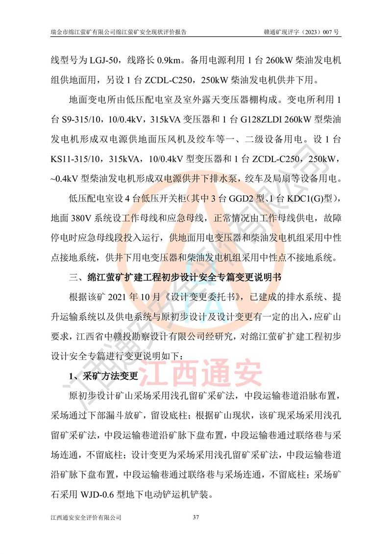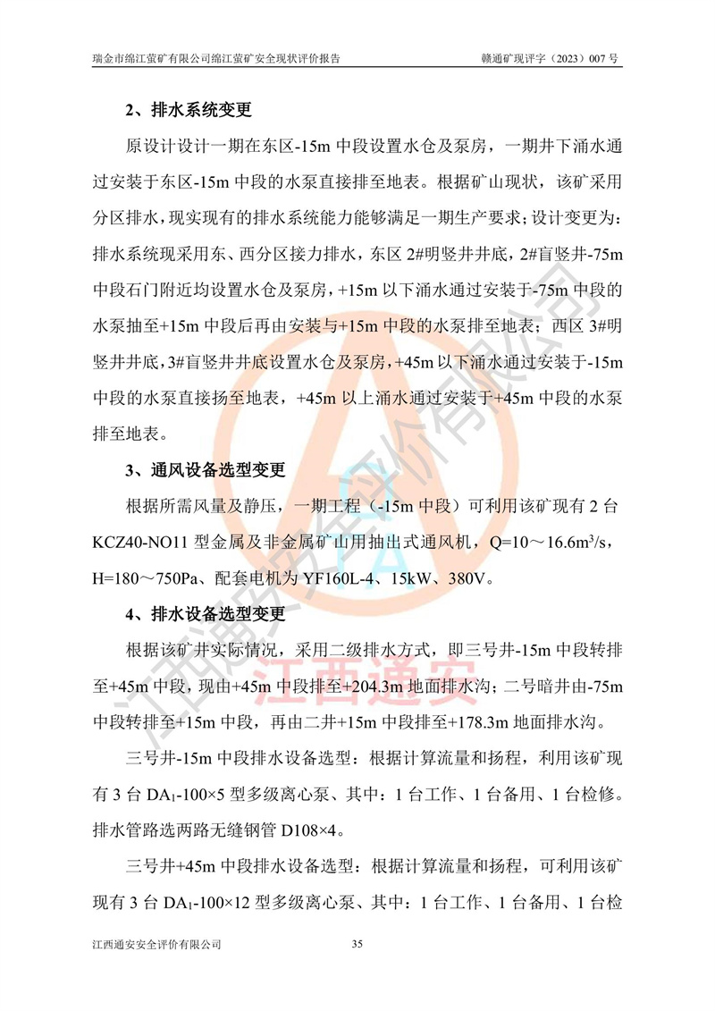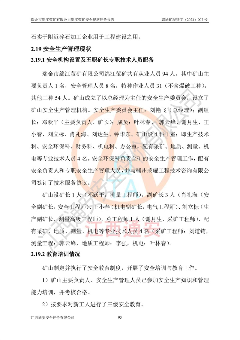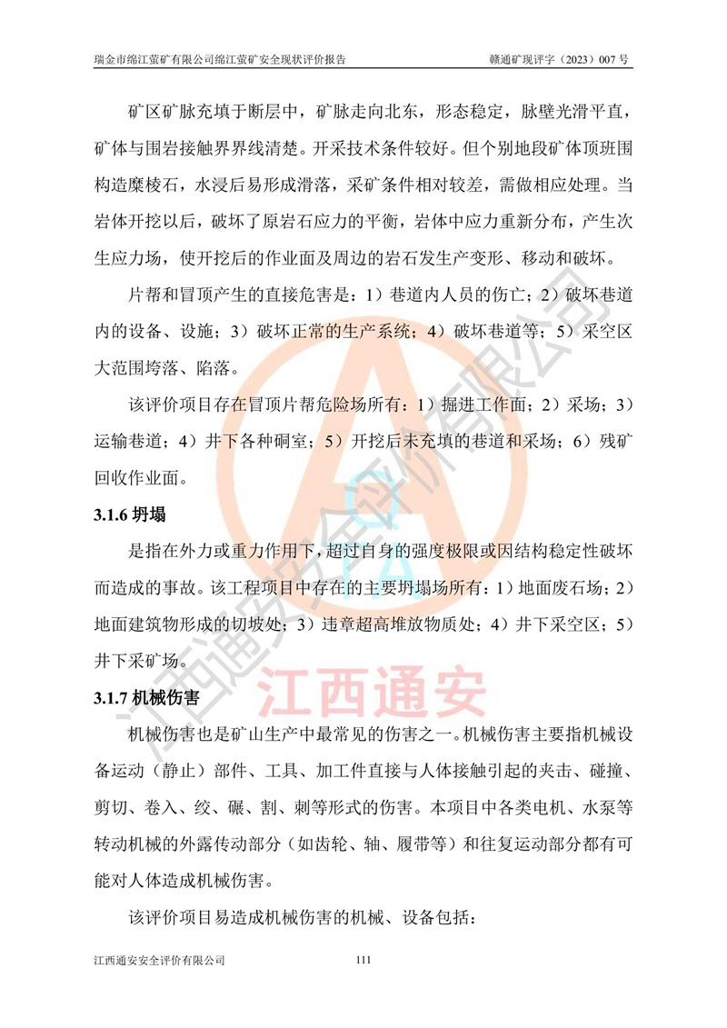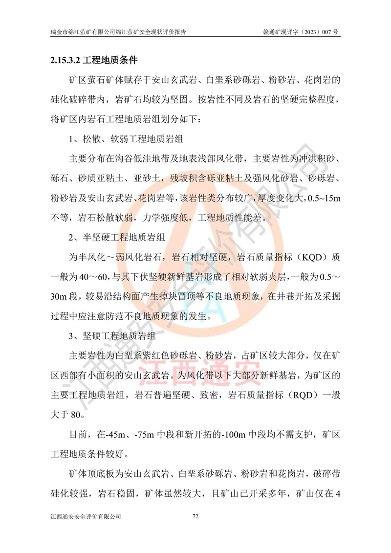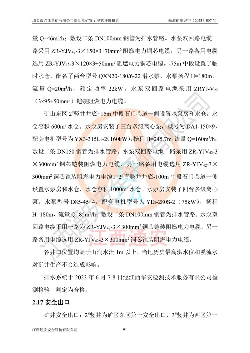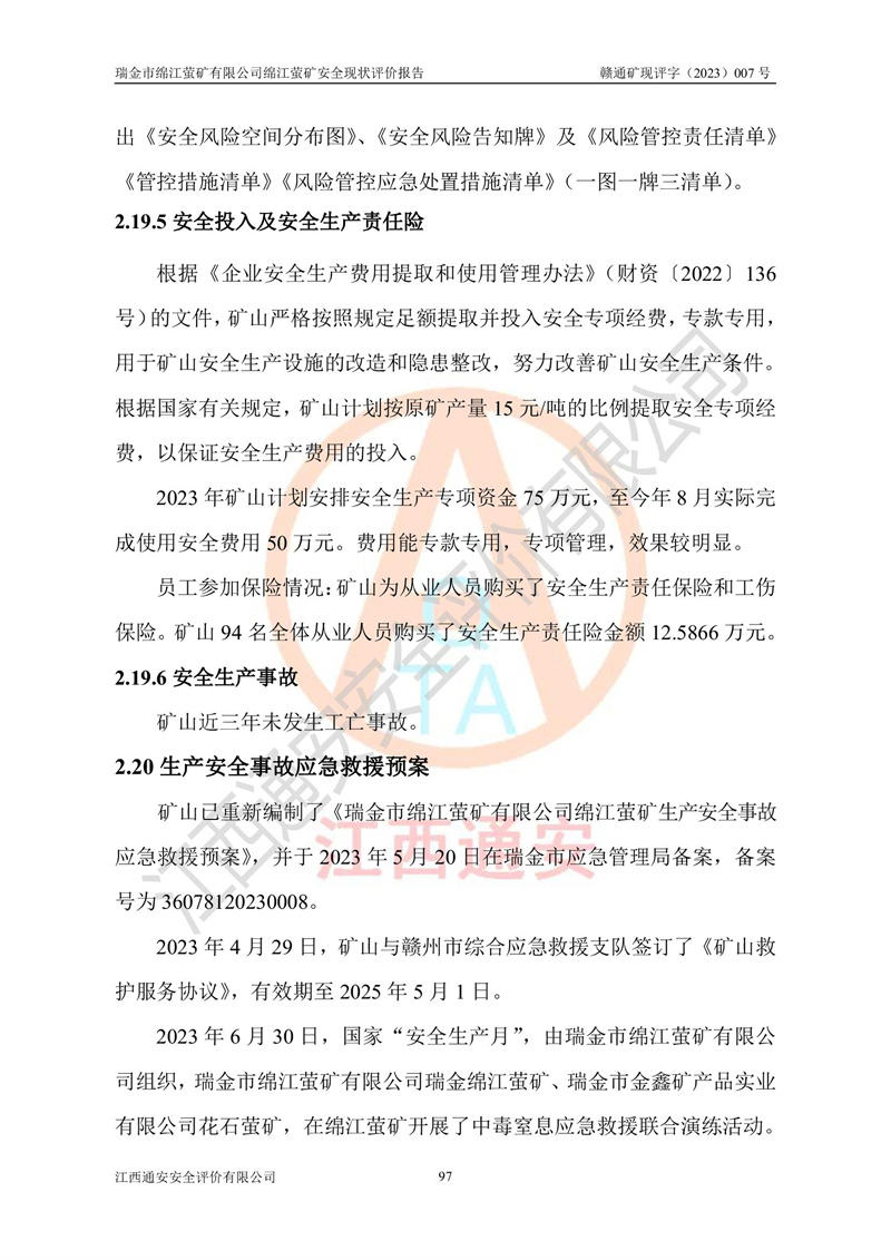 绵江萤矿矿区位于瑞金市南西210°方向,直线距离约26km,矿区地理坐标为东径115°50′54″~115°51′31″,北纬25°38′52″~25°39′34″,行政区划隶属于瑞金市谢坊镇深塘村管辖。 瑞金市绵江萤矿自1972年始有当地村民小规模陆续开采,1978年收归瑞金县谢坊乡管理,成立谢坊乡萤石矿,同年收归县管改名为瑞金县萤石矿,再经历多次采矿权人变更后,至2010年矿山由深圳市新星轻质合金材料有限公司收购瑞金市绵江萤石矿为其全资子公司,同时成立瑞金市绵江萤矿有限公司为现矿山采矿权人。2021年5月28日,深圳市新星轻质合金材料有限公司将其持有的绵江萤矿****股权及派生权益质押给瑞金市金鑫矿产品实业有限公司,采矿权人未变。 矿山于2014年1月20日取得原江西省国土资源厅颁发的采矿许可证,证号:C3607002009126120050709,采矿权人:瑞金市绵江萤矿有限公司,地址:江西省赣州市瑞金市,矿山名称:瑞金市绵江萤矿有限公司绵江萤矿,经济类型:私营有限责任公司,开采矿种:萤石(普通),开采方式:地下开采,生产规模:5.00万t/a,矿区面积;0.5053km2,**期限:壹拾贰年自2014年1月20日至2026年1月20日。开采深度由238m至-100m标高,共有8个拐点圈定。 2014年6月,企业委托江西省煤矿设计院编制了《瑞金市绵江萤矿有限公司绵江萤矿扩建工程初步设计说明书》和《瑞金市绵江萤矿有限公司绵江萤矿扩建工程初步设计说明书安全专篇》。并于2014年6月19日省安监局组织专家对《瑞金市绵江萤矿有限公司绵江萤矿扩建工程初步设计说明书安全专篇》进行了评审并原则通过,2014年7月18日由江西省安监局下达了《关于瑞金市绵江萤矿有限公司绵江萤矿扩建工程初步设计说明书安全专篇》的审查意见书(赣安监非煤项目设审[2014]46号)。矿山扩建工程设计采用竖井+盲竖井联合开拓,延深共布置-15m、-45m、-75m、-100m四个中段。采矿方法为浅孔留矿法,通风系统采用中央对角抽出式机械通风,主扇安装在4#回风斜井井口,矿山生产规模为5万t/a,服务年限为10年。 2016年7月,矿山委托江西通安安全评价有限公司编制了《瑞金市绵江萤矿有限公司绵江萤矿地下开采扩建工程安全设施验收评价报告》。2016年7月31日-8月2日,公司组织有关专家对江西通安安全评价有限公司编制的《瑞金市绵江萤矿有限公司绵江萤矿地下开采扩建工程安全设施验收评价报告》进行了评审,同时对瑞金市绵江萤矿有限公司绵江萤矿地下开采扩建工程建设项目安全设施进行了现场验收并原则通过。瑞金市安监局依法对验收过程及结果进行监督。 2020年10月12日,矿山取得江西省应急管理换发的安全生产许可证。编号:(赣)FM安许证字[2005]M0029号,单位名称:瑞金市绵江萤矿有限公司绵江萤矿地下开采,主要负责人:陈勇,单位地址:江西省瑞金市谢坊镇深塘村,经济类型:有限责任公司,许可范围:萤石矿5万t/a,竖井+盲竖井联合开拓,-75m、-100m中段地下开采,**期:2020年10月27日至2023年10月26日。 矿山取得安全生产许可证后,严格按照设计回采顺序(中段按从上到下的顺序开采,同时开采中段数为一个)要求进行开采,目前矿山-15m、-45m中段已结束回采。矿山现采用竖井+盲竖井联合开拓。东区2#竖井(SJ2)为主竖井,西区3#竖井(SJ3)为副竖井,XJ4斜井为回风井兼做安全出口。矿山共开拓了+170、+110m、+80m、+65m、+45m、+15m、-15m、-45m、-75m、-100m等十个中段,其中-45m以上中段已回采结束,目前-75m为主要生产中段,-45m为回风中段,-100m为生产开拓中段。-75m中段东、西两区运输巷道已贯通,并已掘三个通风天井连接至-45m中段,东区-100m中段已掘穿脉、沿脉巷道100m。东、西区的-45m以上中段均已贯通。东区+15m中段已开拓2#盲竖井至-100m中段,2#盲竖井连接-15m、-45m、-75m、-100m四个中段。西区+45m中段已开拓3#盲竖井至-75m中段,3#盲竖井连接+15m、-15m、-45m、-75m四个中段,并计划按设计延伸至-100m中段。 2019年3月-2020年6月矿山对提升运输系统设备设施进行了改造,各中段及竖井、盲竖井井口运输由原无轨胶轮车运输改为0.5m3U型矿车运输,各东、西区竖井及盲竖井均新安装了BF-0511防坠器,新更换了GLS1/6/1/1罐笼。随着矿山进行深部开拓,井下需风量及风阻随之变大,为了满足矿山通风系统要求,矿山将设计一期工程15kW型号KCZ40-№11主扇风机,更换为二期工程55kW型号KZC40-№13主扇,进一步提高了矿井通风效率。同时将东、西两区竖井及盲竖井原JTP-1.2×1.0P绞车更换为JTP-1.6×1.2P型绞车。 为了进一步优化矿山提升运输、排水、供电等系统,2022年10月,矿山委托江西省中赣投勘察设计有限公司(原江西省煤矿设计院)编制了《瑞金市绵江萤矿有限公司绵江萤矿地下开采提升运输、排水、供电优化方案设计》。至2023年8月,矿山按优化方案完成了改造,并委托江西华安检测技术服务有限公司对设备设施进行检测,检测结果合格。 根据《安全生产法》、《安全生产许可证条例》等有关法律、法规的规定以及《关于做好非煤矿矿山企业安全生产许可证延期换证工作的通知》的要求,2023年4月,瑞金市绵江萤矿有限公司委托我公司(江西通安安全评价有限公司)对绵江萤矿进行安全现状评价。 |