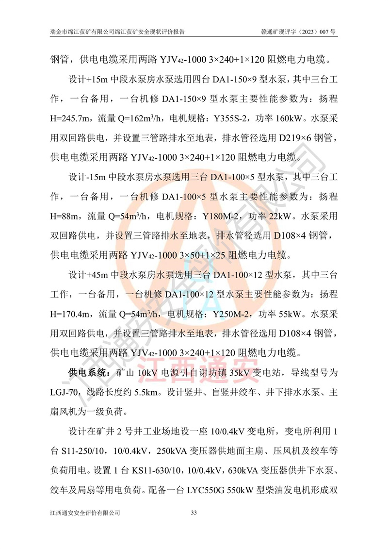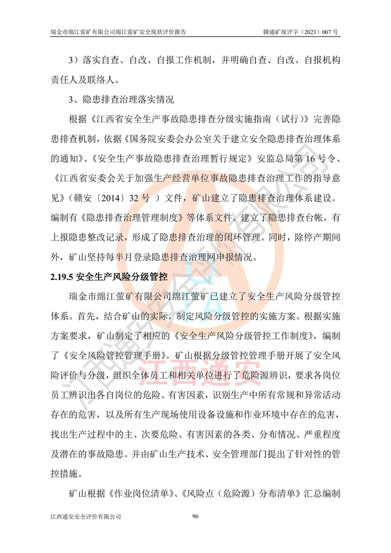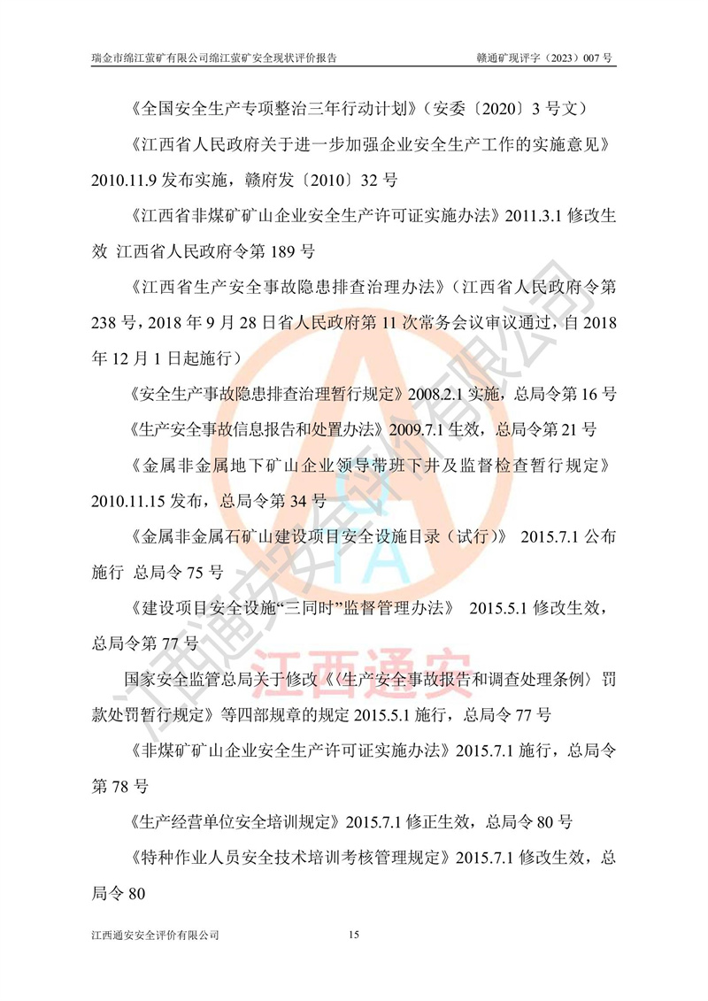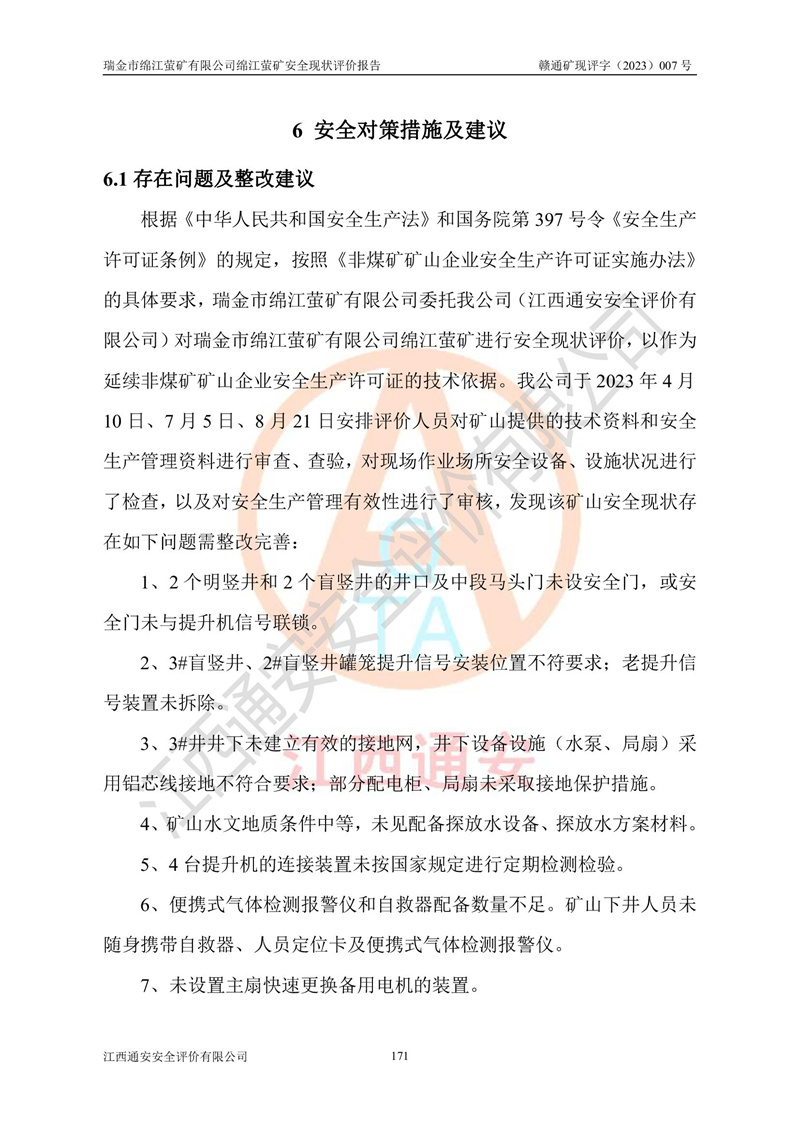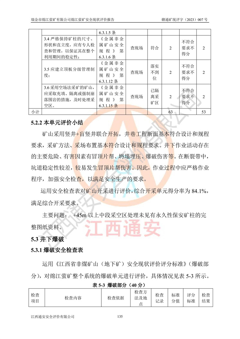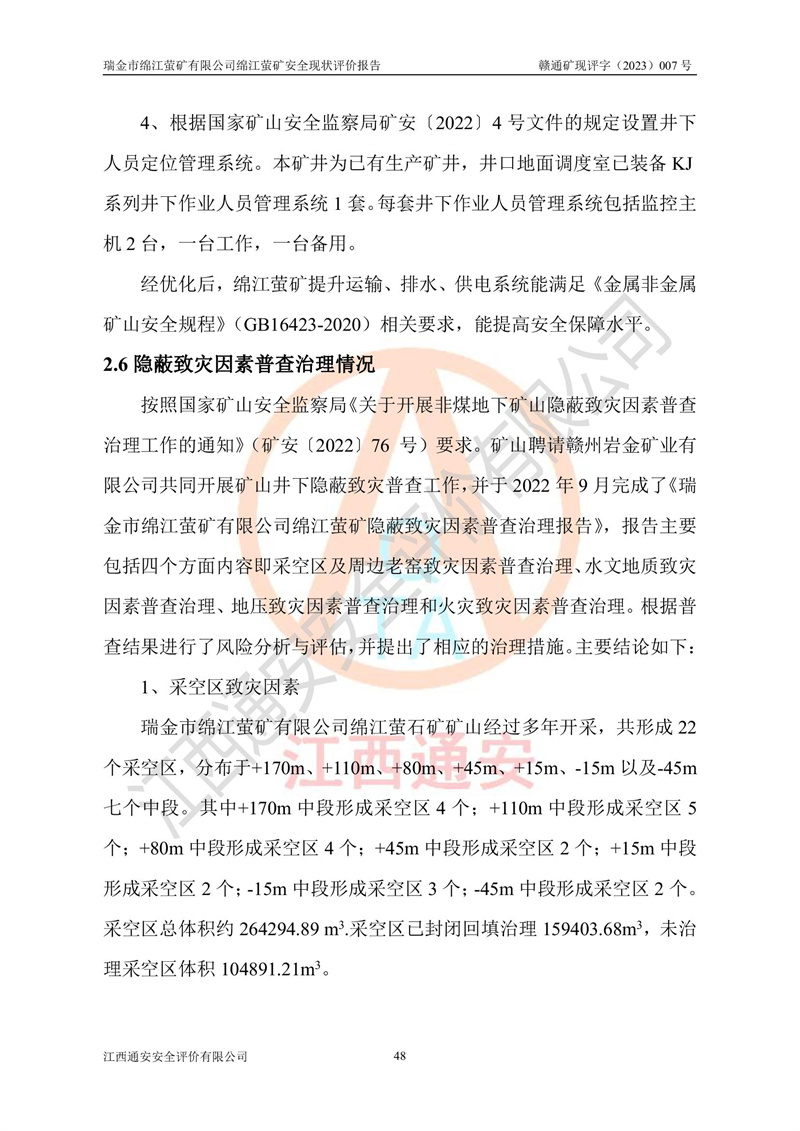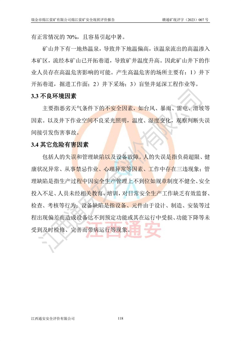 绵江萤矿矿区位于瑞金市南西210°方向,直线距离约26km,矿区地理坐标为东径115°50′54″~115°51′31″,北纬25°38′52″~25°39′34″,行政区划隶属于瑞金市谢坊镇深塘村管辖。 瑞金市绵江萤矿自1972年始有当地村民小规模陆续开采,1978年收归瑞金县谢坊乡管理,成立谢坊乡萤石矿,同年收归县管改名为瑞金县萤石矿,再经历多次采矿权人变更后,至2010年矿山由深圳市新星轻质合金材料有限公司收购瑞金市绵江萤石矿为其全资子公司,同时成立瑞金市绵江萤矿有限公司为现矿山采矿权人。2021年5月28日,深圳市新星轻质合金材料有限公司将其持有的绵江萤矿****股权及派生权益质押给瑞金市金鑫矿产品实业有限公司,采矿权人未变。 矿山于2014年1月20日取得原江西省国土资源厅颁发的采矿许可证,证号:C3607002009126120050709,采矿权人:瑞金市绵江萤矿有限公司,地址:江西省赣州市瑞金市,矿山名称:瑞金市绵江萤矿有限公司绵江萤矿,经济类型:私营有限责任公司,开采矿种:萤石(普通),开采方式:地下开采,生产规模:5.00万t/a,矿区面积;0.5053km2,**期限:壹拾贰年自2014年1月20日至2026年1月20日。开采深度由238m至-100m标高,共有8个拐点圈定。 2014年6月,企业委托江西省煤矿设计院编制了《瑞金市绵江萤矿有限公司绵江萤矿扩建工程初步设计说明书》和《瑞金市绵江萤矿有限公司绵江萤矿扩建工程初步设计说明书安全专篇》。并于2014年6月19日省安监局组织专家对《瑞金市绵江萤矿有限公司绵江萤矿扩建工程初步设计说明书安全专篇》进行了评审并原则通过,2014年7月18日由江西省安监局下达了《关于瑞金市绵江萤矿有限公司绵江萤矿扩建工程初步设计说明书安全专篇》的审查意见书(赣安监非煤项目设审[2014]46号)。矿山扩建工程设计采用竖井+盲竖井联合开拓,延深共布置-15m、-45m、-75m、-100m四个中段。采矿方法为浅孔留矿法,通风系统采用中央对角抽出式机械通风,主扇安装在4#回风斜井井口,矿山生产规模为5万t/a,服务年限为10年。 2016年7月,矿山委托江西通安安全评价有限公司编制了《瑞金市绵江萤矿有限公司绵江萤矿地下开采扩建工程安全设施验收评价报告》。2016年7月31日-8月2日,公司组织有关专家对江西通安安全评价有限公司编制的《瑞金市绵江萤矿有限公司绵江萤矿地下开采扩建工程安全设施验收评价报告》进行了评审,同时对瑞金市绵江萤矿有限公司绵江萤矿地下开采扩建工程建设项目安全设施进行了现场验收并原则通过。瑞金市安监局依法对验收过程及结果进行监督。 2020年10月12日,矿山取得江西省应急管理换发的安全生产许可证。编号:(赣)FM安许证字[2005]M0029号,单位名称:瑞金市绵江萤矿有限公司绵江萤矿地下开采,主要负责人:陈勇,单位地址:江西省瑞金市谢坊镇深塘村,经济类型:有限责任公司,许可范围:萤石矿5万t/a,竖井+盲竖井联合开拓,-75m、-100m中段地下开采,**期:2020年10月27日至2023年10月26日。 矿山取得安全生产许可证后,严格按照设计回采顺序(中段按从上到下的顺序开采,同时开采中段数为一个)要求进行开采,目前矿山-15m、-45m中段已结束回采。矿山现采用竖井+盲竖井联合开拓。东区2#竖井(SJ2)为主竖井,西区3#竖井(SJ3)为副竖井,XJ4斜井为回风井兼做安全出口。矿山共开拓了+170、+110m、+80m、+65m、+45m、+15m、-15m、-45m、-75m、-100m等十个中段,其中-45m以上中段已回采结束,目前-75m为主要生产中段,-45m为回风中段,-100m为生产开拓中段。-75m中段东、西两区运输巷道已贯通,并已掘三个通风天井连接至-45m中段,东区-100m中段已掘穿脉、沿脉巷道100m。东、西区的-45m以上中段均已贯通。东区+15m中段已开拓2#盲竖井至-100m中段,2#盲竖井连接-15m、-45m、-75m、-100m四个中段。西区+45m中段已开拓3#盲竖井至-75m中段,3#盲竖井连接+15m、-15m、-45m、-75m四个中段,并计划按设计延伸至-100m中段。 2019年3月-2020年6月矿山对提升运输系统设备设施进行了改造,各中段及竖井、盲竖井井口运输由原无轨胶轮车运输改为0.5m3U型矿车运输,各东、西区竖井及盲竖井均新安装了BF-0511防坠器,新更换了GLS1/6/1/1罐笼。随着矿山进行深部开拓,井下需风量及风阻随之变大,为了满足矿山通风系统要求,矿山将设计一期工程15kW型号KCZ40-№11主扇风机,更换为二期工程55kW型号KZC40-№13主扇,进一步提高了矿井通风效率。同时将东、西两区竖井及盲竖井原JTP-1.2×1.0P绞车更换为JTP-1.6×1.2P型绞车。 为了进一步优化矿山提升运输、排水、供电等系统,2022年10月,矿山委托江西省中赣投勘察设计有限公司(原江西省煤矿设计院)编制了《瑞金市绵江萤矿有限公司绵江萤矿地下开采提升运输、排水、供电优化方案设计》。至2023年8月,矿山按优化方案完成了改造,并委托江西华安检测技术服务有限公司对设备设施进行检测,检测结果合格。 根据《安全生产法》、《安全生产许可证条例》等有关法律、法规的规定以及《关于做好非煤矿矿山企业安全生产许可证延期换证工作的通知》的要求,2023年4月,瑞金市绵江萤矿有限公司委托我公司(江西通安安全评价有限公司)对绵江萤矿进行安全现状评价。 |