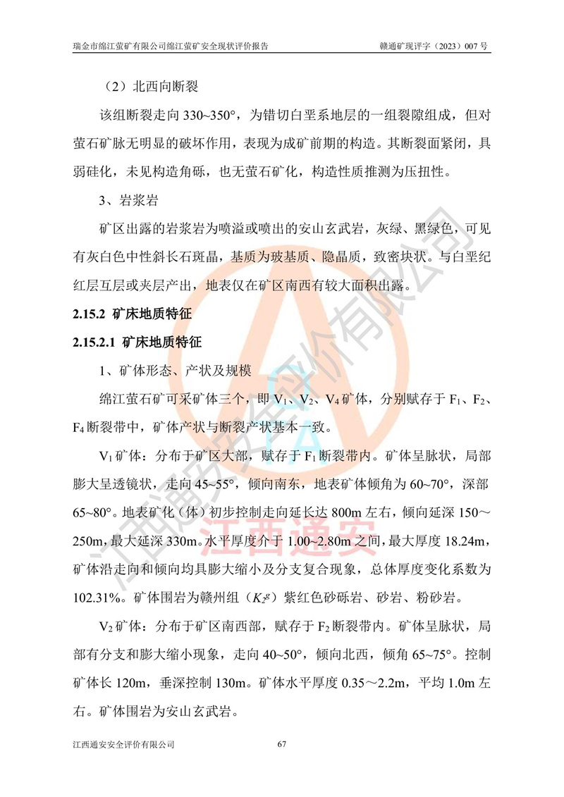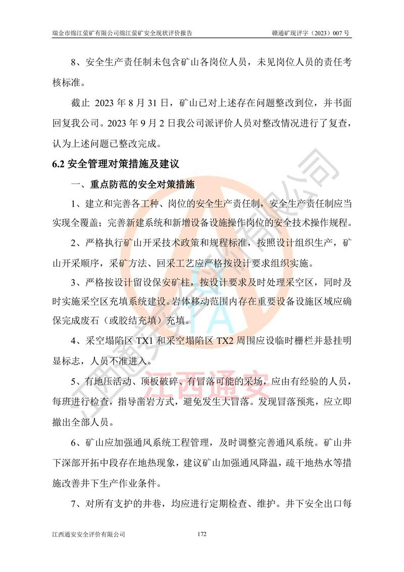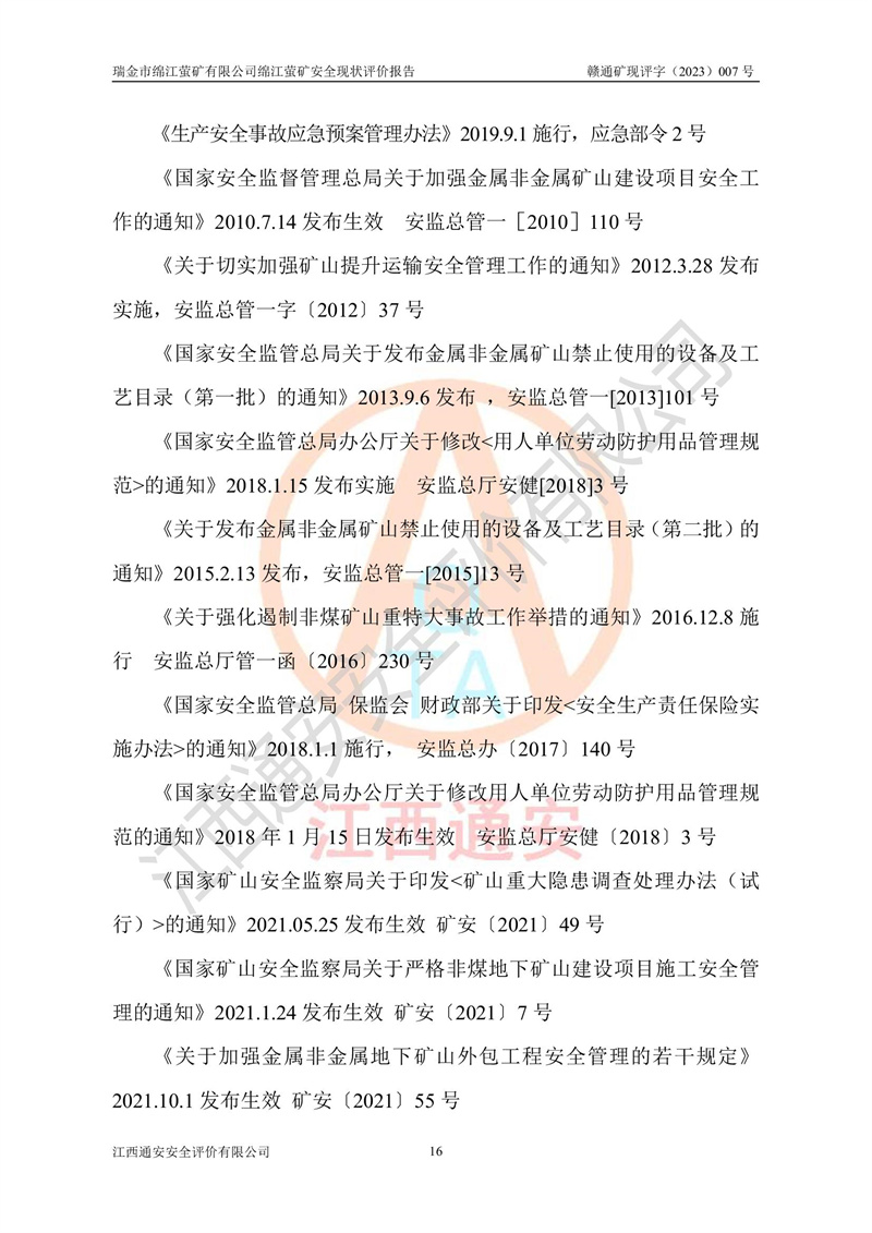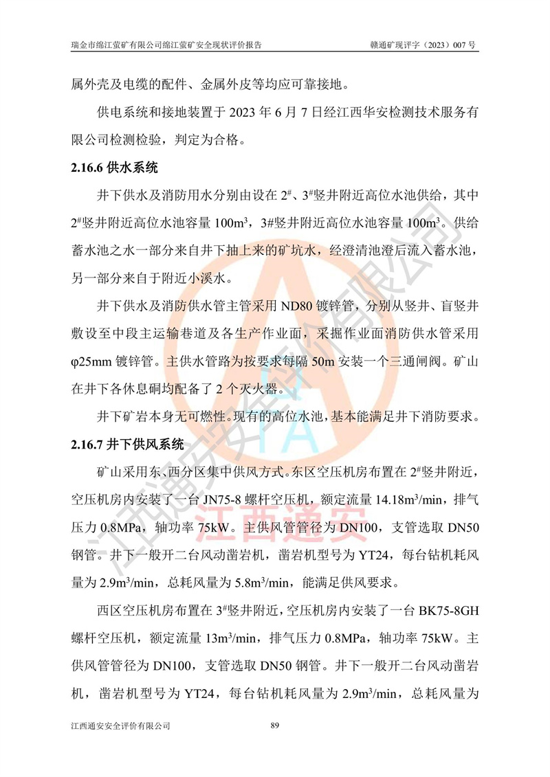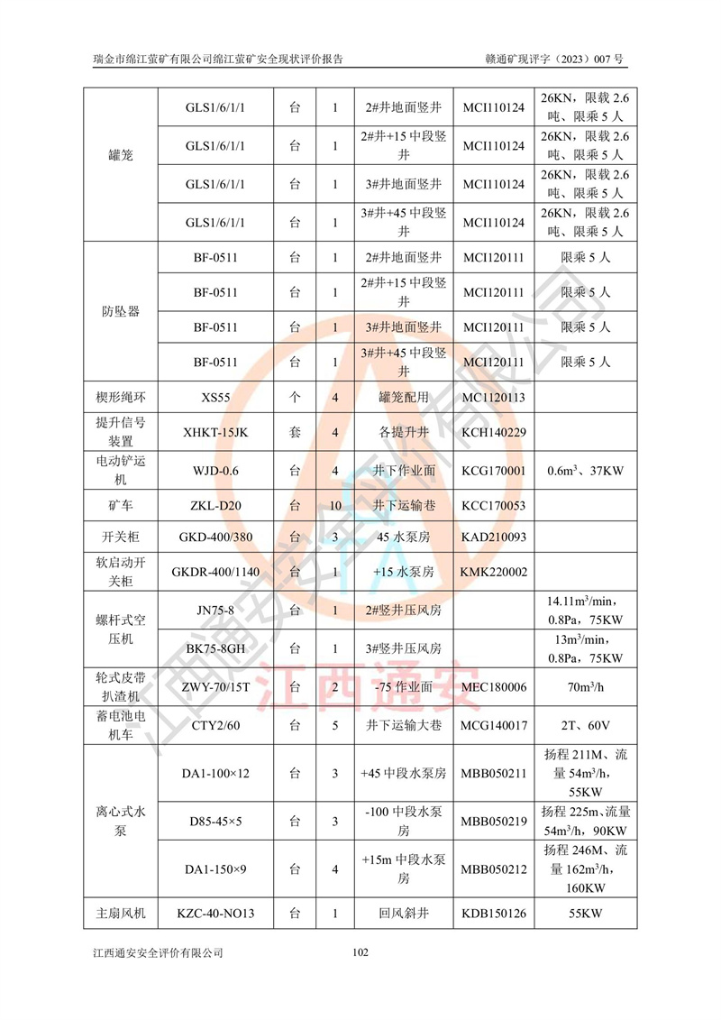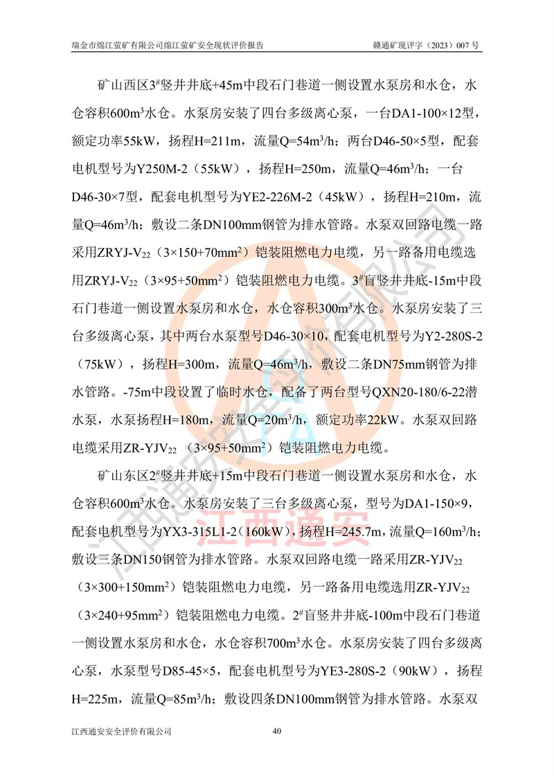 绵江萤矿矿区位于瑞金市南西210°方向,直线距离约26km,矿区地理坐标为东径115°50′54″~115°51′31″,北纬25°38′52″~25°39′34″,行政区划隶属于瑞金市谢坊镇深塘村管辖。 瑞金市绵江萤矿自1972年始有当地村民小规模陆续开采,1978年收归瑞金县谢坊乡管理,成立谢坊乡萤石矿,同年收归县管改名为瑞金县萤石矿,再经历多次采矿权人变更后,至2010年矿山由深圳市新星轻质合金材料有限公司收购瑞金市绵江萤石矿为其全资子公司,同时成立瑞金市绵江萤矿有限公司为现矿山采矿权人。2021年5月28日,深圳市新星轻质合金材料有限公司将其持有的绵江萤矿****股权及派生权益质押给瑞金市金鑫矿产品实业有限公司,采矿权人未变。 矿山于2014年1月20日取得原江西省国土资源厅颁发的采矿许可证,证号:C3607002009126120050709,采矿权人:瑞金市绵江萤矿有限公司,地址:江西省赣州市瑞金市,矿山名称:瑞金市绵江萤矿有限公司绵江萤矿,经济类型:私营有限责任公司,开采矿种:萤石(普通),开采方式:地下开采,生产规模:5.00万t/a,矿区面积;0.5053km2,**期限:壹拾贰年自2014年1月20日至2026年1月20日。开采深度由238m至-100m标高,共有8个拐点圈定。 2014年6月,企业委托江西省煤矿设计院编制了《瑞金市绵江萤矿有限公司绵江萤矿扩建工程初步设计说明书》和《瑞金市绵江萤矿有限公司绵江萤矿扩建工程初步设计说明书安全专篇》。并于2014年6月19日省安监局组织专家对《瑞金市绵江萤矿有限公司绵江萤矿扩建工程初步设计说明书安全专篇》进行了评审并原则通过,2014年7月18日由江西省安监局下达了《关于瑞金市绵江萤矿有限公司绵江萤矿扩建工程初步设计说明书安全专篇》的审查意见书(赣安监非煤项目设审[2014]46号)。矿山扩建工程设计采用竖井+盲竖井联合开拓,延深共布置-15m、-45m、-75m、-100m四个中段。采矿方法为浅孔留矿法,通风系统采用中央对角抽出式机械通风,主扇安装在4#回风斜井井口,矿山生产规模为5万t/a,服务年限为10年。 2016年7月,矿山委托江西通安安全评价有限公司编制了《瑞金市绵江萤矿有限公司绵江萤矿地下开采扩建工程安全设施验收评价报告》。2016年7月31日-8月2日,公司组织有关专家对江西通安安全评价有限公司编制的《瑞金市绵江萤矿有限公司绵江萤矿地下开采扩建工程安全设施验收评价报告》进行了评审,同时对瑞金市绵江萤矿有限公司绵江萤矿地下开采扩建工程建设项目安全设施进行了现场验收并原则通过。瑞金市安监局依法对验收过程及结果进行监督。 2020年10月12日,矿山取得江西省应急管理换发的安全生产许可证。编号:(赣)FM安许证字[2005]M0029号,单位名称:瑞金市绵江萤矿有限公司绵江萤矿地下开采,主要负责人:陈勇,单位地址:江西省瑞金市谢坊镇深塘村,经济类型:有限责任公司,许可范围:萤石矿5万t/a,竖井+盲竖井联合开拓,-75m、-100m中段地下开采,**期:2020年10月27日至2023年10月26日。 矿山取得安全生产许可证后,严格按照设计回采顺序(中段按从上到下的顺序开采,同时开采中段数为一个)要求进行开采,目前矿山-15m、-45m中段已结束回采。矿山现采用竖井+盲竖井联合开拓。东区2#竖井(SJ2)为主竖井,西区3#竖井(SJ3)为副竖井,XJ4斜井为回风井兼做安全出口。矿山共开拓了+170、+110m、+80m、+65m、+45m、+15m、-15m、-45m、-75m、-100m等十个中段,其中-45m以上中段已回采结束,目前-75m为主要生产中段,-45m为回风中段,-100m为生产开拓中段。-75m中段东、西两区运输巷道已贯通,并已掘三个通风天井连接至-45m中段,东区-100m中段已掘穿脉、沿脉巷道100m。东、西区的-45m以上中段均已贯通。东区+15m中段已开拓2#盲竖井至-100m中段,2#盲竖井连接-15m、-45m、-75m、-100m四个中段。西区+45m中段已开拓3#盲竖井至-75m中段,3#盲竖井连接+15m、-15m、-45m、-75m四个中段,并计划按设计延伸至-100m中段。 2019年3月-2020年6月矿山对提升运输系统设备设施进行了改造,各中段及竖井、盲竖井井口运输由原无轨胶轮车运输改为0.5m3U型矿车运输,各东、西区竖井及盲竖井均新安装了BF-0511防坠器,新更换了GLS1/6/1/1罐笼。随着矿山进行深部开拓,井下需风量及风阻随之变大,为了满足矿山通风系统要求,矿山将设计一期工程15kW型号KCZ40-№11主扇风机,更换为二期工程55kW型号KZC40-№13主扇,进一步提高了矿井通风效率。同时将东、西两区竖井及盲竖井原JTP-1.2×1.0P绞车更换为JTP-1.6×1.2P型绞车。 为了进一步优化矿山提升运输、排水、供电等系统,2022年10月,矿山委托江西省中赣投勘察设计有限公司(原江西省煤矿设计院)编制了《瑞金市绵江萤矿有限公司绵江萤矿地下开采提升运输、排水、供电优化方案设计》。至2023年8月,矿山按优化方案完成了改造,并委托江西华安检测技术服务有限公司对设备设施进行检测,检测结果合格。 根据《安全生产法》、《安全生产许可证条例》等有关法律、法规的规定以及《关于做好非煤矿矿山企业安全生产许可证延期换证工作的通知》的要求,2023年4月,瑞金市绵江萤矿有限公司委托我公司(江西通安安全评价有限公司)对绵江萤矿进行安全现状评价。 |