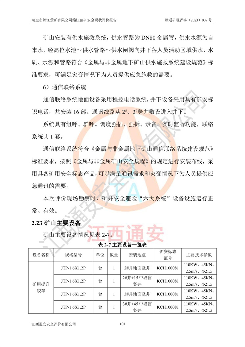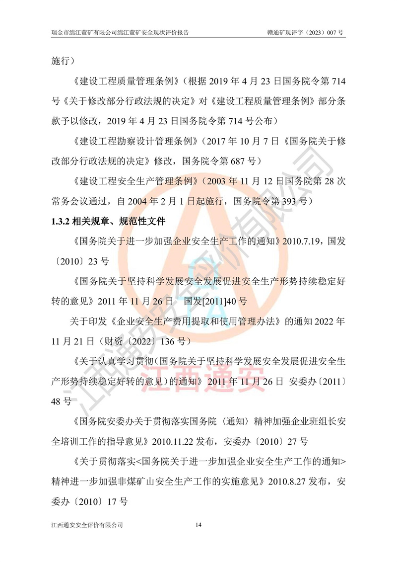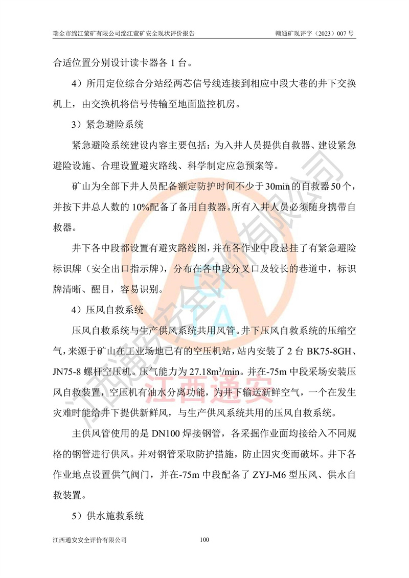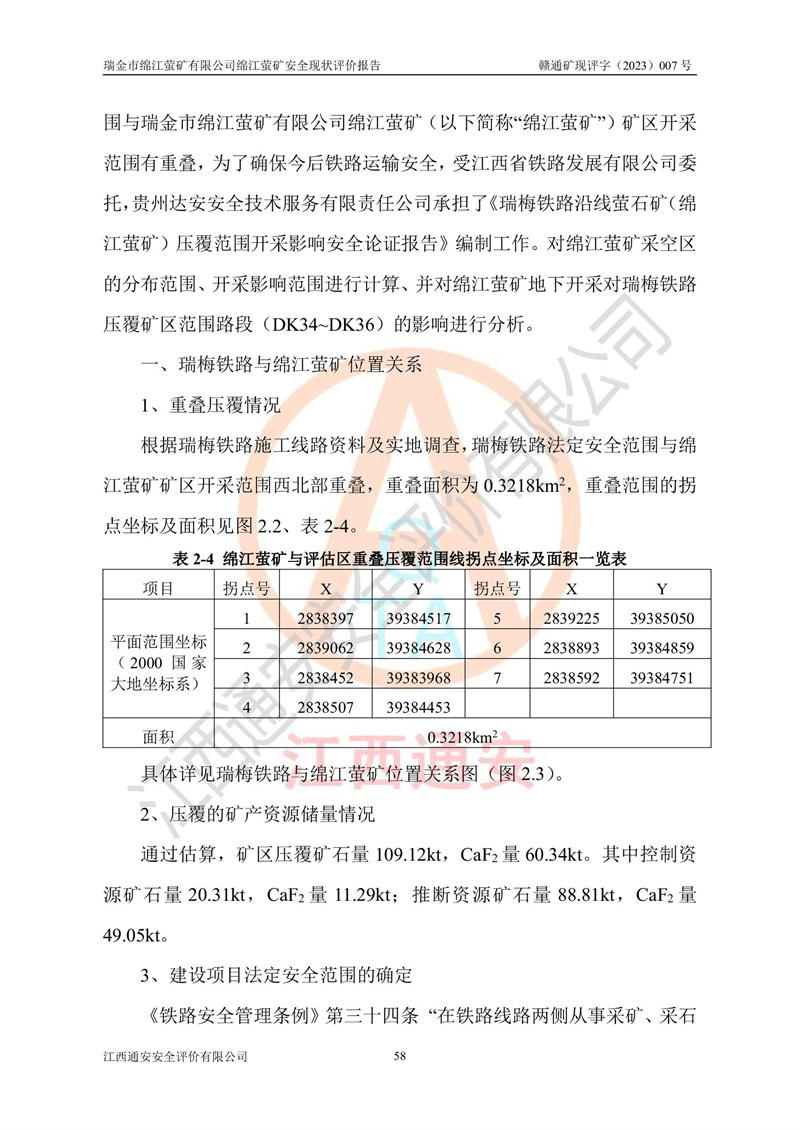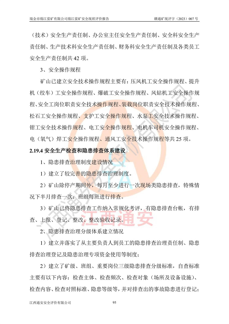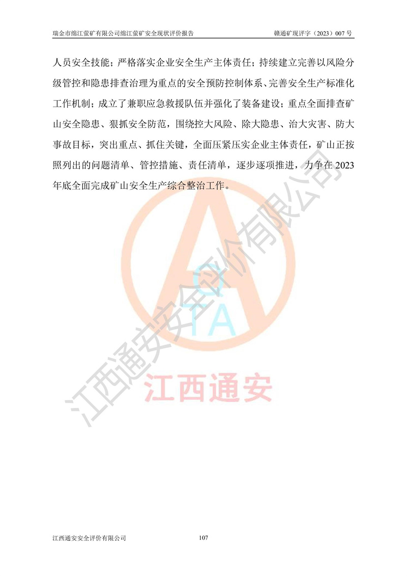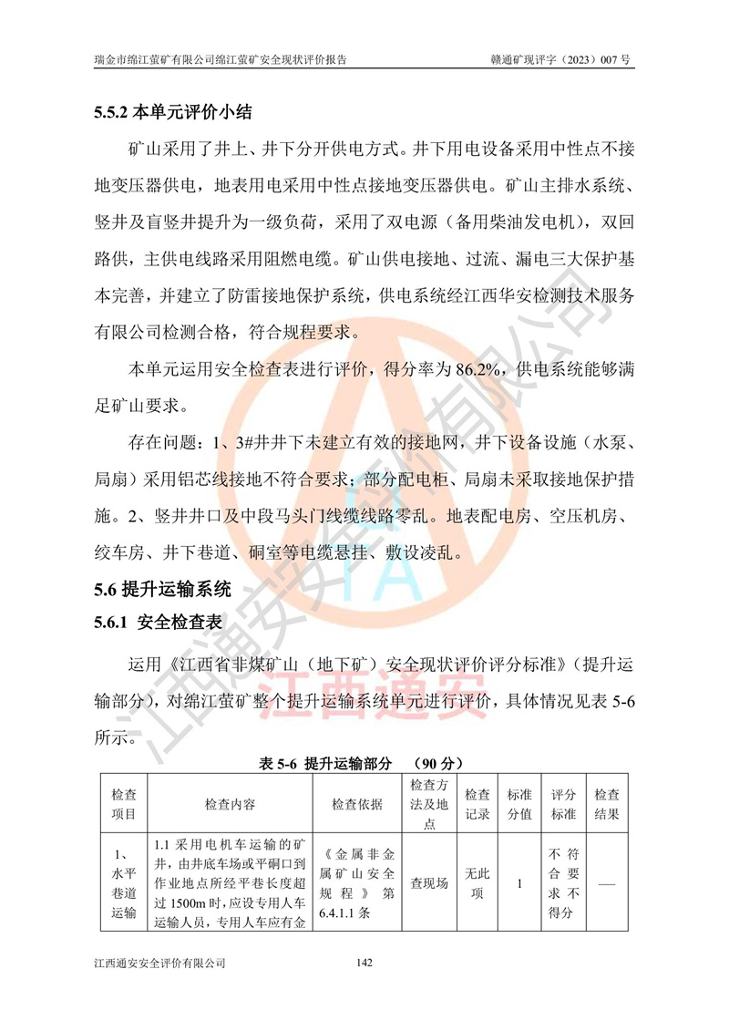 绵江萤矿矿区位于瑞金市南西210°方向,直线距离约26km,矿区地理坐标为东径115°50′54″~115°51′31″,北纬25°38′52″~25°39′34″,行政区划隶属于瑞金市谢坊镇深塘村管辖。 瑞金市绵江萤矿自1972年始有当地村民小规模陆续开采,1978年收归瑞金县谢坊乡管理,成立谢坊乡萤石矿,同年收归县管改名为瑞金县萤石矿,再经历多次采矿权人变更后,至2010年矿山由深圳市新星轻质合金材料有限公司收购瑞金市绵江萤石矿为其全资子公司,同时成立瑞金市绵江萤矿有限公司为现矿山采矿权人。2021年5月28日,深圳市新星轻质合金材料有限公司将其持有的绵江萤矿****股权及派生权益质押给瑞金市金鑫矿产品实业有限公司,采矿权人未变。 矿山于2014年1月20日取得原江西省国土资源厅颁发的采矿许可证,证号:C3607002009126120050709,采矿权人:瑞金市绵江萤矿有限公司,地址:江西省赣州市瑞金市,矿山名称:瑞金市绵江萤矿有限公司绵江萤矿,经济类型:私营有限责任公司,开采矿种:萤石(普通),开采方式:地下开采,生产规模:5.00万t/a,矿区面积;0.5053km2,**期限:壹拾贰年自2014年1月20日至2026年1月20日。开采深度由238m至-100m标高,共有8个拐点圈定。 2014年6月,企业委托江西省煤矿设计院编制了《瑞金市绵江萤矿有限公司绵江萤矿扩建工程初步设计说明书》和《瑞金市绵江萤矿有限公司绵江萤矿扩建工程初步设计说明书安全专篇》。并于2014年6月19日省安监局组织专家对《瑞金市绵江萤矿有限公司绵江萤矿扩建工程初步设计说明书安全专篇》进行了评审并原则通过,2014年7月18日由江西省安监局下达了《关于瑞金市绵江萤矿有限公司绵江萤矿扩建工程初步设计说明书安全专篇》的审查意见书(赣安监非煤项目设审[2014]46号)。矿山扩建工程设计采用竖井+盲竖井联合开拓,延深共布置-15m、-45m、-75m、-100m四个中段。采矿方法为浅孔留矿法,通风系统采用中央对角抽出式机械通风,主扇安装在4#回风斜井井口,矿山生产规模为5万t/a,服务年限为10年。 2016年7月,矿山委托江西通安安全评价有限公司编制了《瑞金市绵江萤矿有限公司绵江萤矿地下开采扩建工程安全设施验收评价报告》。2016年7月31日-8月2日,公司组织有关专家对江西通安安全评价有限公司编制的《瑞金市绵江萤矿有限公司绵江萤矿地下开采扩建工程安全设施验收评价报告》进行了评审,同时对瑞金市绵江萤矿有限公司绵江萤矿地下开采扩建工程建设项目安全设施进行了现场验收并原则通过。瑞金市安监局依法对验收过程及结果进行监督。 2020年10月12日,矿山取得江西省应急管理换发的安全生产许可证。编号:(赣)FM安许证字[2005]M0029号,单位名称:瑞金市绵江萤矿有限公司绵江萤矿地下开采,主要负责人:陈勇,单位地址:江西省瑞金市谢坊镇深塘村,经济类型:有限责任公司,许可范围:萤石矿5万t/a,竖井+盲竖井联合开拓,-75m、-100m中段地下开采,**期:2020年10月27日至2023年10月26日。 矿山取得安全生产许可证后,严格按照设计回采顺序(中段按从上到下的顺序开采,同时开采中段数为一个)要求进行开采,目前矿山-15m、-45m中段已结束回采。矿山现采用竖井+盲竖井联合开拓。东区2#竖井(SJ2)为主竖井,西区3#竖井(SJ3)为副竖井,XJ4斜井为回风井兼做安全出口。矿山共开拓了+170、+110m、+80m、+65m、+45m、+15m、-15m、-45m、-75m、-100m等十个中段,其中-45m以上中段已回采结束,目前-75m为主要生产中段,-45m为回风中段,-100m为生产开拓中段。-75m中段东、西两区运输巷道已贯通,并已掘三个通风天井连接至-45m中段,东区-100m中段已掘穿脉、沿脉巷道100m。东、西区的-45m以上中段均已贯通。东区+15m中段已开拓2#盲竖井至-100m中段,2#盲竖井连接-15m、-45m、-75m、-100m四个中段。西区+45m中段已开拓3#盲竖井至-75m中段,3#盲竖井连接+15m、-15m、-45m、-75m四个中段,并计划按设计延伸至-100m中段。 2019年3月-2020年6月矿山对提升运输系统设备设施进行了改造,各中段及竖井、盲竖井井口运输由原无轨胶轮车运输改为0.5m3U型矿车运输,各东、西区竖井及盲竖井均新安装了BF-0511防坠器,新更换了GLS1/6/1/1罐笼。随着矿山进行深部开拓,井下需风量及风阻随之变大,为了满足矿山通风系统要求,矿山将设计一期工程15kW型号KCZ40-№11主扇风机,更换为二期工程55kW型号KZC40-№13主扇,进一步提高了矿井通风效率。同时将东、西两区竖井及盲竖井原JTP-1.2×1.0P绞车更换为JTP-1.6×1.2P型绞车。 为了进一步优化矿山提升运输、排水、供电等系统,2022年10月,矿山委托江西省中赣投勘察设计有限公司(原江西省煤矿设计院)编制了《瑞金市绵江萤矿有限公司绵江萤矿地下开采提升运输、排水、供电优化方案设计》。至2023年8月,矿山按优化方案完成了改造,并委托江西华安检测技术服务有限公司对设备设施进行检测,检测结果合格。 根据《安全生产法》、《安全生产许可证条例》等有关法律、法规的规定以及《关于做好非煤矿矿山企业安全生产许可证延期换证工作的通知》的要求,2023年4月,瑞金市绵江萤矿有限公司委托我公司(江西通安安全评价有限公司)对绵江萤矿进行安全现状评价。 |