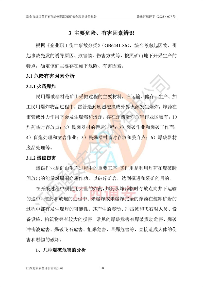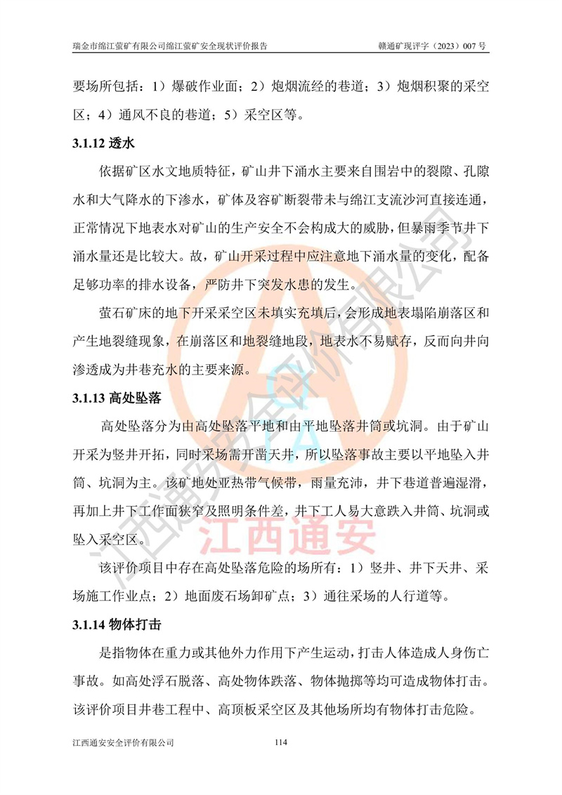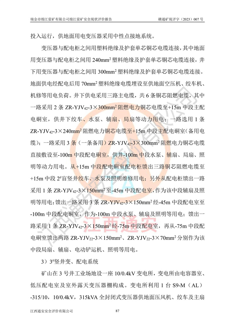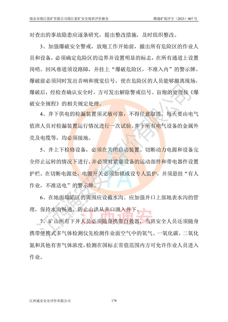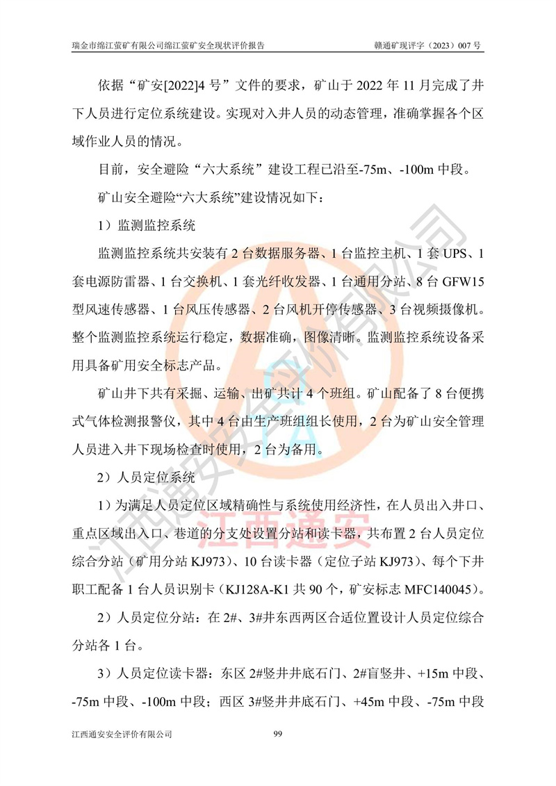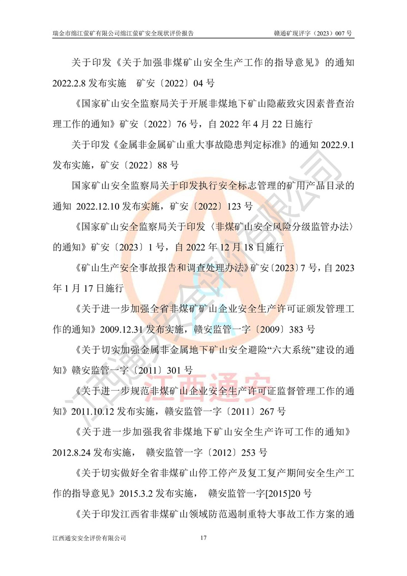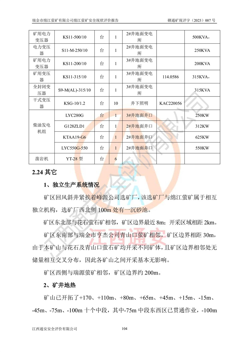 绵江萤矿矿区位于瑞金市南西210°方向,直线距离约26km,矿区地理坐标为东径115°50′54″~115°51′31″,北纬25°38′52″~25°39′34″,行政区划隶属于瑞金市谢坊镇深塘村管辖。 瑞金市绵江萤矿自1972年始有当地村民小规模陆续开采,1978年收归瑞金县谢坊乡管理,成立谢坊乡萤石矿,同年收归县管改名为瑞金县萤石矿,再经历多次采矿权人变更后,至2010年矿山由深圳市新星轻质合金材料有限公司收购瑞金市绵江萤石矿为其全资子公司,同时成立瑞金市绵江萤矿有限公司为现矿山采矿权人。2021年5月28日,深圳市新星轻质合金材料有限公司将其持有的绵江萤矿****股权及派生权益质押给瑞金市金鑫矿产品实业有限公司,采矿权人未变。 矿山于2014年1月20日取得原江西省国土资源厅颁发的采矿许可证,证号:C3607002009126120050709,采矿权人:瑞金市绵江萤矿有限公司,地址:江西省赣州市瑞金市,矿山名称:瑞金市绵江萤矿有限公司绵江萤矿,经济类型:私营有限责任公司,开采矿种:萤石(普通),开采方式:地下开采,生产规模:5.00万t/a,矿区面积;0.5053km2,**期限:壹拾贰年自2014年1月20日至2026年1月20日。开采深度由238m至-100m标高,共有8个拐点圈定。 2014年6月,企业委托江西省煤矿设计院编制了《瑞金市绵江萤矿有限公司绵江萤矿扩建工程初步设计说明书》和《瑞金市绵江萤矿有限公司绵江萤矿扩建工程初步设计说明书安全专篇》。并于2014年6月19日省安监局组织专家对《瑞金市绵江萤矿有限公司绵江萤矿扩建工程初步设计说明书安全专篇》进行了评审并原则通过,2014年7月18日由江西省安监局下达了《关于瑞金市绵江萤矿有限公司绵江萤矿扩建工程初步设计说明书安全专篇》的审查意见书(赣安监非煤项目设审[2014]46号)。矿山扩建工程设计采用竖井+盲竖井联合开拓,延深共布置-15m、-45m、-75m、-100m四个中段。采矿方法为浅孔留矿法,通风系统采用中央对角抽出式机械通风,主扇安装在4#回风斜井井口,矿山生产规模为5万t/a,服务年限为10年。 2016年7月,矿山委托江西通安安全评价有限公司编制了《瑞金市绵江萤矿有限公司绵江萤矿地下开采扩建工程安全设施验收评价报告》。2016年7月31日-8月2日,公司组织有关专家对江西通安安全评价有限公司编制的《瑞金市绵江萤矿有限公司绵江萤矿地下开采扩建工程安全设施验收评价报告》进行了评审,同时对瑞金市绵江萤矿有限公司绵江萤矿地下开采扩建工程建设项目安全设施进行了现场验收并原则通过。瑞金市安监局依法对验收过程及结果进行监督。 2020年10月12日,矿山取得江西省应急管理换发的安全生产许可证。编号:(赣)FM安许证字[2005]M0029号,单位名称:瑞金市绵江萤矿有限公司绵江萤矿地下开采,主要负责人:陈勇,单位地址:江西省瑞金市谢坊镇深塘村,经济类型:有限责任公司,许可范围:萤石矿5万t/a,竖井+盲竖井联合开拓,-75m、-100m中段地下开采,**期:2020年10月27日至2023年10月26日。 矿山取得安全生产许可证后,严格按照设计回采顺序(中段按从上到下的顺序开采,同时开采中段数为一个)要求进行开采,目前矿山-15m、-45m中段已结束回采。矿山现采用竖井+盲竖井联合开拓。东区2#竖井(SJ2)为主竖井,西区3#竖井(SJ3)为副竖井,XJ4斜井为回风井兼做安全出口。矿山共开拓了+170、+110m、+80m、+65m、+45m、+15m、-15m、-45m、-75m、-100m等十个中段,其中-45m以上中段已回采结束,目前-75m为主要生产中段,-45m为回风中段,-100m为生产开拓中段。-75m中段东、西两区运输巷道已贯通,并已掘三个通风天井连接至-45m中段,东区-100m中段已掘穿脉、沿脉巷道100m。东、西区的-45m以上中段均已贯通。东区+15m中段已开拓2#盲竖井至-100m中段,2#盲竖井连接-15m、-45m、-75m、-100m四个中段。西区+45m中段已开拓3#盲竖井至-75m中段,3#盲竖井连接+15m、-15m、-45m、-75m四个中段,并计划按设计延伸至-100m中段。 2019年3月-2020年6月矿山对提升运输系统设备设施进行了改造,各中段及竖井、盲竖井井口运输由原无轨胶轮车运输改为0.5m3U型矿车运输,各东、西区竖井及盲竖井均新安装了BF-0511防坠器,新更换了GLS1/6/1/1罐笼。随着矿山进行深部开拓,井下需风量及风阻随之变大,为了满足矿山通风系统要求,矿山将设计一期工程15kW型号KCZ40-№11主扇风机,更换为二期工程55kW型号KZC40-№13主扇,进一步提高了矿井通风效率。同时将东、西两区竖井及盲竖井原JTP-1.2×1.0P绞车更换为JTP-1.6×1.2P型绞车。 为了进一步优化矿山提升运输、排水、供电等系统,2022年10月,矿山委托江西省中赣投勘察设计有限公司(原江西省煤矿设计院)编制了《瑞金市绵江萤矿有限公司绵江萤矿地下开采提升运输、排水、供电优化方案设计》。至2023年8月,矿山按优化方案完成了改造,并委托江西华安检测技术服务有限公司对设备设施进行检测,检测结果合格。 根据《安全生产法》、《安全生产许可证条例》等有关法律、法规的规定以及《关于做好非煤矿矿山企业安全生产许可证延期换证工作的通知》的要求,2023年4月,瑞金市绵江萤矿有限公司委托我公司(江西通安安全评价有限公司)对绵江萤矿进行安全现状评价。 |