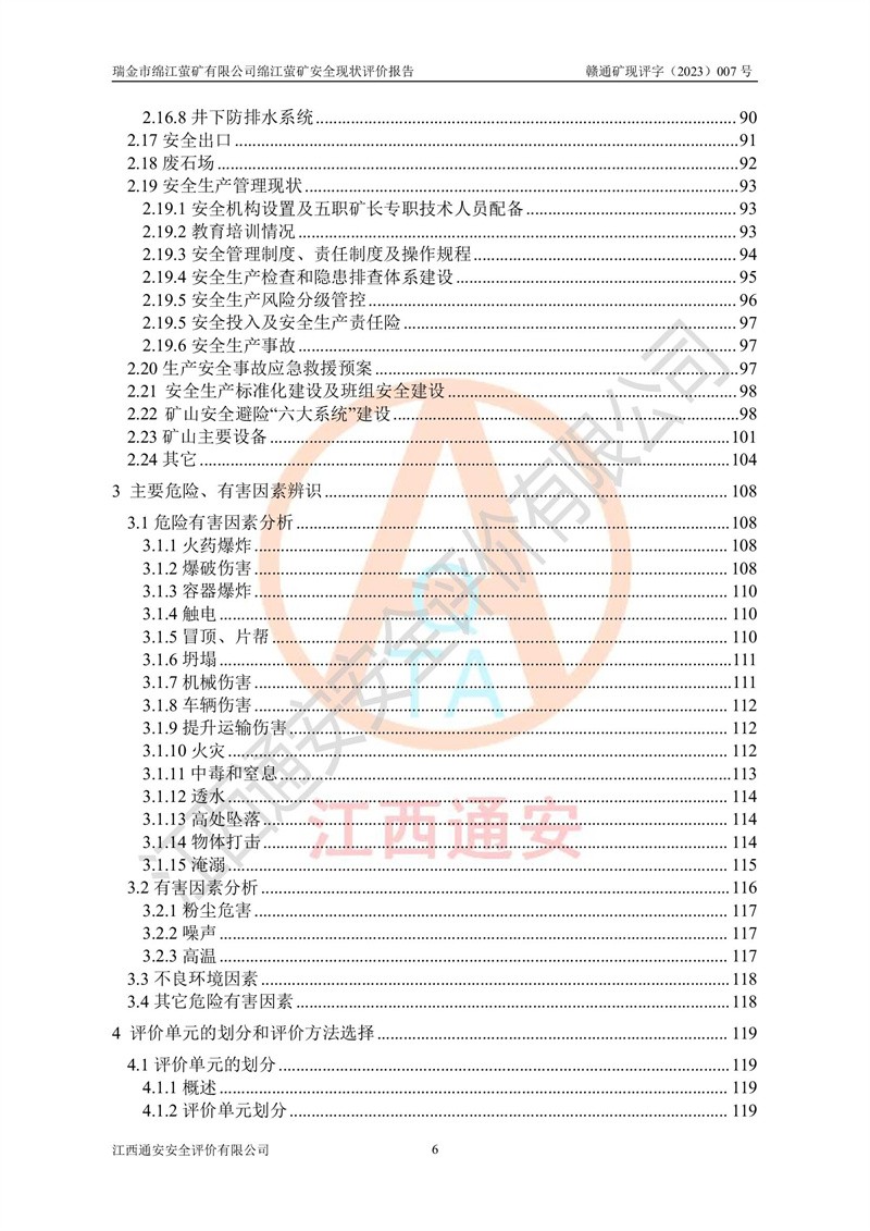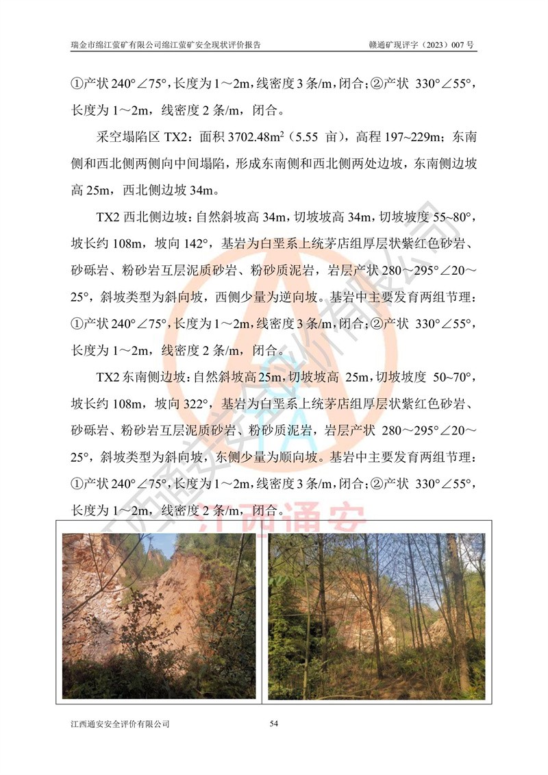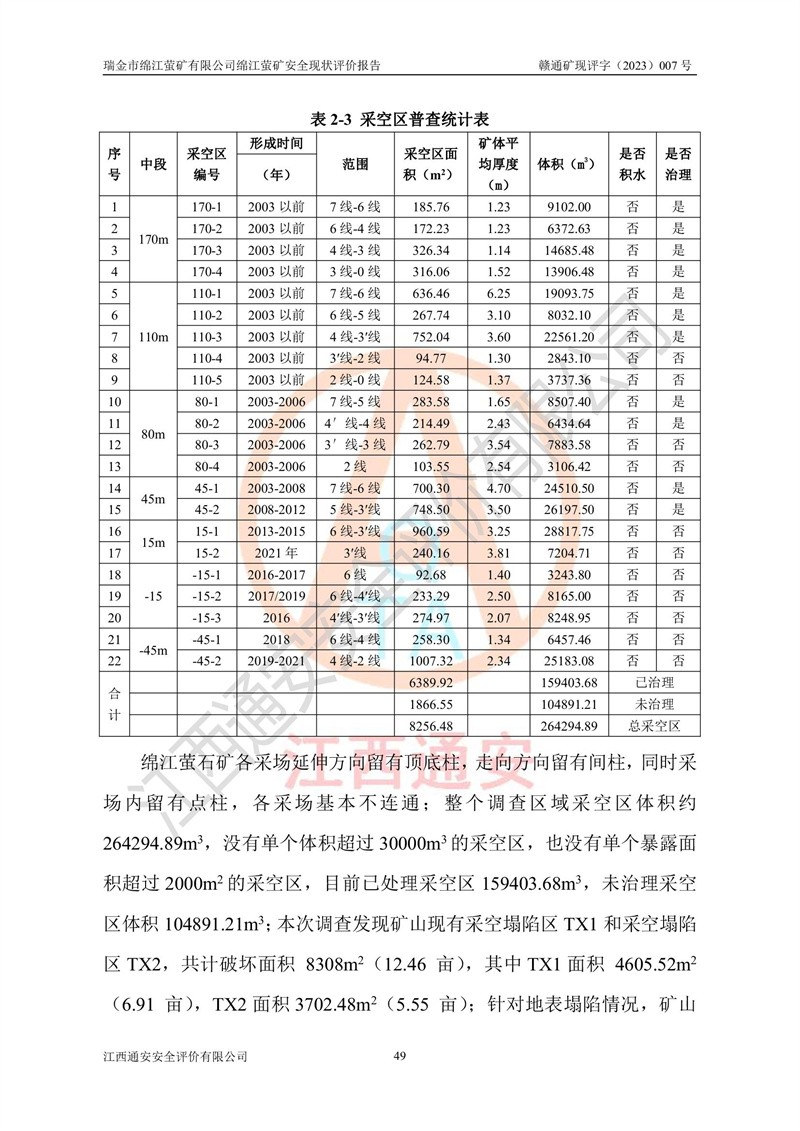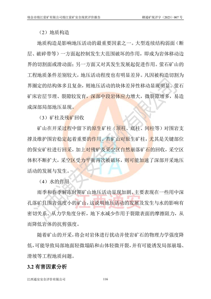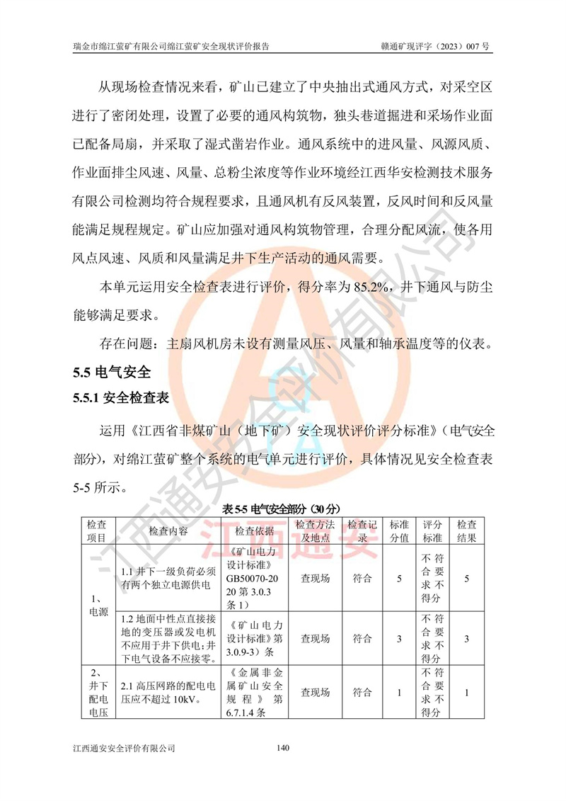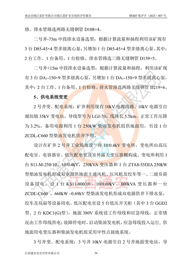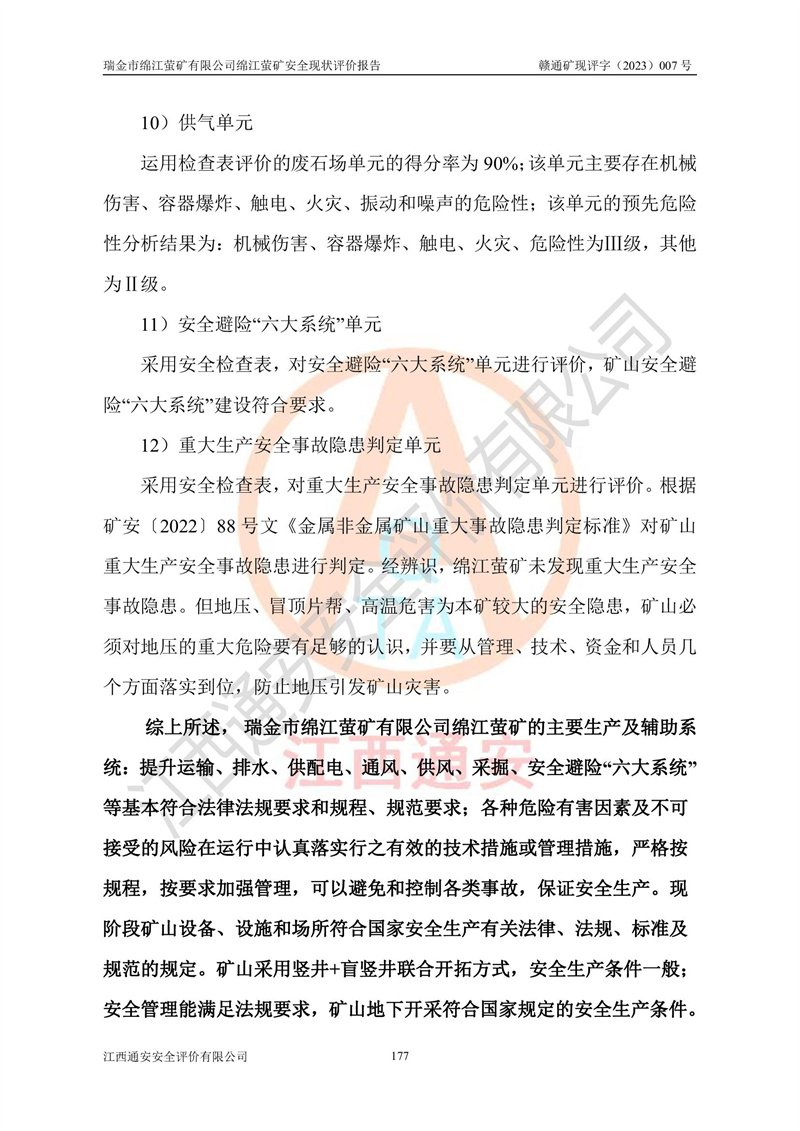 绵江萤矿矿区位于瑞金市南西210°方向,直线距离约26km,矿区地理坐标为东径115°50′54″~115°51′31″,北纬25°38′52″~25°39′34″,行政区划隶属于瑞金市谢坊镇深塘村管辖。 瑞金市绵江萤矿自1972年始有当地村民小规模陆续开采,1978年收归瑞金县谢坊乡管理,成立谢坊乡萤石矿,同年收归县管改名为瑞金县萤石矿,再经历多次采矿权人变更后,至2010年矿山由深圳市新星轻质合金材料有限公司收购瑞金市绵江萤石矿为其全资子公司,同时成立瑞金市绵江萤矿有限公司为现矿山采矿权人。2021年5月28日,深圳市新星轻质合金材料有限公司将其持有的绵江萤矿****股权及派生权益质押给瑞金市金鑫矿产品实业有限公司,采矿权人未变。 矿山于2014年1月20日取得原江西省国土资源厅颁发的采矿许可证,证号:C3607002009126120050709,采矿权人:瑞金市绵江萤矿有限公司,地址:江西省赣州市瑞金市,矿山名称:瑞金市绵江萤矿有限公司绵江萤矿,经济类型:私营有限责任公司,开采矿种:萤石(普通),开采方式:地下开采,生产规模:5.00万t/a,矿区面积;0.5053km2,**期限:壹拾贰年自2014年1月20日至2026年1月20日。开采深度由238m至-100m标高,共有8个拐点圈定。 2014年6月,企业委托江西省煤矿设计院编制了《瑞金市绵江萤矿有限公司绵江萤矿扩建工程初步设计说明书》和《瑞金市绵江萤矿有限公司绵江萤矿扩建工程初步设计说明书安全专篇》。并于2014年6月19日省安监局组织专家对《瑞金市绵江萤矿有限公司绵江萤矿扩建工程初步设计说明书安全专篇》进行了评审并原则通过,2014年7月18日由江西省安监局下达了《关于瑞金市绵江萤矿有限公司绵江萤矿扩建工程初步设计说明书安全专篇》的审查意见书(赣安监非煤项目设审[2014]46号)。矿山扩建工程设计采用竖井+盲竖井联合开拓,延深共布置-15m、-45m、-75m、-100m四个中段。采矿方法为浅孔留矿法,通风系统采用中央对角抽出式机械通风,主扇安装在4#回风斜井井口,矿山生产规模为5万t/a,服务年限为10年。 2016年7月,矿山委托江西通安安全评价有限公司编制了《瑞金市绵江萤矿有限公司绵江萤矿地下开采扩建工程安全设施验收评价报告》。2016年7月31日-8月2日,公司组织有关专家对江西通安安全评价有限公司编制的《瑞金市绵江萤矿有限公司绵江萤矿地下开采扩建工程安全设施验收评价报告》进行了评审,同时对瑞金市绵江萤矿有限公司绵江萤矿地下开采扩建工程建设项目安全设施进行了现场验收并原则通过。瑞金市安监局依法对验收过程及结果进行监督。 2020年10月12日,矿山取得江西省应急管理换发的安全生产许可证。编号:(赣)FM安许证字[2005]M0029号,单位名称:瑞金市绵江萤矿有限公司绵江萤矿地下开采,主要负责人:陈勇,单位地址:江西省瑞金市谢坊镇深塘村,经济类型:有限责任公司,许可范围:萤石矿5万t/a,竖井+盲竖井联合开拓,-75m、-100m中段地下开采,**期:2020年10月27日至2023年10月26日。 矿山取得安全生产许可证后,严格按照设计回采顺序(中段按从上到下的顺序开采,同时开采中段数为一个)要求进行开采,目前矿山-15m、-45m中段已结束回采。矿山现采用竖井+盲竖井联合开拓。东区2#竖井(SJ2)为主竖井,西区3#竖井(SJ3)为副竖井,XJ4斜井为回风井兼做安全出口。矿山共开拓了+170、+110m、+80m、+65m、+45m、+15m、-15m、-45m、-75m、-100m等十个中段,其中-45m以上中段已回采结束,目前-75m为主要生产中段,-45m为回风中段,-100m为生产开拓中段。-75m中段东、西两区运输巷道已贯通,并已掘三个通风天井连接至-45m中段,东区-100m中段已掘穿脉、沿脉巷道100m。东、西区的-45m以上中段均已贯通。东区+15m中段已开拓2#盲竖井至-100m中段,2#盲竖井连接-15m、-45m、-75m、-100m四个中段。西区+45m中段已开拓3#盲竖井至-75m中段,3#盲竖井连接+15m、-15m、-45m、-75m四个中段,并计划按设计延伸至-100m中段。 2019年3月-2020年6月矿山对提升运输系统设备设施进行了改造,各中段及竖井、盲竖井井口运输由原无轨胶轮车运输改为0.5m3U型矿车运输,各东、西区竖井及盲竖井均新安装了BF-0511防坠器,新更换了GLS1/6/1/1罐笼。随着矿山进行深部开拓,井下需风量及风阻随之变大,为了满足矿山通风系统要求,矿山将设计一期工程15kW型号KCZ40-№11主扇风机,更换为二期工程55kW型号KZC40-№13主扇,进一步提高了矿井通风效率。同时将东、西两区竖井及盲竖井原JTP-1.2×1.0P绞车更换为JTP-1.6×1.2P型绞车。 为了进一步优化矿山提升运输、排水、供电等系统,2022年10月,矿山委托江西省中赣投勘察设计有限公司(原江西省煤矿设计院)编制了《瑞金市绵江萤矿有限公司绵江萤矿地下开采提升运输、排水、供电优化方案设计》。至2023年8月,矿山按优化方案完成了改造,并委托江西华安检测技术服务有限公司对设备设施进行检测,检测结果合格。 根据《安全生产法》、《安全生产许可证条例》等有关法律、法规的规定以及《关于做好非煤矿矿山企业安全生产许可证延期换证工作的通知》的要求,2023年4月,瑞金市绵江萤矿有限公司委托我公司(江西通安安全评价有限公司)对绵江萤矿进行安全现状评价。 |