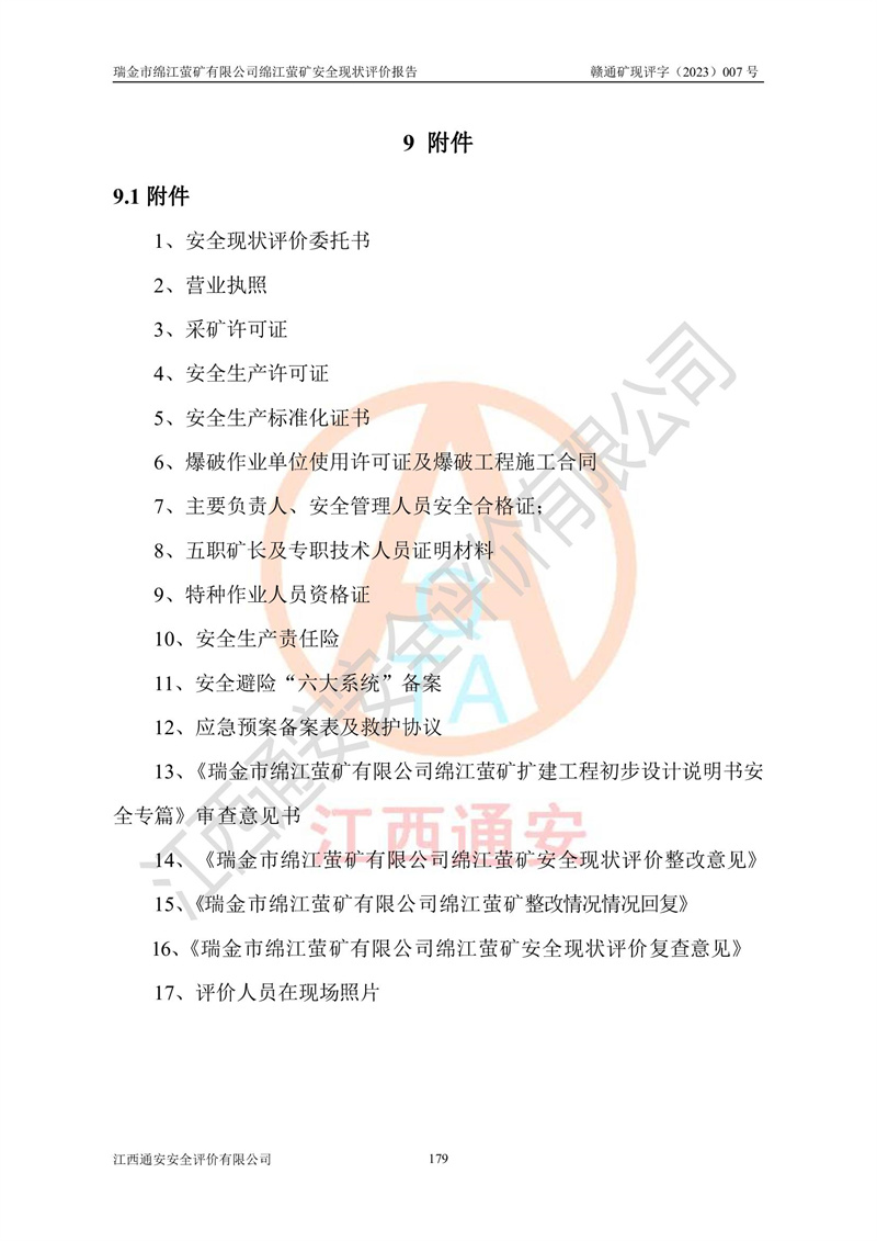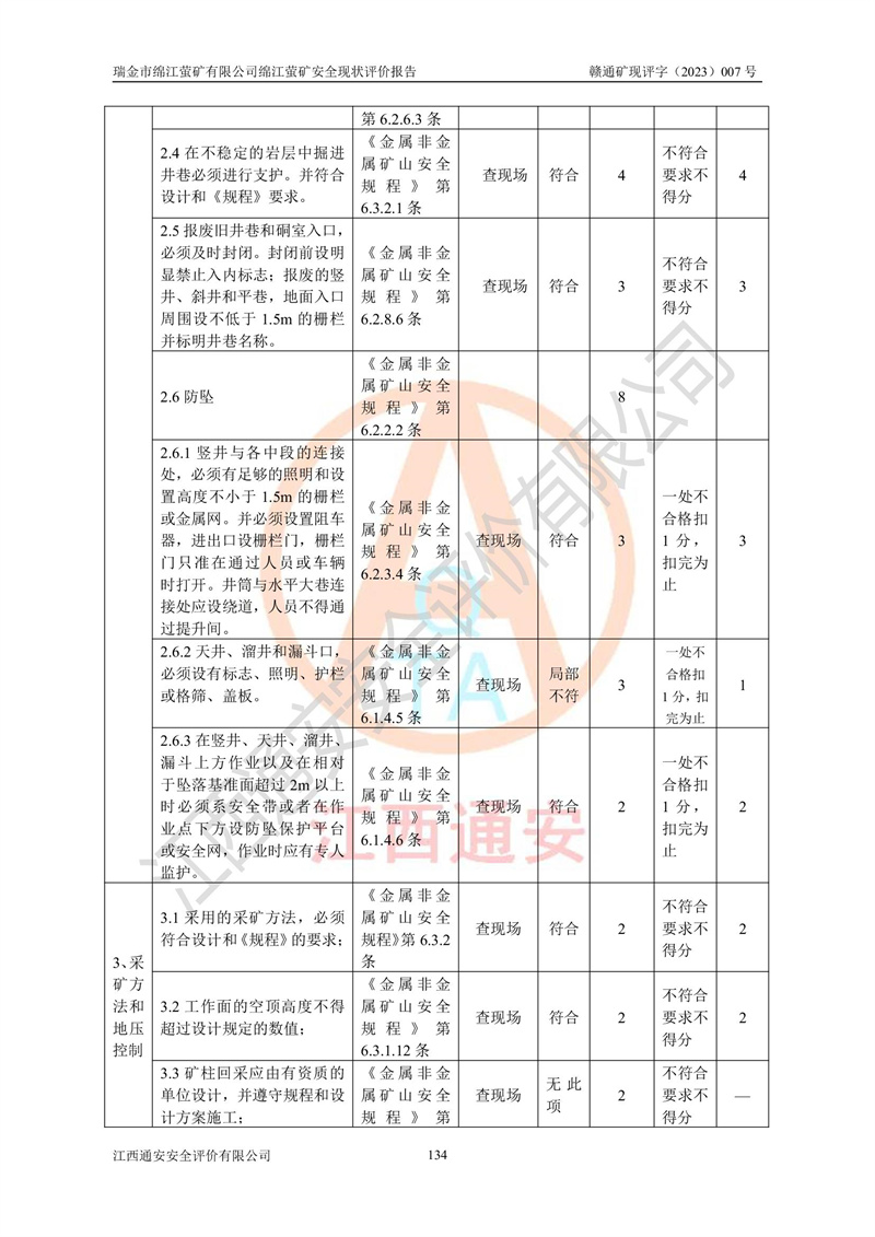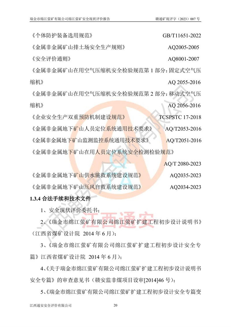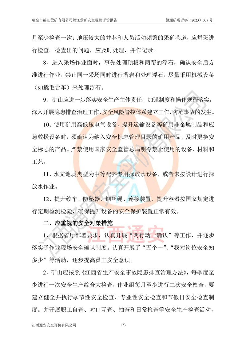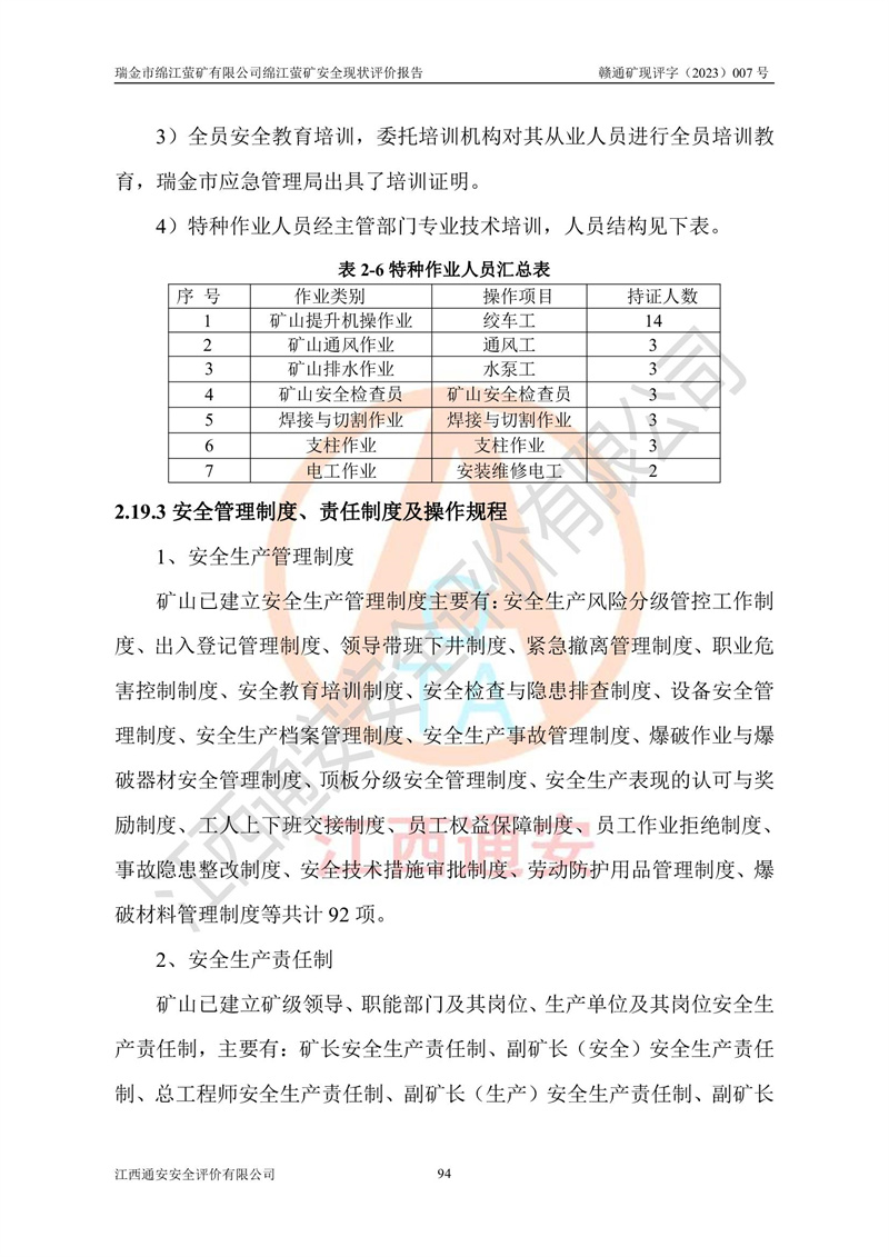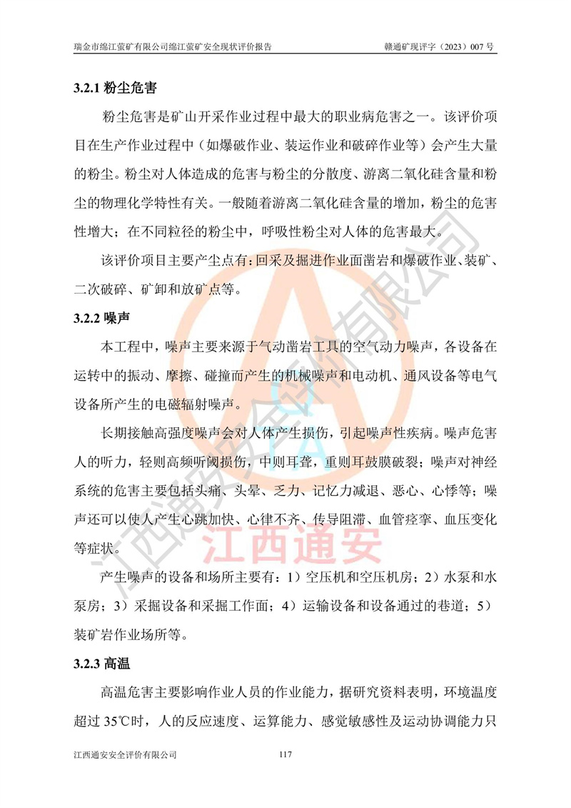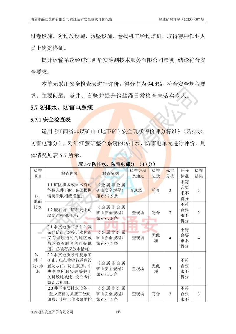 绵江萤矿矿区位于瑞金市南西210°方向,直线距离约26km,矿区地理坐标为东径115°50′54″~115°51′31″,北纬25°38′52″~25°39′34″,行政区划隶属于瑞金市谢坊镇深塘村管辖。 瑞金市绵江萤矿自1972年始有当地村民小规模陆续开采,1978年收归瑞金县谢坊乡管理,成立谢坊乡萤石矿,同年收归县管改名为瑞金县萤石矿,再经历多次采矿权人变更后,至2010年矿山由深圳市新星轻质合金材料有限公司收购瑞金市绵江萤石矿为其全资子公司,同时成立瑞金市绵江萤矿有限公司为现矿山采矿权人。2021年5月28日,深圳市新星轻质合金材料有限公司将其持有的绵江萤矿****股权及派生权益质押给瑞金市金鑫矿产品实业有限公司,采矿权人未变。 矿山于2014年1月20日取得原江西省国土资源厅颁发的采矿许可证,证号:C3607002009126120050709,采矿权人:瑞金市绵江萤矿有限公司,地址:江西省赣州市瑞金市,矿山名称:瑞金市绵江萤矿有限公司绵江萤矿,经济类型:私营有限责任公司,开采矿种:萤石(普通),开采方式:地下开采,生产规模:5.00万t/a,矿区面积;0.5053km2,**期限:壹拾贰年自2014年1月20日至2026年1月20日。开采深度由238m至-100m标高,共有8个拐点圈定。 2014年6月,企业委托江西省煤矿设计院编制了《瑞金市绵江萤矿有限公司绵江萤矿扩建工程初步设计说明书》和《瑞金市绵江萤矿有限公司绵江萤矿扩建工程初步设计说明书安全专篇》。并于2014年6月19日省安监局组织专家对《瑞金市绵江萤矿有限公司绵江萤矿扩建工程初步设计说明书安全专篇》进行了评审并原则通过,2014年7月18日由江西省安监局下达了《关于瑞金市绵江萤矿有限公司绵江萤矿扩建工程初步设计说明书安全专篇》的审查意见书(赣安监非煤项目设审[2014]46号)。矿山扩建工程设计采用竖井+盲竖井联合开拓,延深共布置-15m、-45m、-75m、-100m四个中段。采矿方法为浅孔留矿法,通风系统采用中央对角抽出式机械通风,主扇安装在4#回风斜井井口,矿山生产规模为5万t/a,服务年限为10年。 2016年7月,矿山委托江西通安安全评价有限公司编制了《瑞金市绵江萤矿有限公司绵江萤矿地下开采扩建工程安全设施验收评价报告》。2016年7月31日-8月2日,公司组织有关专家对江西通安安全评价有限公司编制的《瑞金市绵江萤矿有限公司绵江萤矿地下开采扩建工程安全设施验收评价报告》进行了评审,同时对瑞金市绵江萤矿有限公司绵江萤矿地下开采扩建工程建设项目安全设施进行了现场验收并原则通过。瑞金市安监局依法对验收过程及结果进行监督。 2020年10月12日,矿山取得江西省应急管理换发的安全生产许可证。编号:(赣)FM安许证字[2005]M0029号,单位名称:瑞金市绵江萤矿有限公司绵江萤矿地下开采,主要负责人:陈勇,单位地址:江西省瑞金市谢坊镇深塘村,经济类型:有限责任公司,许可范围:萤石矿5万t/a,竖井+盲竖井联合开拓,-75m、-100m中段地下开采,**期:2020年10月27日至2023年10月26日。 矿山取得安全生产许可证后,严格按照设计回采顺序(中段按从上到下的顺序开采,同时开采中段数为一个)要求进行开采,目前矿山-15m、-45m中段已结束回采。矿山现采用竖井+盲竖井联合开拓。东区2#竖井(SJ2)为主竖井,西区3#竖井(SJ3)为副竖井,XJ4斜井为回风井兼做安全出口。矿山共开拓了+170、+110m、+80m、+65m、+45m、+15m、-15m、-45m、-75m、-100m等十个中段,其中-45m以上中段已回采结束,目前-75m为主要生产中段,-45m为回风中段,-100m为生产开拓中段。-75m中段东、西两区运输巷道已贯通,并已掘三个通风天井连接至-45m中段,东区-100m中段已掘穿脉、沿脉巷道100m。东、西区的-45m以上中段均已贯通。东区+15m中段已开拓2#盲竖井至-100m中段,2#盲竖井连接-15m、-45m、-75m、-100m四个中段。西区+45m中段已开拓3#盲竖井至-75m中段,3#盲竖井连接+15m、-15m、-45m、-75m四个中段,并计划按设计延伸至-100m中段。 2019年3月-2020年6月矿山对提升运输系统设备设施进行了改造,各中段及竖井、盲竖井井口运输由原无轨胶轮车运输改为0.5m3U型矿车运输,各东、西区竖井及盲竖井均新安装了BF-0511防坠器,新更换了GLS1/6/1/1罐笼。随着矿山进行深部开拓,井下需风量及风阻随之变大,为了满足矿山通风系统要求,矿山将设计一期工程15kW型号KCZ40-№11主扇风机,更换为二期工程55kW型号KZC40-№13主扇,进一步提高了矿井通风效率。同时将东、西两区竖井及盲竖井原JTP-1.2×1.0P绞车更换为JTP-1.6×1.2P型绞车。 为了进一步优化矿山提升运输、排水、供电等系统,2022年10月,矿山委托江西省中赣投勘察设计有限公司(原江西省煤矿设计院)编制了《瑞金市绵江萤矿有限公司绵江萤矿地下开采提升运输、排水、供电优化方案设计》。至2023年8月,矿山按优化方案完成了改造,并委托江西华安检测技术服务有限公司对设备设施进行检测,检测结果合格。 根据《安全生产法》、《安全生产许可证条例》等有关法律、法规的规定以及《关于做好非煤矿矿山企业安全生产许可证延期换证工作的通知》的要求,2023年4月,瑞金市绵江萤矿有限公司委托我公司(江西通安安全评价有限公司)对绵江萤矿进行安全现状评价。 |