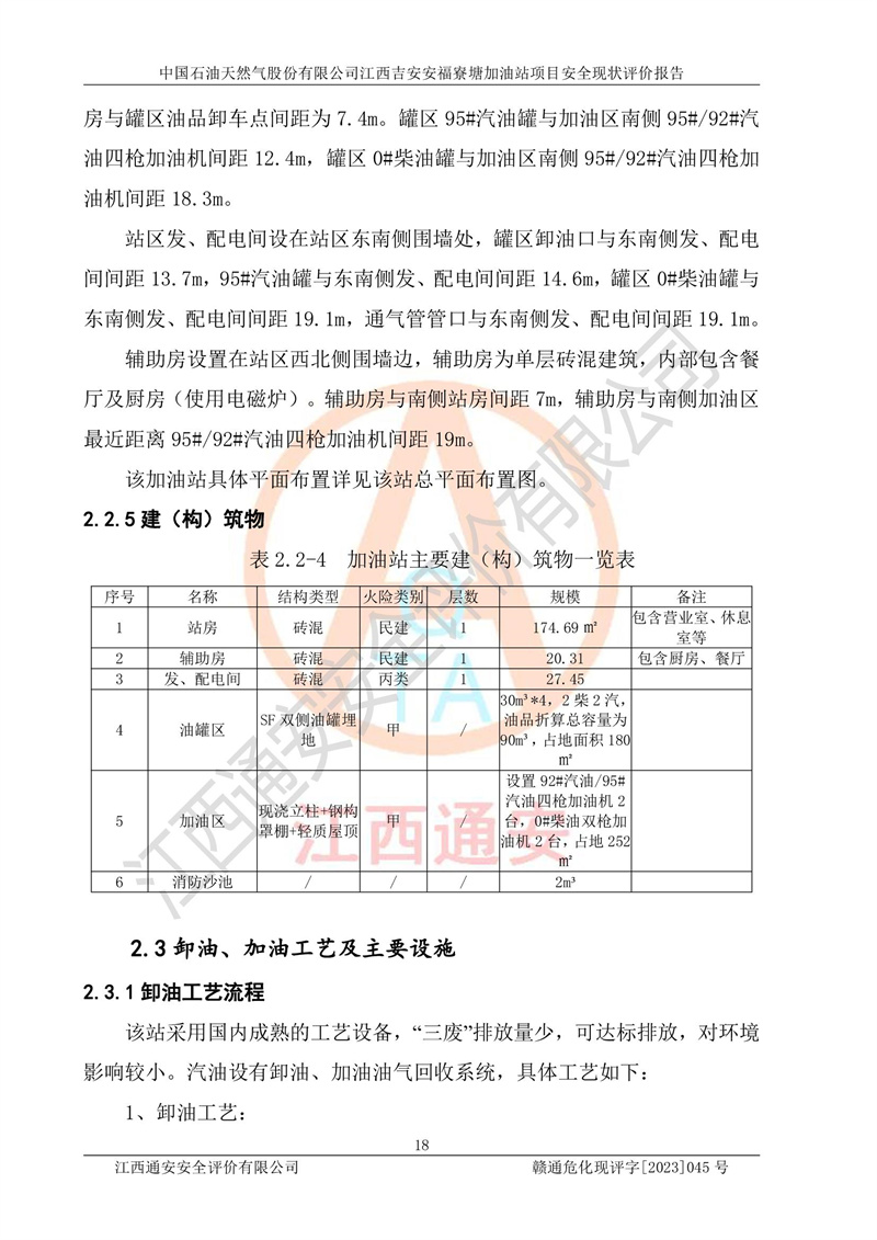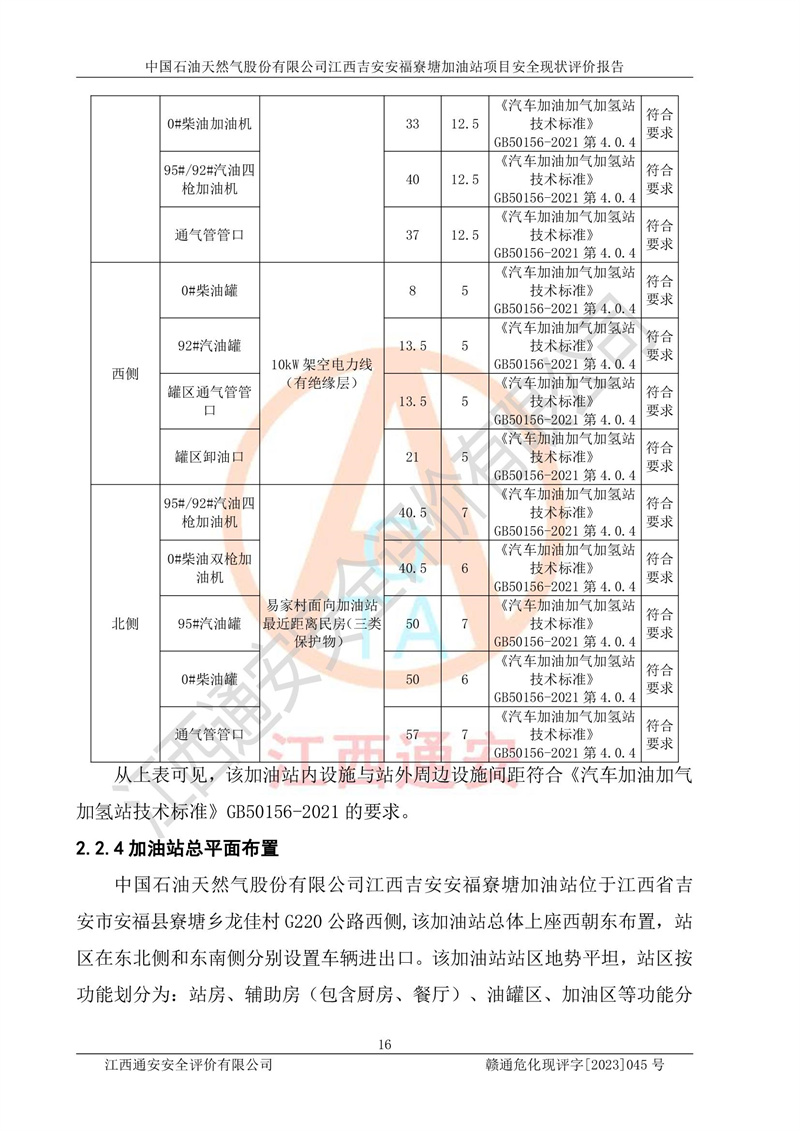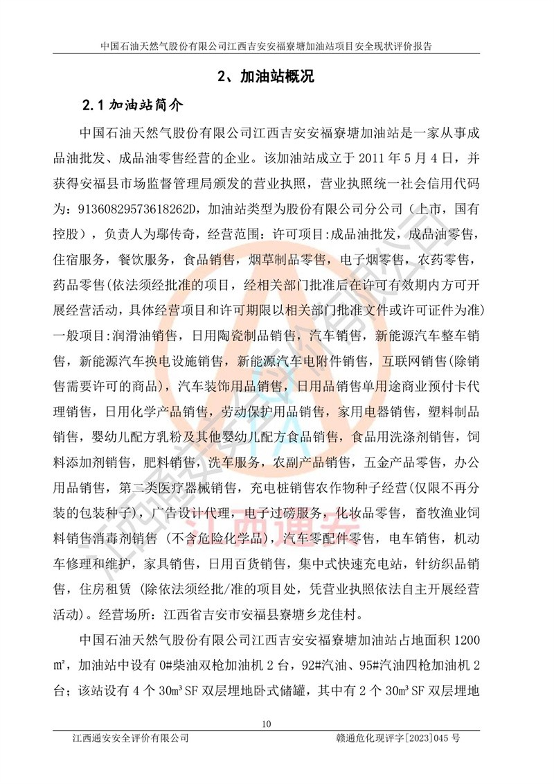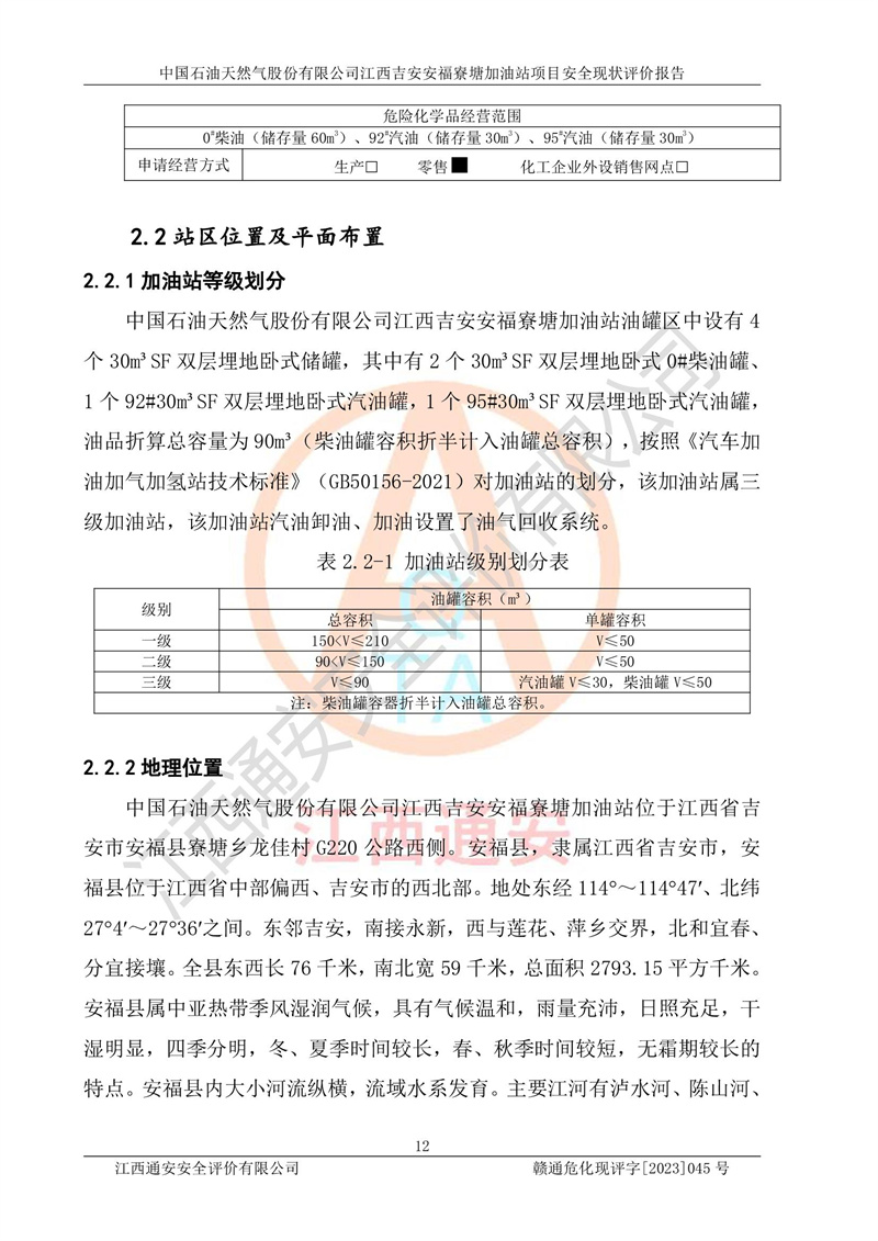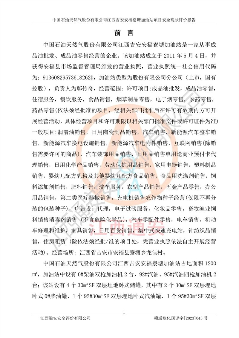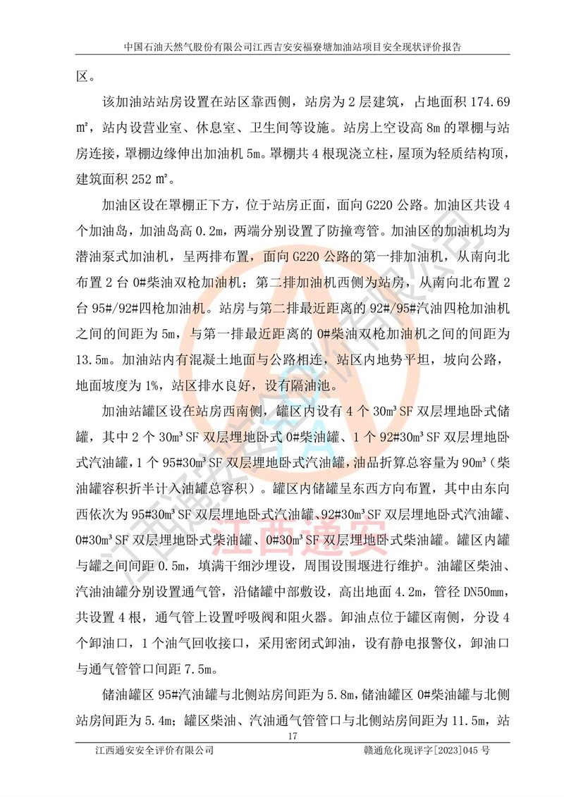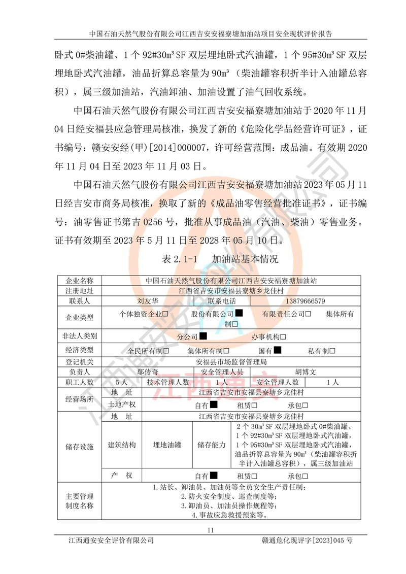 中国石油天然气股份有限公司江西吉安安福寮塘加油站是一家从事成品油批发、成品油零售经营的企业。该加油站成立于2011年5月4日,并获得安福县市场监督管理局颁发的营业执照,营业执照统一社会信用代码为:91360829573618262D,加油站类型为股份有限公司分公司(上市,国有控股),负责人为鄢**,经营范围:许可项目:成品油批发,成品油零售,住宿服务,餐饮服务,食品销售,烟草制品零售,***零售,农药零售,药品零售(依法须经批准的项目,经相关部门批准后在许可**期内方可开展经营活动,具体经营项目和许可期限以相关部门批准文件或许可证件为准)一般项目:润滑油销售,日用陶瓷制品销售,汽车销售,新能源汽车整车销售,新能源汽车换电设施销售,新能源汽车电附件销售,互联网销售(除销售需要许可的商品),汽车装饰用品销售,日用品销售单用途商业预付卡代理销售,日用化学产品销售,劳动保护用品销售,家用电器销售,塑料制品销售,婴幼儿配方乳粉及其他婴幼儿配方食品销售,食品用洗涤剂销售,饲料添加剂销售,肥料销售,洗车服务,农副产品销售,五金产品零售,办公用品销售,第二类医疗器械销售,充电桩销售农作物种子经营(**不再分装的包装种子),广告设计代理,电子过磅服务,化妆品零售,畜牧渔业饲料销售消毒剂销售 (不含危险化学品),汽车零配件零售,电车销售,机动车修理和维护,家具销售,日用百货销售,集中式**充电站,针纺织品销售,住房租赁 (除依法须经批/准的项目处,凭营业执照依法自主开展经营活动)。经营场所:江西省吉安市安福县寮塘乡龙佳村。 中国石油天然气股份有限公司江西吉安安福寮塘加油站占地面积1200㎡,加油站中设有0#柴油双枪加油机2台,92#汽油、95#汽油四枪加油机2台;该站设有4个30m³SF双层埋地卧式储罐,其中有2个30m³SF双层埋地卧式0#柴油罐、1个92#30m³SF双层埋地卧式汽油罐,1个95#30m³SF双层埋地卧式汽油罐,油品折算总容量为90m³(柴油罐容积折半计入油罐总容积),属三级加油站,汽油卸油、加油设置了油气回收系统。 中国石油天然气股份有限公司江西吉安安福寮塘加油站于2020年11月04日经安福县应急管理局核准,换发了新的《危险化学品经营许可证》,证书编号:赣安安经(甲)[2014]000007,许可经营范围:成品油。**期2020年11月04日至2023年11月03日。 中国石油天然气股份有限公司江西吉安安福寮塘加油站2023年05月11日经吉安市商务局核准,换取了新的《成品油零售经营批准证书》,证书编号:油零售证书第吉0256号,批准从事成品油(汽油、柴油)零售业务。证书**期至2023年5月11日至2028年05月10日。 |