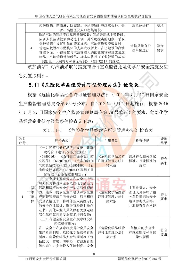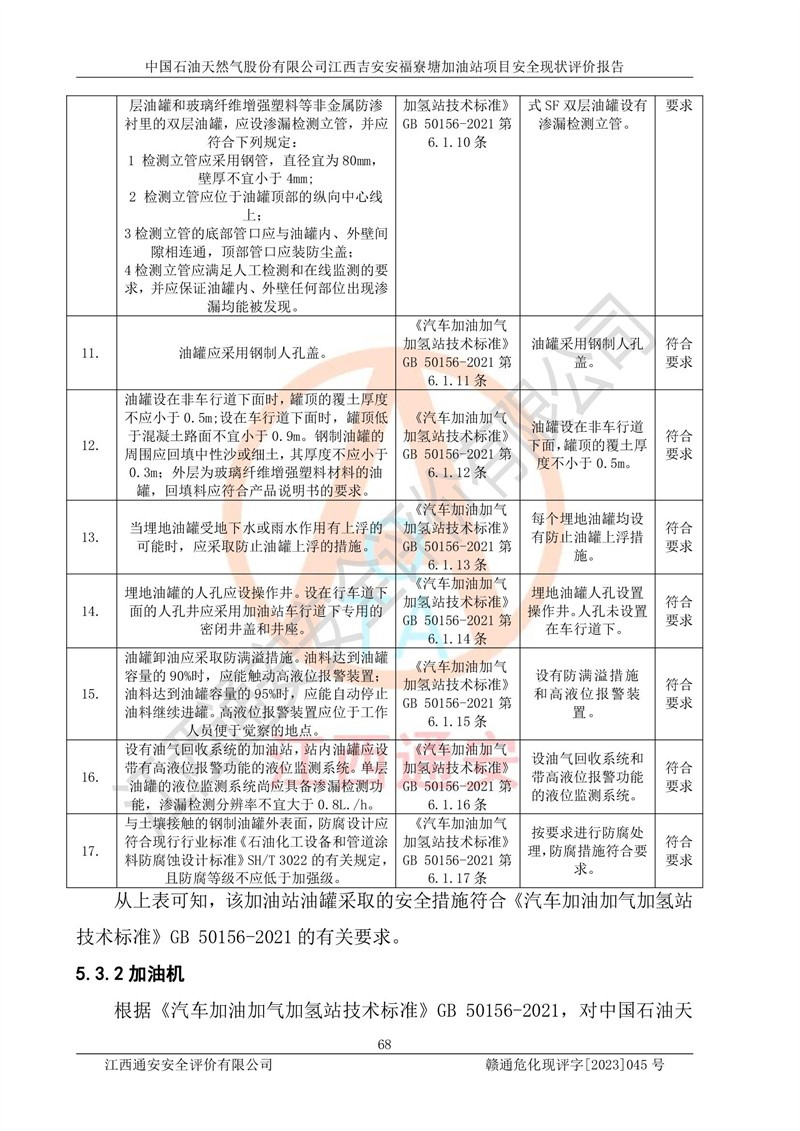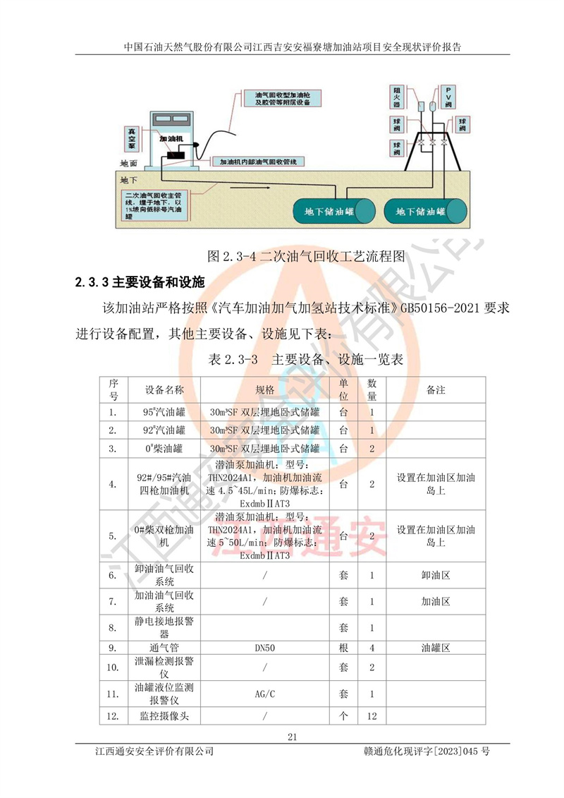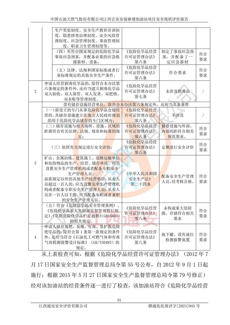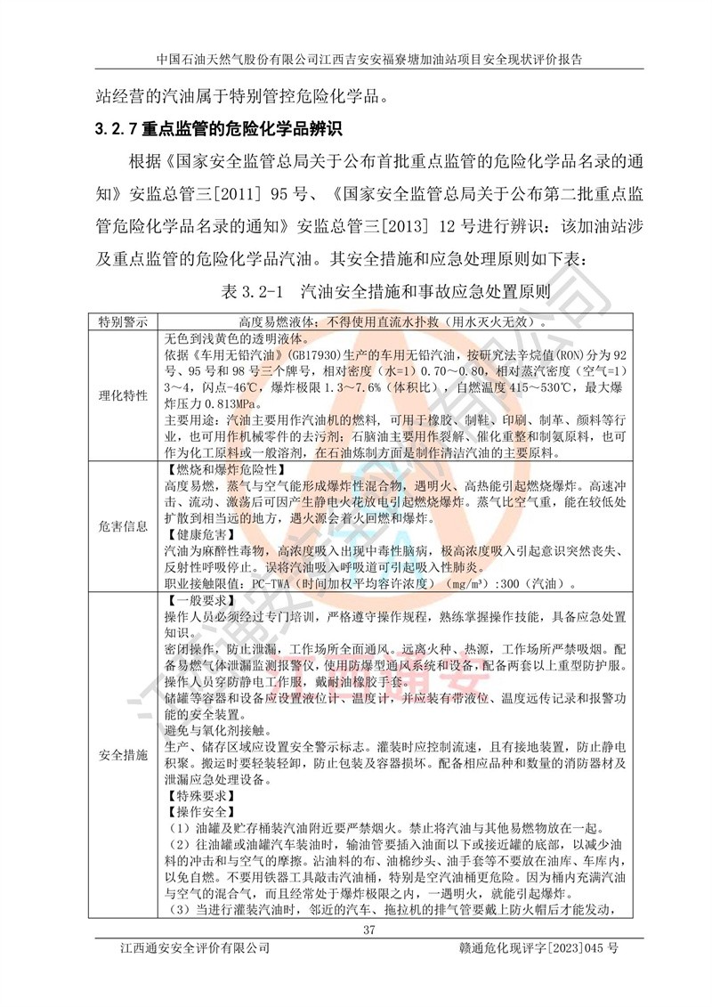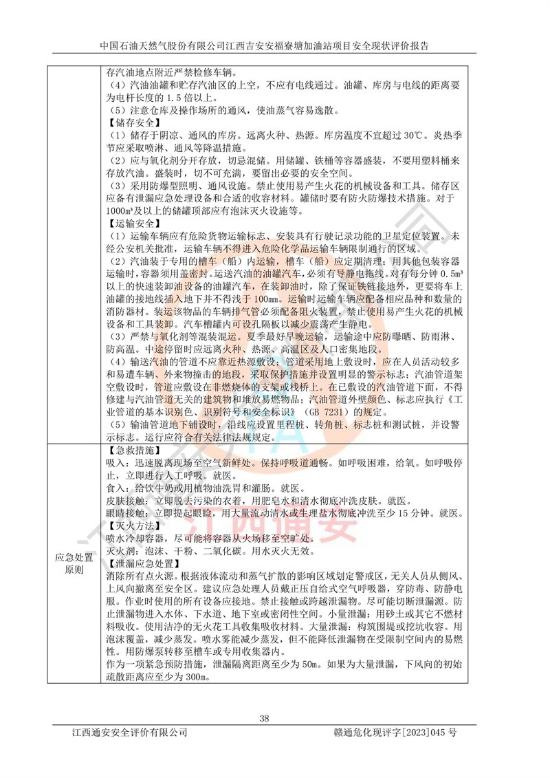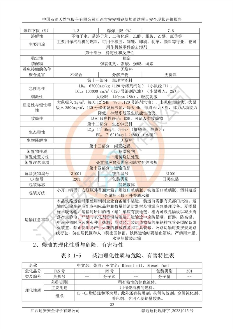 中国石油天然气股份有限公司江西吉安安福寮塘加油站是一家从事成品油批发、成品油零售经营的企业。该加油站成立于2011年5月4日,并获得安福县市场监督管理局颁发的营业执照,营业执照统一社会信用代码为:91360829573618262D,加油站类型为股份有限公司分公司(上市,国有控股),负责人为鄢**,经营范围:许可项目:成品油批发,成品油零售,住宿服务,餐饮服务,食品销售,烟草制品零售,***零售,农药零售,药品零售(依法须经批准的项目,经相关部门批准后在许可**期内方可开展经营活动,具体经营项目和许可期限以相关部门批准文件或许可证件为准)一般项目:润滑油销售,日用陶瓷制品销售,汽车销售,新能源汽车整车销售,新能源汽车换电设施销售,新能源汽车电附件销售,互联网销售(除销售需要许可的商品),汽车装饰用品销售,日用品销售单用途商业预付卡代理销售,日用化学产品销售,劳动保护用品销售,家用电器销售,塑料制品销售,婴幼儿配方乳粉及其他婴幼儿配方食品销售,食品用洗涤剂销售,饲料添加剂销售,肥料销售,洗车服务,农副产品销售,五金产品零售,办公用品销售,第二类医疗器械销售,充电桩销售农作物种子经营(**不再分装的包装种子),广告设计代理,电子过磅服务,化妆品零售,畜牧渔业饲料销售消毒剂销售 (不含危险化学品),汽车零配件零售,电车销售,机动车修理和维护,家具销售,日用百货销售,集中式**充电站,针纺织品销售,住房租赁 (除依法须经批/准的项目处,凭营业执照依法自主开展经营活动)。经营场所:江西省吉安市安福县寮塘乡龙佳村。 中国石油天然气股份有限公司江西吉安安福寮塘加油站占地面积1200㎡,加油站中设有0#柴油双枪加油机2台,92#汽油、95#汽油四枪加油机2台;该站设有4个30m³SF双层埋地卧式储罐,其中有2个30m³SF双层埋地卧式0#柴油罐、1个92#30m³SF双层埋地卧式汽油罐,1个95#30m³SF双层埋地卧式汽油罐,油品折算总容量为90m³(柴油罐容积折半计入油罐总容积),属三级加油站,汽油卸油、加油设置了油气回收系统。 中国石油天然气股份有限公司江西吉安安福寮塘加油站于2020年11月04日经安福县应急管理局核准,换发了新的《危险化学品经营许可证》,证书编号:赣安安经(甲)[2014]000007,许可经营范围:成品油。**期2020年11月04日至2023年11月03日。 中国石油天然气股份有限公司江西吉安安福寮塘加油站2023年05月11日经吉安市商务局核准,换取了新的《成品油零售经营批准证书》,证书编号:油零售证书第吉0256号,批准从事成品油(汽油、柴油)零售业务。证书**期至2023年5月11日至2028年05月10日。 |