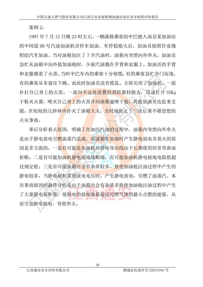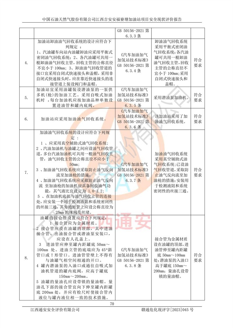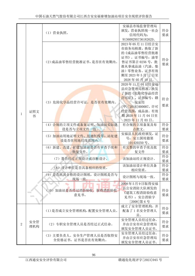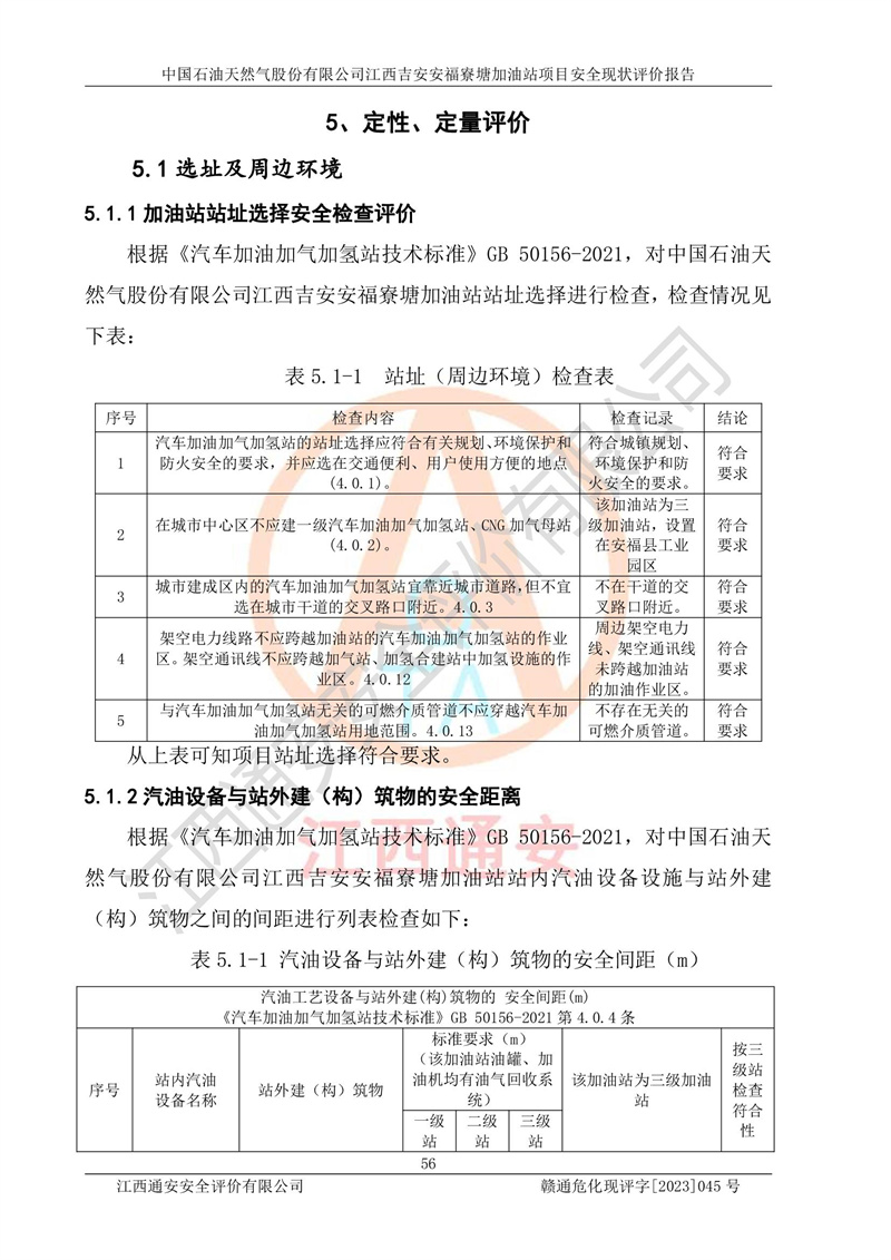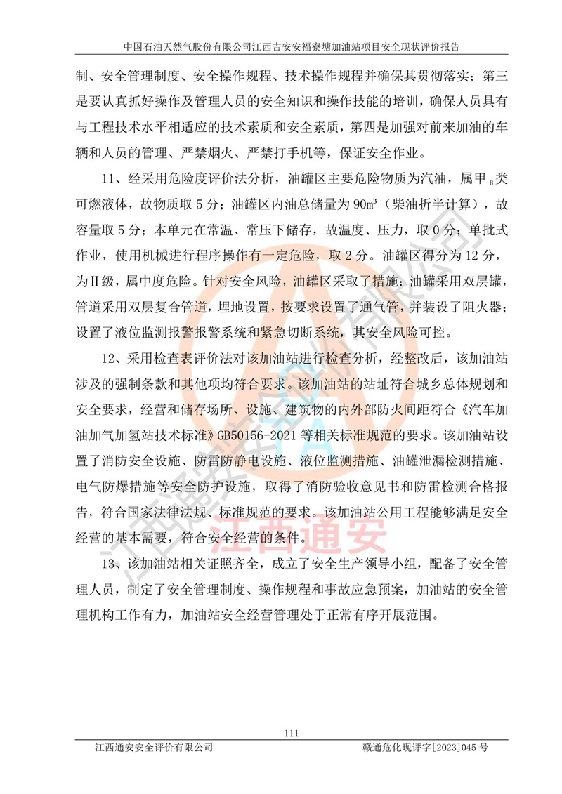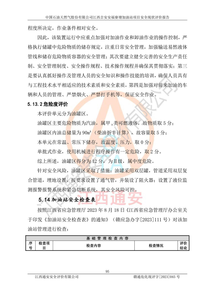 中国石油天然气股份有限公司江西吉安安福寮塘加油站是一家从事成品油批发、成品油零售经营的企业。该加油站成立于2011年5月4日,并获得安福县市场监督管理局颁发的营业执照,营业执照统一社会信用代码为:91360829573618262D,加油站类型为股份有限公司分公司(上市,国有控股),负责人为鄢**,经营范围:许可项目:成品油批发,成品油零售,住宿服务,餐饮服务,食品销售,烟草制品零售,***零售,农药零售,药品零售(依法须经批准的项目,经相关部门批准后在许可**期内方可开展经营活动,具体经营项目和许可期限以相关部门批准文件或许可证件为准)一般项目:润滑油销售,日用陶瓷制品销售,汽车销售,新能源汽车整车销售,新能源汽车换电设施销售,新能源汽车电附件销售,互联网销售(除销售需要许可的商品),汽车装饰用品销售,日用品销售单用途商业预付卡代理销售,日用化学产品销售,劳动保护用品销售,家用电器销售,塑料制品销售,婴幼儿配方乳粉及其他婴幼儿配方食品销售,食品用洗涤剂销售,饲料添加剂销售,肥料销售,洗车服务,农副产品销售,五金产品零售,办公用品销售,第二类医疗器械销售,充电桩销售农作物种子经营(**不再分装的包装种子),广告设计代理,电子过磅服务,化妆品零售,畜牧渔业饲料销售消毒剂销售 (不含危险化学品),汽车零配件零售,电车销售,机动车修理和维护,家具销售,日用百货销售,集中式**充电站,针纺织品销售,住房租赁 (除依法须经批/准的项目处,凭营业执照依法自主开展经营活动)。经营场所:江西省吉安市安福县寮塘乡龙佳村。 中国石油天然气股份有限公司江西吉安安福寮塘加油站占地面积1200㎡,加油站中设有0#柴油双枪加油机2台,92#汽油、95#汽油四枪加油机2台;该站设有4个30m³SF双层埋地卧式储罐,其中有2个30m³SF双层埋地卧式0#柴油罐、1个92#30m³SF双层埋地卧式汽油罐,1个95#30m³SF双层埋地卧式汽油罐,油品折算总容量为90m³(柴油罐容积折半计入油罐总容积),属三级加油站,汽油卸油、加油设置了油气回收系统。 中国石油天然气股份有限公司江西吉安安福寮塘加油站于2020年11月04日经安福县应急管理局核准,换发了新的《危险化学品经营许可证》,证书编号:赣安安经(甲)[2014]000007,许可经营范围:成品油。**期2020年11月04日至2023年11月03日。 中国石油天然气股份有限公司江西吉安安福寮塘加油站2023年05月11日经吉安市商务局核准,换取了新的《成品油零售经营批准证书》,证书编号:油零售证书第吉0256号,批准从事成品油(汽油、柴油)零售业务。证书**期至2023年5月11日至2028年05月10日。 |