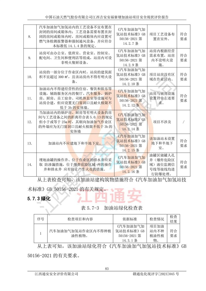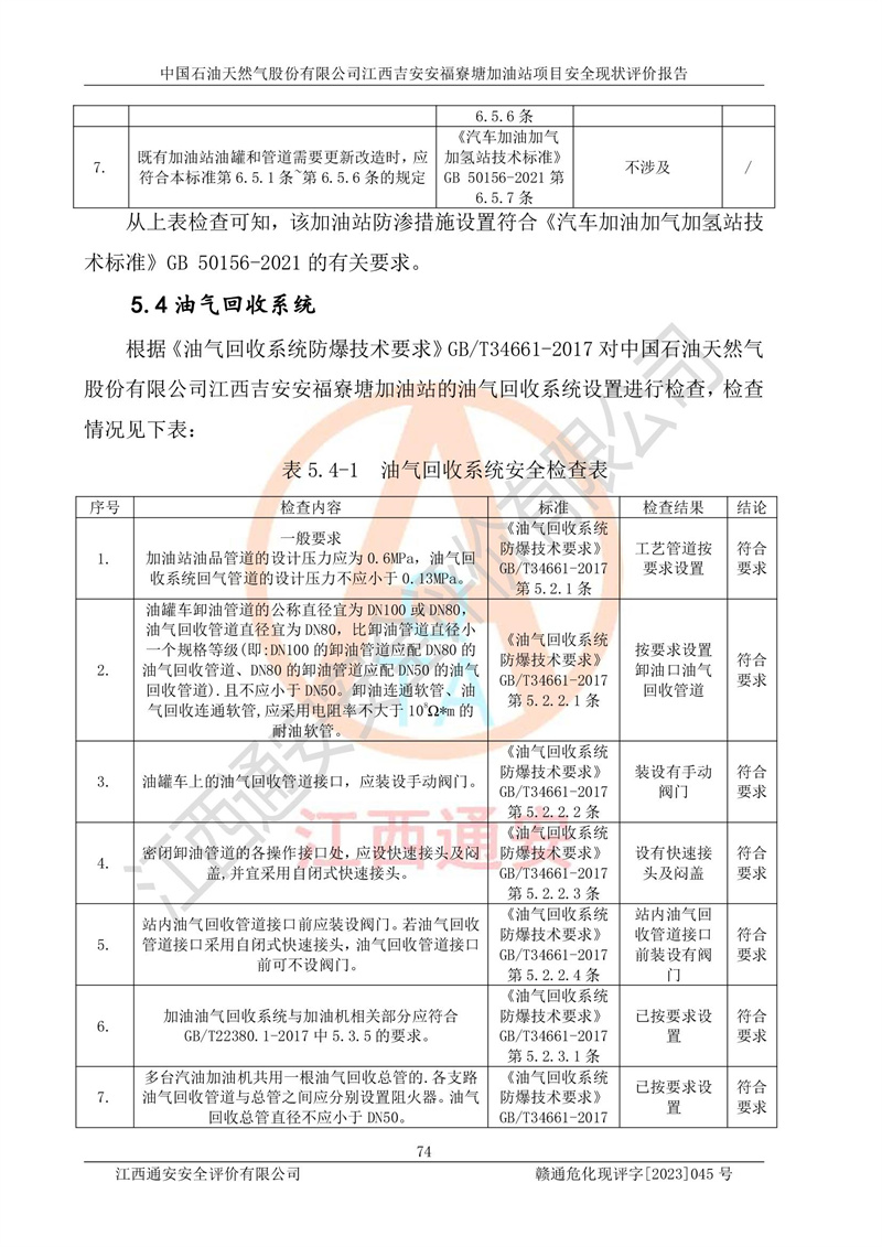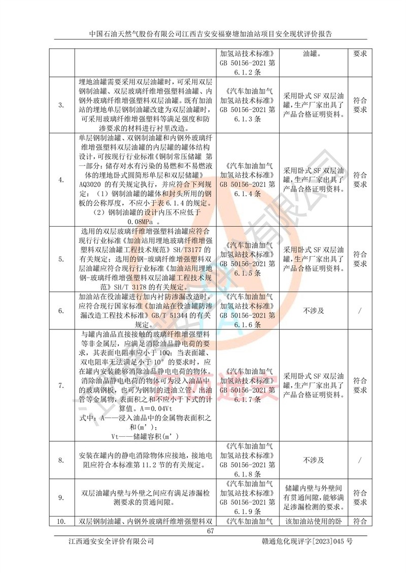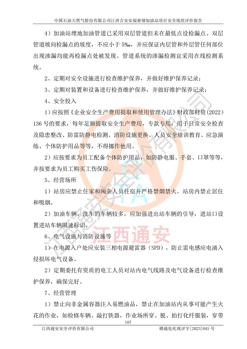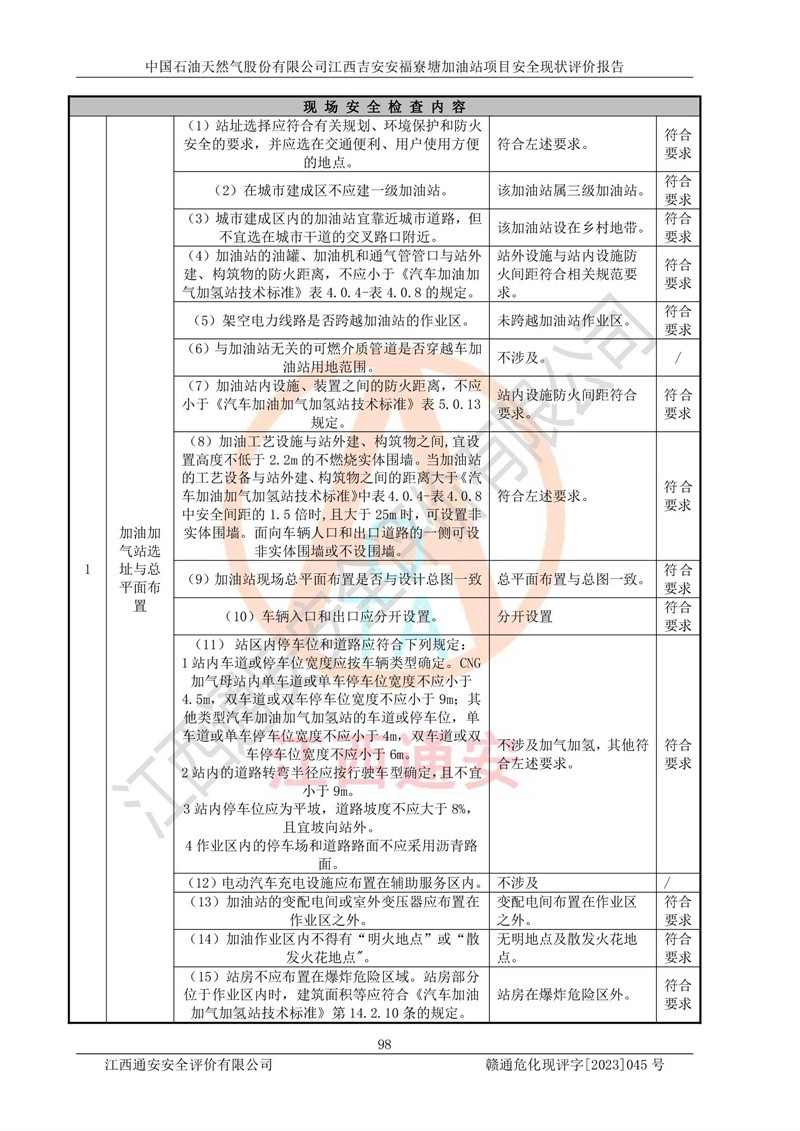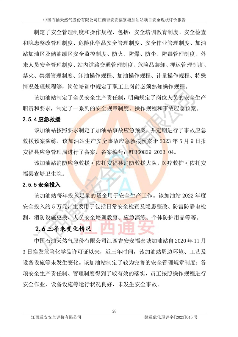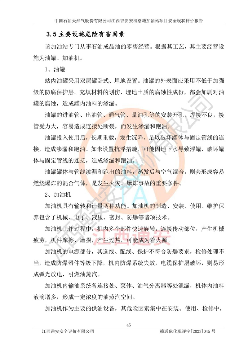 中国石油天然气股份有限公司江西吉安安福寮塘加油站是一家从事成品油批发、成品油零售经营的企业。该加油站成立于2011年5月4日,并获得安福县市场监督管理局颁发的营业执照,营业执照统一社会信用代码为:91360829573618262D,加油站类型为股份有限公司分公司(上市,国有控股),负责人为鄢**,经营范围:许可项目:成品油批发,成品油零售,住宿服务,餐饮服务,食品销售,烟草制品零售,***零售,农药零售,药品零售(依法须经批准的项目,经相关部门批准后在许可**期内方可开展经营活动,具体经营项目和许可期限以相关部门批准文件或许可证件为准)一般项目:润滑油销售,日用陶瓷制品销售,汽车销售,新能源汽车整车销售,新能源汽车换电设施销售,新能源汽车电附件销售,互联网销售(除销售需要许可的商品),汽车装饰用品销售,日用品销售单用途商业预付卡代理销售,日用化学产品销售,劳动保护用品销售,家用电器销售,塑料制品销售,婴幼儿配方乳粉及其他婴幼儿配方食品销售,食品用洗涤剂销售,饲料添加剂销售,肥料销售,洗车服务,农副产品销售,五金产品零售,办公用品销售,第二类医疗器械销售,充电桩销售农作物种子经营(**不再分装的包装种子),广告设计代理,电子过磅服务,化妆品零售,畜牧渔业饲料销售消毒剂销售 (不含危险化学品),汽车零配件零售,电车销售,机动车修理和维护,家具销售,日用百货销售,集中式**充电站,针纺织品销售,住房租赁 (除依法须经批/准的项目处,凭营业执照依法自主开展经营活动)。经营场所:江西省吉安市安福县寮塘乡龙佳村。 中国石油天然气股份有限公司江西吉安安福寮塘加油站占地面积1200㎡,加油站中设有0#柴油双枪加油机2台,92#汽油、95#汽油四枪加油机2台;该站设有4个30m³SF双层埋地卧式储罐,其中有2个30m³SF双层埋地卧式0#柴油罐、1个92#30m³SF双层埋地卧式汽油罐,1个95#30m³SF双层埋地卧式汽油罐,油品折算总容量为90m³(柴油罐容积折半计入油罐总容积),属三级加油站,汽油卸油、加油设置了油气回收系统。 中国石油天然气股份有限公司江西吉安安福寮塘加油站于2020年11月04日经安福县应急管理局核准,换发了新的《危险化学品经营许可证》,证书编号:赣安安经(甲)[2014]000007,许可经营范围:成品油。**期2020年11月04日至2023年11月03日。 中国石油天然气股份有限公司江西吉安安福寮塘加油站2023年05月11日经吉安市商务局核准,换取了新的《成品油零售经营批准证书》,证书编号:油零售证书第吉0256号,批准从事成品油(汽油、柴油)零售业务。证书**期至2023年5月11日至2028年05月10日。 |