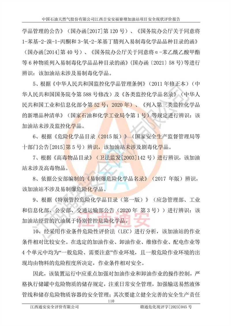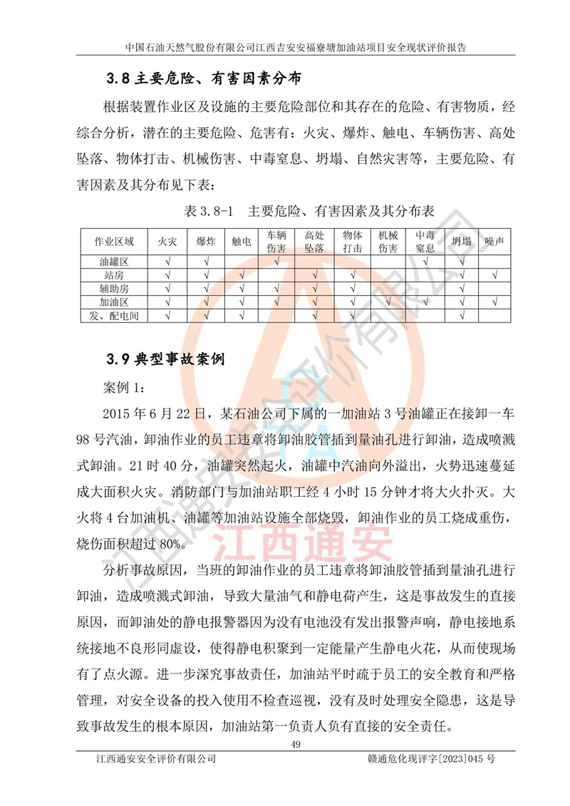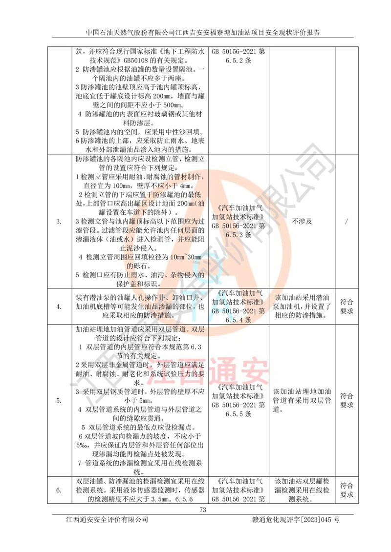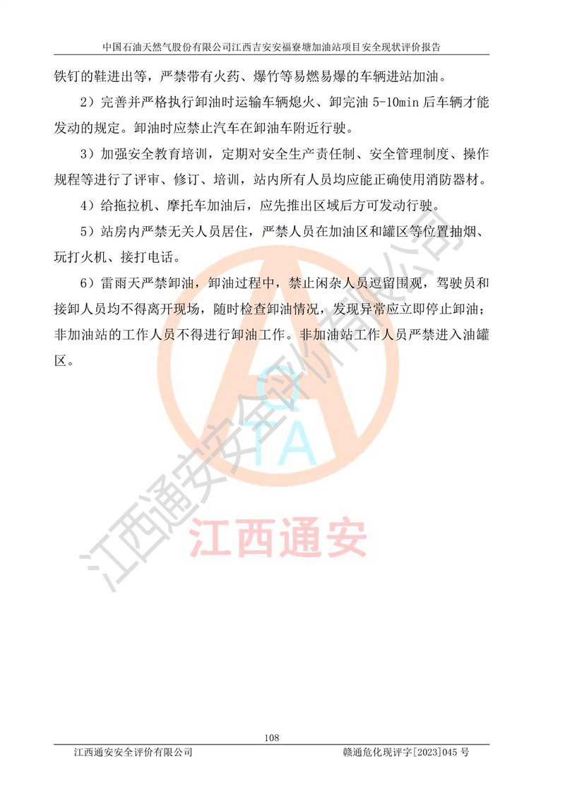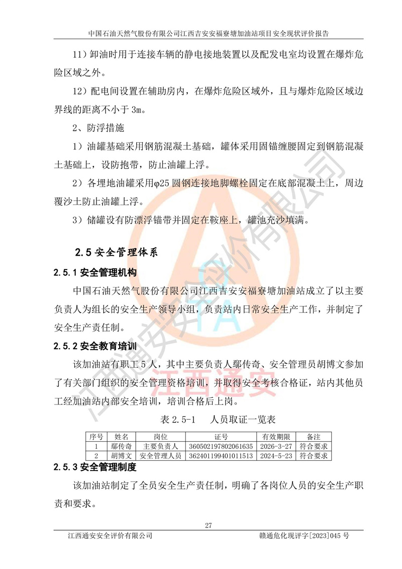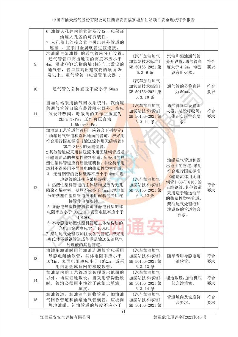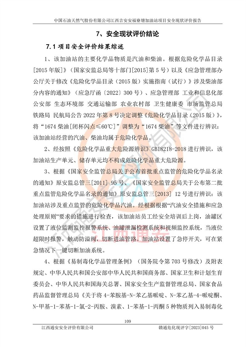 中国石油天然气股份有限公司江西吉安安福寮塘加油站是一家从事成品油批发、成品油零售经营的企业。该加油站成立于2011年5月4日,并获得安福县市场监督管理局颁发的营业执照,营业执照统一社会信用代码为:91360829573618262D,加油站类型为股份有限公司分公司(上市,国有控股),负责人为鄢**,经营范围:许可项目:成品油批发,成品油零售,住宿服务,餐饮服务,食品销售,烟草制品零售,***零售,农药零售,药品零售(依法须经批准的项目,经相关部门批准后在许可**期内方可开展经营活动,具体经营项目和许可期限以相关部门批准文件或许可证件为准)一般项目:润滑油销售,日用陶瓷制品销售,汽车销售,新能源汽车整车销售,新能源汽车换电设施销售,新能源汽车电附件销售,互联网销售(除销售需要许可的商品),汽车装饰用品销售,日用品销售单用途商业预付卡代理销售,日用化学产品销售,劳动保护用品销售,家用电器销售,塑料制品销售,婴幼儿配方乳粉及其他婴幼儿配方食品销售,食品用洗涤剂销售,饲料添加剂销售,肥料销售,洗车服务,农副产品销售,五金产品零售,办公用品销售,第二类医疗器械销售,充电桩销售农作物种子经营(**不再分装的包装种子),广告设计代理,电子过磅服务,化妆品零售,畜牧渔业饲料销售消毒剂销售 (不含危险化学品),汽车零配件零售,电车销售,机动车修理和维护,家具销售,日用百货销售,集中式**充电站,针纺织品销售,住房租赁 (除依法须经批/准的项目处,凭营业执照依法自主开展经营活动)。经营场所:江西省吉安市安福县寮塘乡龙佳村。 中国石油天然气股份有限公司江西吉安安福寮塘加油站占地面积1200㎡,加油站中设有0#柴油双枪加油机2台,92#汽油、95#汽油四枪加油机2台;该站设有4个30m³SF双层埋地卧式储罐,其中有2个30m³SF双层埋地卧式0#柴油罐、1个92#30m³SF双层埋地卧式汽油罐,1个95#30m³SF双层埋地卧式汽油罐,油品折算总容量为90m³(柴油罐容积折半计入油罐总容积),属三级加油站,汽油卸油、加油设置了油气回收系统。 中国石油天然气股份有限公司江西吉安安福寮塘加油站于2020年11月04日经安福县应急管理局核准,换发了新的《危险化学品经营许可证》,证书编号:赣安安经(甲)[2014]000007,许可经营范围:成品油。**期2020年11月04日至2023年11月03日。 中国石油天然气股份有限公司江西吉安安福寮塘加油站2023年05月11日经吉安市商务局核准,换取了新的《成品油零售经营批准证书》,证书编号:油零售证书第吉0256号,批准从事成品油(汽油、柴油)零售业务。证书**期至2023年5月11日至2028年05月10日。 |