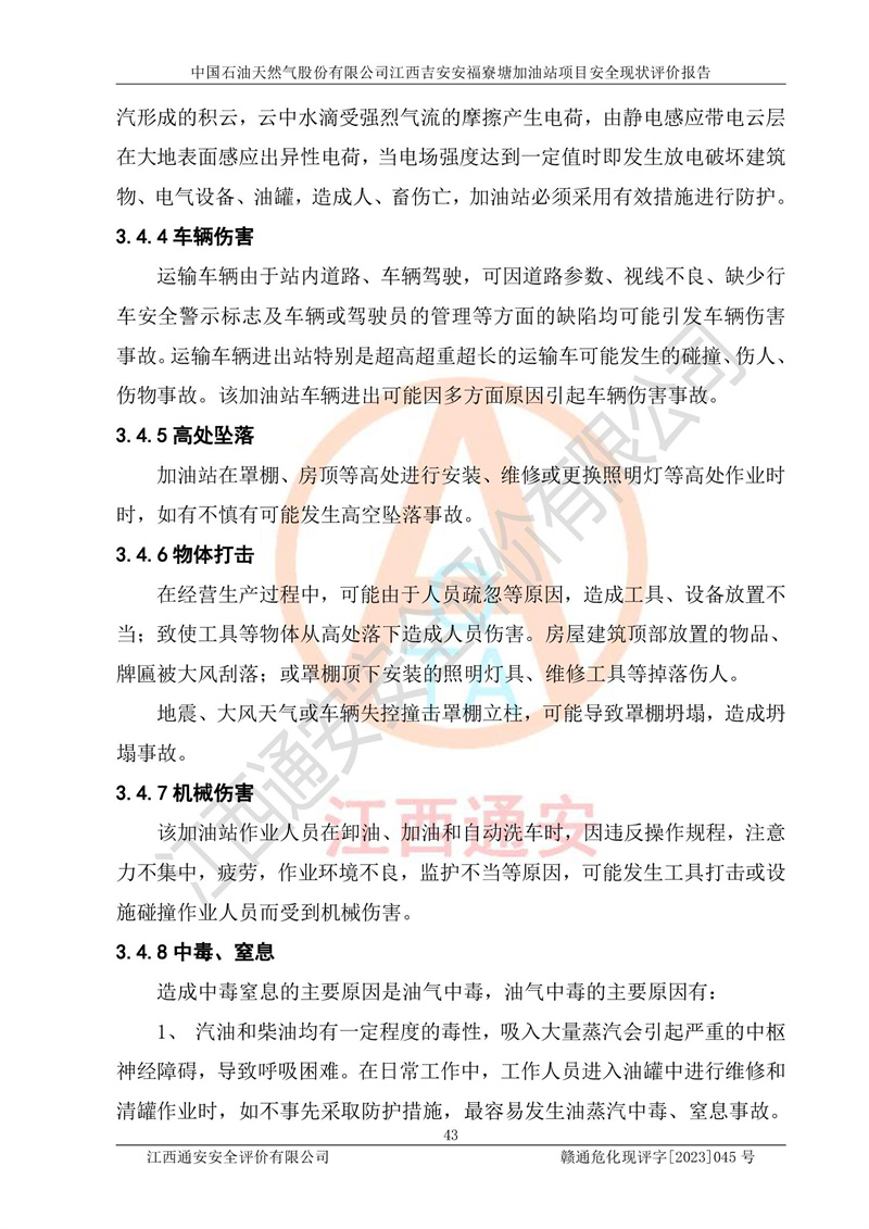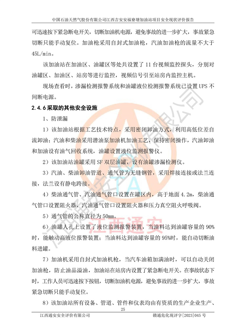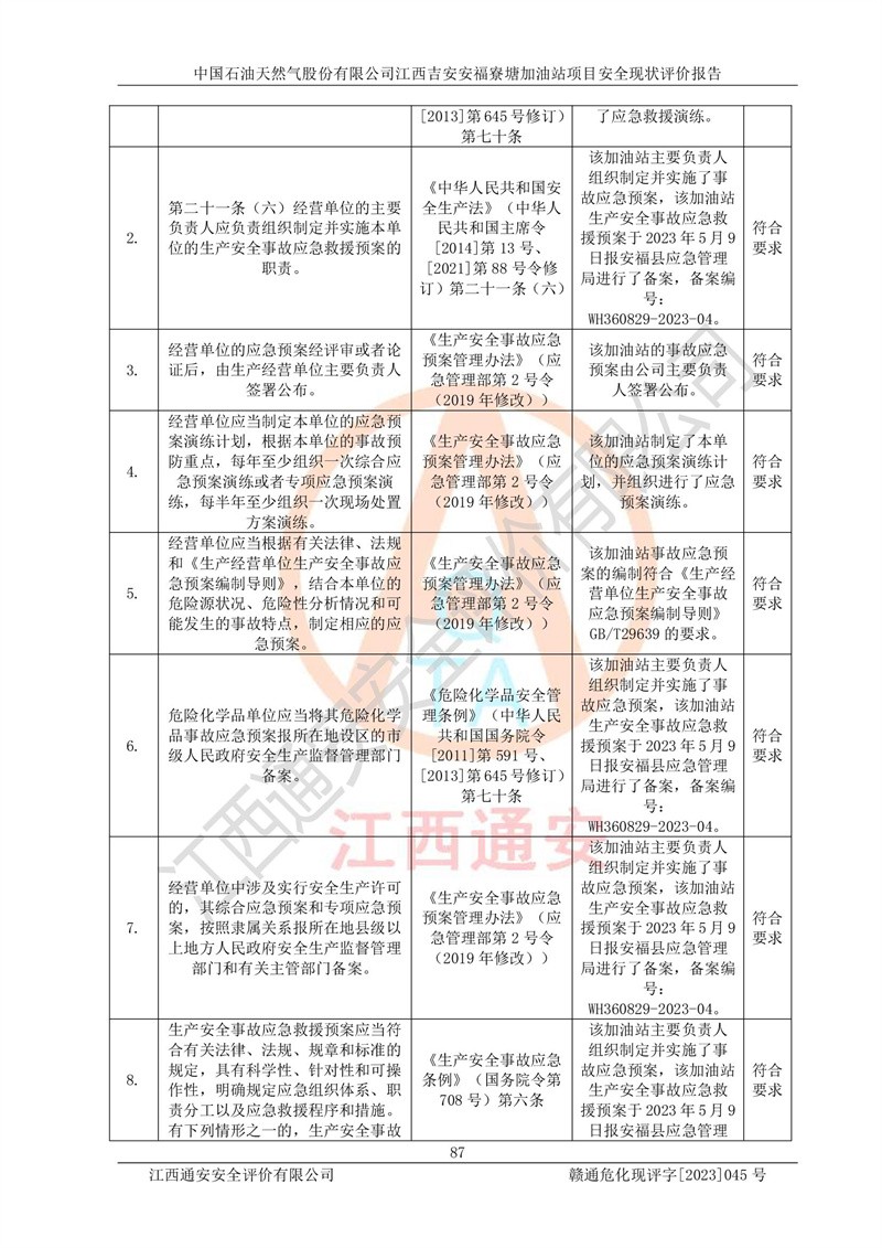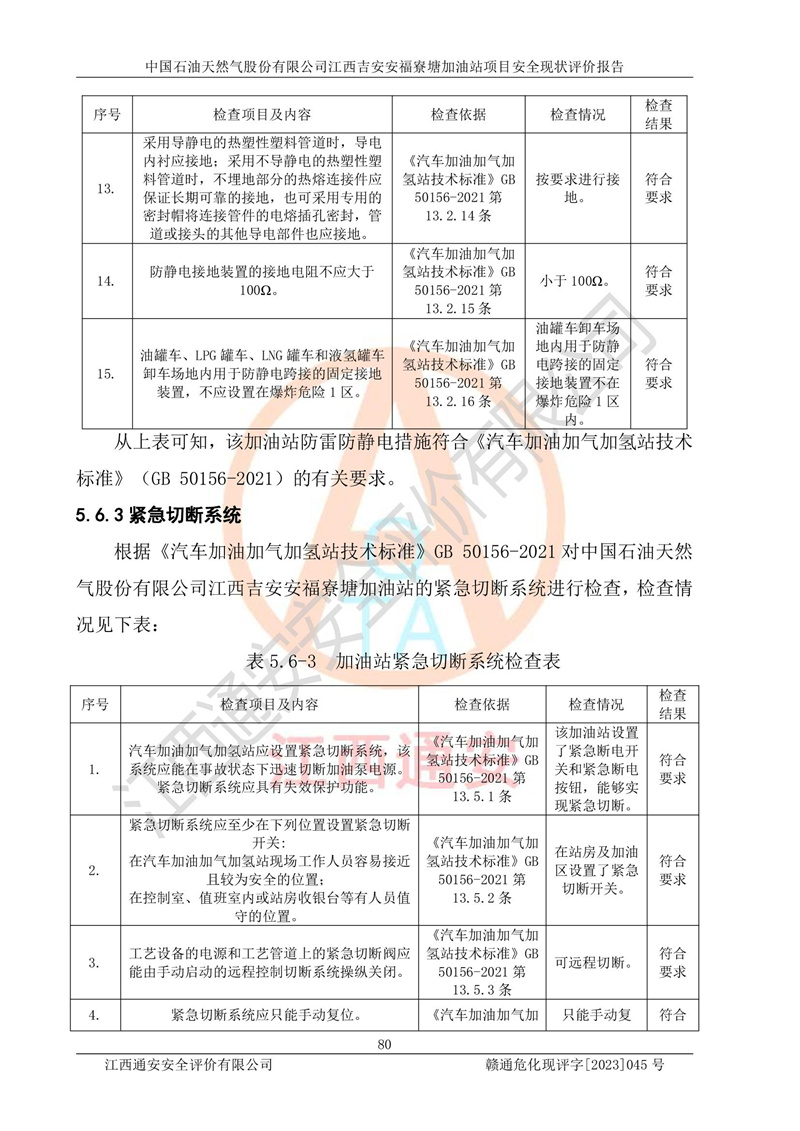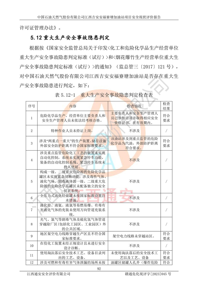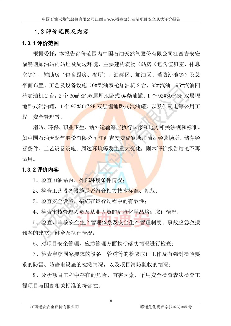 中国石油天然气股份有限公司江西吉安安福寮塘加油站是一家从事成品油批发、成品油零售经营的企业。该加油站成立于2011年5月4日,并获得安福县市场监督管理局颁发的营业执照,营业执照统一社会信用代码为:91360829573618262D,加油站类型为股份有限公司分公司(上市,国有控股),负责人为鄢**,经营范围:许可项目:成品油批发,成品油零售,住宿服务,餐饮服务,食品销售,烟草制品零售,***零售,农药零售,药品零售(依法须经批准的项目,经相关部门批准后在许可**期内方可开展经营活动,具体经营项目和许可期限以相关部门批准文件或许可证件为准)一般项目:润滑油销售,日用陶瓷制品销售,汽车销售,新能源汽车整车销售,新能源汽车换电设施销售,新能源汽车电附件销售,互联网销售(除销售需要许可的商品),汽车装饰用品销售,日用品销售单用途商业预付卡代理销售,日用化学产品销售,劳动保护用品销售,家用电器销售,塑料制品销售,婴幼儿配方乳粉及其他婴幼儿配方食品销售,食品用洗涤剂销售,饲料添加剂销售,肥料销售,洗车服务,农副产品销售,五金产品零售,办公用品销售,第二类医疗器械销售,充电桩销售农作物种子经营(**不再分装的包装种子),广告设计代理,电子过磅服务,化妆品零售,畜牧渔业饲料销售消毒剂销售 (不含危险化学品),汽车零配件零售,电车销售,机动车修理和维护,家具销售,日用百货销售,集中式**充电站,针纺织品销售,住房租赁 (除依法须经批/准的项目处,凭营业执照依法自主开展经营活动)。经营场所:江西省吉安市安福县寮塘乡龙佳村。 中国石油天然气股份有限公司江西吉安安福寮塘加油站占地面积1200㎡,加油站中设有0#柴油双枪加油机2台,92#汽油、95#汽油四枪加油机2台;该站设有4个30m³SF双层埋地卧式储罐,其中有2个30m³SF双层埋地卧式0#柴油罐、1个92#30m³SF双层埋地卧式汽油罐,1个95#30m³SF双层埋地卧式汽油罐,油品折算总容量为90m³(柴油罐容积折半计入油罐总容积),属三级加油站,汽油卸油、加油设置了油气回收系统。 中国石油天然气股份有限公司江西吉安安福寮塘加油站于2020年11月04日经安福县应急管理局核准,换发了新的《危险化学品经营许可证》,证书编号:赣安安经(甲)[2014]000007,许可经营范围:成品油。**期2020年11月04日至2023年11月03日。 中国石油天然气股份有限公司江西吉安安福寮塘加油站2023年05月11日经吉安市商务局核准,换取了新的《成品油零售经营批准证书》,证书编号:油零售证书第吉0256号,批准从事成品油(汽油、柴油)零售业务。证书**期至2023年5月11日至2028年05月10日。 |