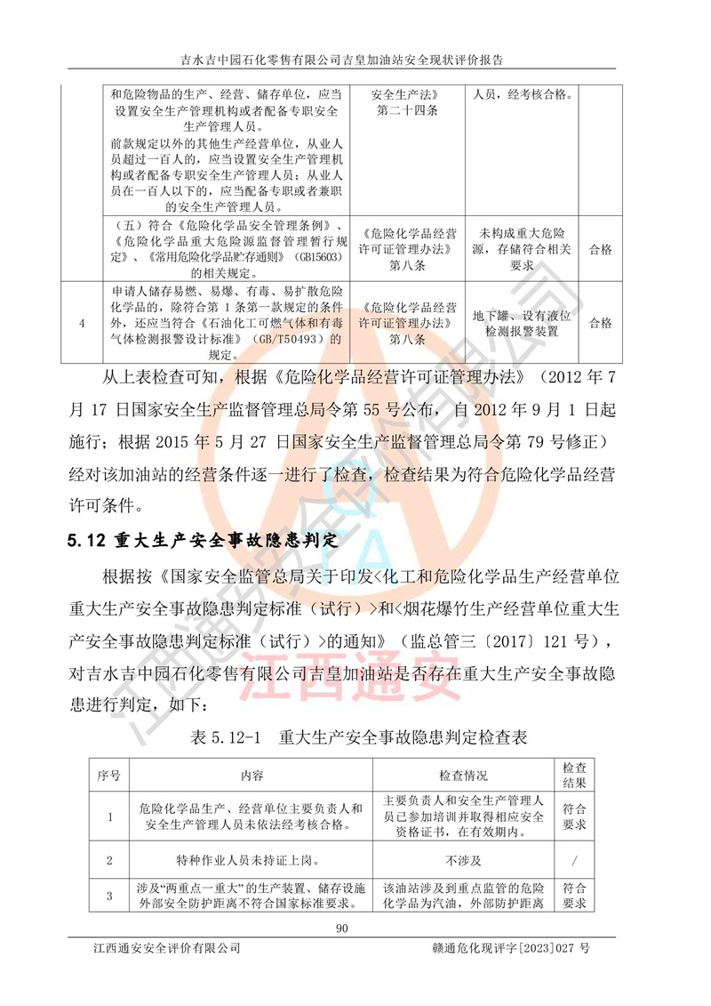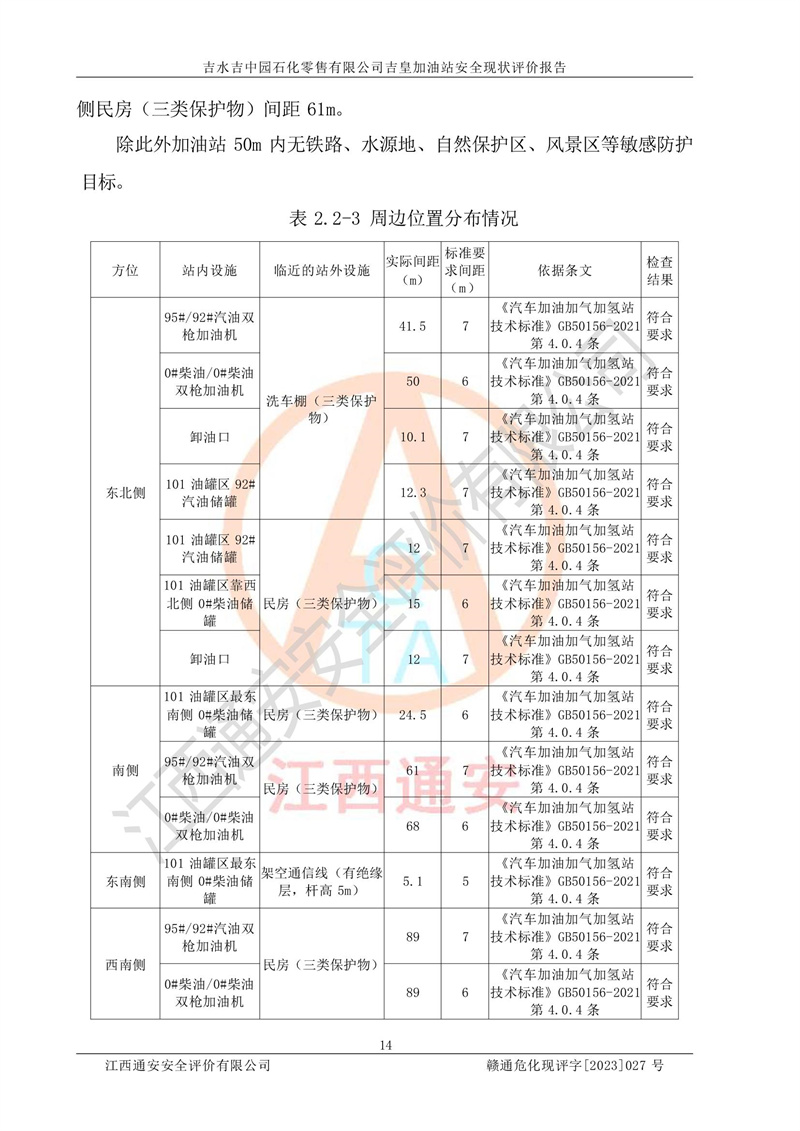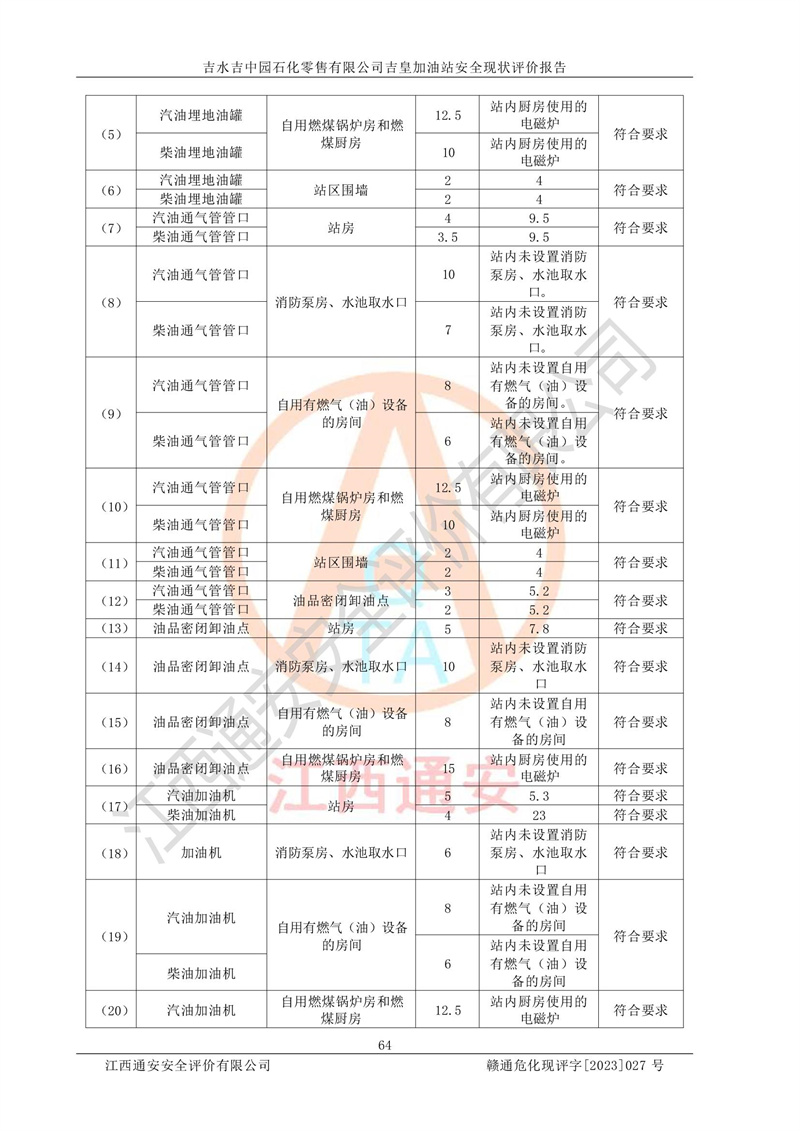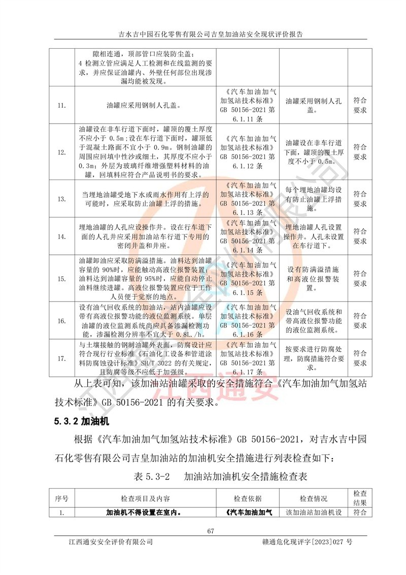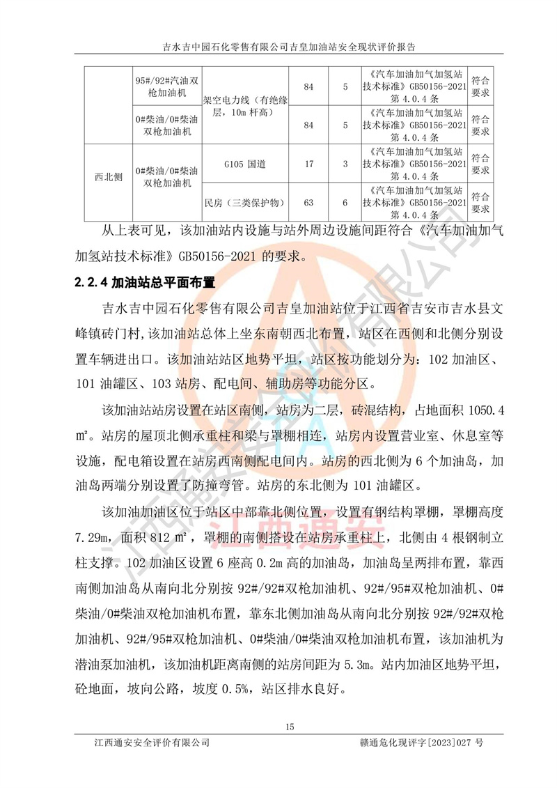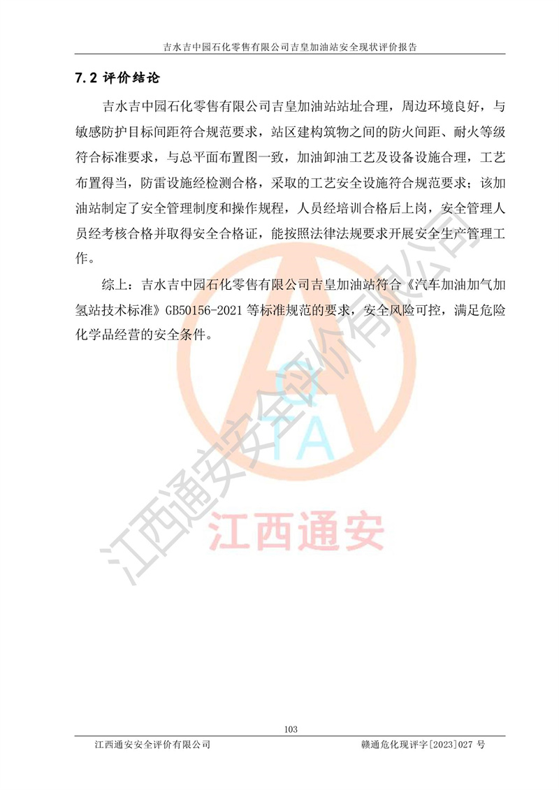 综上:吉水吉中园石化零售有限公司吉皇加油站符合《汽车加油加气加氢站技术标准》GB50156-2021等标准规范的要求,安全风险可控,满足危险化学品经营的安全条件。