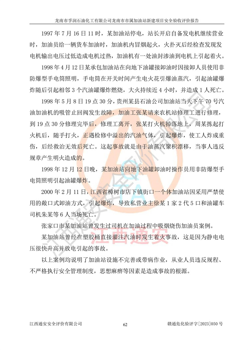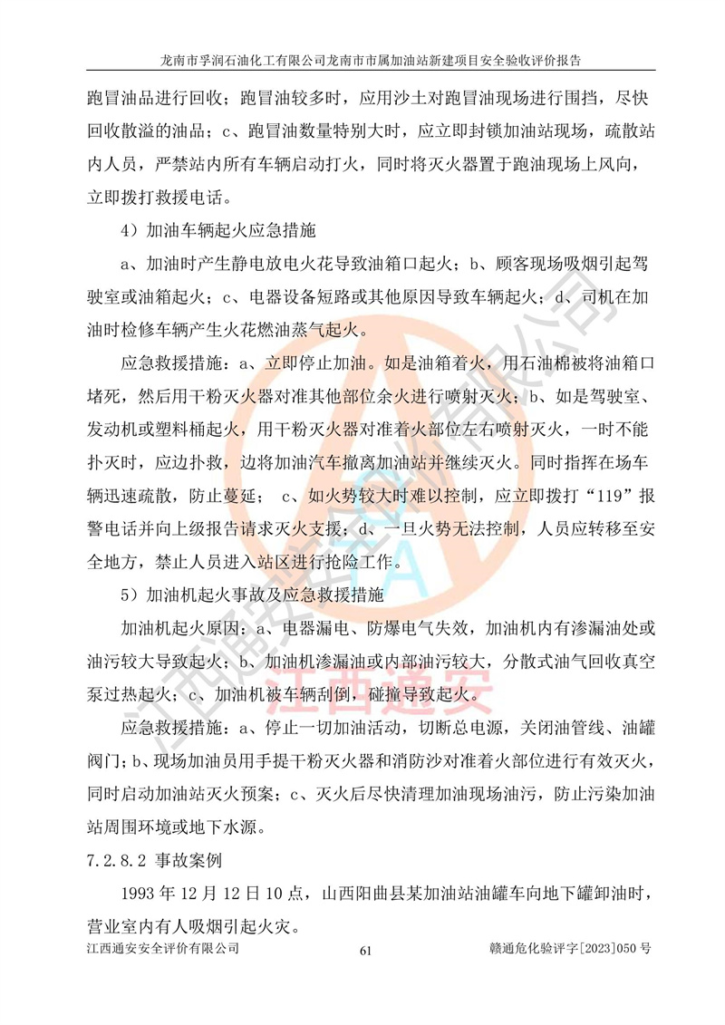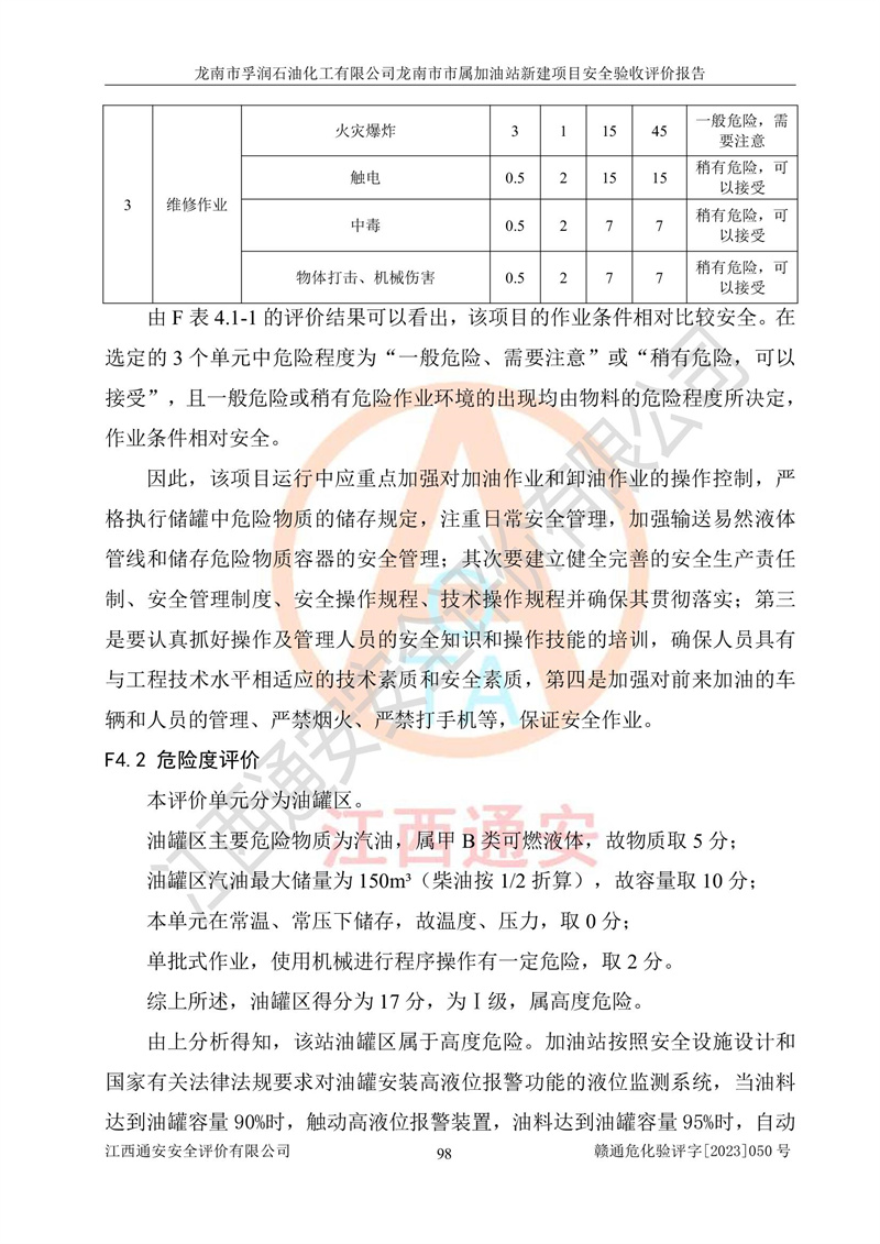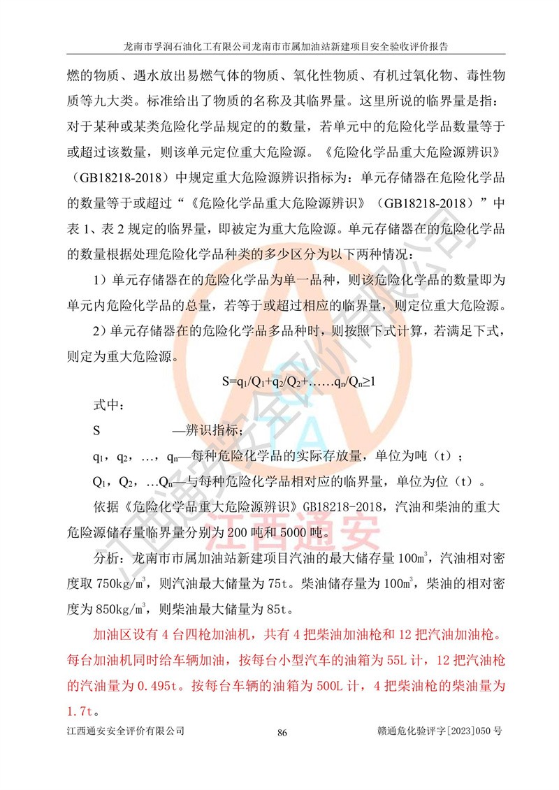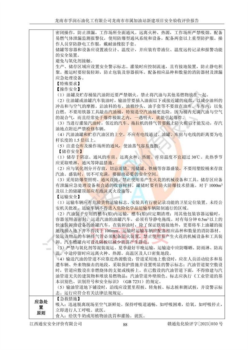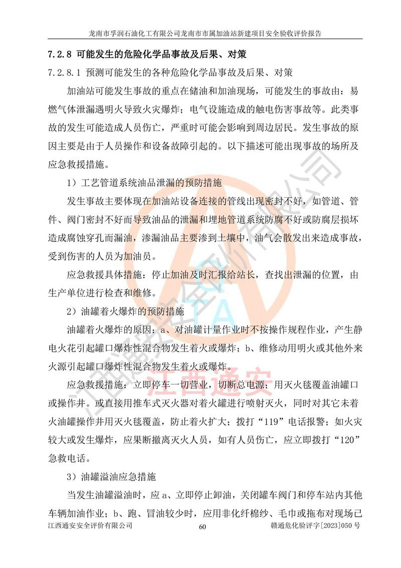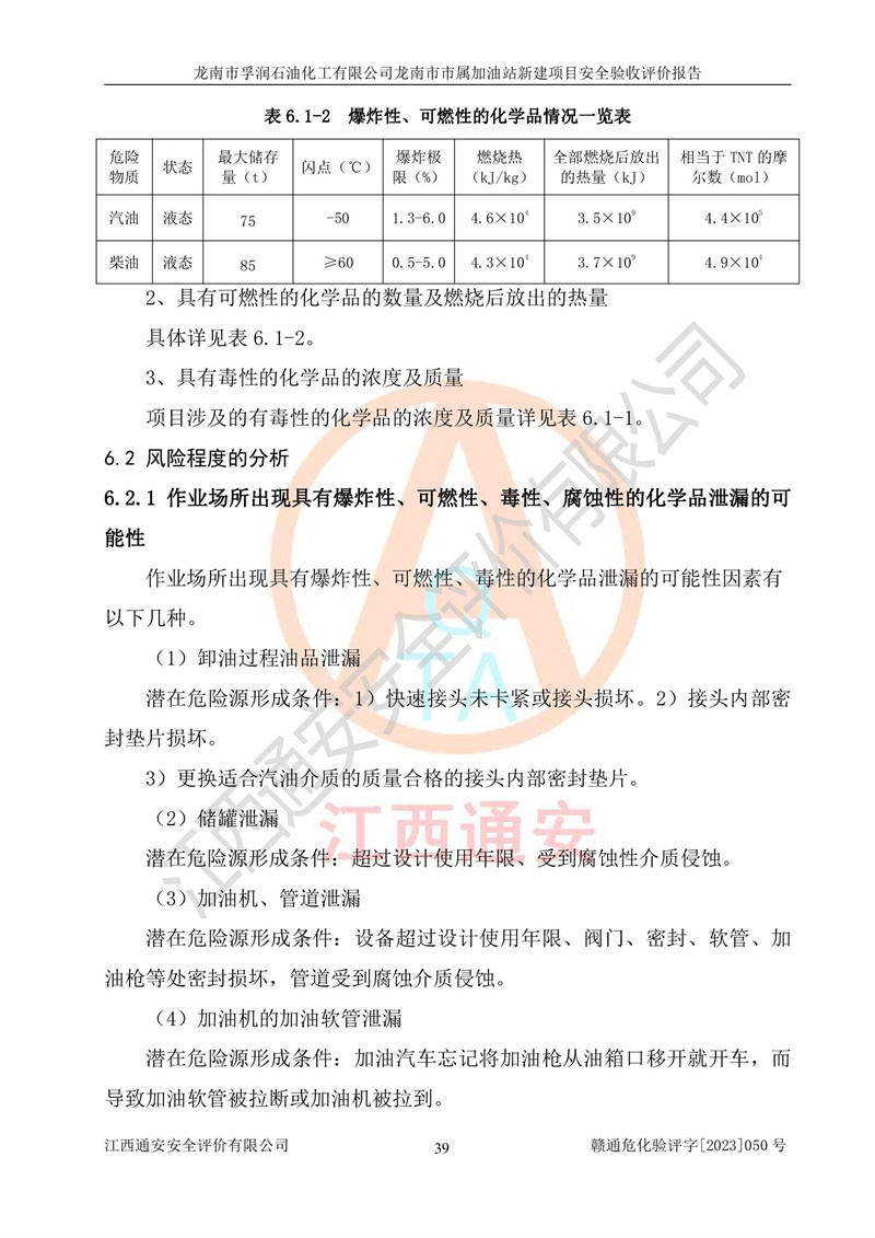 1、龙南市市属加油站新建项目为成品油零售企业,属于二级加油站,油罐区为主要危险源。该加油站不构成危险化学品重大危险源。 2、龙南市市属加油站新建项目所经营的汽油属于重点监管危险化学品,应加强安全管理,根据“汽油安全措施和应急处理原则”要求的措施进行检查,加油站设置了视频监控系统、具有液位报警功能的液位监测系统、渗漏检测,并制定各种管理制度和操作规程,已落实到位。 3、通过本报告分析,该项目投入经营后仍将面对多种危险因素,如火灾,爆炸、中毒、电气伤害、**伤害、噪声等危险有害因素。而项目*主要的危险、有害因素是火灾、爆炸,对此,加油站全体员工**保持**的安全防护意识。 4、项目公用工程能够满足安全经营的基本需要。 5、该加油站内部平面布置符合**和行业相关标准、规范的要求。建筑结构、消防、安全设施等布置明确、合理,符合各相关规范的要求。 6、加油站取得了雷电防护装置检测报告。 7、项目油罐、通气管口和加油机与外部环境的防火距离、平面布置、消防安全设施和措施满足法律法规、标准规范的要求。电气防爆保护、机械设备的安全保护等方面的安全设施建立**。 8、作业条件危险性评价结果:在选定的3个单元的危险程度为“一般危险、需要注意”或“稍有危险,可以接受”,且一般危险或稍有危险作业环境的出现均由物料的危险程度所决定,作业条件相对安全。 9、危险度评价结果:油罐区得分为17分,为Ⅰ级,属于**危险。加油站油罐安装高液位报警功能的液位监测系统,当油料达到油罐容量90%时,触动高液位报警装置,油料达到油罐容量95%时,自动停止油料继续进罐。同时,也采取了防止油品渗漏的保护措施,降低火灾爆炸危险,满足安全经营条件要求。 10、加油站建立了安全责任制,制定了安全管理制度、操作规程,编制了事故应急预案,配备了应急救援器材,按要求定期进行相关培训及演练。 11、该项目不涉及重大生产安全事故隐患,安全经营条件符合《危险化学品经营许可证管理办法》的要求。 龙南市孚润石油化工有限公司龙南市市属加油站新建项目具备**有关安全生产法律、法规、部门规章及标准规范要求的安全条件,符合经营和储存危险化学品(汽油、柴油)的安全条件要求,具备安全验收的条件。 |