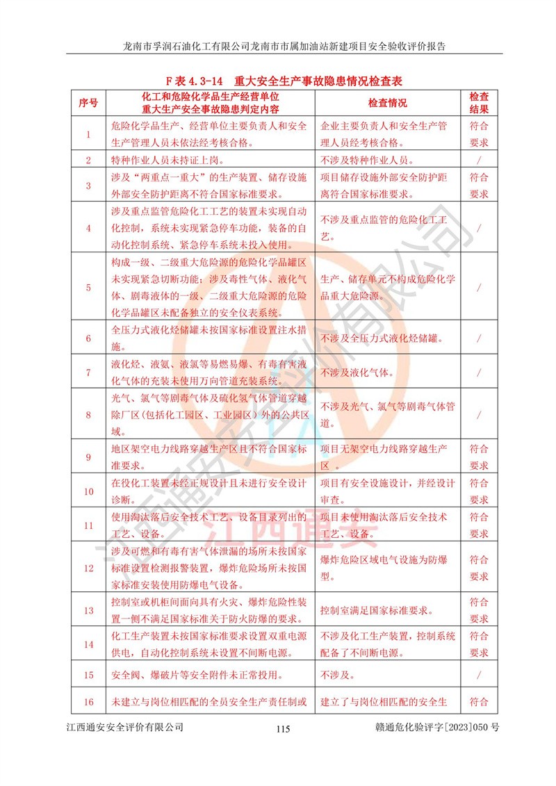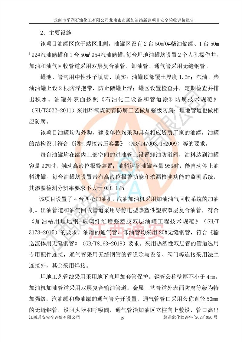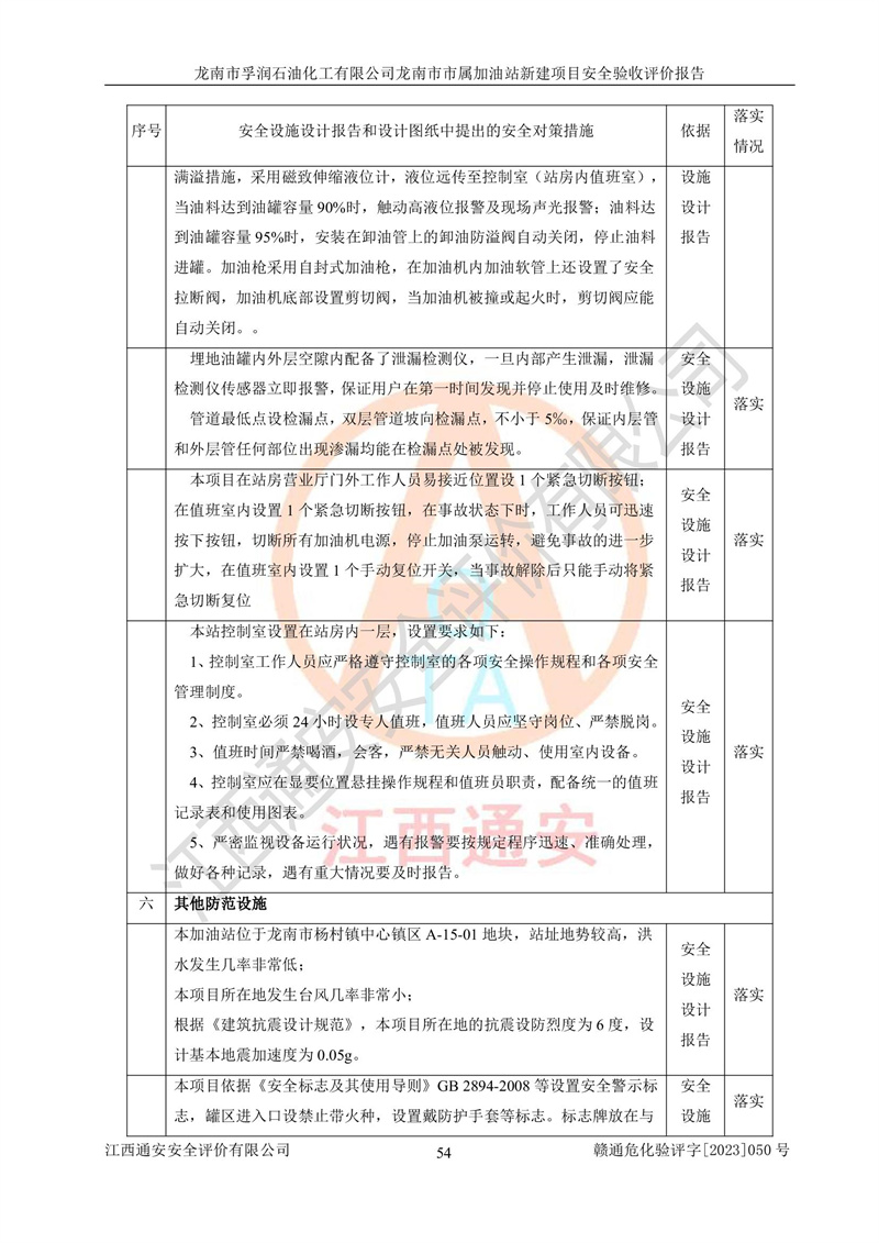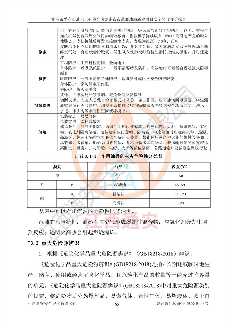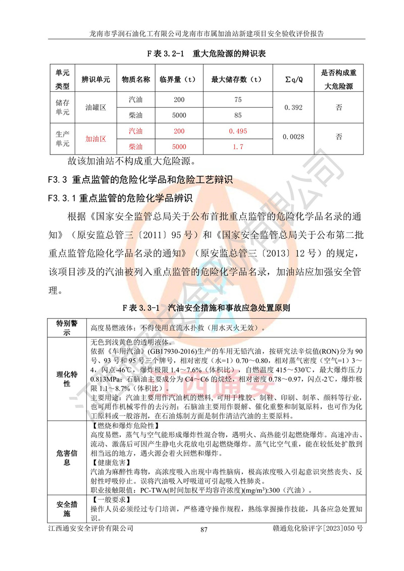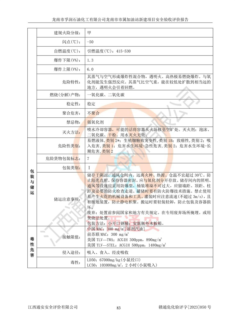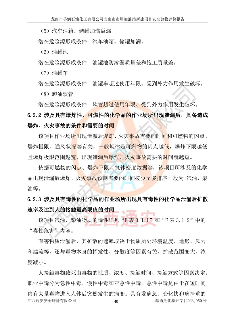 1、龙南市市属加油站新建项目为成品油零售企业,属于二级加油站,油罐区为主要危险源。该加油站不构成危险化学品重大危险源。 2、龙南市市属加油站新建项目所经营的汽油属于重点监管危险化学品,应加强安全管理,根据“汽油安全措施和应急处理原则”要求的措施进行检查,加油站设置了视频监控系统、具有液位报警功能的液位监测系统、渗漏检测,并制定各种管理制度和操作规程,已落实到位。 3、通过本报告分析,该项目投入经营后仍将面对多种危险因素,如火灾,爆炸、中毒、电气伤害、**伤害、噪声等危险有害因素。而项目*主要的危险、有害因素是火灾、爆炸,对此,加油站全体员工**保持**的安全防护意识。 4、项目公用工程能够满足安全经营的基本需要。 5、该加油站内部平面布置符合**和行业相关标准、规范的要求。建筑结构、消防、安全设施等布置明确、合理,符合各相关规范的要求。 6、加油站取得了雷电防护装置检测报告。 7、项目油罐、通气管口和加油机与外部环境的防火距离、平面布置、消防安全设施和措施满足法律法规、标准规范的要求。电气防爆保护、机械设备的安全保护等方面的安全设施建立**。 8、作业条件危险性评价结果:在选定的3个单元的危险程度为“一般危险、需要注意”或“稍有危险,可以接受”,且一般危险或稍有危险作业环境的出现均由物料的危险程度所决定,作业条件相对安全。 9、危险度评价结果:油罐区得分为17分,为Ⅰ级,属于**危险。加油站油罐安装高液位报警功能的液位监测系统,当油料达到油罐容量90%时,触动高液位报警装置,油料达到油罐容量95%时,自动停止油料继续进罐。同时,也采取了防止油品渗漏的保护措施,降低火灾爆炸危险,满足安全经营条件要求。 10、加油站建立了安全责任制,制定了安全管理制度、操作规程,编制了事故应急预案,配备了应急救援器材,按要求定期进行相关培训及演练。 11、该项目不涉及重大生产安全事故隐患,安全经营条件符合《危险化学品经营许可证管理办法》的要求。 龙南市孚润石油化工有限公司龙南市市属加油站新建项目具备**有关安全生产法律、法规、部门规章及标准规范要求的安全条件,符合经营和储存危险化学品(汽油、柴油)的安全条件要求,具备安全验收的条件。 |