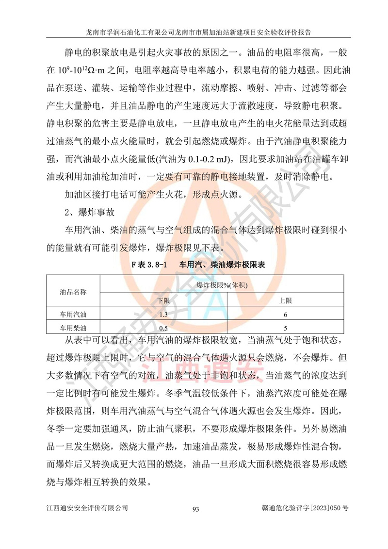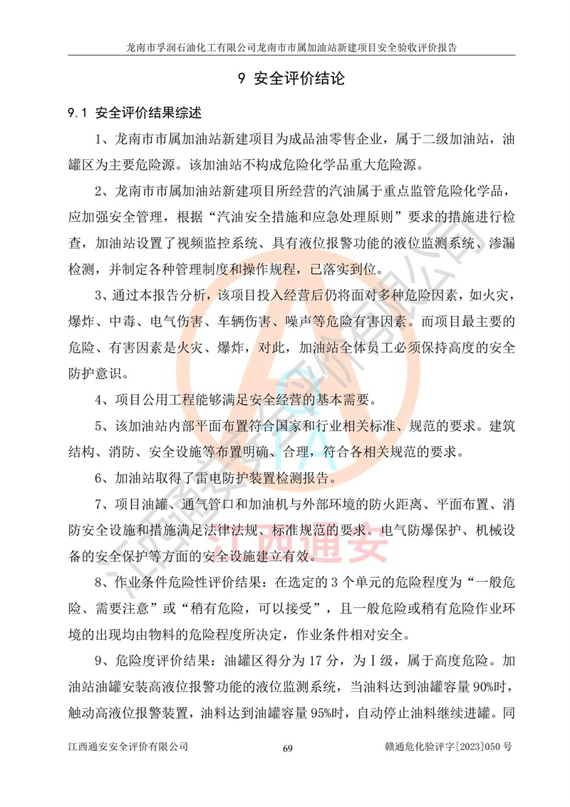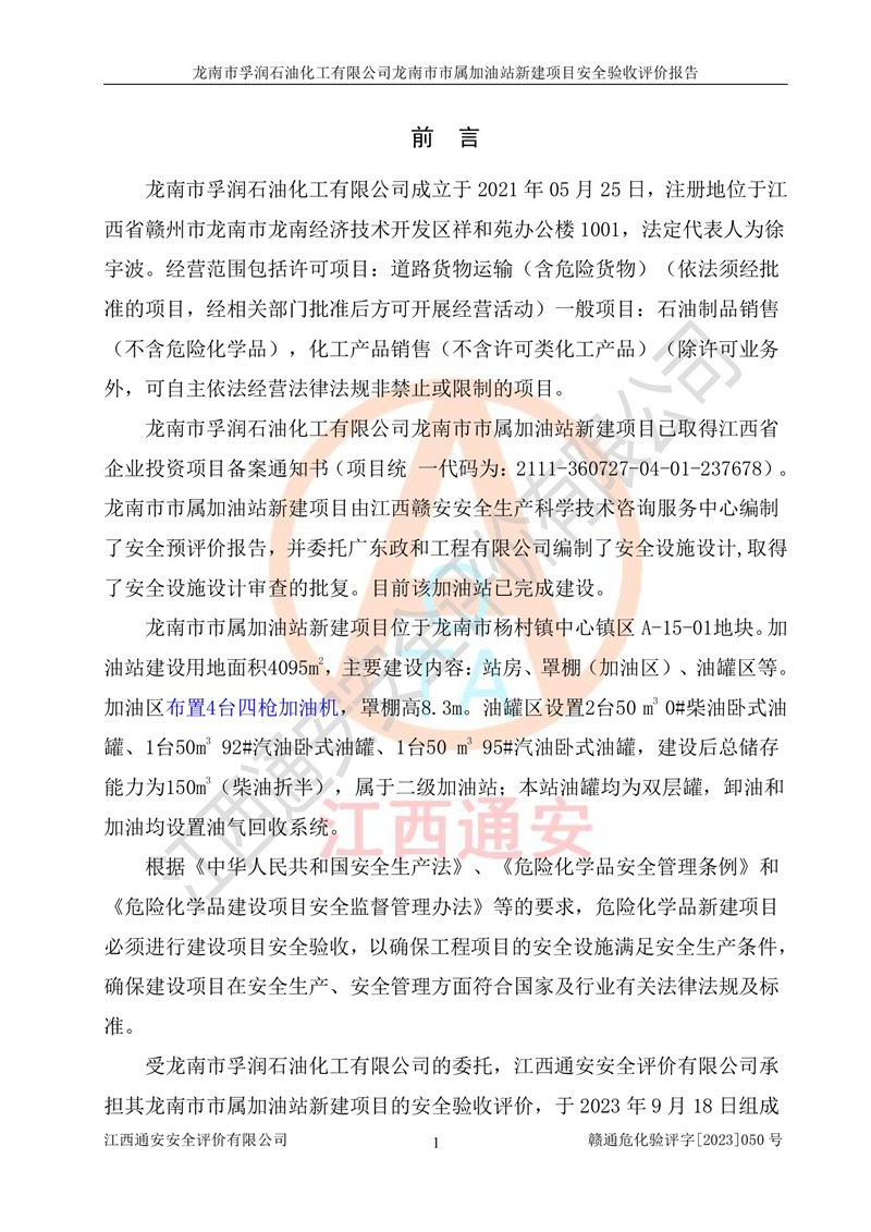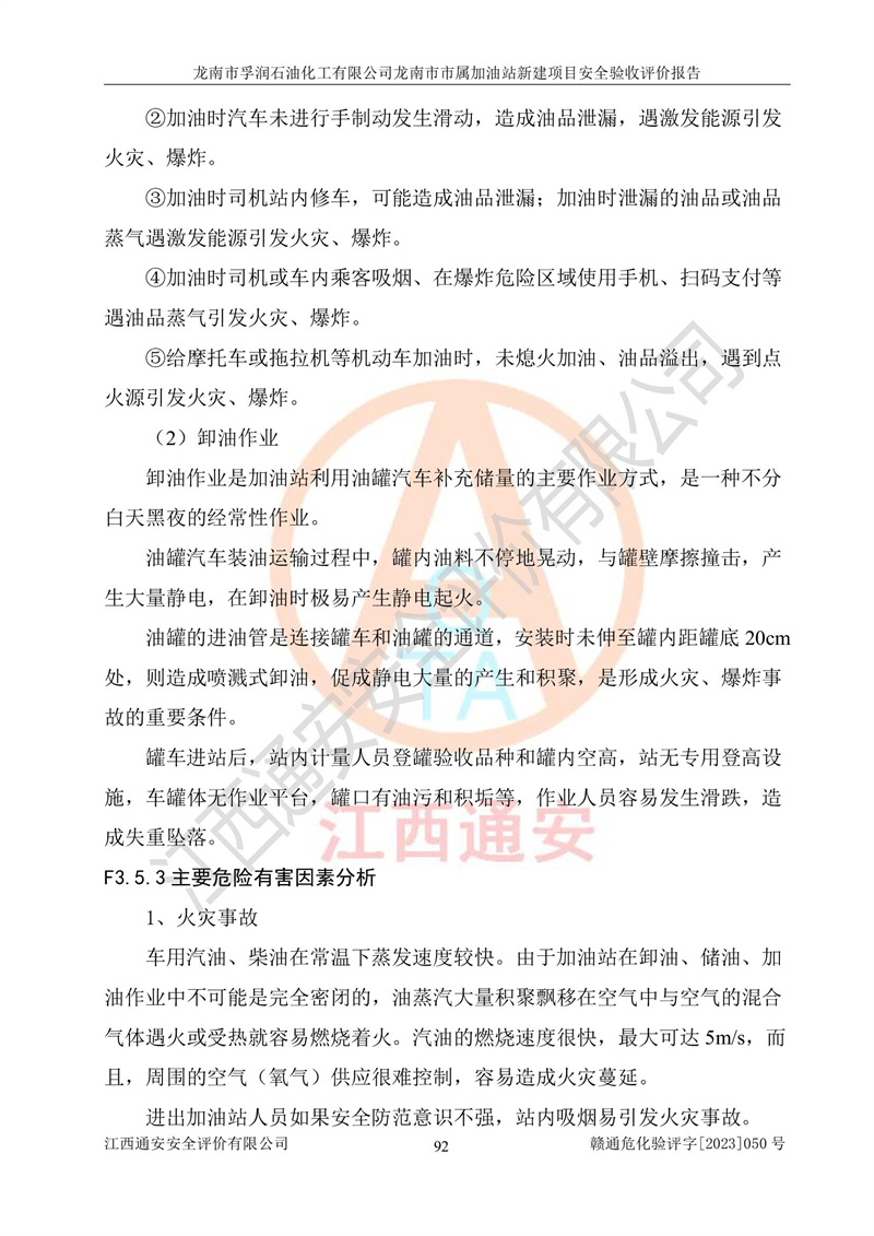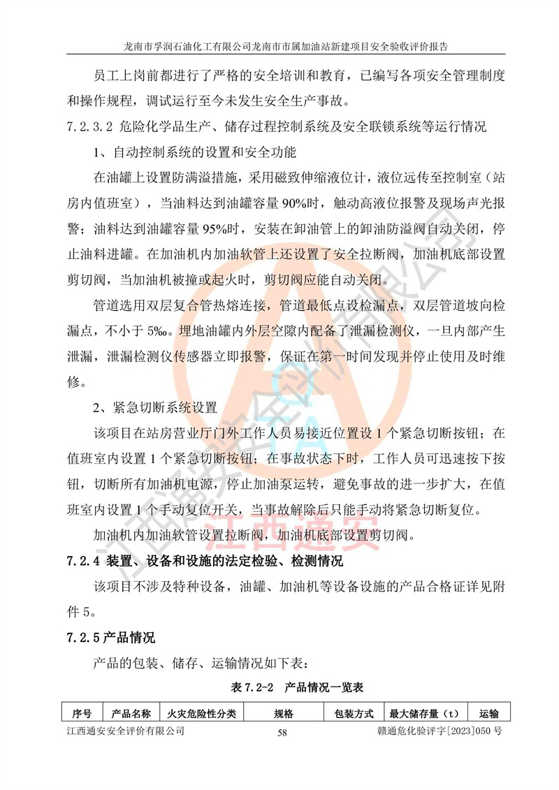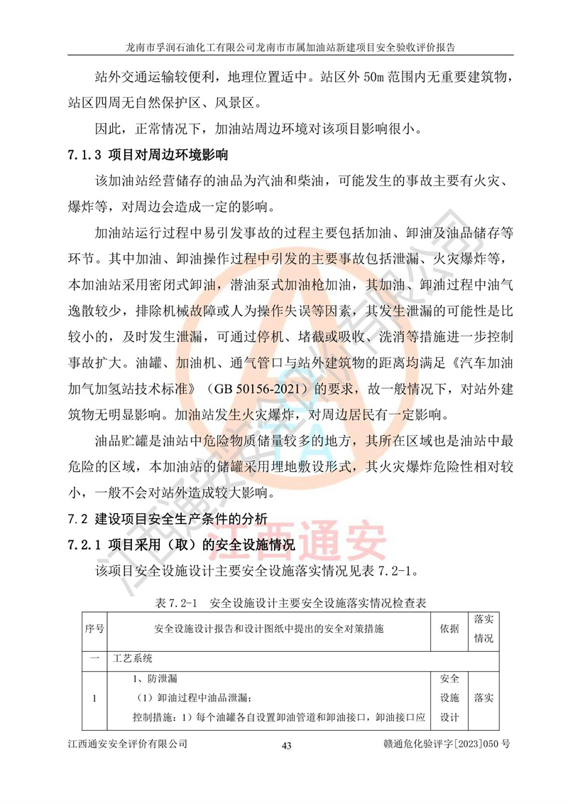 1、龙南市市属加油站新建项目为成品油零售企业,属于二级加油站,油罐区为主要危险源。该加油站不构成危险化学品重大危险源。 2、龙南市市属加油站新建项目所经营的汽油属于重点监管危险化学品,应加强安全管理,根据“汽油安全措施和应急处理原则”要求的措施进行检查,加油站设置了视频监控系统、具有液位报警功能的液位监测系统、渗漏检测,并制定各种管理制度和操作规程,已落实到位。 3、通过本报告分析,该项目投入经营后仍将面对多种危险因素,如火灾,爆炸、中毒、电气伤害、**伤害、噪声等危险有害因素。而项目*主要的危险、有害因素是火灾、爆炸,对此,加油站全体员工**保持**的安全防护意识。 4、项目公用工程能够满足安全经营的基本需要。 5、该加油站内部平面布置符合**和行业相关标准、规范的要求。建筑结构、消防、安全设施等布置明确、合理,符合各相关规范的要求。 6、加油站取得了雷电防护装置检测报告。 7、项目油罐、通气管口和加油机与外部环境的防火距离、平面布置、消防安全设施和措施满足法律法规、标准规范的要求。电气防爆保护、机械设备的安全保护等方面的安全设施建立**。 8、作业条件危险性评价结果:在选定的3个单元的危险程度为“一般危险、需要注意”或“稍有危险,可以接受”,且一般危险或稍有危险作业环境的出现均由物料的危险程度所决定,作业条件相对安全。 9、危险度评价结果:油罐区得分为17分,为Ⅰ级,属于**危险。加油站油罐安装高液位报警功能的液位监测系统,当油料达到油罐容量90%时,触动高液位报警装置,油料达到油罐容量95%时,自动停止油料继续进罐。同时,也采取了防止油品渗漏的保护措施,降低火灾爆炸危险,满足安全经营条件要求。 10、加油站建立了安全责任制,制定了安全管理制度、操作规程,编制了事故应急预案,配备了应急救援器材,按要求定期进行相关培训及演练。 11、该项目不涉及重大生产安全事故隐患,安全经营条件符合《危险化学品经营许可证管理办法》的要求。 龙南市孚润石油化工有限公司龙南市市属加油站新建项目具备**有关安全生产法律、法规、部门规章及标准规范要求的安全条件,符合经营和储存危险化学品(汽油、柴油)的安全条件要求,具备安全验收的条件。 |