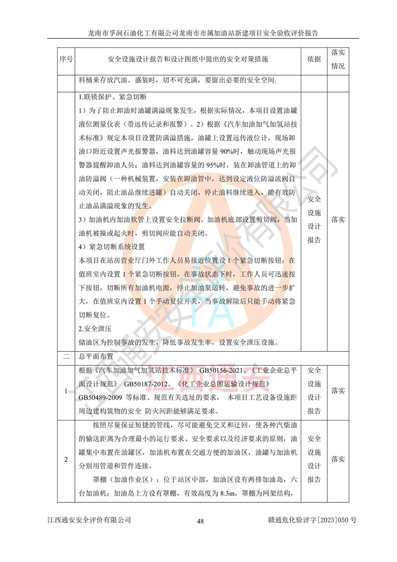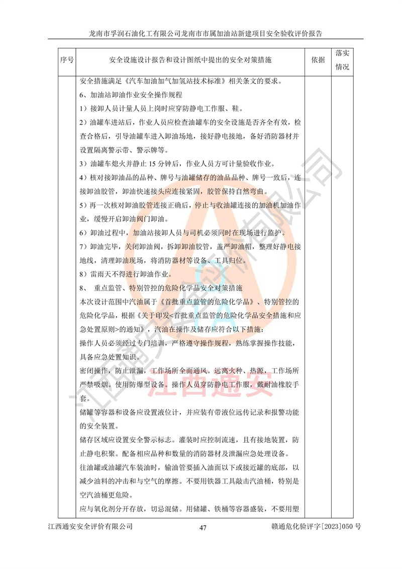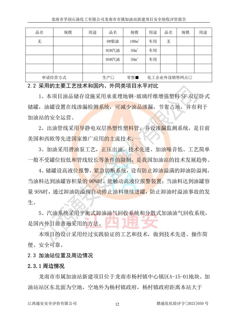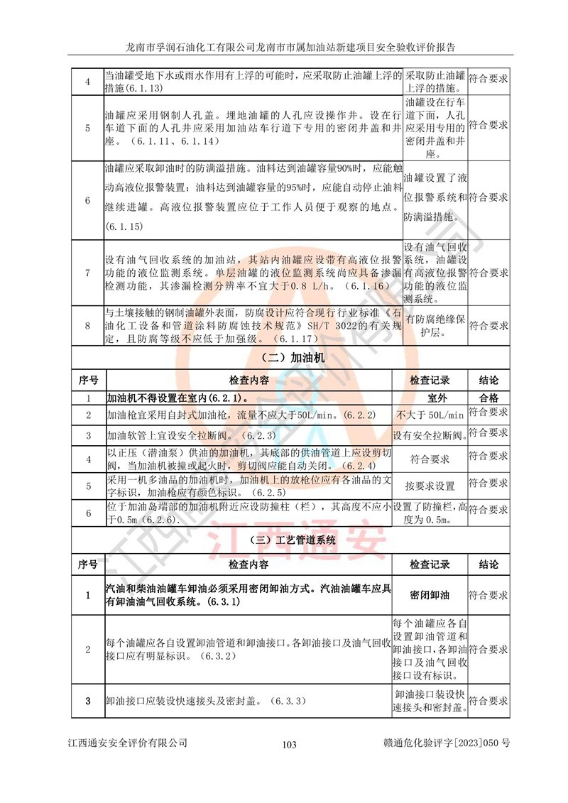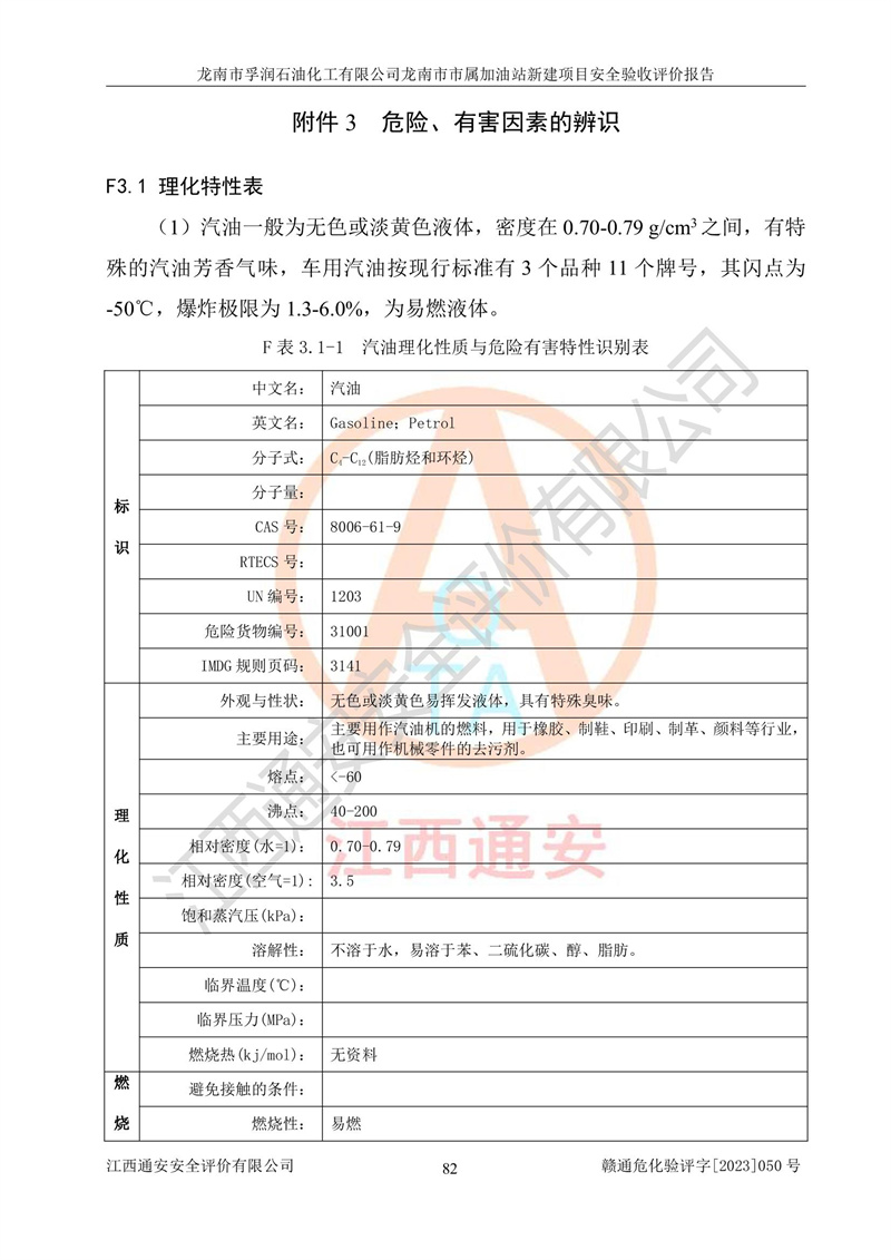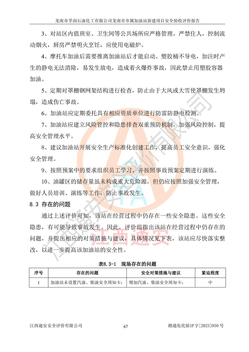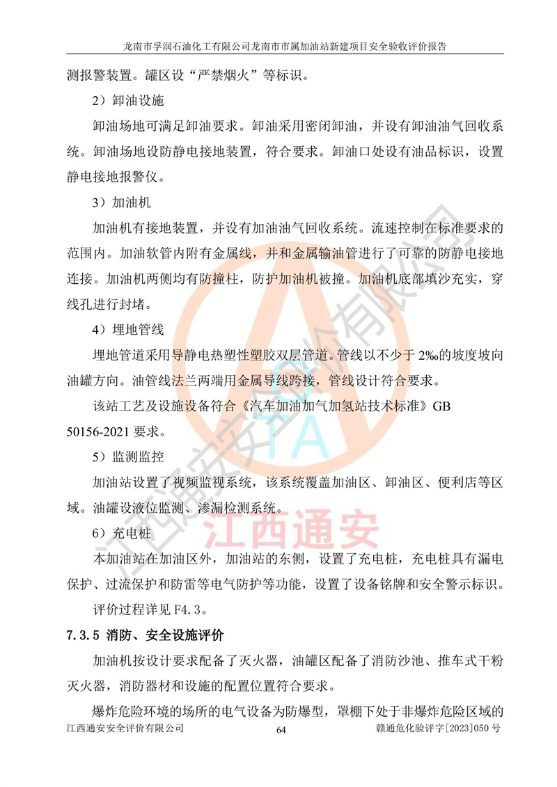 1、龙南市市属加油站新建项目为成品油零售企业,属于二级加油站,油罐区为主要危险源。该加油站不构成危险化学品重大危险源。 2、龙南市市属加油站新建项目所经营的汽油属于重点监管危险化学品,应加强安全管理,根据“汽油安全措施和应急处理原则”要求的措施进行检查,加油站设置了视频监控系统、具有液位报警功能的液位监测系统、渗漏检测,并制定各种管理制度和操作规程,已落实到位。 3、通过本报告分析,该项目投入经营后仍将面对多种危险因素,如火灾,爆炸、中毒、电气伤害、**伤害、噪声等危险有害因素。而项目*主要的危险、有害因素是火灾、爆炸,对此,加油站全体员工**保持**的安全防护意识。 4、项目公用工程能够满足安全经营的基本需要。 5、该加油站内部平面布置符合**和行业相关标准、规范的要求。建筑结构、消防、安全设施等布置明确、合理,符合各相关规范的要求。 6、加油站取得了雷电防护装置检测报告。 7、项目油罐、通气管口和加油机与外部环境的防火距离、平面布置、消防安全设施和措施满足法律法规、标准规范的要求。电气防爆保护、机械设备的安全保护等方面的安全设施建立**。 8、作业条件危险性评价结果:在选定的3个单元的危险程度为“一般危险、需要注意”或“稍有危险,可以接受”,且一般危险或稍有危险作业环境的出现均由物料的危险程度所决定,作业条件相对安全。 9、危险度评价结果:油罐区得分为17分,为Ⅰ级,属于**危险。加油站油罐安装高液位报警功能的液位监测系统,当油料达到油罐容量90%时,触动高液位报警装置,油料达到油罐容量95%时,自动停止油料继续进罐。同时,也采取了防止油品渗漏的保护措施,降低火灾爆炸危险,满足安全经营条件要求。 10、加油站建立了安全责任制,制定了安全管理制度、操作规程,编制了事故应急预案,配备了应急救援器材,按要求定期进行相关培训及演练。 11、该项目不涉及重大生产安全事故隐患,安全经营条件符合《危险化学品经营许可证管理办法》的要求。 龙南市孚润石油化工有限公司龙南市市属加油站新建项目具备**有关安全生产法律、法规、部门规章及标准规范要求的安全条件,符合经营和储存危险化学品(汽油、柴油)的安全条件要求,具备安全验收的条件。 |