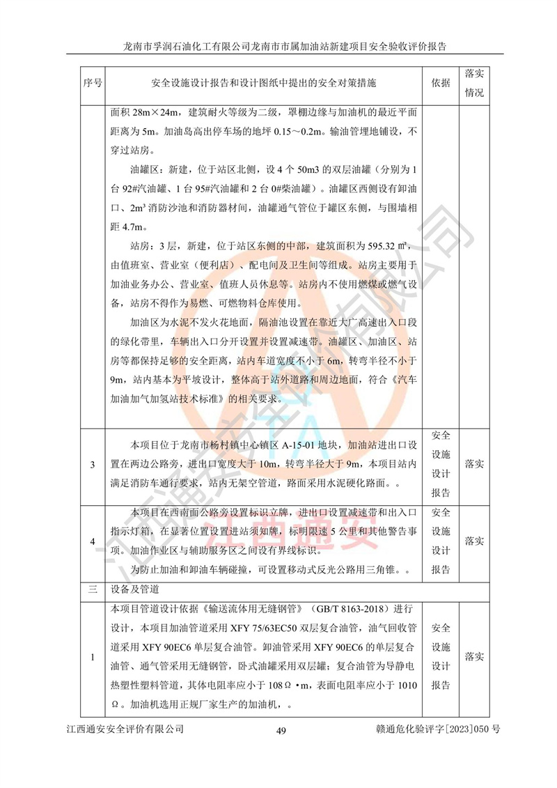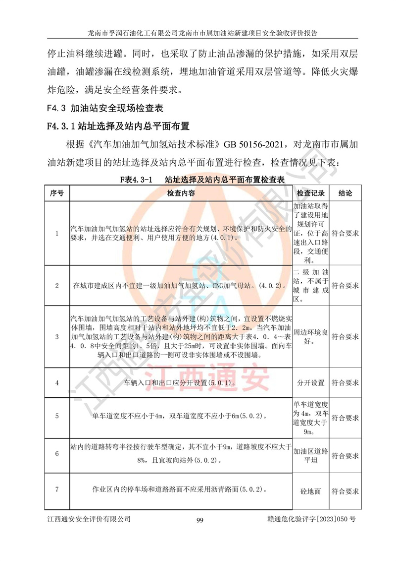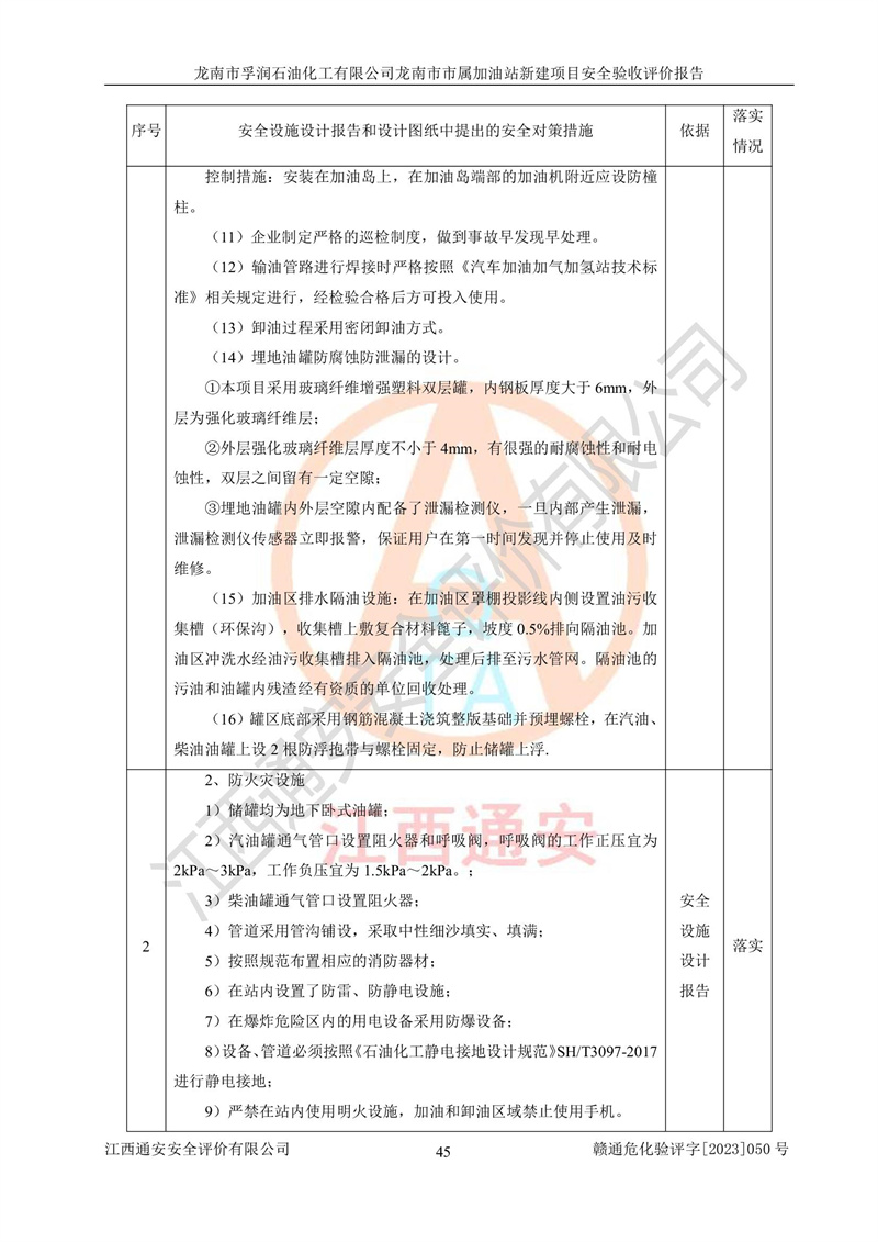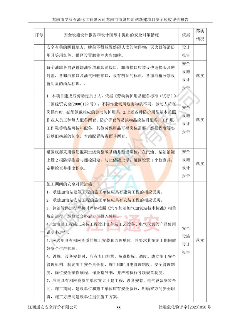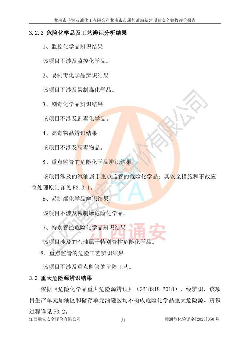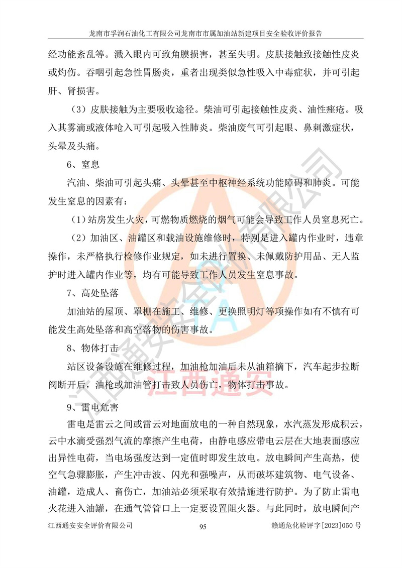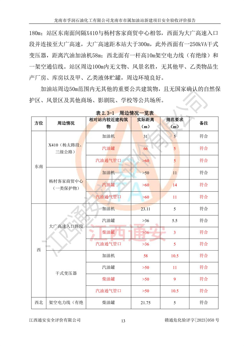 1、龙南市市属加油站新建项目为成品油零售企业,属于二级加油站,油罐区为主要危险源。该加油站不构成危险化学品重大危险源。 2、龙南市市属加油站新建项目所经营的汽油属于重点监管危险化学品,应加强安全管理,根据“汽油安全措施和应急处理原则”要求的措施进行检查,加油站设置了视频监控系统、具有液位报警功能的液位监测系统、渗漏检测,并制定各种管理制度和操作规程,已落实到位。 3、通过本报告分析,该项目投入经营后仍将面对多种危险因素,如火灾,爆炸、中毒、电气伤害、**伤害、噪声等危险有害因素。而项目*主要的危险、有害因素是火灾、爆炸,对此,加油站全体员工**保持**的安全防护意识。 4、项目公用工程能够满足安全经营的基本需要。 5、该加油站内部平面布置符合**和行业相关标准、规范的要求。建筑结构、消防、安全设施等布置明确、合理,符合各相关规范的要求。 6、加油站取得了雷电防护装置检测报告。 7、项目油罐、通气管口和加油机与外部环境的防火距离、平面布置、消防安全设施和措施满足法律法规、标准规范的要求。电气防爆保护、机械设备的安全保护等方面的安全设施建立**。 8、作业条件危险性评价结果:在选定的3个单元的危险程度为“一般危险、需要注意”或“稍有危险,可以接受”,且一般危险或稍有危险作业环境的出现均由物料的危险程度所决定,作业条件相对安全。 9、危险度评价结果:油罐区得分为17分,为Ⅰ级,属于**危险。加油站油罐安装高液位报警功能的液位监测系统,当油料达到油罐容量90%时,触动高液位报警装置,油料达到油罐容量95%时,自动停止油料继续进罐。同时,也采取了防止油品渗漏的保护措施,降低火灾爆炸危险,满足安全经营条件要求。 10、加油站建立了安全责任制,制定了安全管理制度、操作规程,编制了事故应急预案,配备了应急救援器材,按要求定期进行相关培训及演练。 11、该项目不涉及重大生产安全事故隐患,安全经营条件符合《危险化学品经营许可证管理办法》的要求。 龙南市孚润石油化工有限公司龙南市市属加油站新建项目具备**有关安全生产法律、法规、部门规章及标准规范要求的安全条件,符合经营和储存危险化学品(汽油、柴油)的安全条件要求,具备安全验收的条件。 |