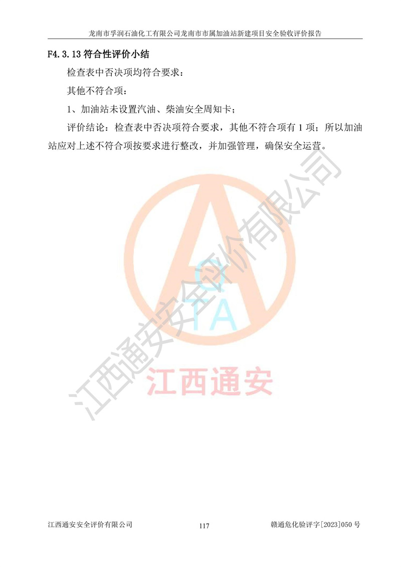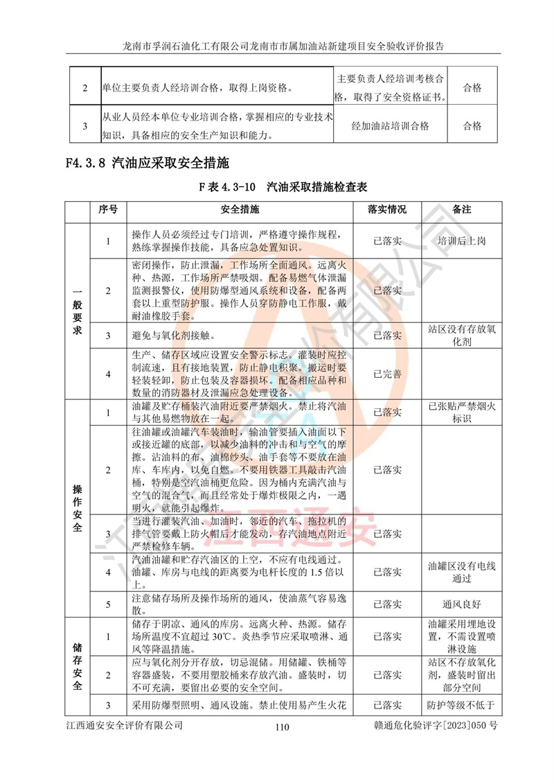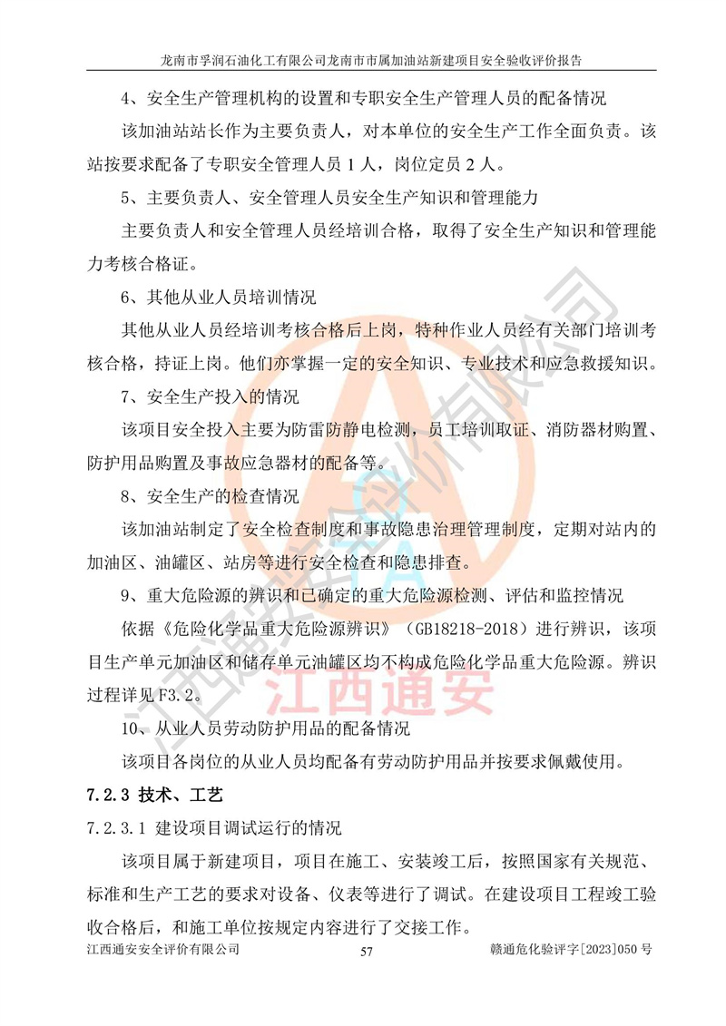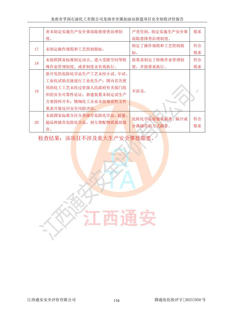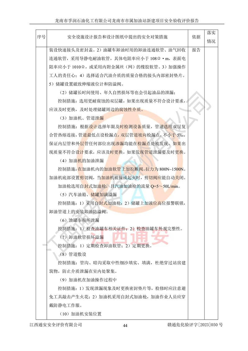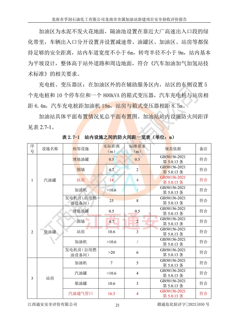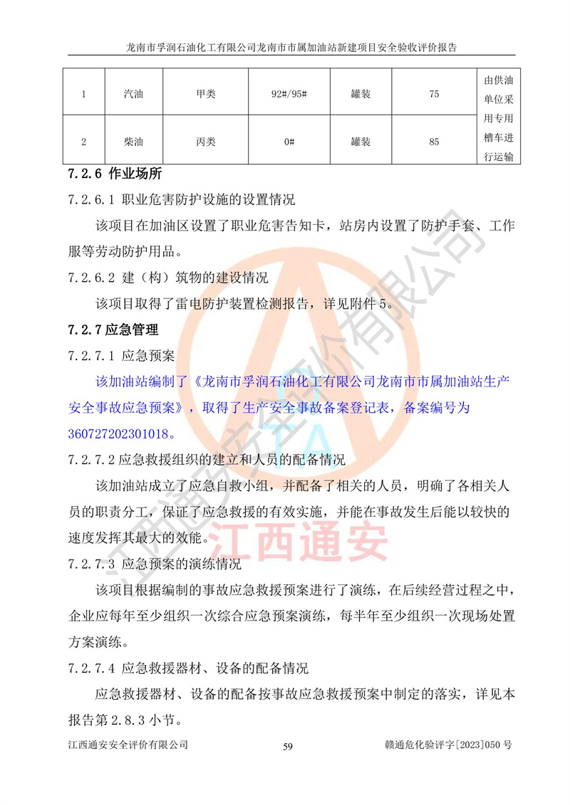 1、龙南市市属加油站新建项目为成品油零售企业,属于二级加油站,油罐区为主要危险源。该加油站不构成危险化学品重大危险源。 2、龙南市市属加油站新建项目所经营的汽油属于重点监管危险化学品,应加强安全管理,根据“汽油安全措施和应急处理原则”要求的措施进行检查,加油站设置了视频监控系统、具有液位报警功能的液位监测系统、渗漏检测,并制定各种管理制度和操作规程,已落实到位。 3、通过本报告分析,该项目投入经营后仍将面对多种危险因素,如火灾,爆炸、中毒、电气伤害、**伤害、噪声等危险有害因素。而项目*主要的危险、有害因素是火灾、爆炸,对此,加油站全体员工**保持**的安全防护意识。 4、项目公用工程能够满足安全经营的基本需要。 5、该加油站内部平面布置符合**和行业相关标准、规范的要求。建筑结构、消防、安全设施等布置明确、合理,符合各相关规范的要求。 6、加油站取得了雷电防护装置检测报告。 7、项目油罐、通气管口和加油机与外部环境的防火距离、平面布置、消防安全设施和措施满足法律法规、标准规范的要求。电气防爆保护、机械设备的安全保护等方面的安全设施建立**。 8、作业条件危险性评价结果:在选定的3个单元的危险程度为“一般危险、需要注意”或“稍有危险,可以接受”,且一般危险或稍有危险作业环境的出现均由物料的危险程度所决定,作业条件相对安全。 9、危险度评价结果:油罐区得分为17分,为Ⅰ级,属于**危险。加油站油罐安装高液位报警功能的液位监测系统,当油料达到油罐容量90%时,触动高液位报警装置,油料达到油罐容量95%时,自动停止油料继续进罐。同时,也采取了防止油品渗漏的保护措施,降低火灾爆炸危险,满足安全经营条件要求。 10、加油站建立了安全责任制,制定了安全管理制度、操作规程,编制了事故应急预案,配备了应急救援器材,按要求定期进行相关培训及演练。 11、该项目不涉及重大生产安全事故隐患,安全经营条件符合《危险化学品经营许可证管理办法》的要求。 龙南市孚润石油化工有限公司龙南市市属加油站新建项目具备**有关安全生产法律、法规、部门规章及标准规范要求的安全条件,符合经营和储存危险化学品(汽油、柴油)的安全条件要求,具备安全验收的条件。 |