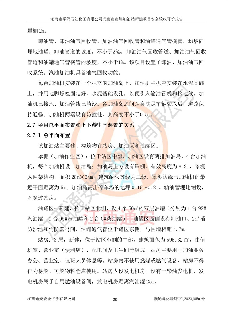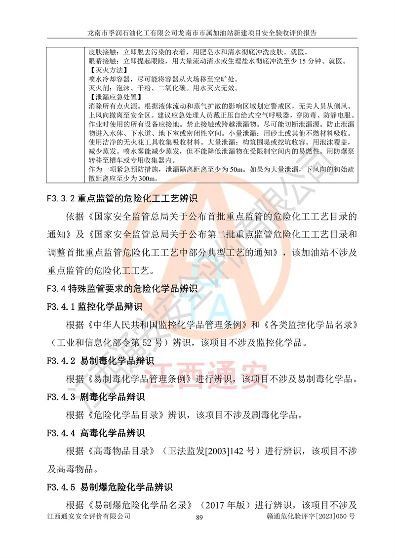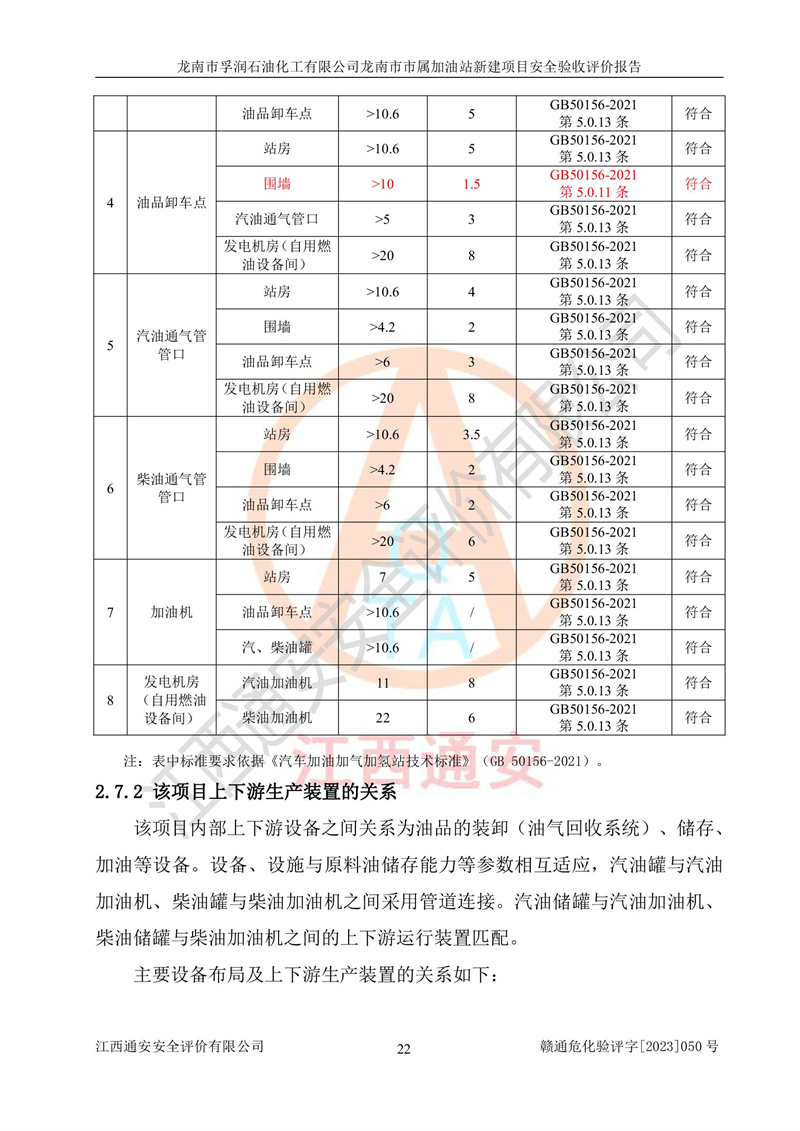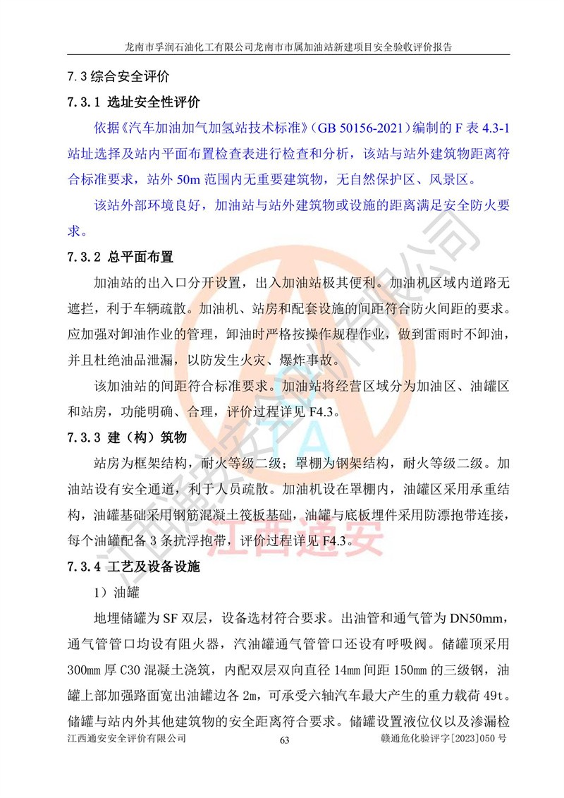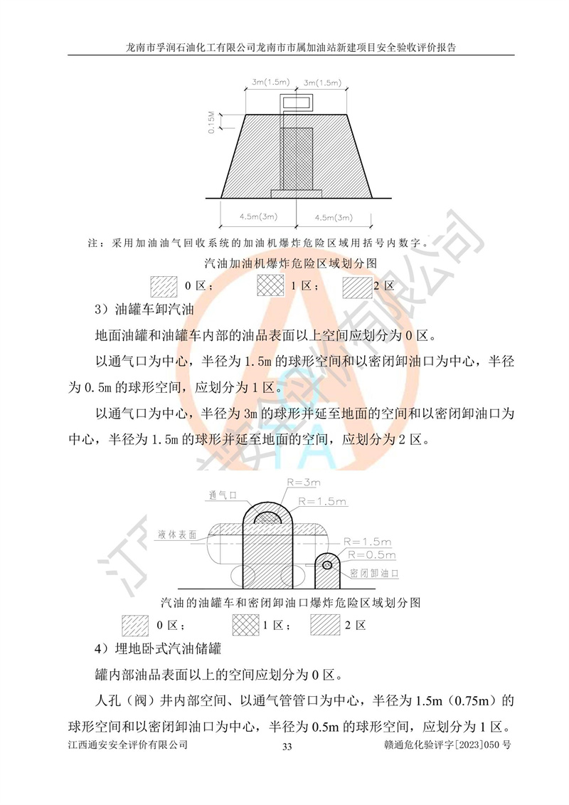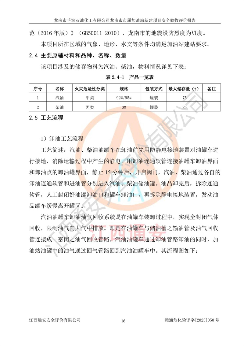 1、龙南市市属加油站新建项目为成品油零售企业,属于二级加油站,油罐区为主要危险源。该加油站不构成危险化学品重大危险源。 2、龙南市市属加油站新建项目所经营的汽油属于重点监管危险化学品,应加强安全管理,根据“汽油安全措施和应急处理原则”要求的措施进行检查,加油站设置了视频监控系统、具有液位报警功能的液位监测系统、渗漏检测,并制定各种管理制度和操作规程,已落实到位。 3、通过本报告分析,该项目投入经营后仍将面对多种危险因素,如火灾,爆炸、中毒、电气伤害、**伤害、噪声等危险有害因素。而项目*主要的危险、有害因素是火灾、爆炸,对此,加油站全体员工**保持**的安全防护意识。 4、项目公用工程能够满足安全经营的基本需要。 5、该加油站内部平面布置符合**和行业相关标准、规范的要求。建筑结构、消防、安全设施等布置明确、合理,符合各相关规范的要求。 6、加油站取得了雷电防护装置检测报告。 7、项目油罐、通气管口和加油机与外部环境的防火距离、平面布置、消防安全设施和措施满足法律法规、标准规范的要求。电气防爆保护、机械设备的安全保护等方面的安全设施建立**。 8、作业条件危险性评价结果:在选定的3个单元的危险程度为“一般危险、需要注意”或“稍有危险,可以接受”,且一般危险或稍有危险作业环境的出现均由物料的危险程度所决定,作业条件相对安全。 9、危险度评价结果:油罐区得分为17分,为Ⅰ级,属于**危险。加油站油罐安装高液位报警功能的液位监测系统,当油料达到油罐容量90%时,触动高液位报警装置,油料达到油罐容量95%时,自动停止油料继续进罐。同时,也采取了防止油品渗漏的保护措施,降低火灾爆炸危险,满足安全经营条件要求。 10、加油站建立了安全责任制,制定了安全管理制度、操作规程,编制了事故应急预案,配备了应急救援器材,按要求定期进行相关培训及演练。 11、该项目不涉及重大生产安全事故隐患,安全经营条件符合《危险化学品经营许可证管理办法》的要求。 龙南市孚润石油化工有限公司龙南市市属加油站新建项目具备**有关安全生产法律、法规、部门规章及标准规范要求的安全条件,符合经营和储存危险化学品(汽油、柴油)的安全条件要求,具备安全验收的条件。 |