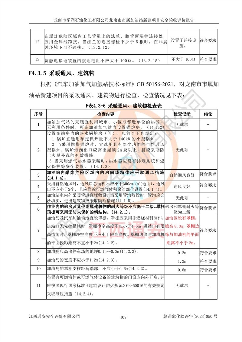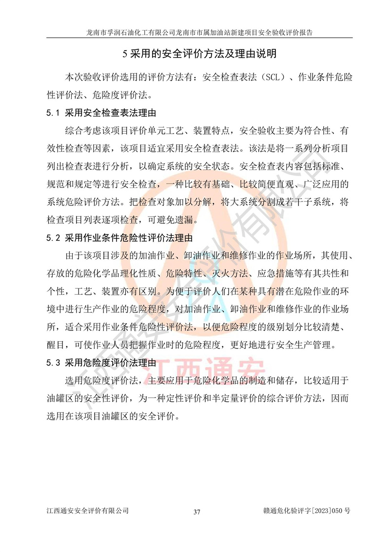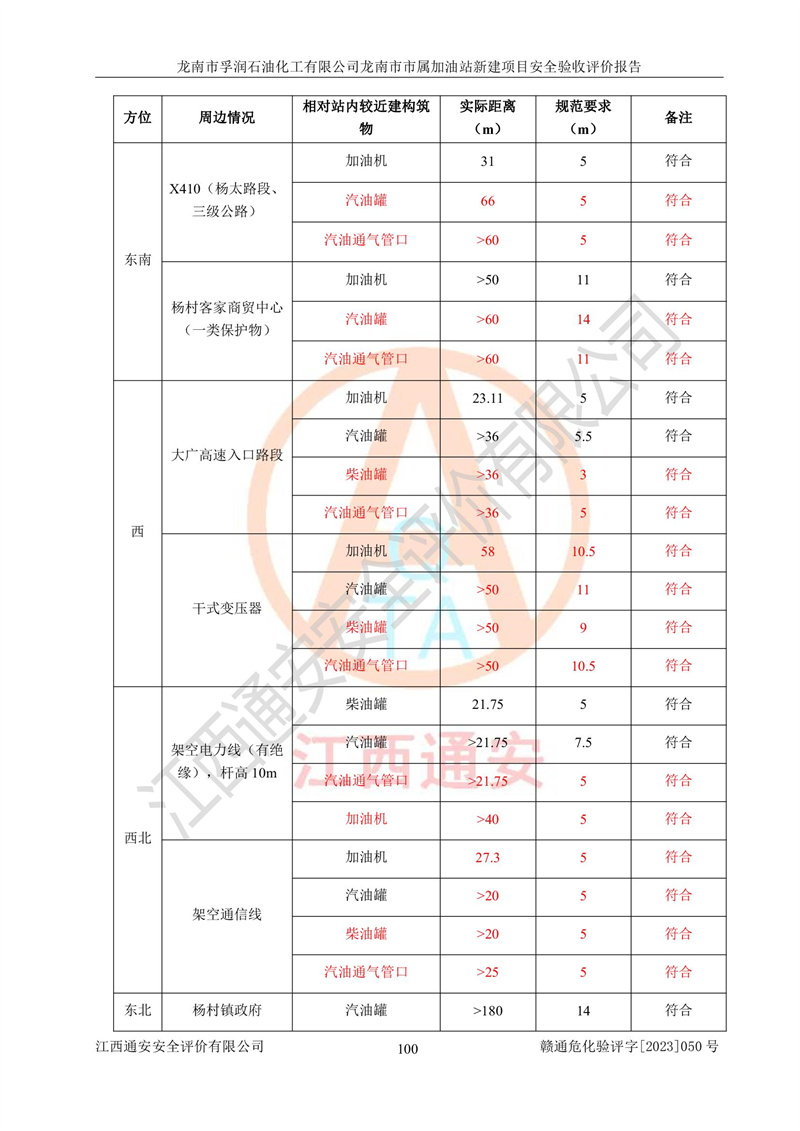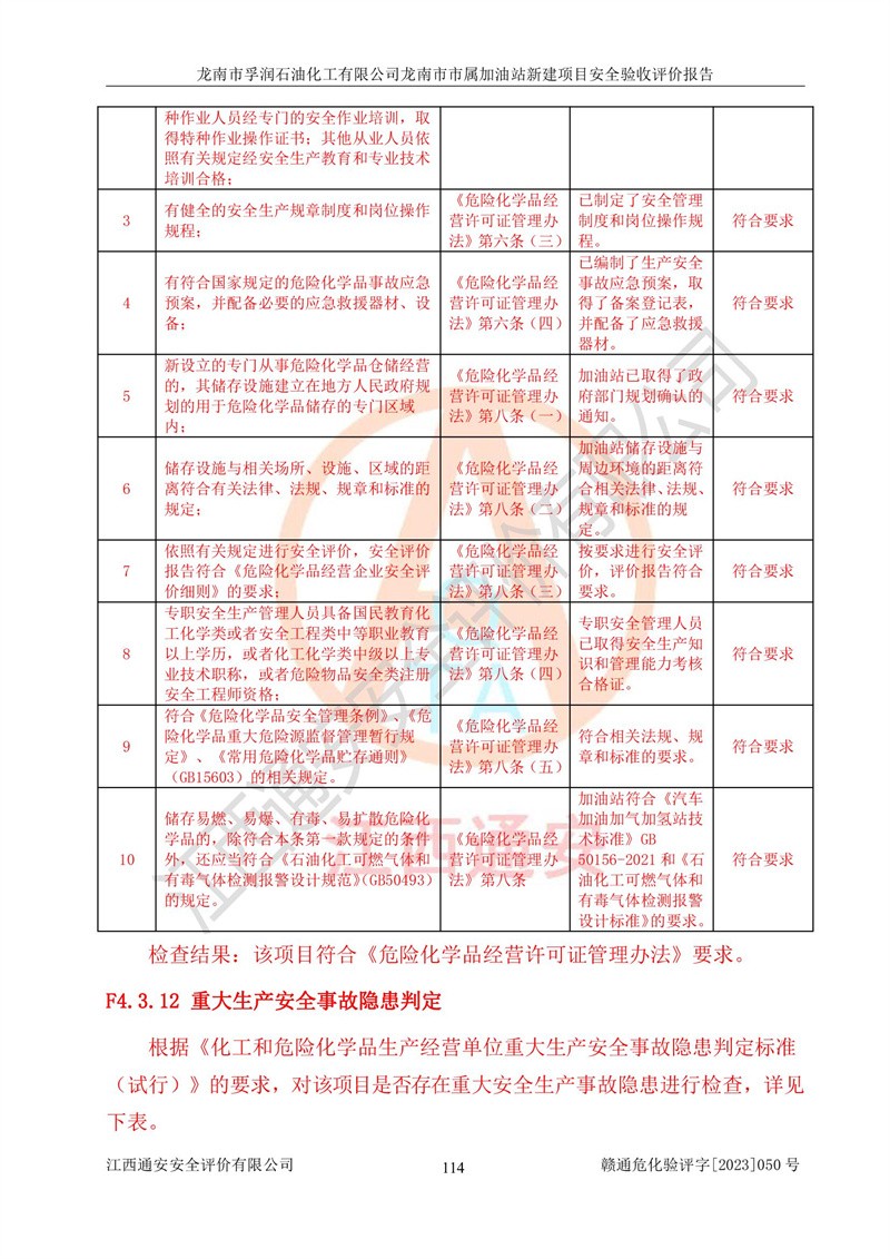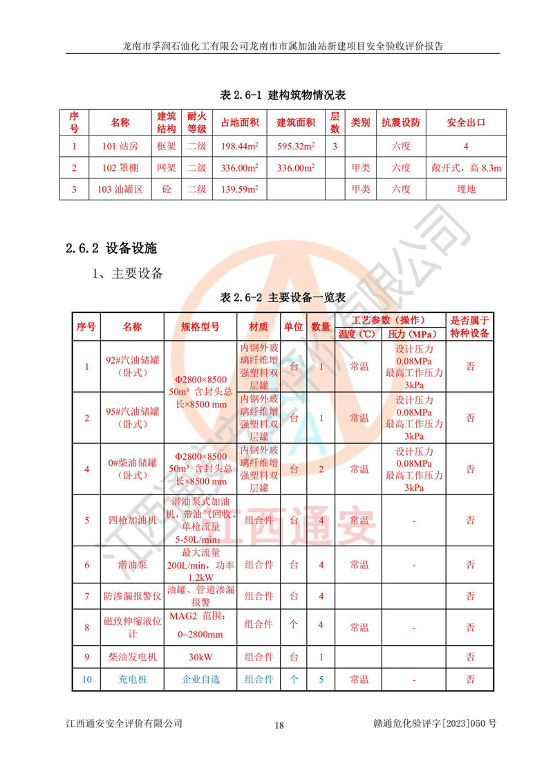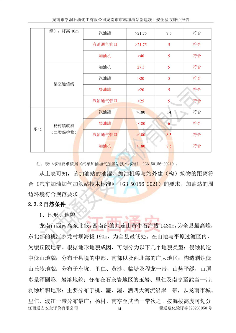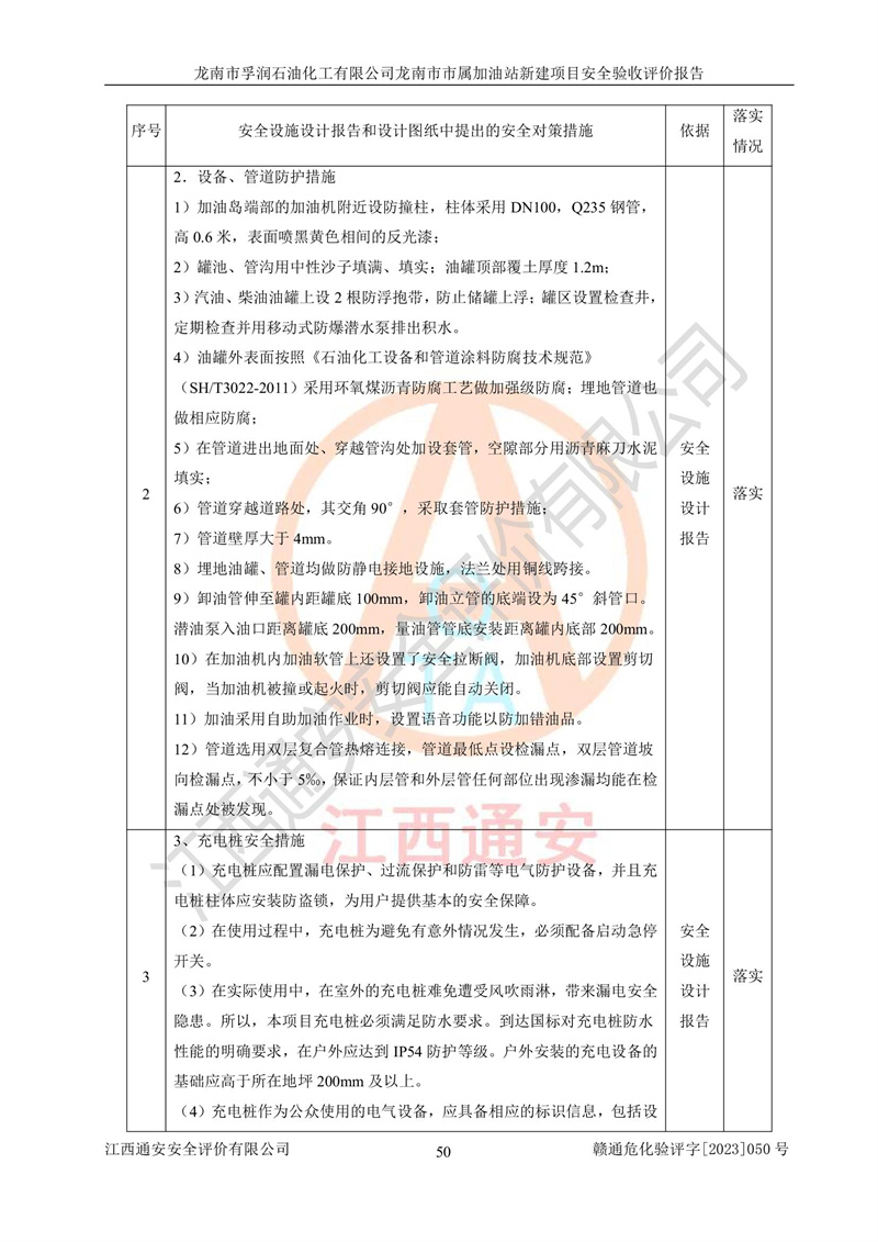 1、龙南市市属加油站新建项目为成品油零售企业,属于二级加油站,油罐区为主要危险源。该加油站不构成危险化学品重大危险源。 2、龙南市市属加油站新建项目所经营的汽油属于重点监管危险化学品,应加强安全管理,根据“汽油安全措施和应急处理原则”要求的措施进行检查,加油站设置了视频监控系统、具有液位报警功能的液位监测系统、渗漏检测,并制定各种管理制度和操作规程,已落实到位。 3、通过本报告分析,该项目投入经营后仍将面对多种危险因素,如火灾,爆炸、中毒、电气伤害、**伤害、噪声等危险有害因素。而项目*主要的危险、有害因素是火灾、爆炸,对此,加油站全体员工**保持**的安全防护意识。 4、项目公用工程能够满足安全经营的基本需要。 5、该加油站内部平面布置符合**和行业相关标准、规范的要求。建筑结构、消防、安全设施等布置明确、合理,符合各相关规范的要求。 6、加油站取得了雷电防护装置检测报告。 7、项目油罐、通气管口和加油机与外部环境的防火距离、平面布置、消防安全设施和措施满足法律法规、标准规范的要求。电气防爆保护、机械设备的安全保护等方面的安全设施建立**。 8、作业条件危险性评价结果:在选定的3个单元的危险程度为“一般危险、需要注意”或“稍有危险,可以接受”,且一般危险或稍有危险作业环境的出现均由物料的危险程度所决定,作业条件相对安全。 9、危险度评价结果:油罐区得分为17分,为Ⅰ级,属于**危险。加油站油罐安装高液位报警功能的液位监测系统,当油料达到油罐容量90%时,触动高液位报警装置,油料达到油罐容量95%时,自动停止油料继续进罐。同时,也采取了防止油品渗漏的保护措施,降低火灾爆炸危险,满足安全经营条件要求。 10、加油站建立了安全责任制,制定了安全管理制度、操作规程,编制了事故应急预案,配备了应急救援器材,按要求定期进行相关培训及演练。 11、该项目不涉及重大生产安全事故隐患,安全经营条件符合《危险化学品经营许可证管理办法》的要求。 龙南市孚润石油化工有限公司龙南市市属加油站新建项目具备**有关安全生产法律、法规、部门规章及标准规范要求的安全条件,符合经营和储存危险化学品(汽油、柴油)的安全条件要求,具备安全验收的条件。 |