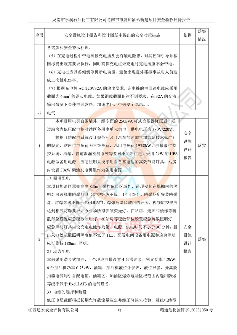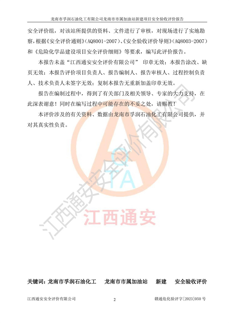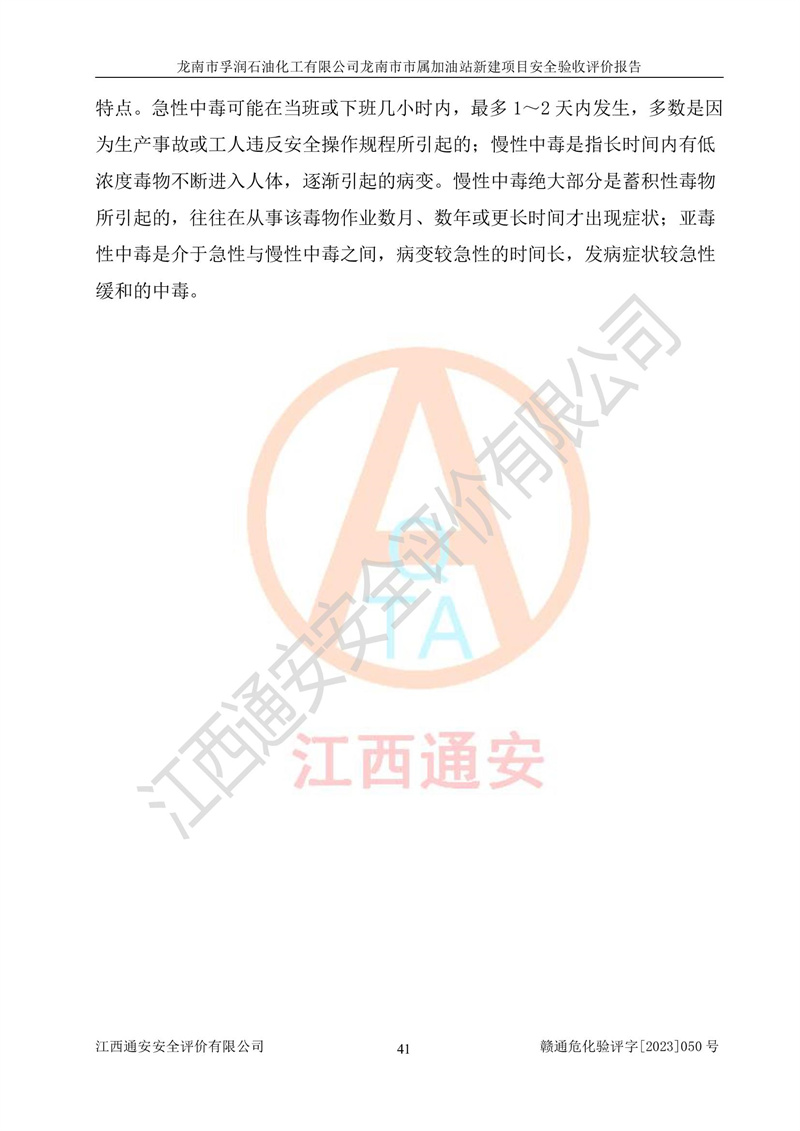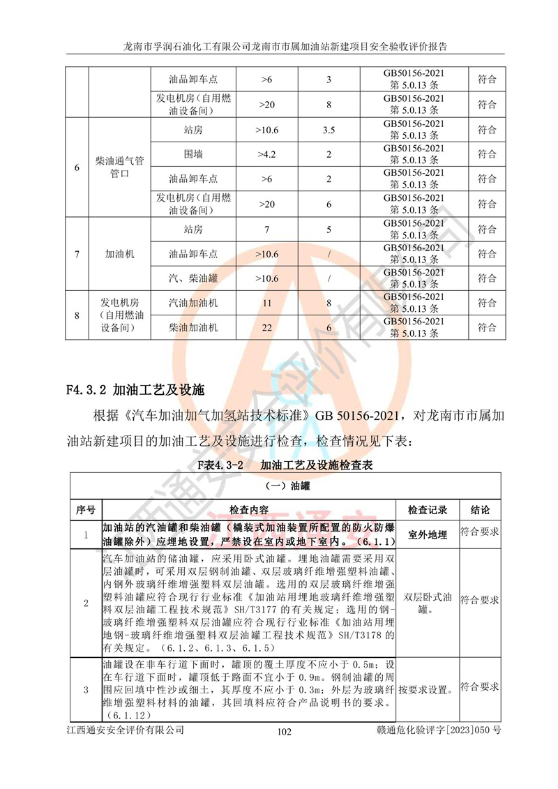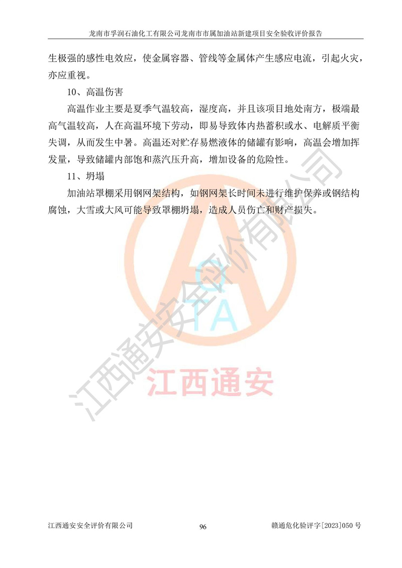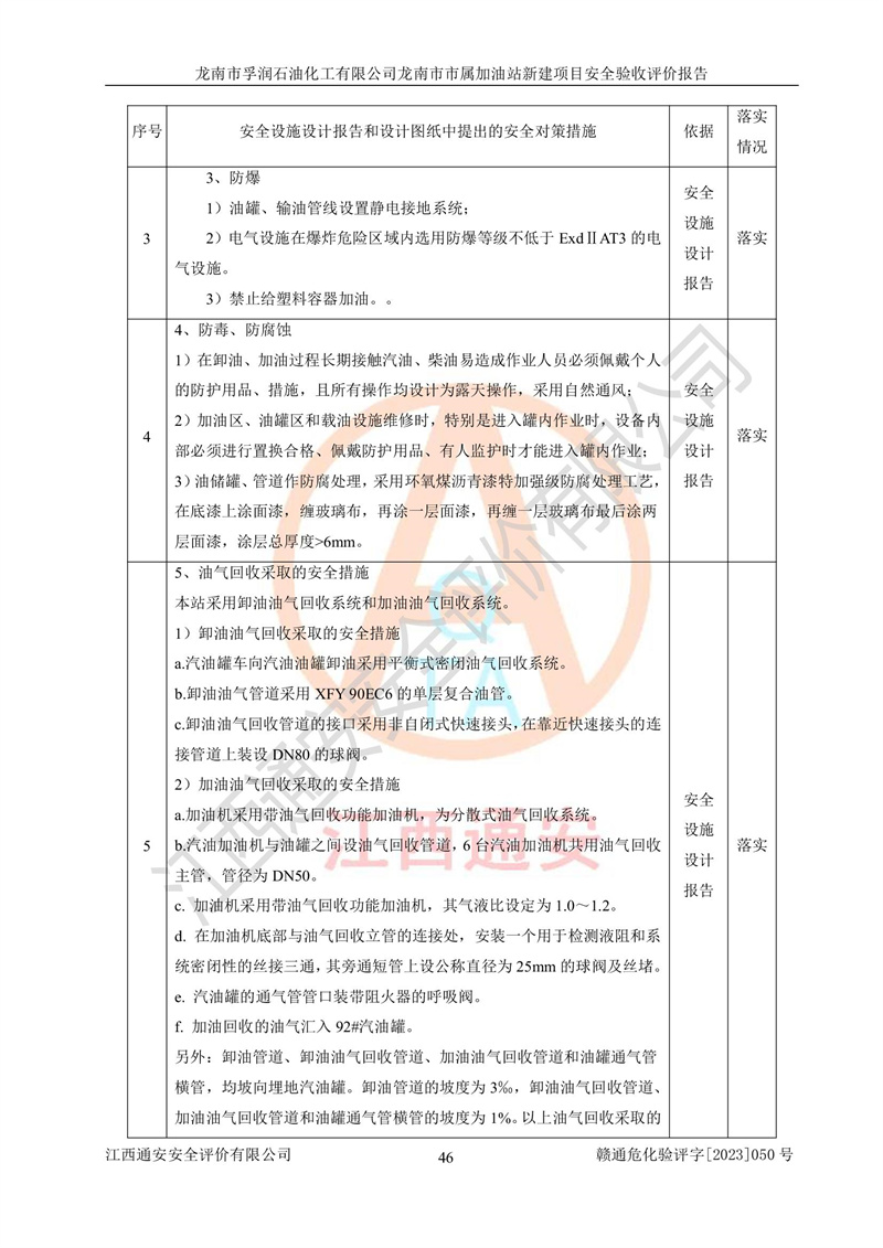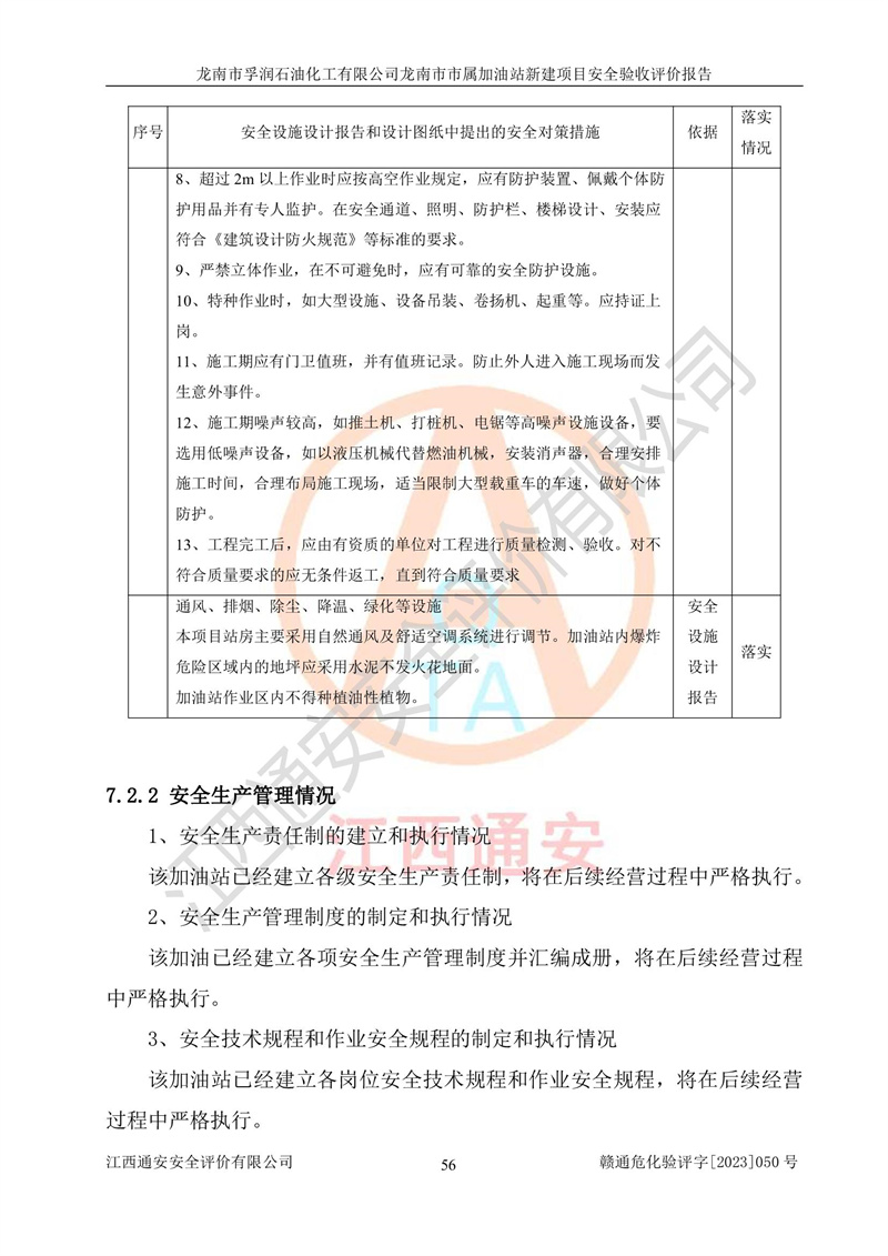 1、龙南市市属加油站新建项目为成品油零售企业,属于二级加油站,油罐区为主要危险源。该加油站不构成危险化学品重大危险源。 2、龙南市市属加油站新建项目所经营的汽油属于重点监管危险化学品,应加强安全管理,根据“汽油安全措施和应急处理原则”要求的措施进行检查,加油站设置了视频监控系统、具有液位报警功能的液位监测系统、渗漏检测,并制定各种管理制度和操作规程,已落实到位。 3、通过本报告分析,该项目投入经营后仍将面对多种危险因素,如火灾,爆炸、中毒、电气伤害、**伤害、噪声等危险有害因素。而项目*主要的危险、有害因素是火灾、爆炸,对此,加油站全体员工**保持**的安全防护意识。 4、项目公用工程能够满足安全经营的基本需要。 5、该加油站内部平面布置符合**和行业相关标准、规范的要求。建筑结构、消防、安全设施等布置明确、合理,符合各相关规范的要求。 6、加油站取得了雷电防护装置检测报告。 7、项目油罐、通气管口和加油机与外部环境的防火距离、平面布置、消防安全设施和措施满足法律法规、标准规范的要求。电气防爆保护、机械设备的安全保护等方面的安全设施建立**。 8、作业条件危险性评价结果:在选定的3个单元的危险程度为“一般危险、需要注意”或“稍有危险,可以接受”,且一般危险或稍有危险作业环境的出现均由物料的危险程度所决定,作业条件相对安全。 9、危险度评价结果:油罐区得分为17分,为Ⅰ级,属于**危险。加油站油罐安装高液位报警功能的液位监测系统,当油料达到油罐容量90%时,触动高液位报警装置,油料达到油罐容量95%时,自动停止油料继续进罐。同时,也采取了防止油品渗漏的保护措施,降低火灾爆炸危险,满足安全经营条件要求。 10、加油站建立了安全责任制,制定了安全管理制度、操作规程,编制了事故应急预案,配备了应急救援器材,按要求定期进行相关培训及演练。 11、该项目不涉及重大生产安全事故隐患,安全经营条件符合《危险化学品经营许可证管理办法》的要求。 龙南市孚润石油化工有限公司龙南市市属加油站新建项目具备**有关安全生产法律、法规、部门规章及标准规范要求的安全条件,符合经营和储存危险化学品(汽油、柴油)的安全条件要求,具备安全验收的条件。 |