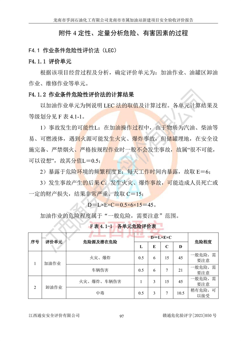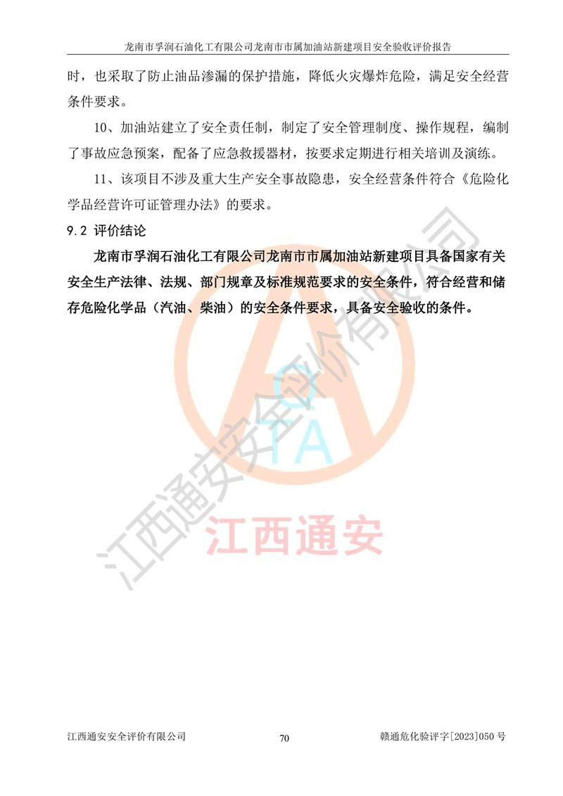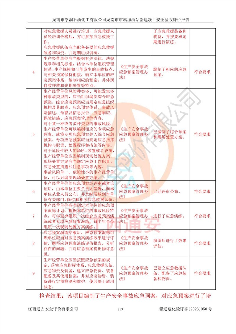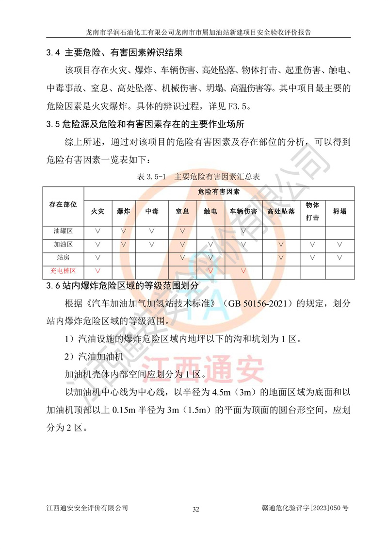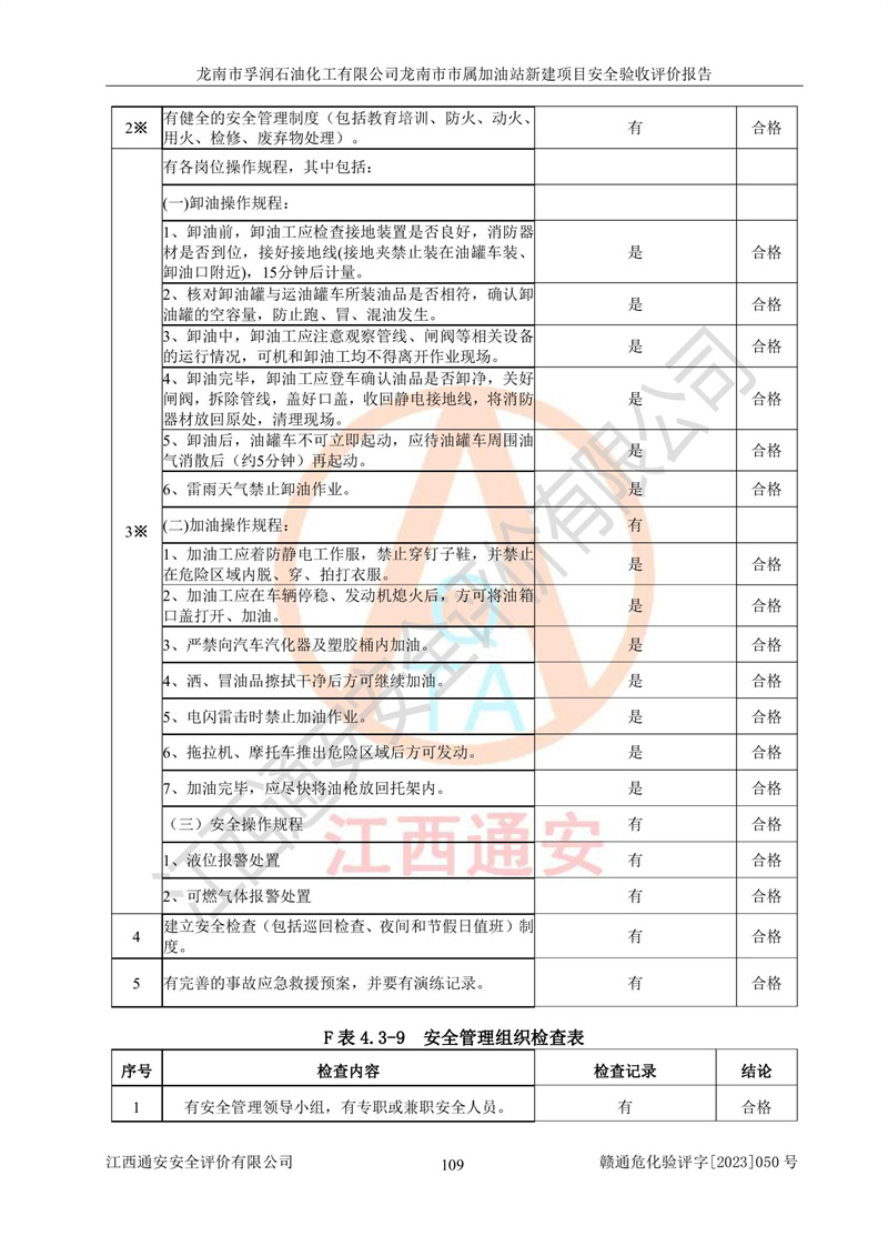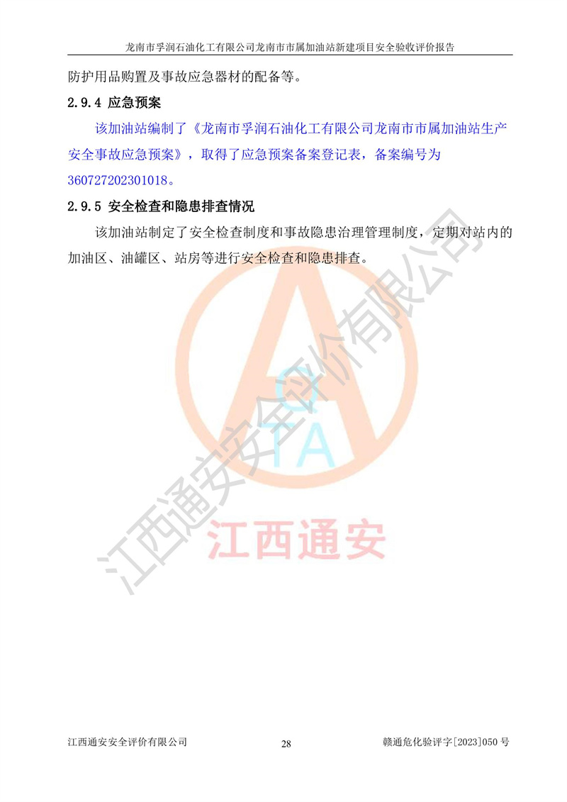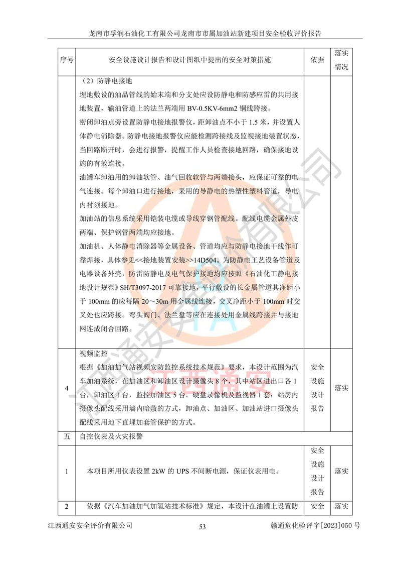 1、龙南市市属加油站新建项目为成品油零售企业,属于二级加油站,油罐区为主要危险源。该加油站不构成危险化学品重大危险源。 2、龙南市市属加油站新建项目所经营的汽油属于重点监管危险化学品,应加强安全管理,根据“汽油安全措施和应急处理原则”要求的措施进行检查,加油站设置了视频监控系统、具有液位报警功能的液位监测系统、渗漏检测,并制定各种管理制度和操作规程,已落实到位。 3、通过本报告分析,该项目投入经营后仍将面对多种危险因素,如火灾,爆炸、中毒、电气伤害、**伤害、噪声等危险有害因素。而项目*主要的危险、有害因素是火灾、爆炸,对此,加油站全体员工**保持**的安全防护意识。 4、项目公用工程能够满足安全经营的基本需要。 5、该加油站内部平面布置符合**和行业相关标准、规范的要求。建筑结构、消防、安全设施等布置明确、合理,符合各相关规范的要求。 6、加油站取得了雷电防护装置检测报告。 7、项目油罐、通气管口和加油机与外部环境的防火距离、平面布置、消防安全设施和措施满足法律法规、标准规范的要求。电气防爆保护、机械设备的安全保护等方面的安全设施建立**。 8、作业条件危险性评价结果:在选定的3个单元的危险程度为“一般危险、需要注意”或“稍有危险,可以接受”,且一般危险或稍有危险作业环境的出现均由物料的危险程度所决定,作业条件相对安全。 9、危险度评价结果:油罐区得分为17分,为Ⅰ级,属于**危险。加油站油罐安装高液位报警功能的液位监测系统,当油料达到油罐容量90%时,触动高液位报警装置,油料达到油罐容量95%时,自动停止油料继续进罐。同时,也采取了防止油品渗漏的保护措施,降低火灾爆炸危险,满足安全经营条件要求。 10、加油站建立了安全责任制,制定了安全管理制度、操作规程,编制了事故应急预案,配备了应急救援器材,按要求定期进行相关培训及演练。 11、该项目不涉及重大生产安全事故隐患,安全经营条件符合《危险化学品经营许可证管理办法》的要求。 龙南市孚润石油化工有限公司龙南市市属加油站新建项目具备**有关安全生产法律、法规、部门规章及标准规范要求的安全条件,符合经营和储存危险化学品(汽油、柴油)的安全条件要求,具备安全验收的条件。 |