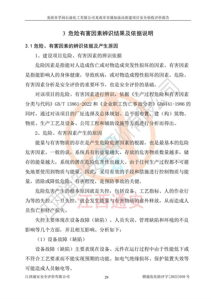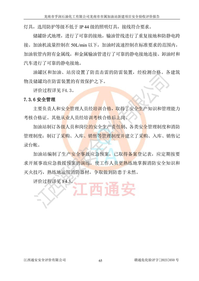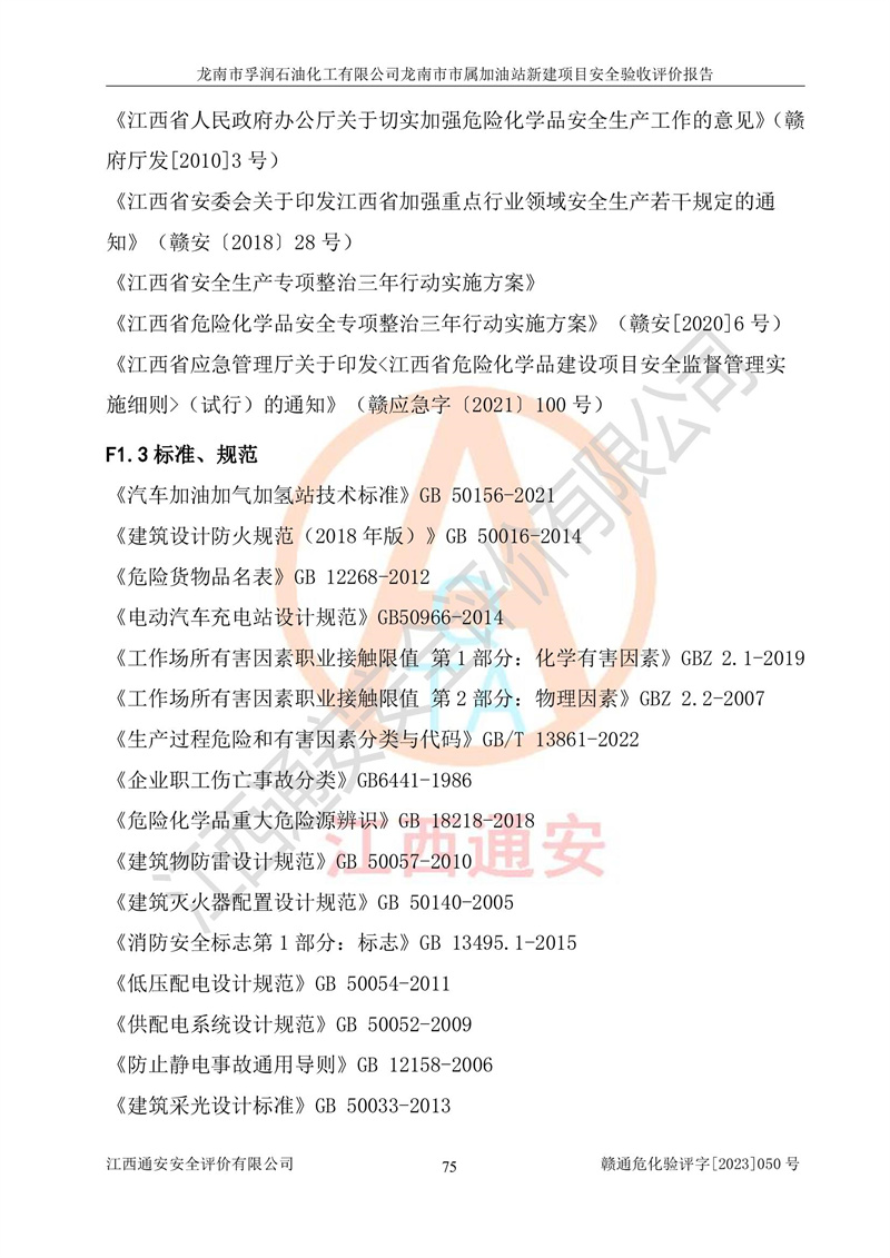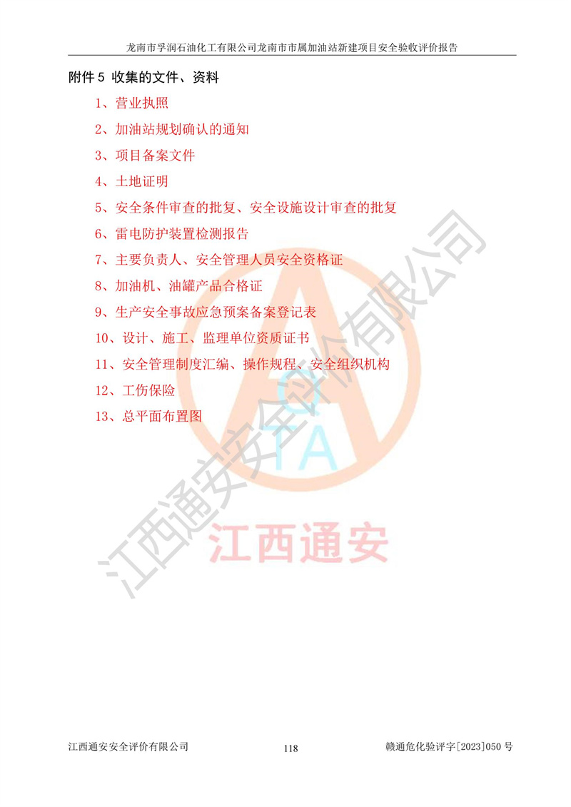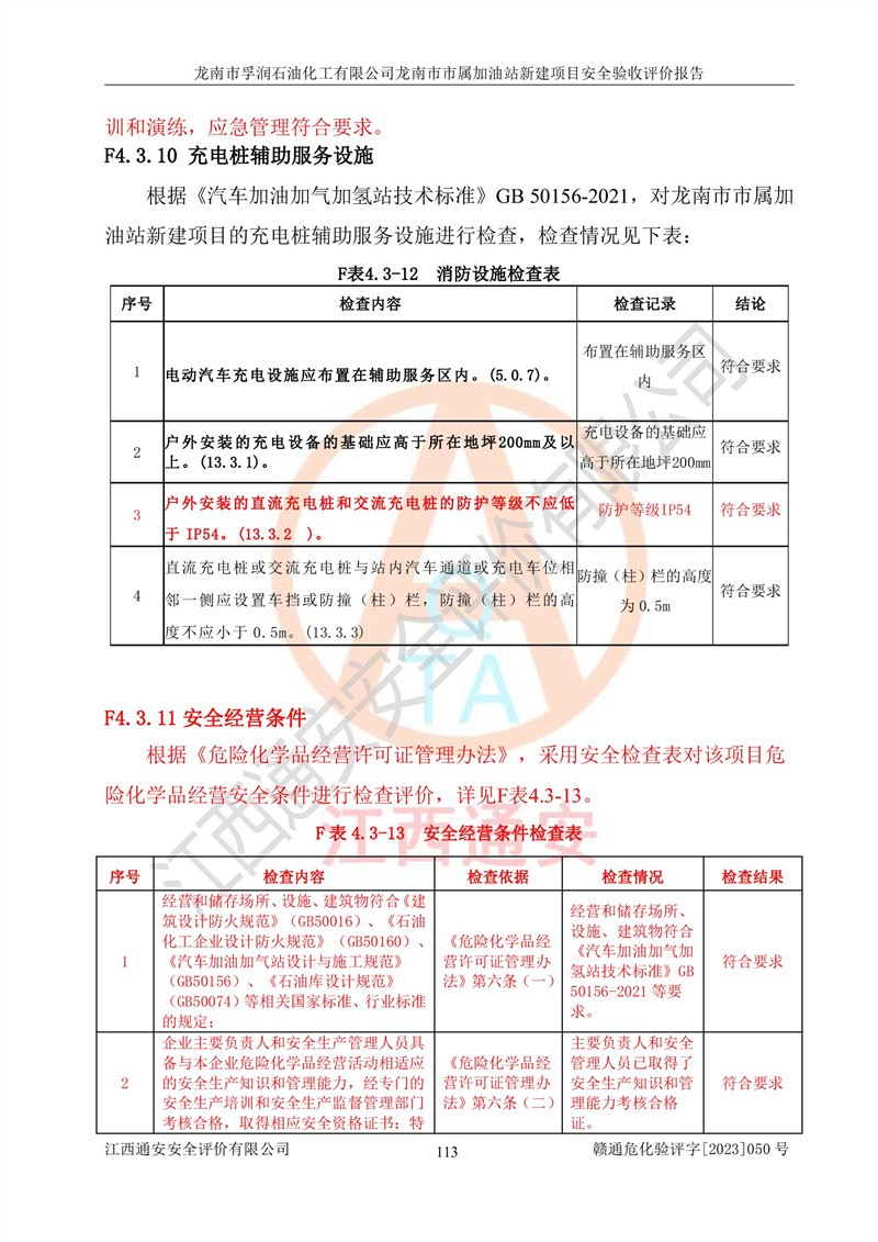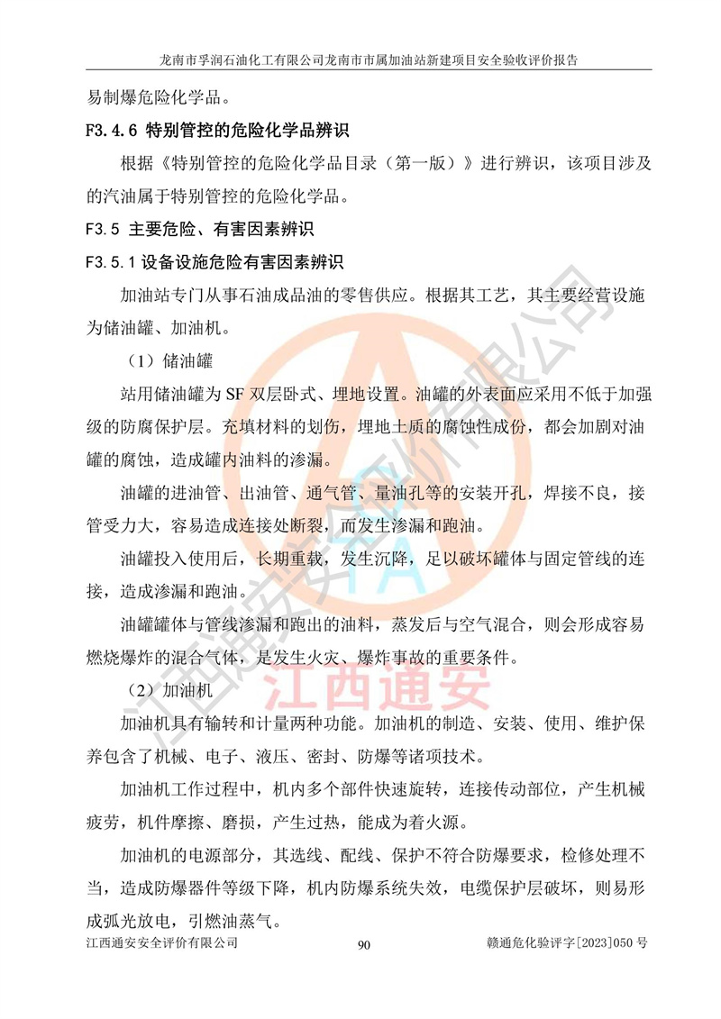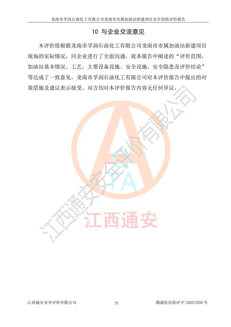 1、龙南市市属加油站新建项目为成品油零售企业,属于二级加油站,油罐区为主要危险源。该加油站不构成危险化学品重大危险源。 2、龙南市市属加油站新建项目所经营的汽油属于重点监管危险化学品,应加强安全管理,根据“汽油安全措施和应急处理原则”要求的措施进行检查,加油站设置了视频监控系统、具有液位报警功能的液位监测系统、渗漏检测,并制定各种管理制度和操作规程,已落实到位。 3、通过本报告分析,该项目投入经营后仍将面对多种危险因素,如火灾,爆炸、中毒、电气伤害、**伤害、噪声等危险有害因素。而项目*主要的危险、有害因素是火灾、爆炸,对此,加油站全体员工**保持**的安全防护意识。 4、项目公用工程能够满足安全经营的基本需要。 5、该加油站内部平面布置符合**和行业相关标准、规范的要求。建筑结构、消防、安全设施等布置明确、合理,符合各相关规范的要求。 6、加油站取得了雷电防护装置检测报告。 7、项目油罐、通气管口和加油机与外部环境的防火距离、平面布置、消防安全设施和措施满足法律法规、标准规范的要求。电气防爆保护、机械设备的安全保护等方面的安全设施建立**。 8、作业条件危险性评价结果:在选定的3个单元的危险程度为“一般危险、需要注意”或“稍有危险,可以接受”,且一般危险或稍有危险作业环境的出现均由物料的危险程度所决定,作业条件相对安全。 9、危险度评价结果:油罐区得分为17分,为Ⅰ级,属于**危险。加油站油罐安装高液位报警功能的液位监测系统,当油料达到油罐容量90%时,触动高液位报警装置,油料达到油罐容量95%时,自动停止油料继续进罐。同时,也采取了防止油品渗漏的保护措施,降低火灾爆炸危险,满足安全经营条件要求。 10、加油站建立了安全责任制,制定了安全管理制度、操作规程,编制了事故应急预案,配备了应急救援器材,按要求定期进行相关培训及演练。 11、该项目不涉及重大生产安全事故隐患,安全经营条件符合《危险化学品经营许可证管理办法》的要求。 龙南市孚润石油化工有限公司龙南市市属加油站新建项目具备**有关安全生产法律、法规、部门规章及标准规范要求的安全条件,符合经营和储存危险化学品(汽油、柴油)的安全条件要求,具备安全验收的条件。 |