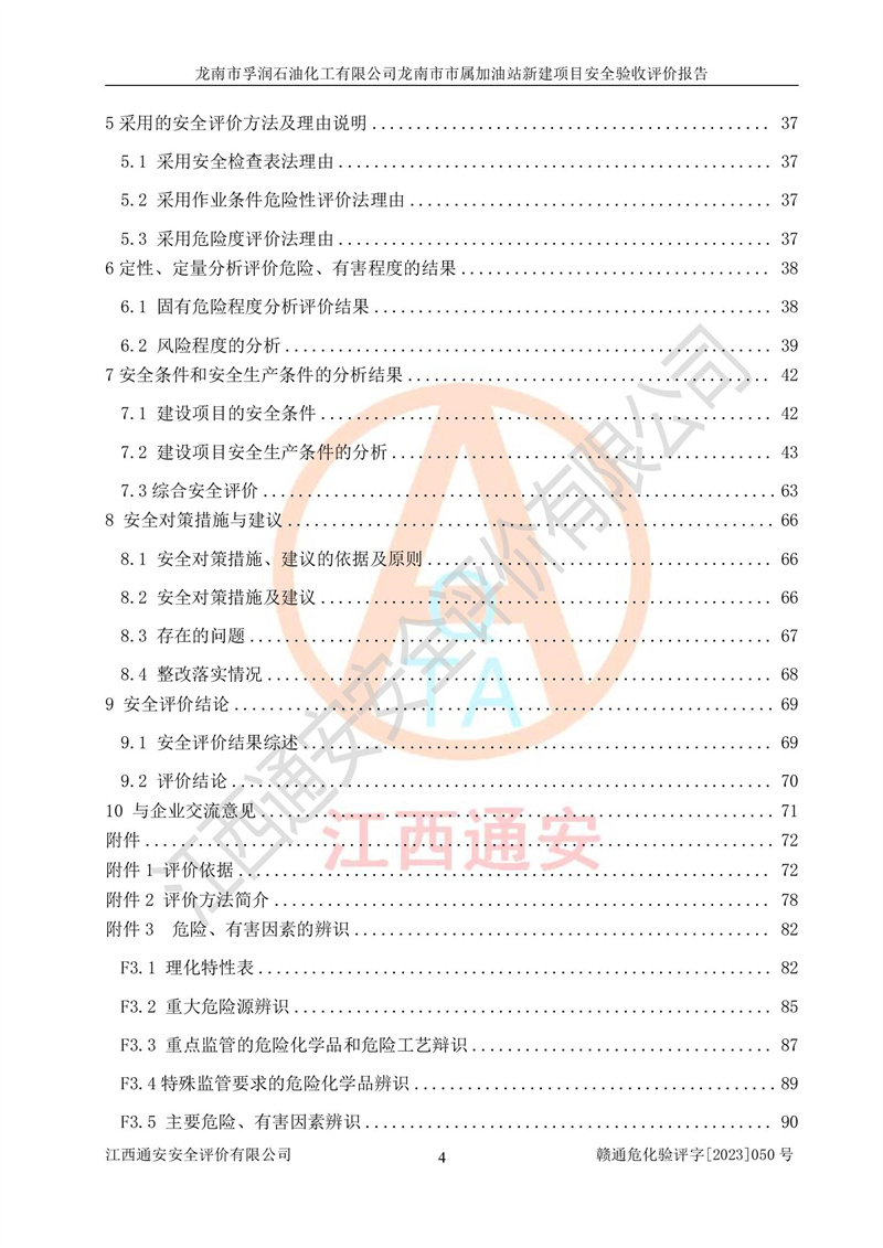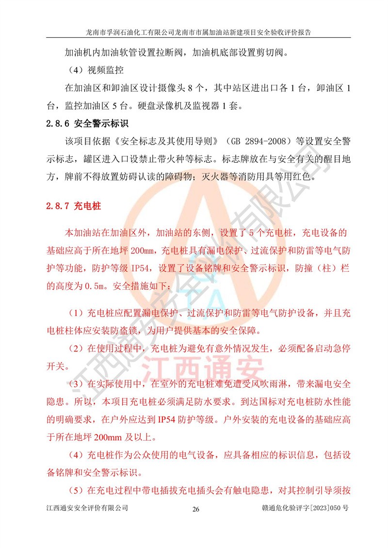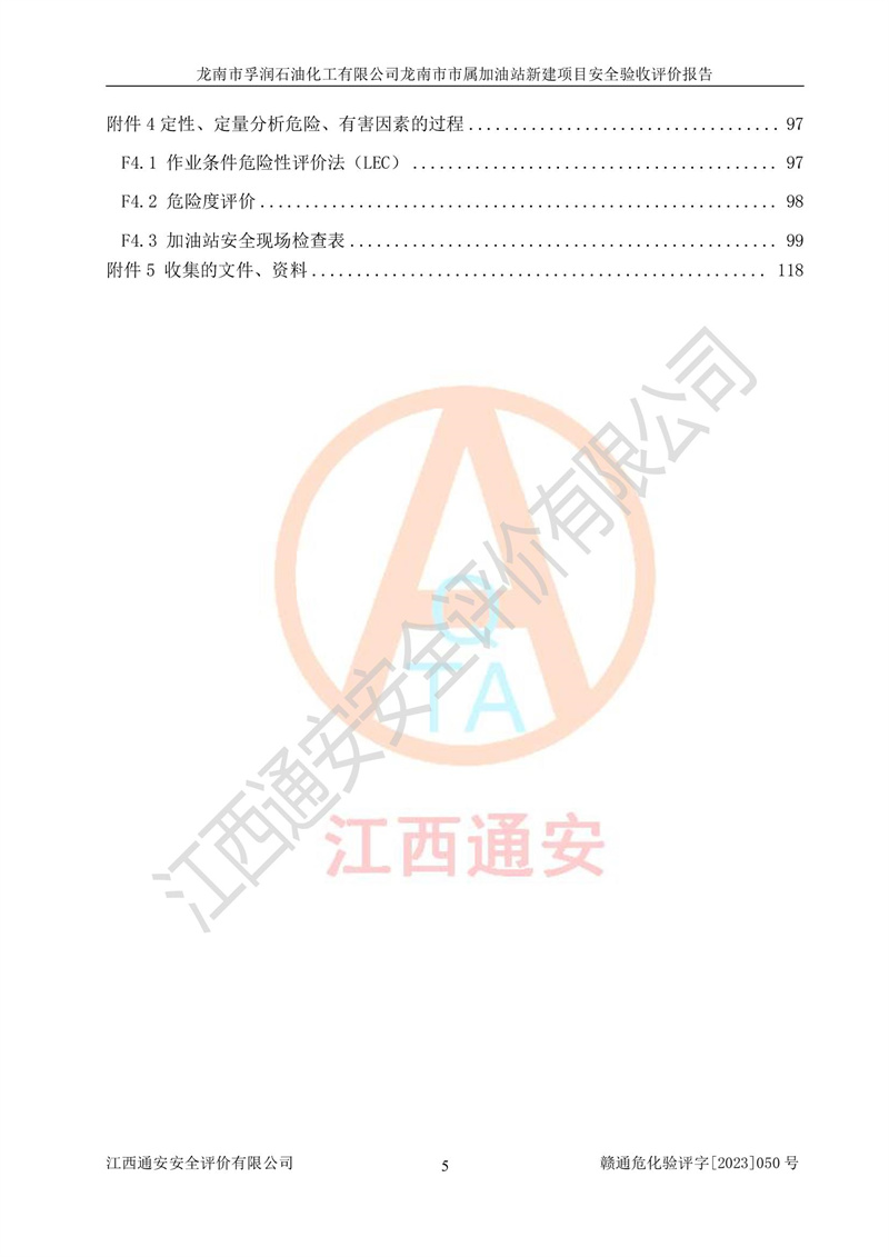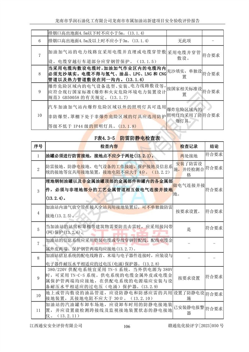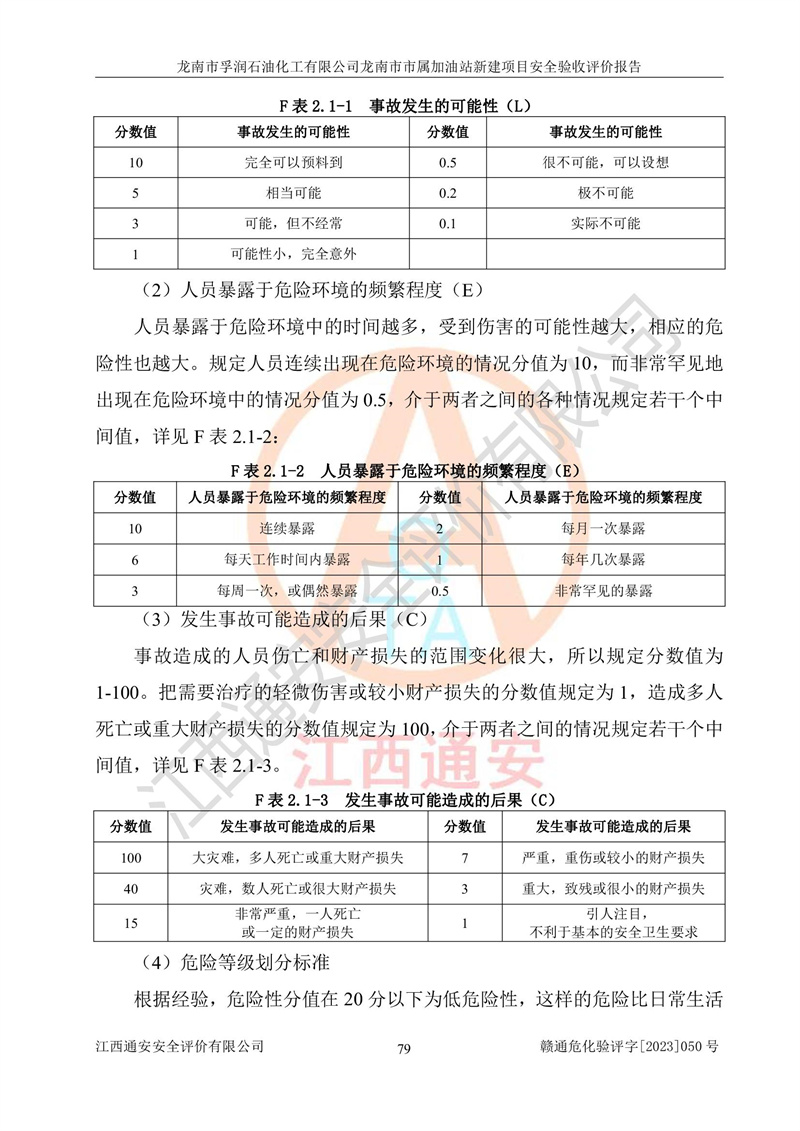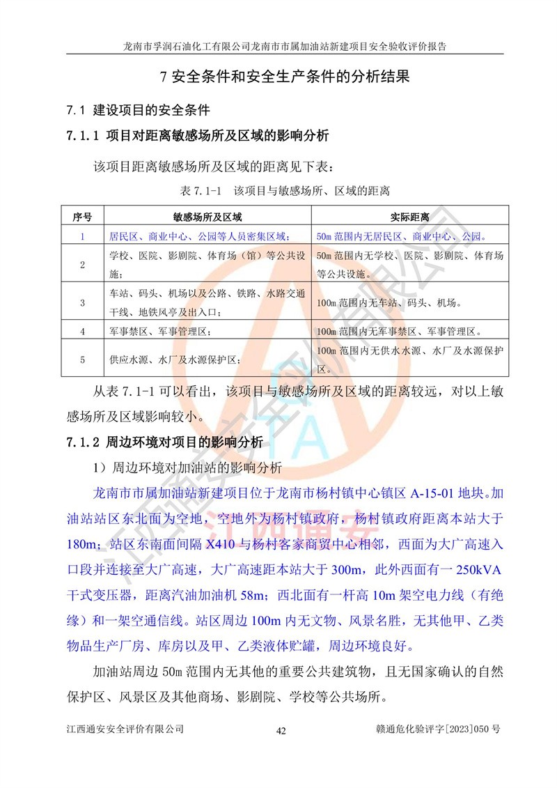 1、龙南市市属加油站新建项目为成品油零售企业,属于二级加油站,油罐区为主要危险源。该加油站不构成危险化学品重大危险源。 2、龙南市市属加油站新建项目所经营的汽油属于重点监管危险化学品,应加强安全管理,根据“汽油安全措施和应急处理原则”要求的措施进行检查,加油站设置了视频监控系统、具有液位报警功能的液位监测系统、渗漏检测,并制定各种管理制度和操作规程,已落实到位。 3、通过本报告分析,该项目投入经营后仍将面对多种危险因素,如火灾,爆炸、中毒、电气伤害、**伤害、噪声等危险有害因素。而项目*主要的危险、有害因素是火灾、爆炸,对此,加油站全体员工**保持**的安全防护意识。 4、项目公用工程能够满足安全经营的基本需要。 5、该加油站内部平面布置符合**和行业相关标准、规范的要求。建筑结构、消防、安全设施等布置明确、合理,符合各相关规范的要求。 6、加油站取得了雷电防护装置检测报告。 7、项目油罐、通气管口和加油机与外部环境的防火距离、平面布置、消防安全设施和措施满足法律法规、标准规范的要求。电气防爆保护、机械设备的安全保护等方面的安全设施建立**。 8、作业条件危险性评价结果:在选定的3个单元的危险程度为“一般危险、需要注意”或“稍有危险,可以接受”,且一般危险或稍有危险作业环境的出现均由物料的危险程度所决定,作业条件相对安全。 9、危险度评价结果:油罐区得分为17分,为Ⅰ级,属于**危险。加油站油罐安装高液位报警功能的液位监测系统,当油料达到油罐容量90%时,触动高液位报警装置,油料达到油罐容量95%时,自动停止油料继续进罐。同时,也采取了防止油品渗漏的保护措施,降低火灾爆炸危险,满足安全经营条件要求。 10、加油站建立了安全责任制,制定了安全管理制度、操作规程,编制了事故应急预案,配备了应急救援器材,按要求定期进行相关培训及演练。 11、该项目不涉及重大生产安全事故隐患,安全经营条件符合《危险化学品经营许可证管理办法》的要求。 龙南市孚润石油化工有限公司龙南市市属加油站新建项目具备**有关安全生产法律、法规、部门规章及标准规范要求的安全条件,符合经营和储存危险化学品(汽油、柴油)的安全条件要求,具备安全验收的条件。 |