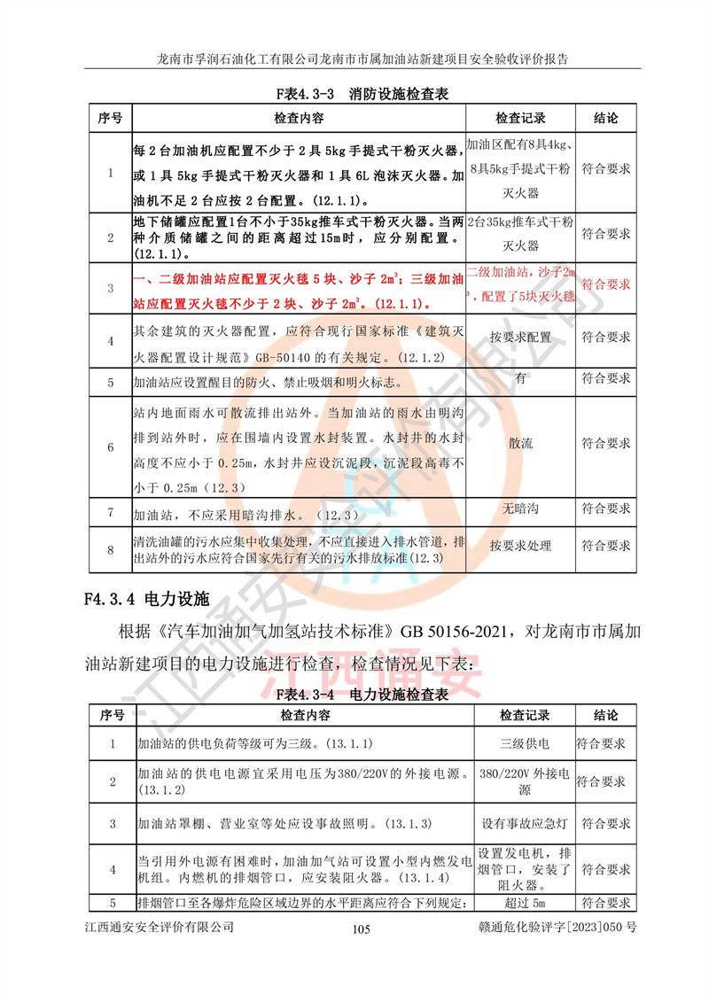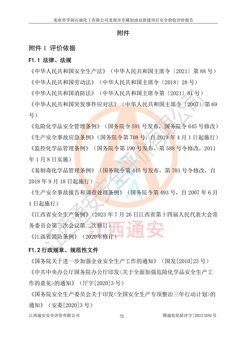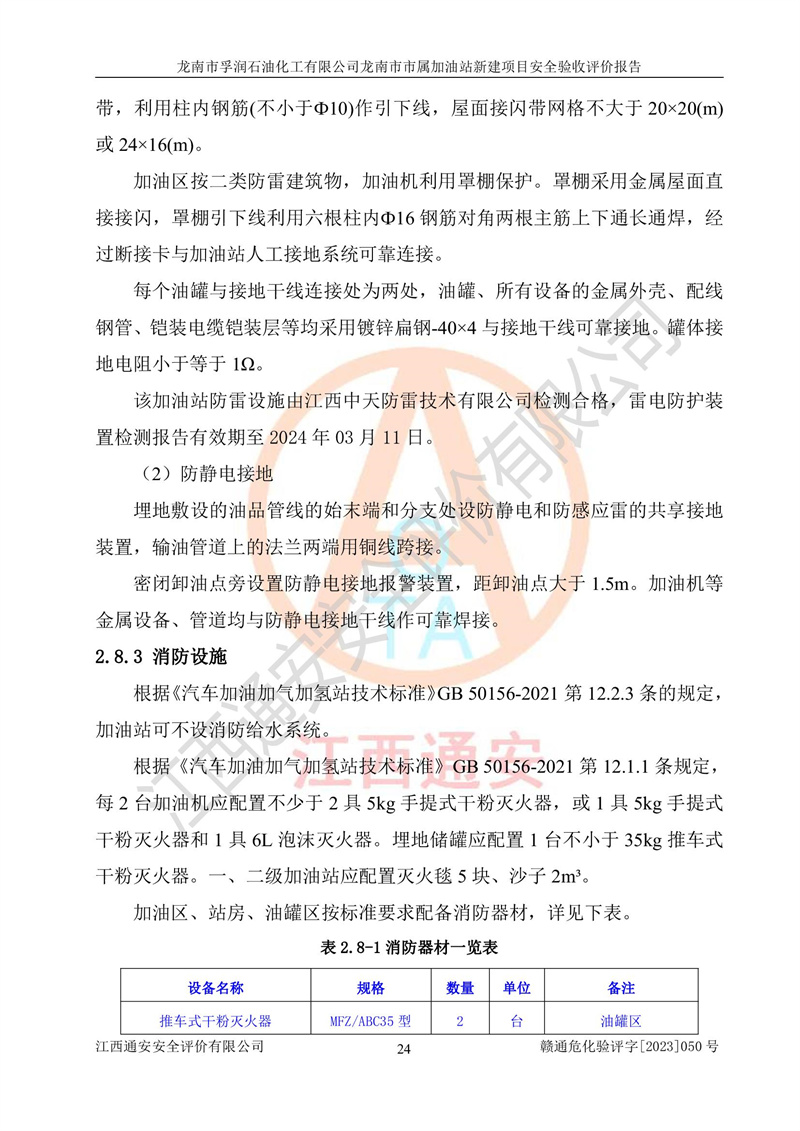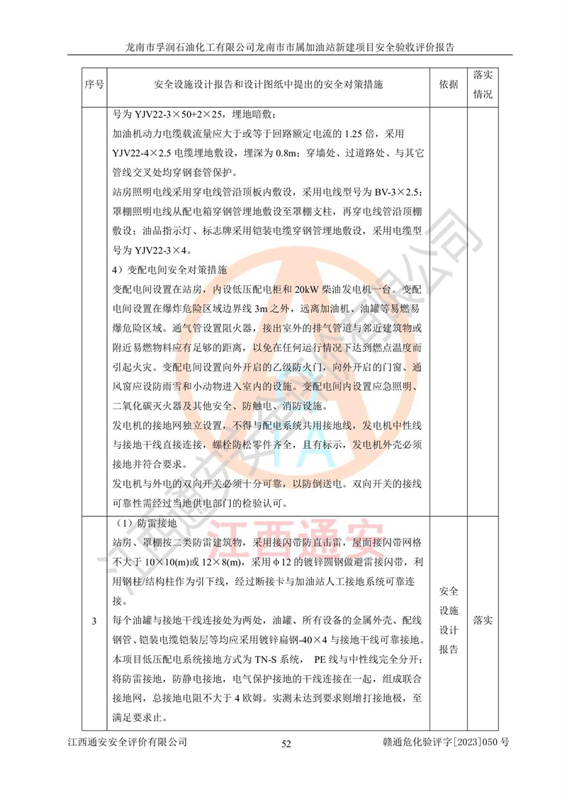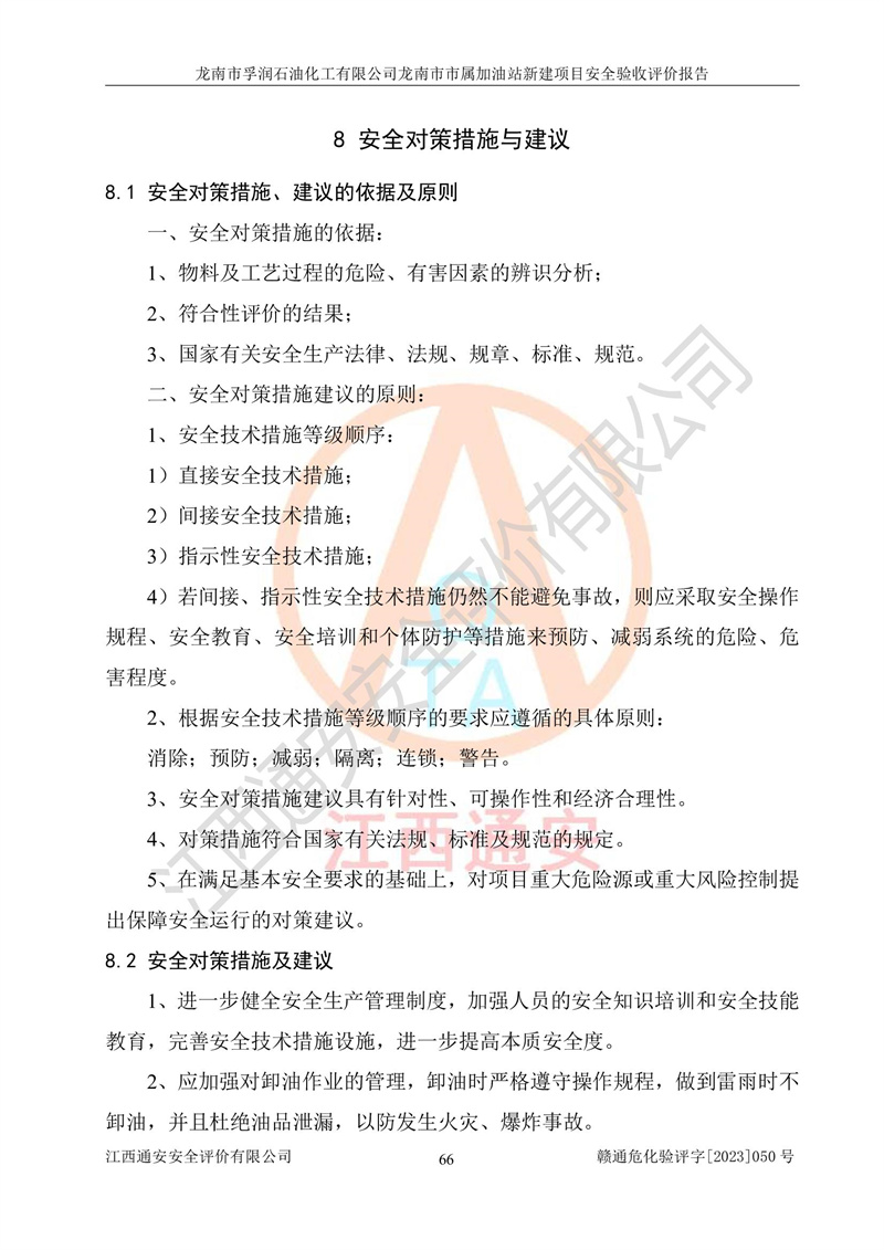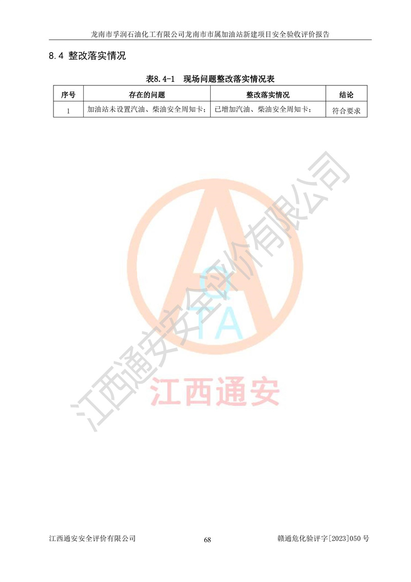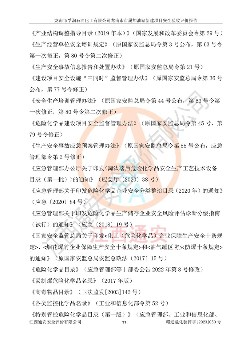 1、龙南市市属加油站新建项目为成品油零售企业,属于二级加油站,油罐区为主要危险源。该加油站不构成危险化学品重大危险源。 2、龙南市市属加油站新建项目所经营的汽油属于重点监管危险化学品,应加强安全管理,根据“汽油安全措施和应急处理原则”要求的措施进行检查,加油站设置了视频监控系统、具有液位报警功能的液位监测系统、渗漏检测,并制定各种管理制度和操作规程,已落实到位。 3、通过本报告分析,该项目投入经营后仍将面对多种危险因素,如火灾,爆炸、中毒、电气伤害、**伤害、噪声等危险有害因素。而项目*主要的危险、有害因素是火灾、爆炸,对此,加油站全体员工**保持**的安全防护意识。 4、项目公用工程能够满足安全经营的基本需要。 5、该加油站内部平面布置符合**和行业相关标准、规范的要求。建筑结构、消防、安全设施等布置明确、合理,符合各相关规范的要求。 6、加油站取得了雷电防护装置检测报告。 7、项目油罐、通气管口和加油机与外部环境的防火距离、平面布置、消防安全设施和措施满足法律法规、标准规范的要求。电气防爆保护、机械设备的安全保护等方面的安全设施建立**。 8、作业条件危险性评价结果:在选定的3个单元的危险程度为“一般危险、需要注意”或“稍有危险,可以接受”,且一般危险或稍有危险作业环境的出现均由物料的危险程度所决定,作业条件相对安全。 9、危险度评价结果:油罐区得分为17分,为Ⅰ级,属于**危险。加油站油罐安装高液位报警功能的液位监测系统,当油料达到油罐容量90%时,触动高液位报警装置,油料达到油罐容量95%时,自动停止油料继续进罐。同时,也采取了防止油品渗漏的保护措施,降低火灾爆炸危险,满足安全经营条件要求。 10、加油站建立了安全责任制,制定了安全管理制度、操作规程,编制了事故应急预案,配备了应急救援器材,按要求定期进行相关培训及演练。 11、该项目不涉及重大生产安全事故隐患,安全经营条件符合《危险化学品经营许可证管理办法》的要求。 龙南市孚润石油化工有限公司龙南市市属加油站新建项目具备**有关安全生产法律、法规、部门规章及标准规范要求的安全条件,符合经营和储存危险化学品(汽油、柴油)的安全条件要求,具备安全验收的条件。 |