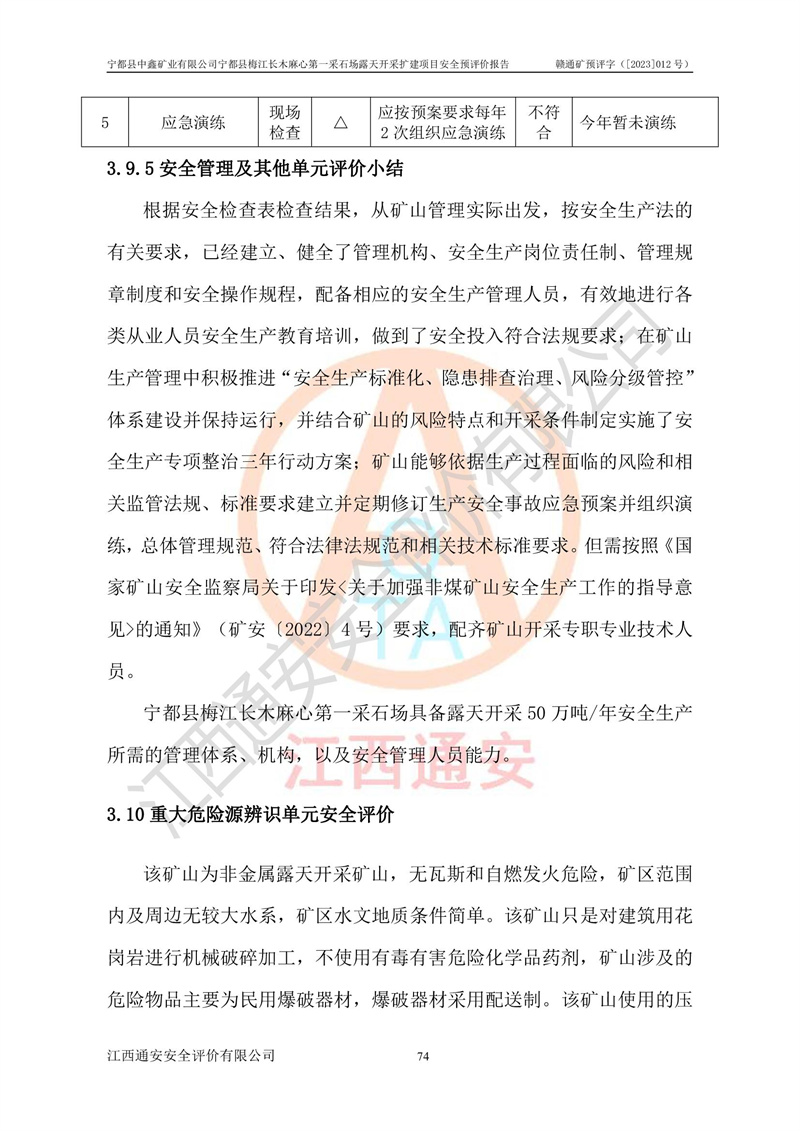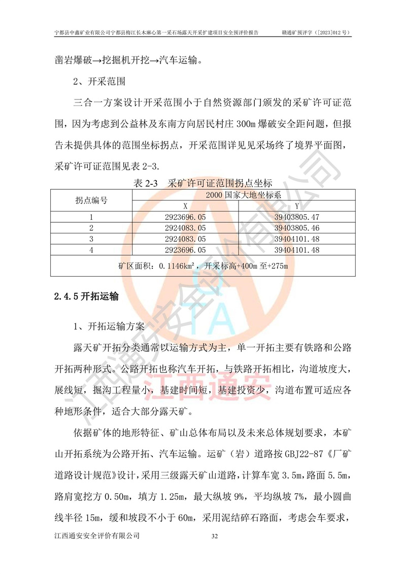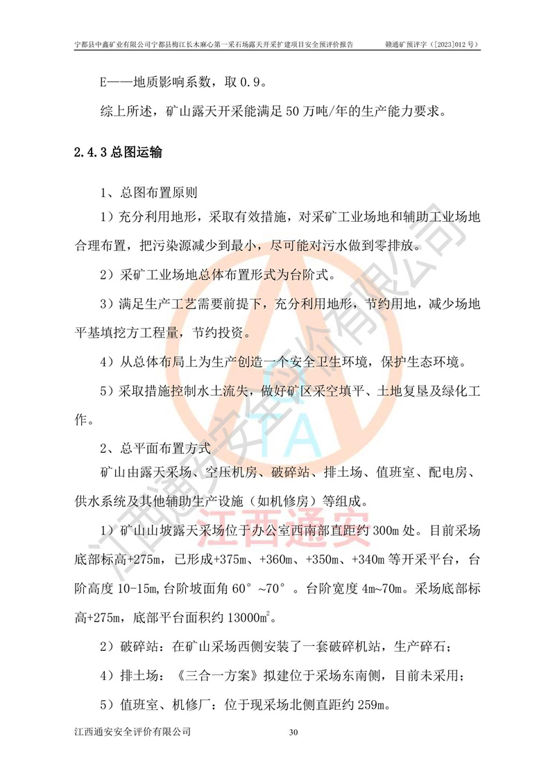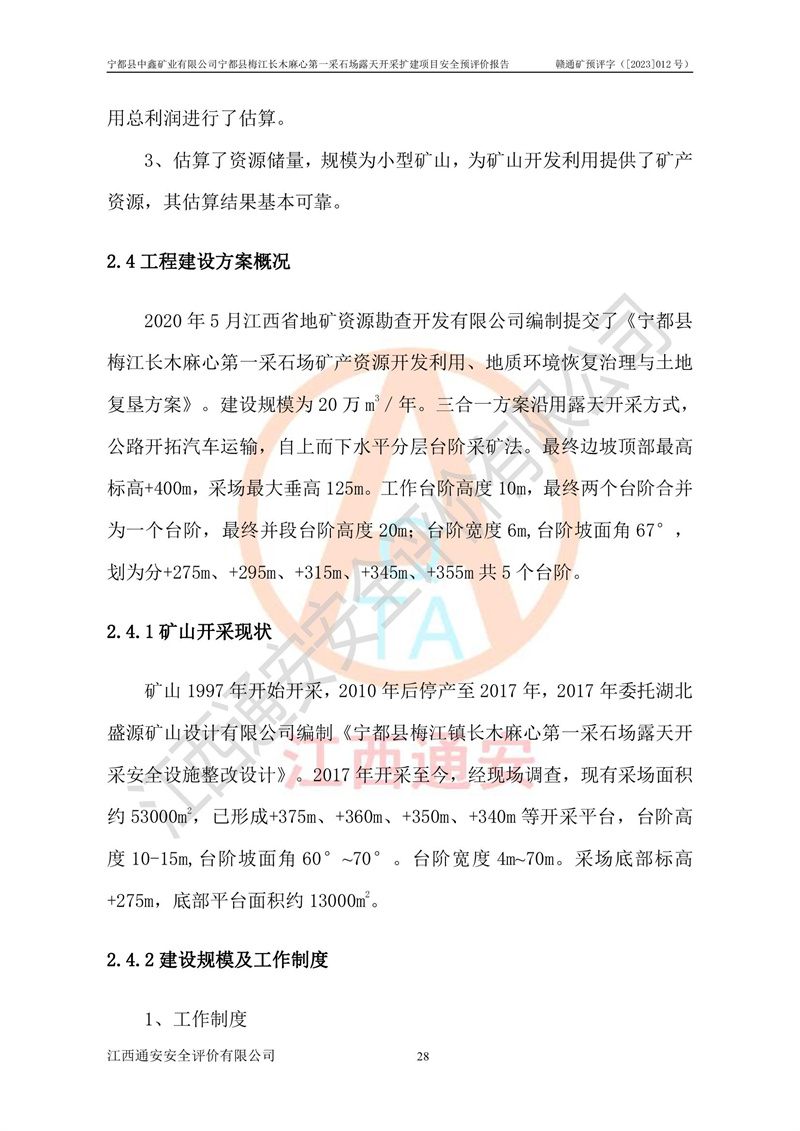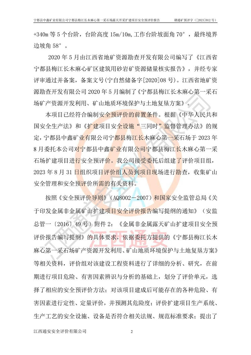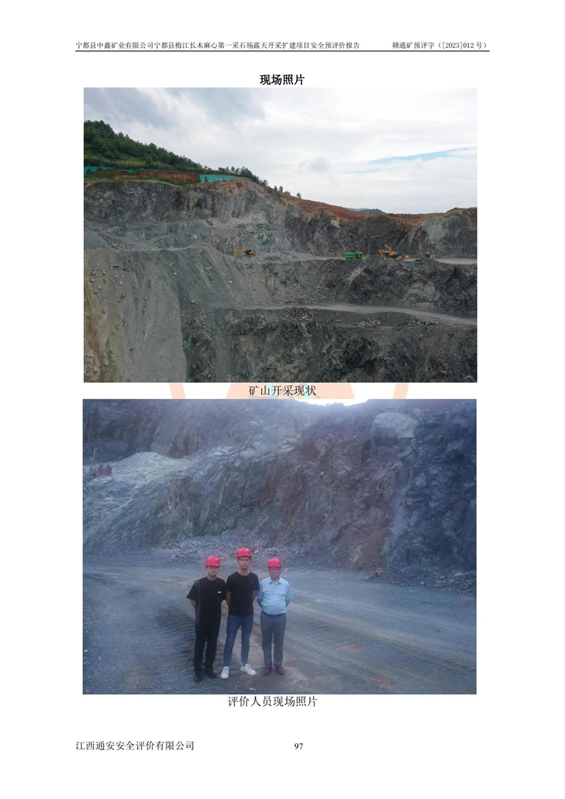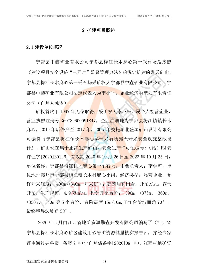 宁都县中鑫矿业有限公司宁都县梅江长木麻心**采石场矿区位于宁都县城南西140°方向,直线距离7**处,矿区大地坐标(2000坐标系):X=2923696.05~2924083.05;Y=39403805.47~39404101.48,行政区划属宁都县梅江长木村管辖。矿区交通条件一般。自矿区沿村村通公路2.5km可到319国道,319国道直达宁都县城。 宁都县中鑫矿业有限公司宁都县梅江长木麻心**采石场此次扩建,原矿区范围由4个拐点圈定,矿区面积0.1146km2,开采面积不变;原设计开采深度+400m~+340m标高,扩深至开采深度+400m~+275m,原开采规模4.9万m3/a(12.25万t/a),扩大至20万m3/a(50万t/a)。 现宁都县梅江长木麻心**采石场采矿权人为宁都县中鑫矿业有限公司,采矿许可证证号C3607302010067120067834,**期2022年12月23日至2023年12月23日。矿区范围由4个拐点圈定,矿区面积0.1146km2,开采深度+400m~+275m标高,开采矿种为建筑用花岗岩,露天开采方式,生产规模20万m3/a。矿山现在属于正常生产矿山,安全生产许可证编号:(赣)FM安许证字[2020]B0126,**期2020年10月26日至2023年10月25日,单位名称:宁都县梅江长木麻心**采石场,主要负责人:李学辉,单位地址赣州市宁都县梅江镇长木村麻心小组,经济类型:私营企业,允许开采深度:+400m~+340m,开采矿种:建筑用花岗岩,开采方式:露天开采,生产规模:4.9万m3/a,设计开采台阶:+390m、+375m、+360m、+350m、+340m等5个台阶,台阶**15m/10m,工作台阶坡面角70°,*终境界边坡角58°。 本项目已经符合编制安全预评价的前置条件。根据《中华人民共和国安全生产法》和《扩建项目安全设施“三同时”监督管理办法》的规定,宁都县中鑫矿业有限公司宁都县梅江长木麻心**采石场于2023年8月委托本公司对宁都县中鑫矿业有限公司宁都县梅江长木麻心**采石场扩建项目进行安全预评价。我公司接受委托后组建了评价项目组,2023年8月31日组织项目评价组人员到项目现场进行勘查,收集矿山安全管理和安全预评价所需的有关资料。 宁都县中鑫矿业有限公司宁都县梅江长木麻心**采石场扩建项目中存在的主要危险因素:滑坡和坍塌、爆破伤害、**伤害、高处坠落、物体打击、触电、机械伤害、 起重伤害、火灾、水灾、容器爆炸、中毒和窒息。本评价项目应重点防范的危险因素:滑坡和坍塌、爆破伤害、**伤害、高处坠落、机械伤害。宁都县中鑫矿业有限公司宁都县梅江长木麻心**采石场扩建项目从安全生产角度符合**有关安全生产法律、法规、规章、标准和规范的要求,风险可以接受。 |