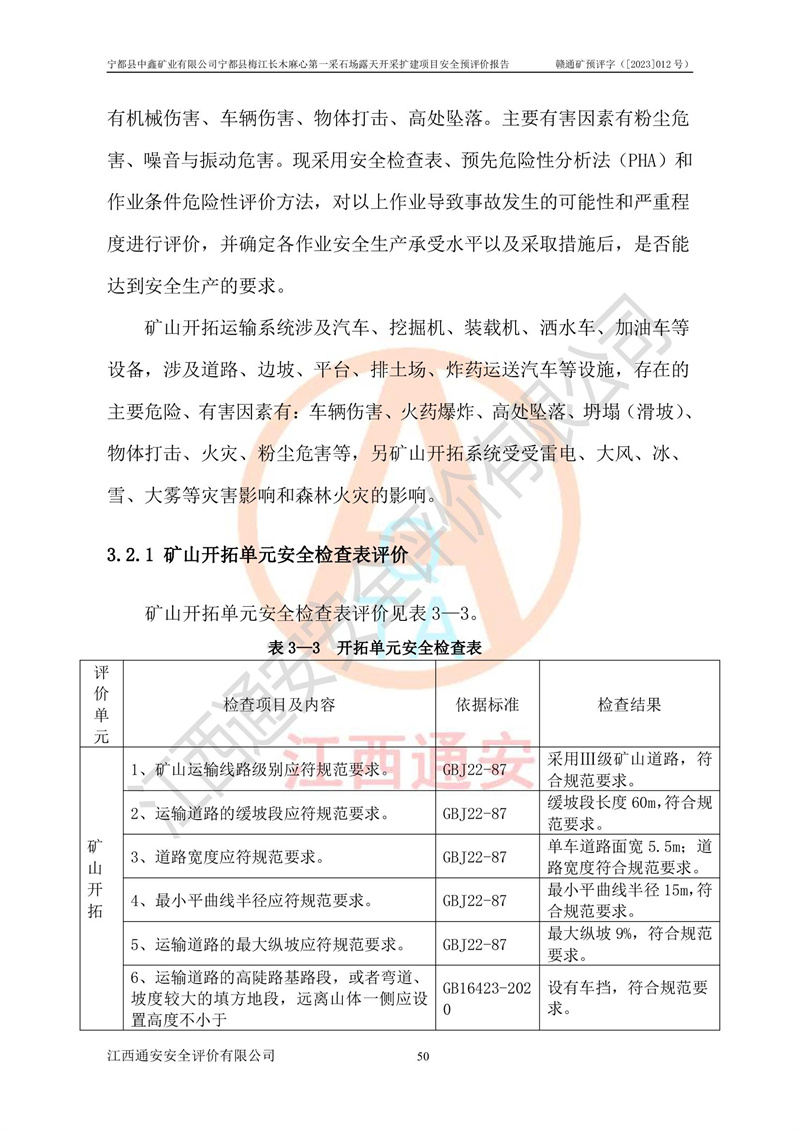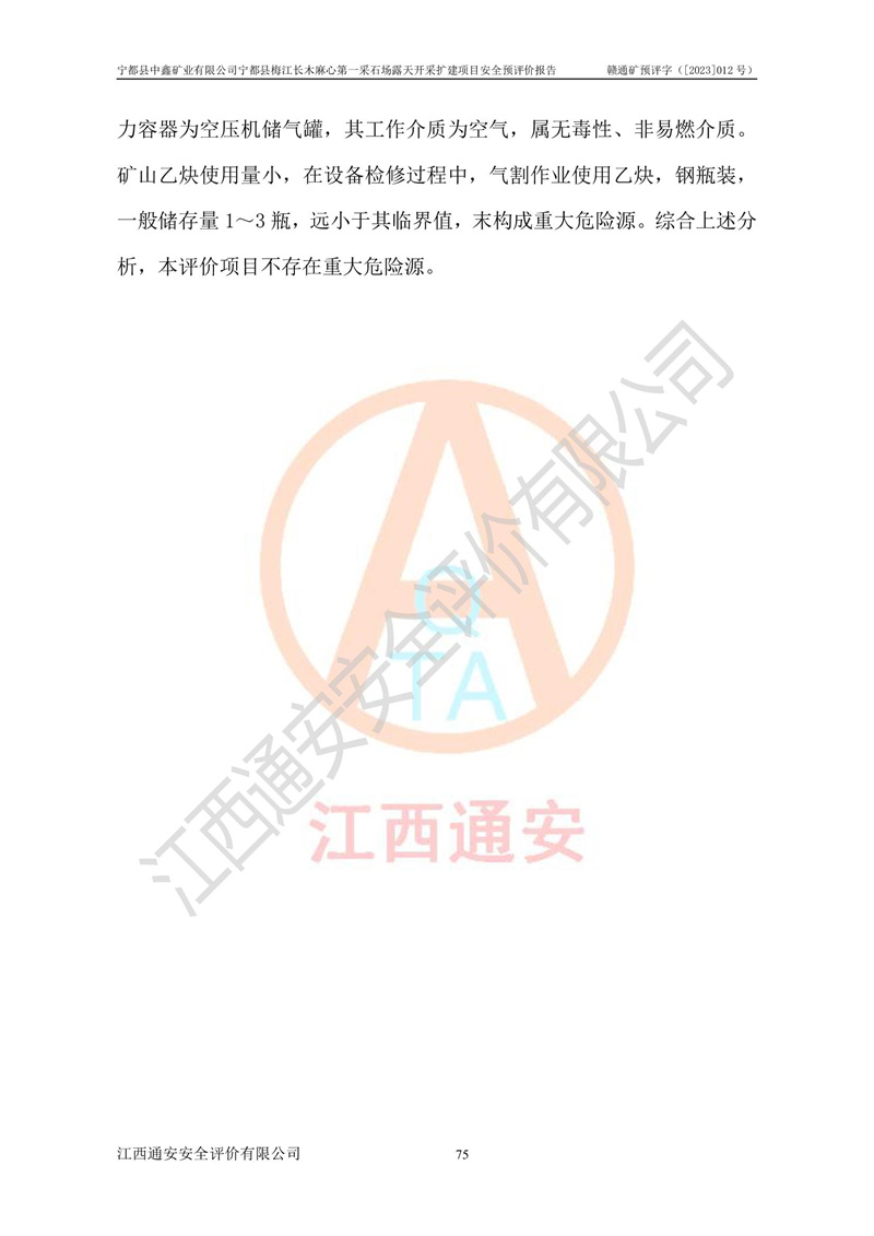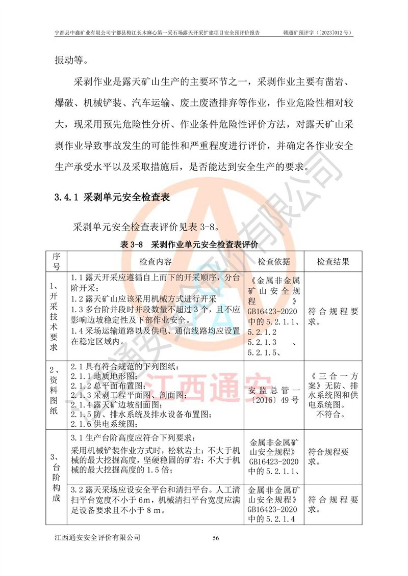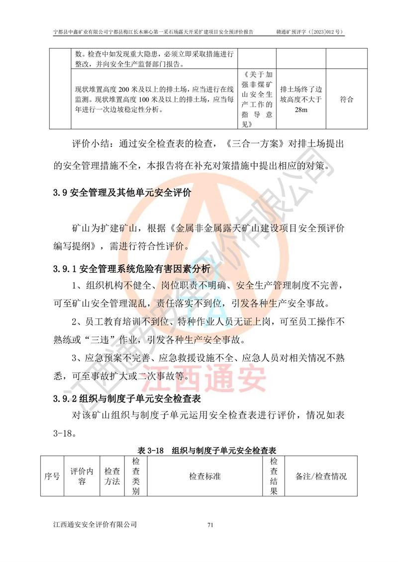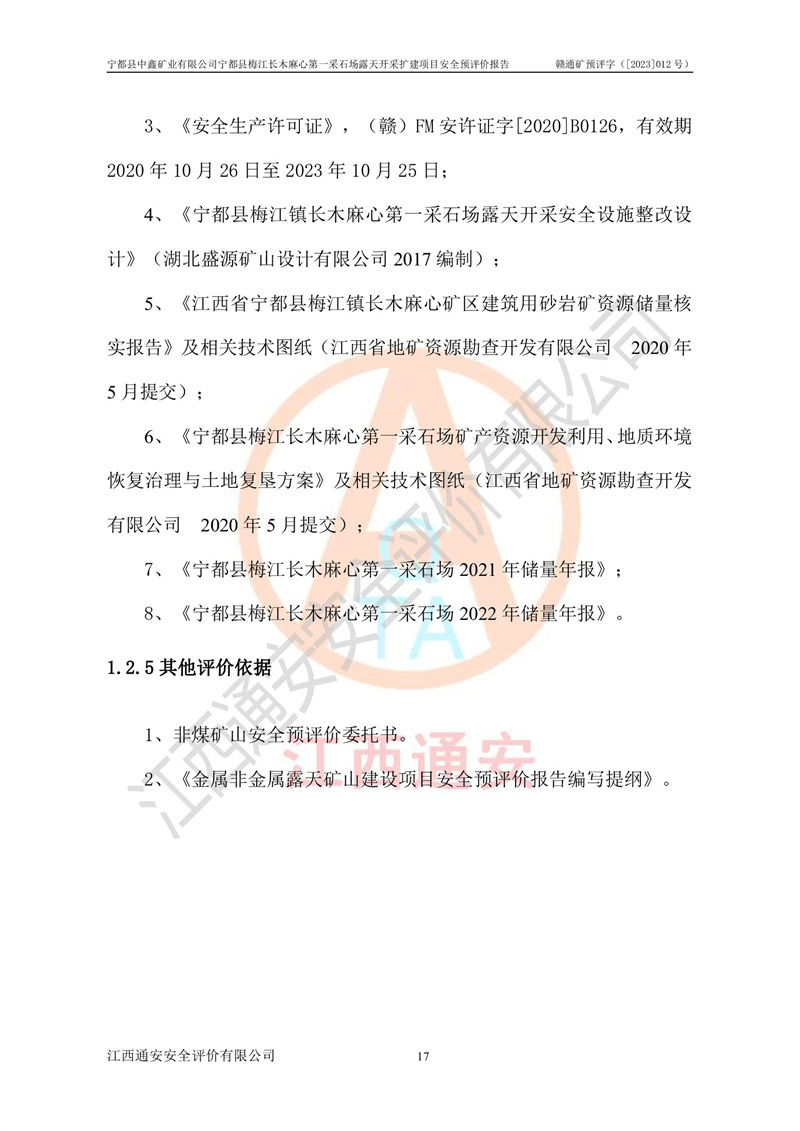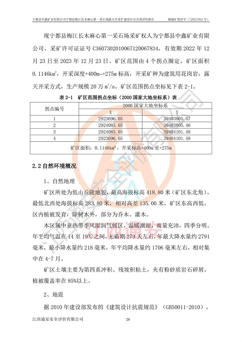 宁都县中鑫矿业有限公司宁都县梅江长木麻心**采石场矿区位于宁都县城南西140°方向,直线距离7**处,矿区大地坐标(2000坐标系):X=2923696.05~2924083.05;Y=39403805.47~39404101.48,行政区划属宁都县梅江长木村管辖。矿区交通条件一般。自矿区沿村村通公路2.5km可到319国道,319国道直达宁都县城。 宁都县中鑫矿业有限公司宁都县梅江长木麻心**采石场此次扩建,原矿区范围由4个拐点圈定,矿区面积0.1146km2,开采面积不变;原设计开采深度+400m~+340m标高,扩深至开采深度+400m~+275m,原开采规模4.9万m3/a(12.25万t/a),扩大至20万m3/a(50万t/a)。 现宁都县梅江长木麻心**采石场采矿权人为宁都县中鑫矿业有限公司,采矿许可证证号C3607302010067120067834,**期2022年12月23日至2023年12月23日。矿区范围由4个拐点圈定,矿区面积0.1146km2,开采深度+400m~+275m标高,开采矿种为建筑用花岗岩,露天开采方式,生产规模20万m3/a。矿山现在属于正常生产矿山,安全生产许可证编号:(赣)FM安许证字[2020]B0126,**期2020年10月26日至2023年10月25日,单位名称:宁都县梅江长木麻心**采石场,主要负责人:李学辉,单位地址赣州市宁都县梅江镇长木村麻心小组,经济类型:私营企业,允许开采深度:+400m~+340m,开采矿种:建筑用花岗岩,开采方式:露天开采,生产规模:4.9万m3/a,设计开采台阶:+390m、+375m、+360m、+350m、+340m等5个台阶,台阶**15m/10m,工作台阶坡面角70°,*终境界边坡角58°。 本项目已经符合编制安全预评价的前置条件。根据《中华人民共和国安全生产法》和《扩建项目安全设施“三同时”监督管理办法》的规定,宁都县中鑫矿业有限公司宁都县梅江长木麻心**采石场于2023年8月委托本公司对宁都县中鑫矿业有限公司宁都县梅江长木麻心**采石场扩建项目进行安全预评价。我公司接受委托后组建了评价项目组,2023年8月31日组织项目评价组人员到项目现场进行勘查,收集矿山安全管理和安全预评价所需的有关资料。 宁都县中鑫矿业有限公司宁都县梅江长木麻心**采石场扩建项目中存在的主要危险因素:滑坡和坍塌、爆破伤害、**伤害、高处坠落、物体打击、触电、机械伤害、 起重伤害、火灾、水灾、容器爆炸、中毒和窒息。本评价项目应重点防范的危险因素:滑坡和坍塌、爆破伤害、**伤害、高处坠落、机械伤害。宁都县中鑫矿业有限公司宁都县梅江长木麻心**采石场扩建项目从安全生产角度符合**有关安全生产法律、法规、规章、标准和规范的要求,风险可以接受。 |