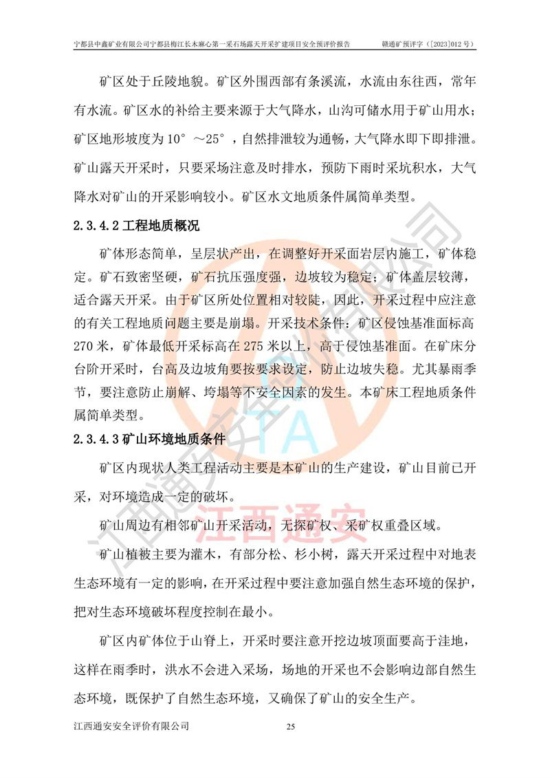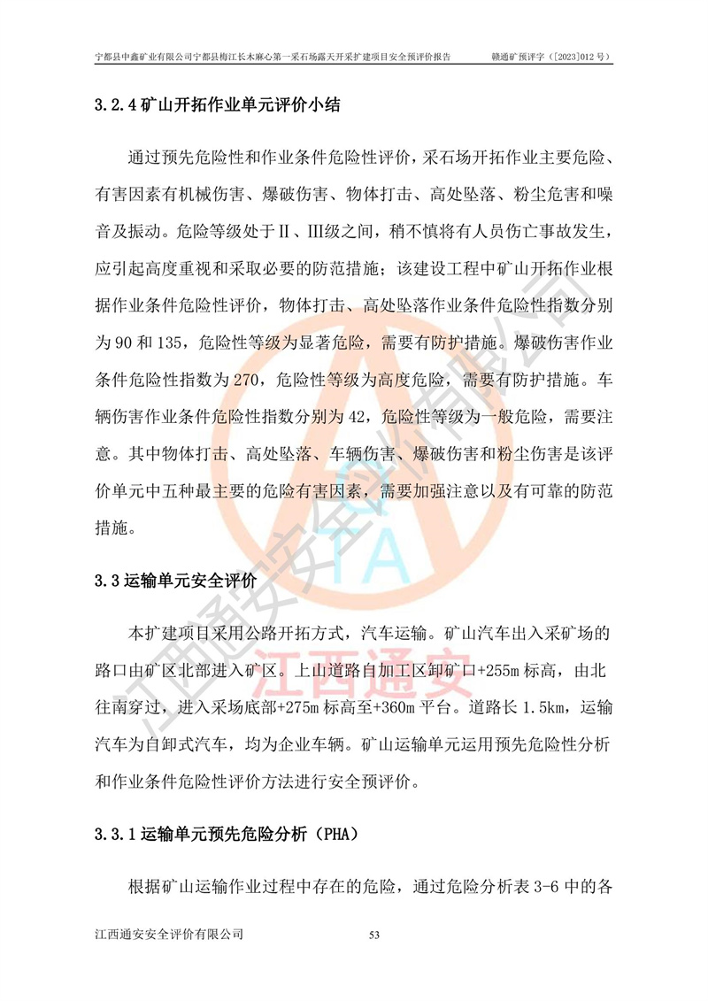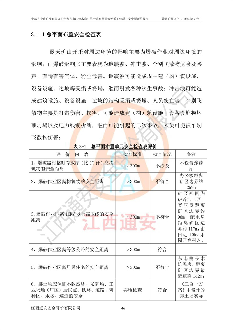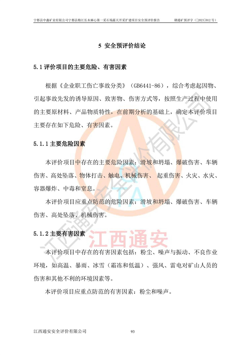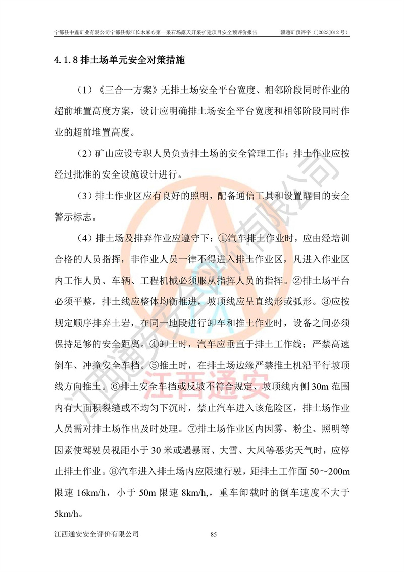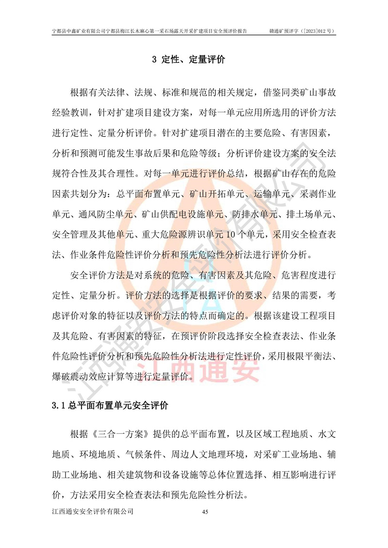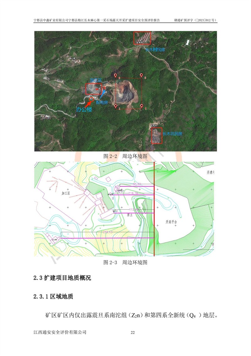 宁都县中鑫矿业有限公司宁都县梅江长木麻心**采石场矿区位于宁都县城南西140°方向,直线距离7**处,矿区大地坐标(2000坐标系):X=2923696.05~2924083.05;Y=39403805.47~39404101.48,行政区划属宁都县梅江长木村管辖。矿区交通条件一般。自矿区沿村村通公路2.5km可到319国道,319国道直达宁都县城。 宁都县中鑫矿业有限公司宁都县梅江长木麻心**采石场此次扩建,原矿区范围由4个拐点圈定,矿区面积0.1146km2,开采面积不变;原设计开采深度+400m~+340m标高,扩深至开采深度+400m~+275m,原开采规模4.9万m3/a(12.25万t/a),扩大至20万m3/a(50万t/a)。 现宁都县梅江长木麻心**采石场采矿权人为宁都县中鑫矿业有限公司,采矿许可证证号C3607302010067120067834,**期2022年12月23日至2023年12月23日。矿区范围由4个拐点圈定,矿区面积0.1146km2,开采深度+400m~+275m标高,开采矿种为建筑用花岗岩,露天开采方式,生产规模20万m3/a。矿山现在属于正常生产矿山,安全生产许可证编号:(赣)FM安许证字[2020]B0126,**期2020年10月26日至2023年10月25日,单位名称:宁都县梅江长木麻心**采石场,主要负责人:李学辉,单位地址赣州市宁都县梅江镇长木村麻心小组,经济类型:私营企业,允许开采深度:+400m~+340m,开采矿种:建筑用花岗岩,开采方式:露天开采,生产规模:4.9万m3/a,设计开采台阶:+390m、+375m、+360m、+350m、+340m等5个台阶,台阶**15m/10m,工作台阶坡面角70°,*终境界边坡角58°。 本项目已经符合编制安全预评价的前置条件。根据《中华人民共和国安全生产法》和《扩建项目安全设施“三同时”监督管理办法》的规定,宁都县中鑫矿业有限公司宁都县梅江长木麻心**采石场于2023年8月委托本公司对宁都县中鑫矿业有限公司宁都县梅江长木麻心**采石场扩建项目进行安全预评价。我公司接受委托后组建了评价项目组,2023年8月31日组织项目评价组人员到项目现场进行勘查,收集矿山安全管理和安全预评价所需的有关资料。 宁都县中鑫矿业有限公司宁都县梅江长木麻心**采石场扩建项目中存在的主要危险因素:滑坡和坍塌、爆破伤害、**伤害、高处坠落、物体打击、触电、机械伤害、 起重伤害、火灾、水灾、容器爆炸、中毒和窒息。本评价项目应重点防范的危险因素:滑坡和坍塌、爆破伤害、**伤害、高处坠落、机械伤害。宁都县中鑫矿业有限公司宁都县梅江长木麻心**采石场扩建项目从安全生产角度符合**有关安全生产法律、法规、规章、标准和规范的要求,风险可以接受。 |
