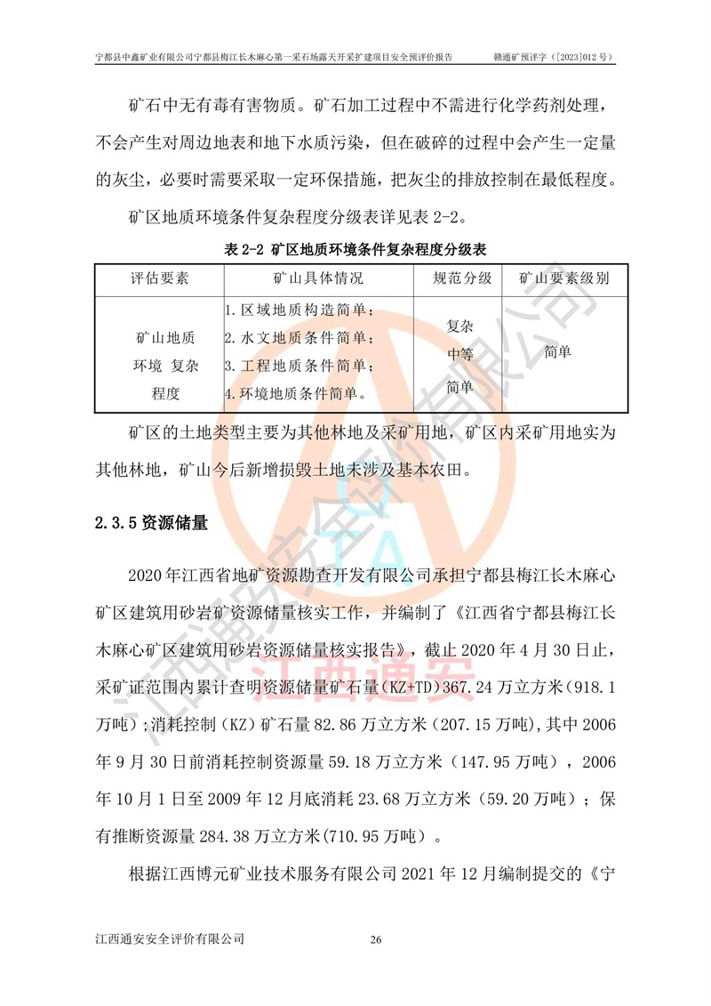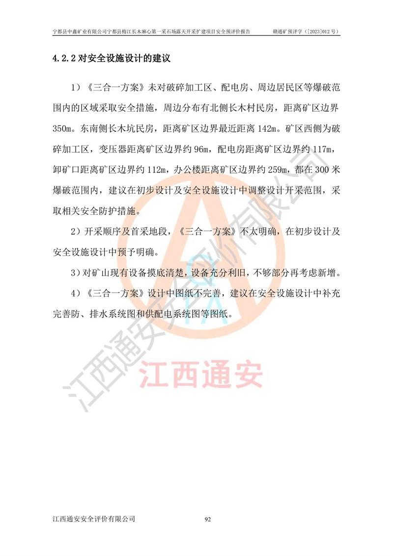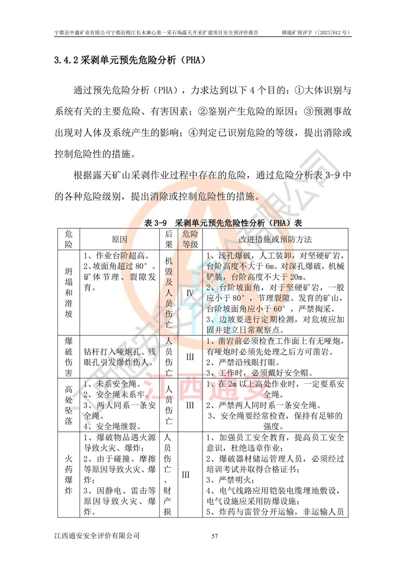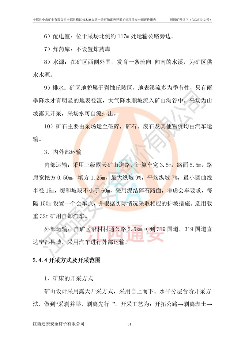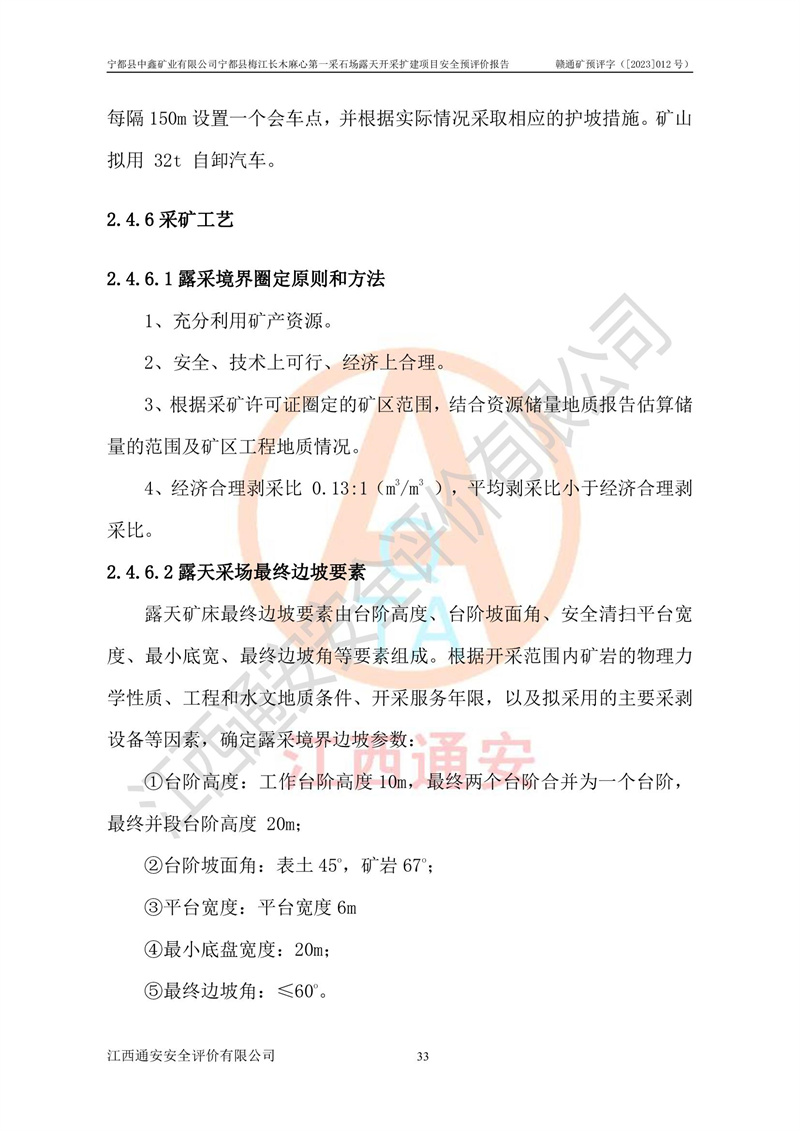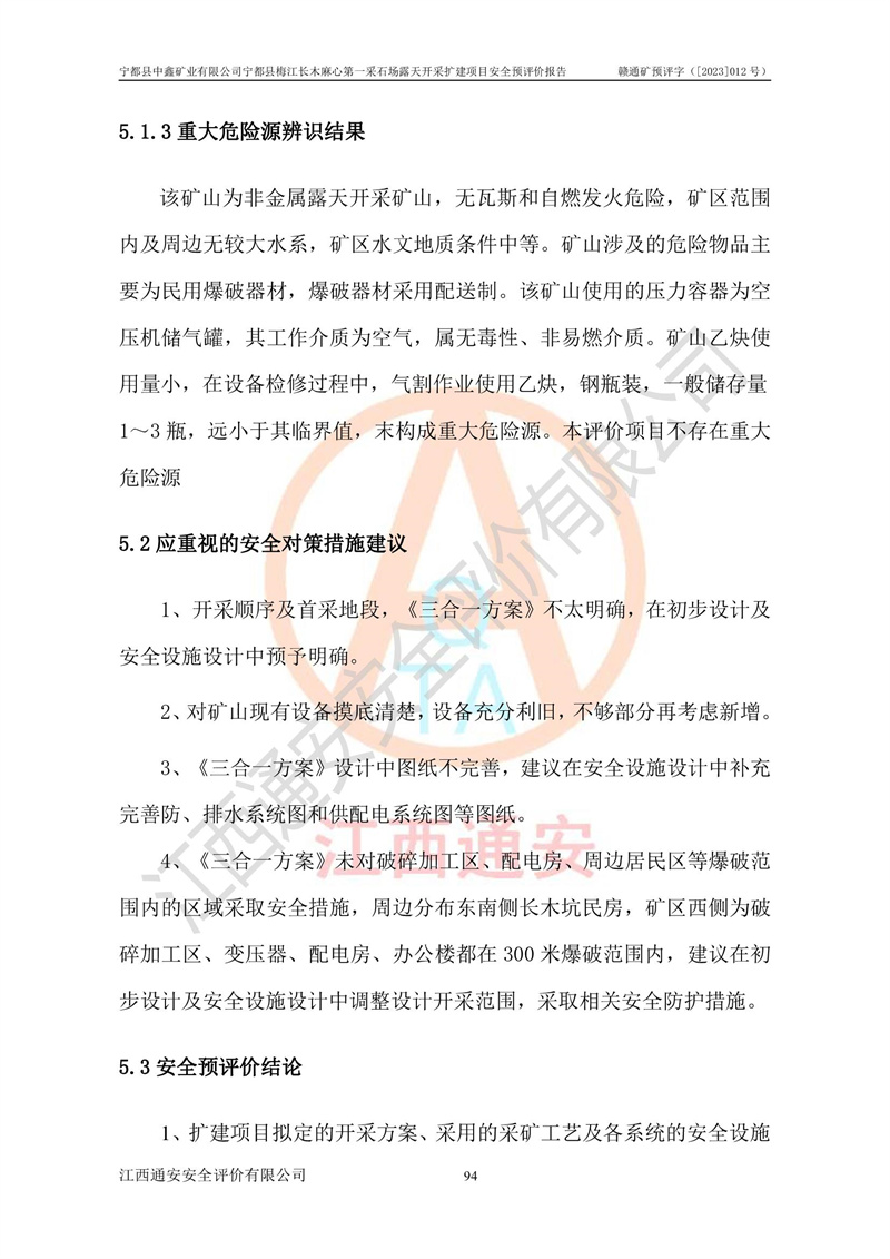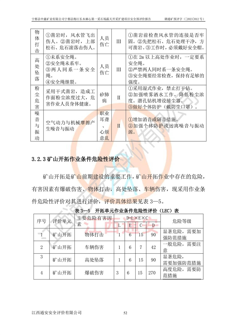 宁都县中鑫矿业有限公司宁都县梅江长木麻心**采石场矿区位于宁都县城南西140°方向,直线距离7**处,矿区大地坐标(2000坐标系):X=2923696.05~2924083.05;Y=39403805.47~39404101.48,行政区划属宁都县梅江长木村管辖。矿区交通条件一般。自矿区沿村村通公路2.5km可到319国道,319国道直达宁都县城。 宁都县中鑫矿业有限公司宁都县梅江长木麻心**采石场此次扩建,原矿区范围由4个拐点圈定,矿区面积0.1146km2,开采面积不变;原设计开采深度+400m~+340m标高,扩深至开采深度+400m~+275m,原开采规模4.9万m3/a(12.25万t/a),扩大至20万m3/a(50万t/a)。 现宁都县梅江长木麻心**采石场采矿权人为宁都县中鑫矿业有限公司,采矿许可证证号C3607302010067120067834,**期2022年12月23日至2023年12月23日。矿区范围由4个拐点圈定,矿区面积0.1146km2,开采深度+400m~+275m标高,开采矿种为建筑用花岗岩,露天开采方式,生产规模20万m3/a。矿山现在属于正常生产矿山,安全生产许可证编号:(赣)FM安许证字[2020]B0126,**期2020年10月26日至2023年10月25日,单位名称:宁都县梅江长木麻心**采石场,主要负责人:李学辉,单位地址赣州市宁都县梅江镇长木村麻心小组,经济类型:私营企业,允许开采深度:+400m~+340m,开采矿种:建筑用花岗岩,开采方式:露天开采,生产规模:4.9万m3/a,设计开采台阶:+390m、+375m、+360m、+350m、+340m等5个台阶,台阶**15m/10m,工作台阶坡面角70°,*终境界边坡角58°。 本项目已经符合编制安全预评价的前置条件。根据《中华人民共和国安全生产法》和《扩建项目安全设施“三同时”监督管理办法》的规定,宁都县中鑫矿业有限公司宁都县梅江长木麻心**采石场于2023年8月委托本公司对宁都县中鑫矿业有限公司宁都县梅江长木麻心**采石场扩建项目进行安全预评价。我公司接受委托后组建了评价项目组,2023年8月31日组织项目评价组人员到项目现场进行勘查,收集矿山安全管理和安全预评价所需的有关资料。 宁都县中鑫矿业有限公司宁都县梅江长木麻心**采石场扩建项目中存在的主要危险因素:滑坡和坍塌、爆破伤害、**伤害、高处坠落、物体打击、触电、机械伤害、 起重伤害、火灾、水灾、容器爆炸、中毒和窒息。本评价项目应重点防范的危险因素:滑坡和坍塌、爆破伤害、**伤害、高处坠落、机械伤害。宁都县中鑫矿业有限公司宁都县梅江长木麻心**采石场扩建项目从安全生产角度符合**有关安全生产法律、法规、规章、标准和规范的要求,风险可以接受。 |