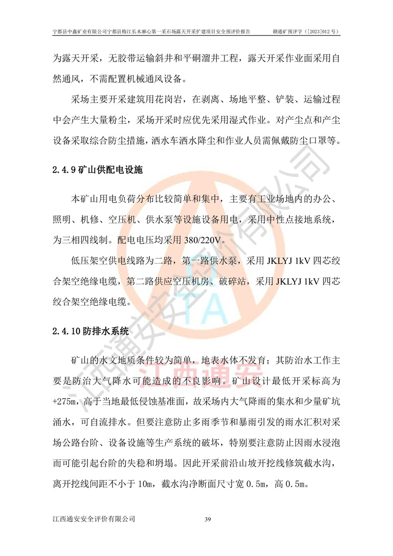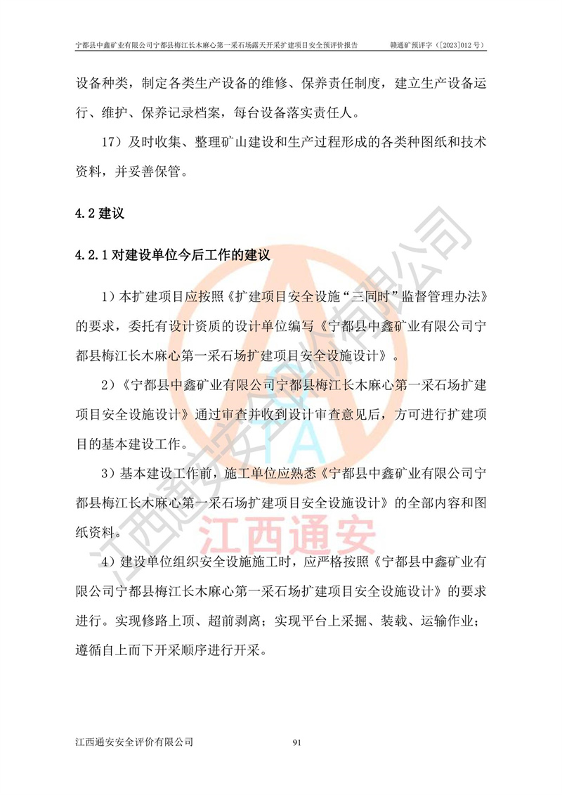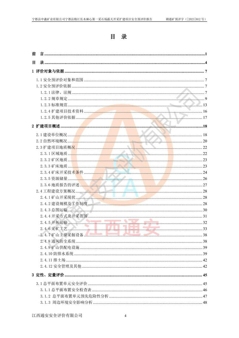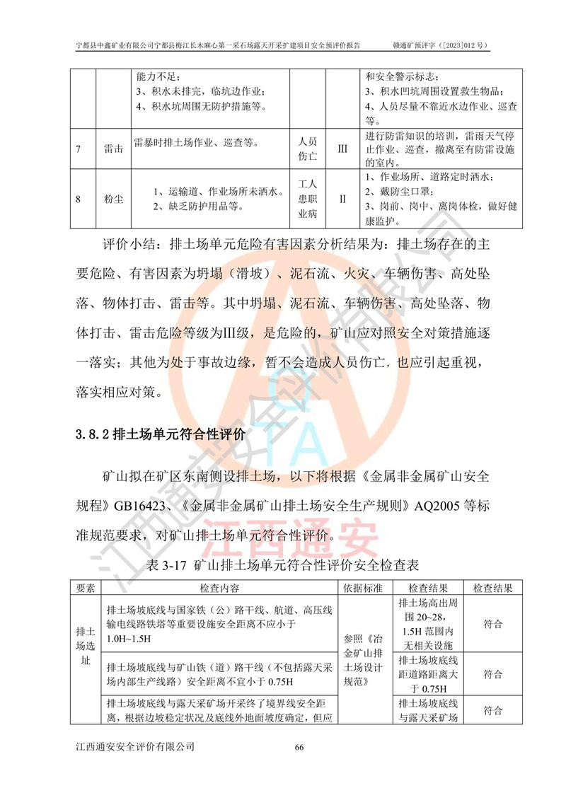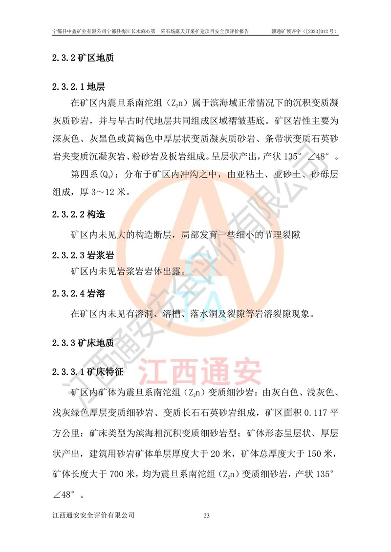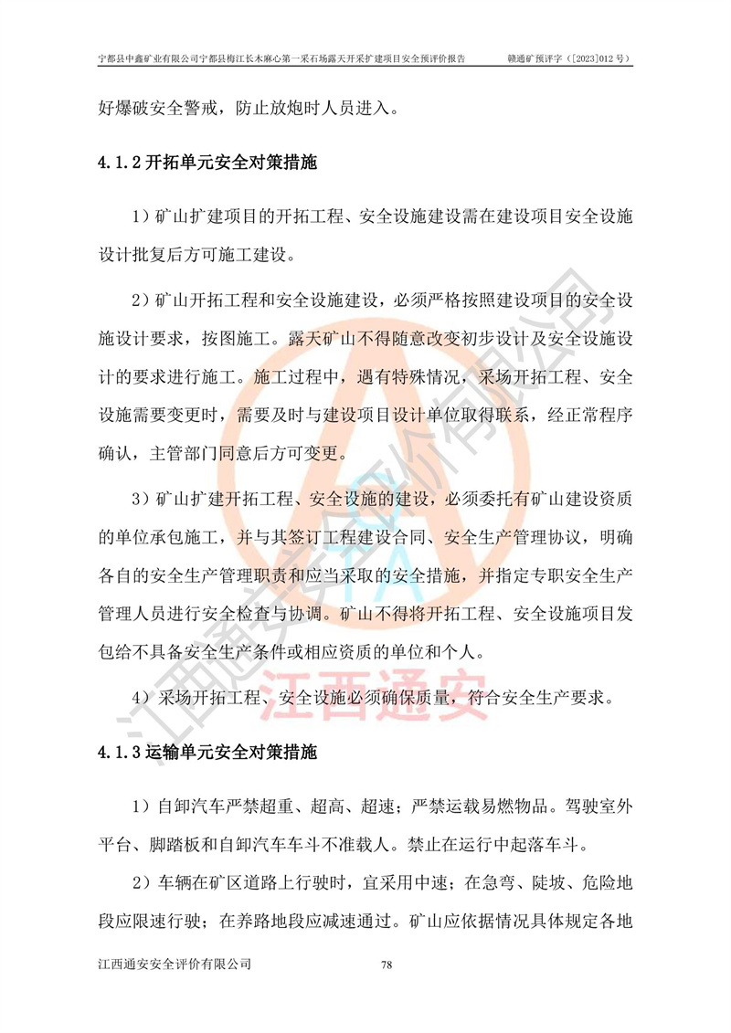 宁都县中鑫矿业有限公司宁都县梅江长木麻心**采石场矿区位于宁都县城南西140°方向,直线距离7**处,矿区大地坐标(2000坐标系):X=2923696.05~2924083.05;Y=39403805.47~39404101.48,行政区划属宁都县梅江长木村管辖。矿区交通条件一般。自矿区沿村村通公路2.5km可到319国道,319国道直达宁都县城。 宁都县中鑫矿业有限公司宁都县梅江长木麻心**采石场此次扩建,原矿区范围由4个拐点圈定,矿区面积0.1146km2,开采面积不变;原设计开采深度+400m~+340m标高,扩深至开采深度+400m~+275m,原开采规模4.9万m3/a(12.25万t/a),扩大至20万m3/a(50万t/a)。 现宁都县梅江长木麻心**采石场采矿权人为宁都县中鑫矿业有限公司,采矿许可证证号C3607302010067120067834,**期2022年12月23日至2023年12月23日。矿区范围由4个拐点圈定,矿区面积0.1146km2,开采深度+400m~+275m标高,开采矿种为建筑用花岗岩,露天开采方式,生产规模20万m3/a。矿山现在属于正常生产矿山,安全生产许可证编号:(赣)FM安许证字[2020]B0126,**期2020年10月26日至2023年10月25日,单位名称:宁都县梅江长木麻心**采石场,主要负责人:李学辉,单位地址赣州市宁都县梅江镇长木村麻心小组,经济类型:私营企业,允许开采深度:+400m~+340m,开采矿种:建筑用花岗岩,开采方式:露天开采,生产规模:4.9万m3/a,设计开采台阶:+390m、+375m、+360m、+350m、+340m等5个台阶,台阶**15m/10m,工作台阶坡面角70°,*终境界边坡角58°。 本项目已经符合编制安全预评价的前置条件。根据《中华人民共和国安全生产法》和《扩建项目安全设施“三同时”监督管理办法》的规定,宁都县中鑫矿业有限公司宁都县梅江长木麻心**采石场于2023年8月委托本公司对宁都县中鑫矿业有限公司宁都县梅江长木麻心**采石场扩建项目进行安全预评价。我公司接受委托后组建了评价项目组,2023年8月31日组织项目评价组人员到项目现场进行勘查,收集矿山安全管理和安全预评价所需的有关资料。 宁都县中鑫矿业有限公司宁都县梅江长木麻心**采石场扩建项目中存在的主要危险因素:滑坡和坍塌、爆破伤害、**伤害、高处坠落、物体打击、触电、机械伤害、 起重伤害、火灾、水灾、容器爆炸、中毒和窒息。本评价项目应重点防范的危险因素:滑坡和坍塌、爆破伤害、**伤害、高处坠落、机械伤害。宁都县中鑫矿业有限公司宁都县梅江长木麻心**采石场扩建项目从安全生产角度符合**有关安全生产法律、法规、规章、标准和规范的要求,风险可以接受。 |