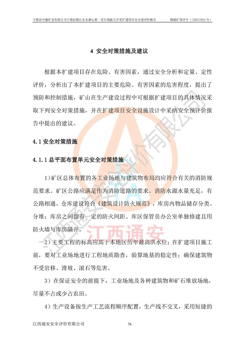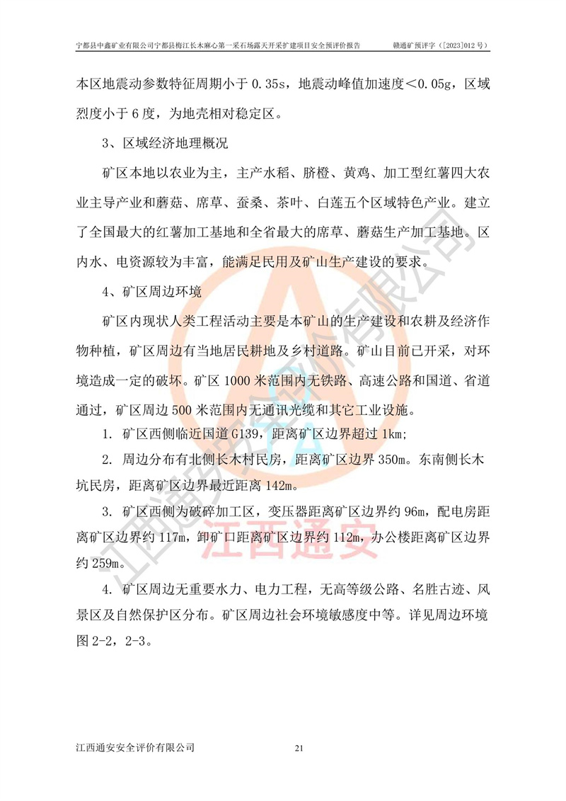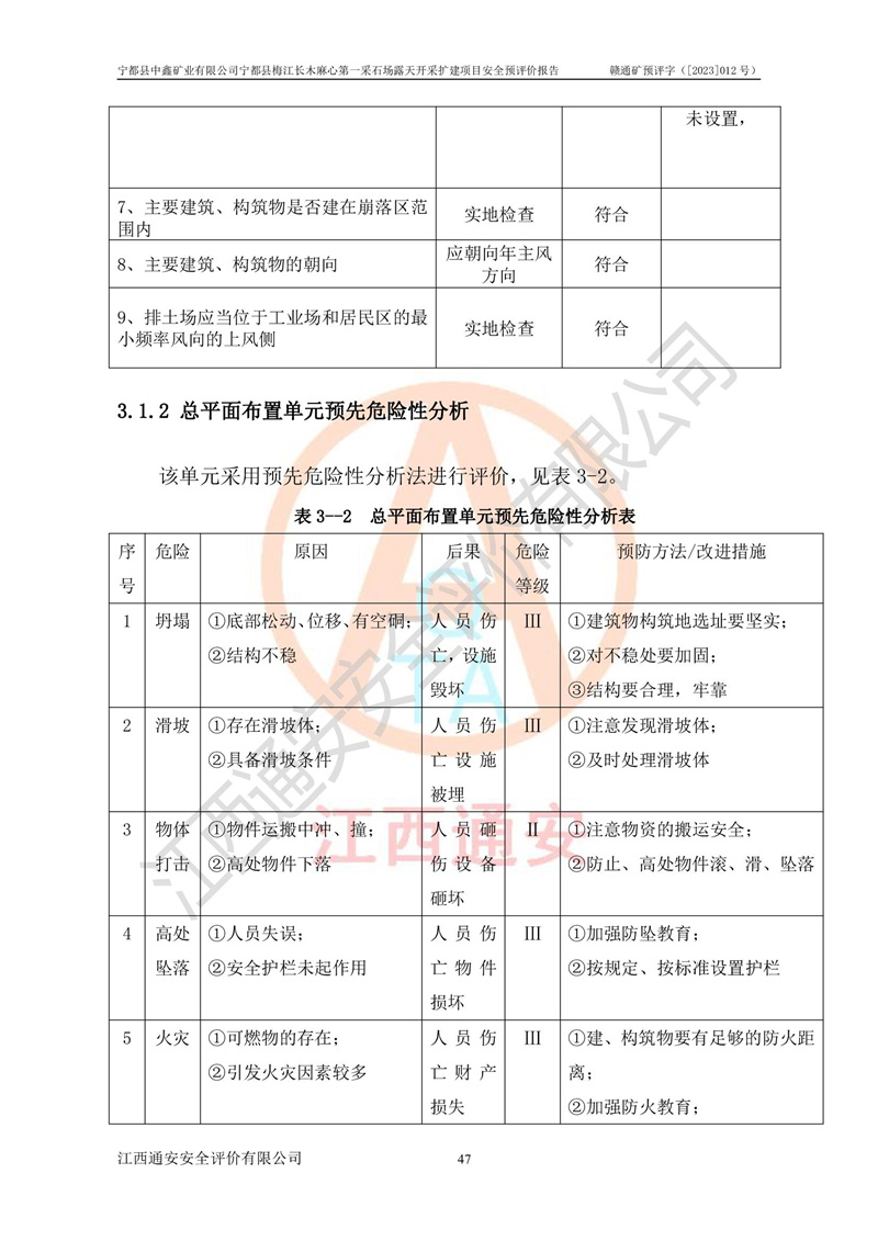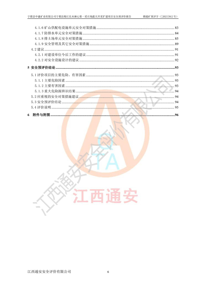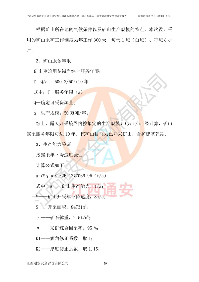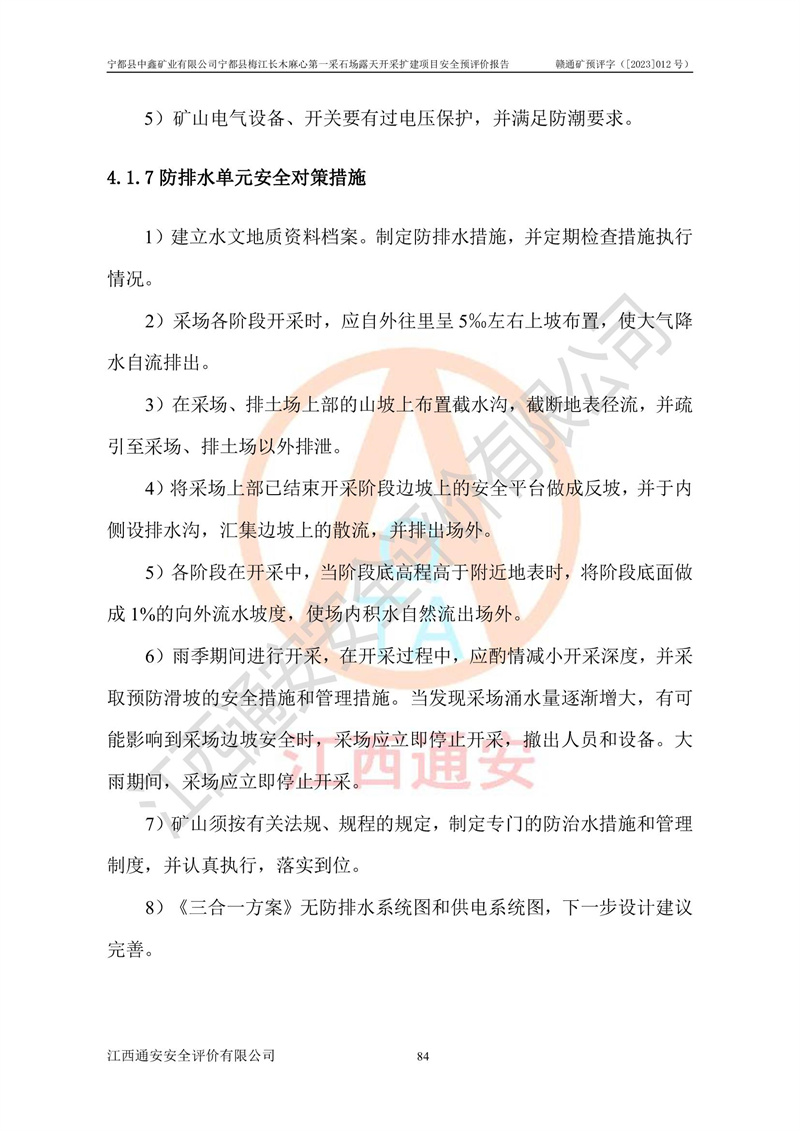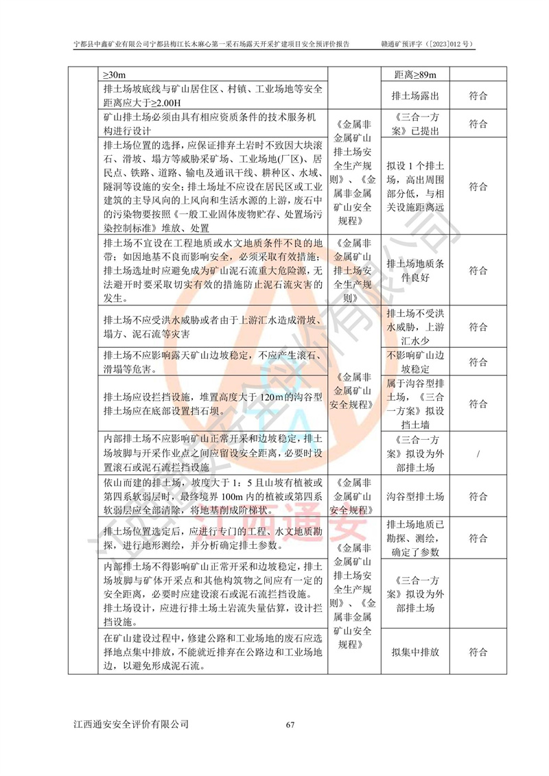 宁都县中鑫矿业有限公司宁都县梅江长木麻心**采石场矿区位于宁都县城南西140°方向,直线距离7**处,矿区大地坐标(2000坐标系):X=2923696.05~2924083.05;Y=39403805.47~39404101.48,行政区划属宁都县梅江长木村管辖。矿区交通条件一般。自矿区沿村村通公路2.5km可到319国道,319国道直达宁都县城。 宁都县中鑫矿业有限公司宁都县梅江长木麻心**采石场此次扩建,原矿区范围由4个拐点圈定,矿区面积0.1146km2,开采面积不变;原设计开采深度+400m~+340m标高,扩深至开采深度+400m~+275m,原开采规模4.9万m3/a(12.25万t/a),扩大至20万m3/a(50万t/a)。 现宁都县梅江长木麻心**采石场采矿权人为宁都县中鑫矿业有限公司,采矿许可证证号C3607302010067120067834,**期2022年12月23日至2023年12月23日。矿区范围由4个拐点圈定,矿区面积0.1146km2,开采深度+400m~+275m标高,开采矿种为建筑用花岗岩,露天开采方式,生产规模20万m3/a。矿山现在属于正常生产矿山,安全生产许可证编号:(赣)FM安许证字[2020]B0126,**期2020年10月26日至2023年10月25日,单位名称:宁都县梅江长木麻心**采石场,主要负责人:李学辉,单位地址赣州市宁都县梅江镇长木村麻心小组,经济类型:私营企业,允许开采深度:+400m~+340m,开采矿种:建筑用花岗岩,开采方式:露天开采,生产规模:4.9万m3/a,设计开采台阶:+390m、+375m、+360m、+350m、+340m等5个台阶,台阶**15m/10m,工作台阶坡面角70°,*终境界边坡角58°。 本项目已经符合编制安全预评价的前置条件。根据《中华人民共和国安全生产法》和《扩建项目安全设施“三同时”监督管理办法》的规定,宁都县中鑫矿业有限公司宁都县梅江长木麻心**采石场于2023年8月委托本公司对宁都县中鑫矿业有限公司宁都县梅江长木麻心**采石场扩建项目进行安全预评价。我公司接受委托后组建了评价项目组,2023年8月31日组织项目评价组人员到项目现场进行勘查,收集矿山安全管理和安全预评价所需的有关资料。 宁都县中鑫矿业有限公司宁都县梅江长木麻心**采石场扩建项目中存在的主要危险因素:滑坡和坍塌、爆破伤害、**伤害、高处坠落、物体打击、触电、机械伤害、 起重伤害、火灾、水灾、容器爆炸、中毒和窒息。本评价项目应重点防范的危险因素:滑坡和坍塌、爆破伤害、**伤害、高处坠落、机械伤害。宁都县中鑫矿业有限公司宁都县梅江长木麻心**采石场扩建项目从安全生产角度符合**有关安全生产法律、法规、规章、标准和规范的要求,风险可以接受。 |