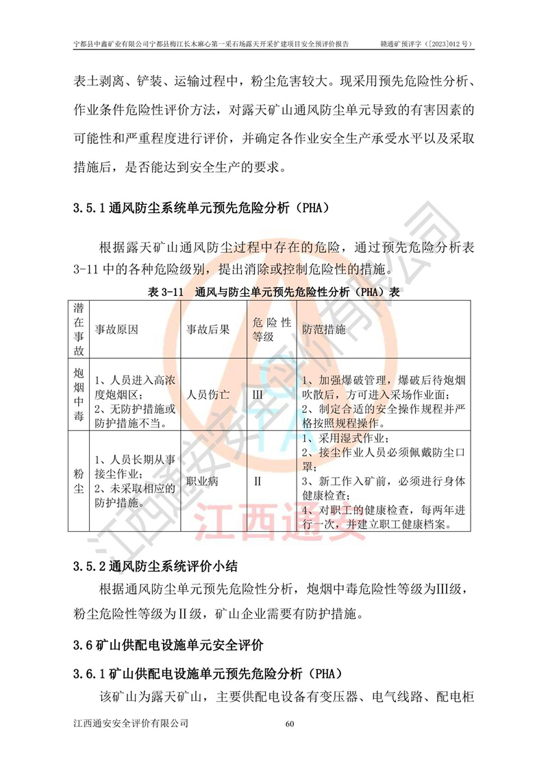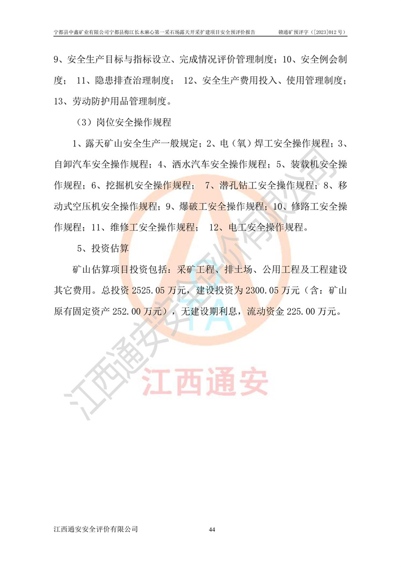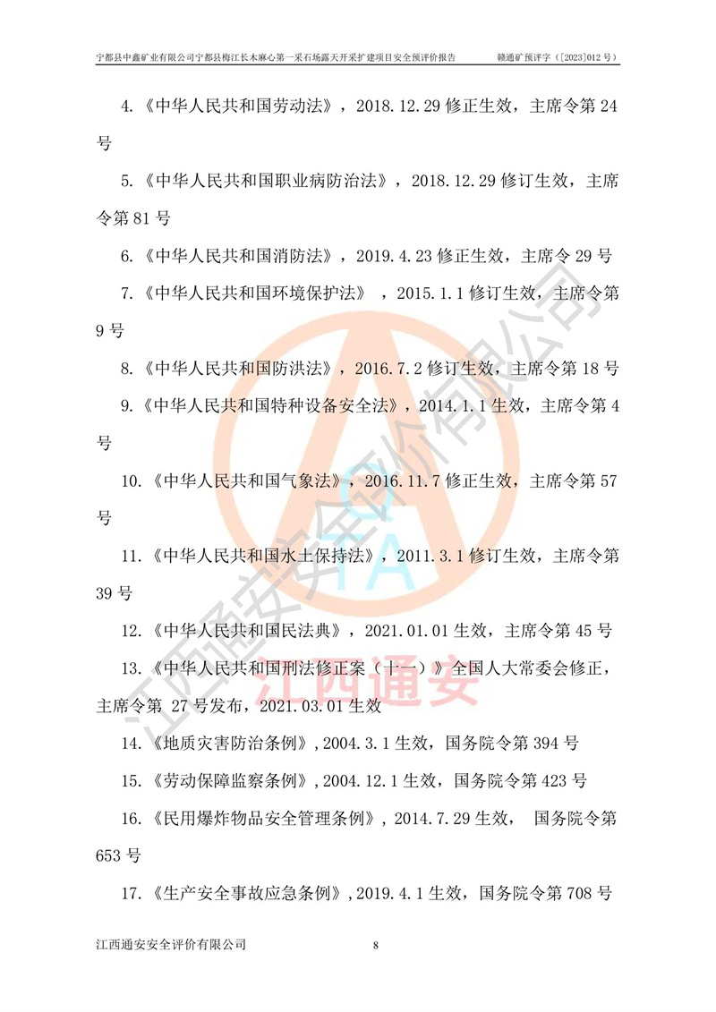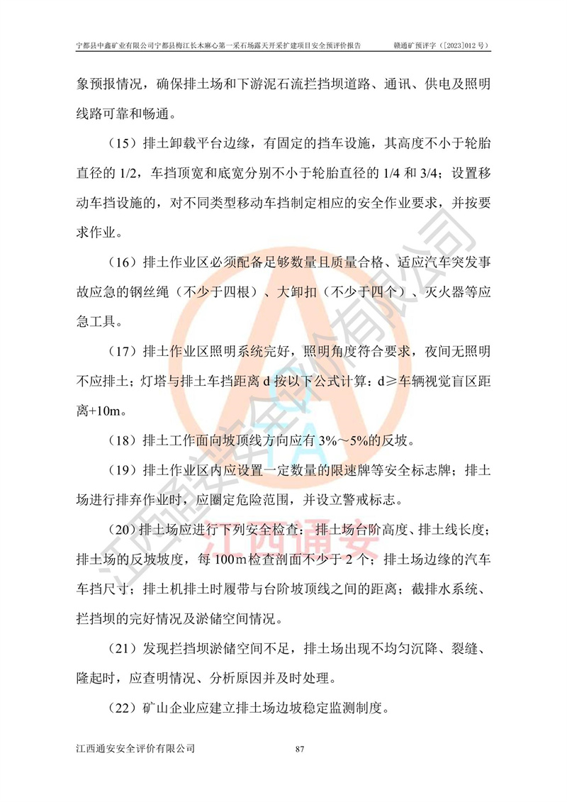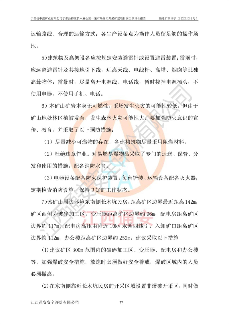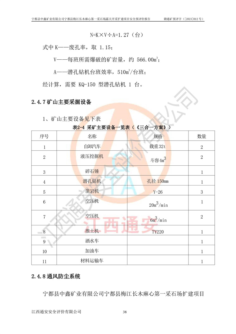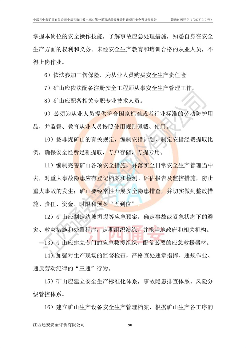 宁都县中鑫矿业有限公司宁都县梅江长木麻心**采石场矿区位于宁都县城南西140°方向,直线距离7**处,矿区大地坐标(2000坐标系):X=2923696.05~2924083.05;Y=39403805.47~39404101.48,行政区划属宁都县梅江长木村管辖。矿区交通条件一般。自矿区沿村村通公路2.5km可到319国道,319国道直达宁都县城。 宁都县中鑫矿业有限公司宁都县梅江长木麻心**采石场此次扩建,原矿区范围由4个拐点圈定,矿区面积0.1146km2,开采面积不变;原设计开采深度+400m~+340m标高,扩深至开采深度+400m~+275m,原开采规模4.9万m3/a(12.25万t/a),扩大至20万m3/a(50万t/a)。 现宁都县梅江长木麻心**采石场采矿权人为宁都县中鑫矿业有限公司,采矿许可证证号C3607302010067120067834,**期2022年12月23日至2023年12月23日。矿区范围由4个拐点圈定,矿区面积0.1146km2,开采深度+400m~+275m标高,开采矿种为建筑用花岗岩,露天开采方式,生产规模20万m3/a。矿山现在属于正常生产矿山,安全生产许可证编号:(赣)FM安许证字[2020]B0126,**期2020年10月26日至2023年10月25日,单位名称:宁都县梅江长木麻心**采石场,主要负责人:李学辉,单位地址赣州市宁都县梅江镇长木村麻心小组,经济类型:私营企业,允许开采深度:+400m~+340m,开采矿种:建筑用花岗岩,开采方式:露天开采,生产规模:4.9万m3/a,设计开采台阶:+390m、+375m、+360m、+350m、+340m等5个台阶,台阶**15m/10m,工作台阶坡面角70°,*终境界边坡角58°。 本项目已经符合编制安全预评价的前置条件。根据《中华人民共和国安全生产法》和《扩建项目安全设施“三同时”监督管理办法》的规定,宁都县中鑫矿业有限公司宁都县梅江长木麻心**采石场于2023年8月委托本公司对宁都县中鑫矿业有限公司宁都县梅江长木麻心**采石场扩建项目进行安全预评价。我公司接受委托后组建了评价项目组,2023年8月31日组织项目评价组人员到项目现场进行勘查,收集矿山安全管理和安全预评价所需的有关资料。 宁都县中鑫矿业有限公司宁都县梅江长木麻心**采石场扩建项目中存在的主要危险因素:滑坡和坍塌、爆破伤害、**伤害、高处坠落、物体打击、触电、机械伤害、 起重伤害、火灾、水灾、容器爆炸、中毒和窒息。本评价项目应重点防范的危险因素:滑坡和坍塌、爆破伤害、**伤害、高处坠落、机械伤害。宁都县中鑫矿业有限公司宁都县梅江长木麻心**采石场扩建项目从安全生产角度符合**有关安全生产法律、法规、规章、标准和规范的要求,风险可以接受。 |