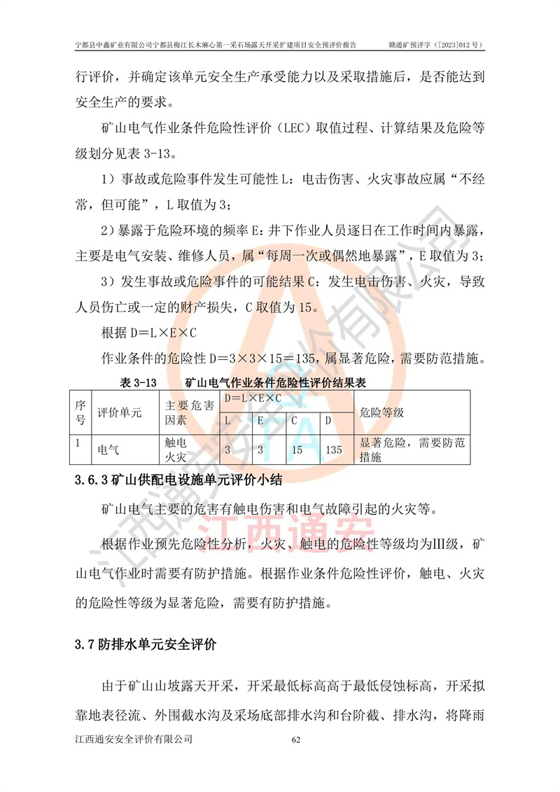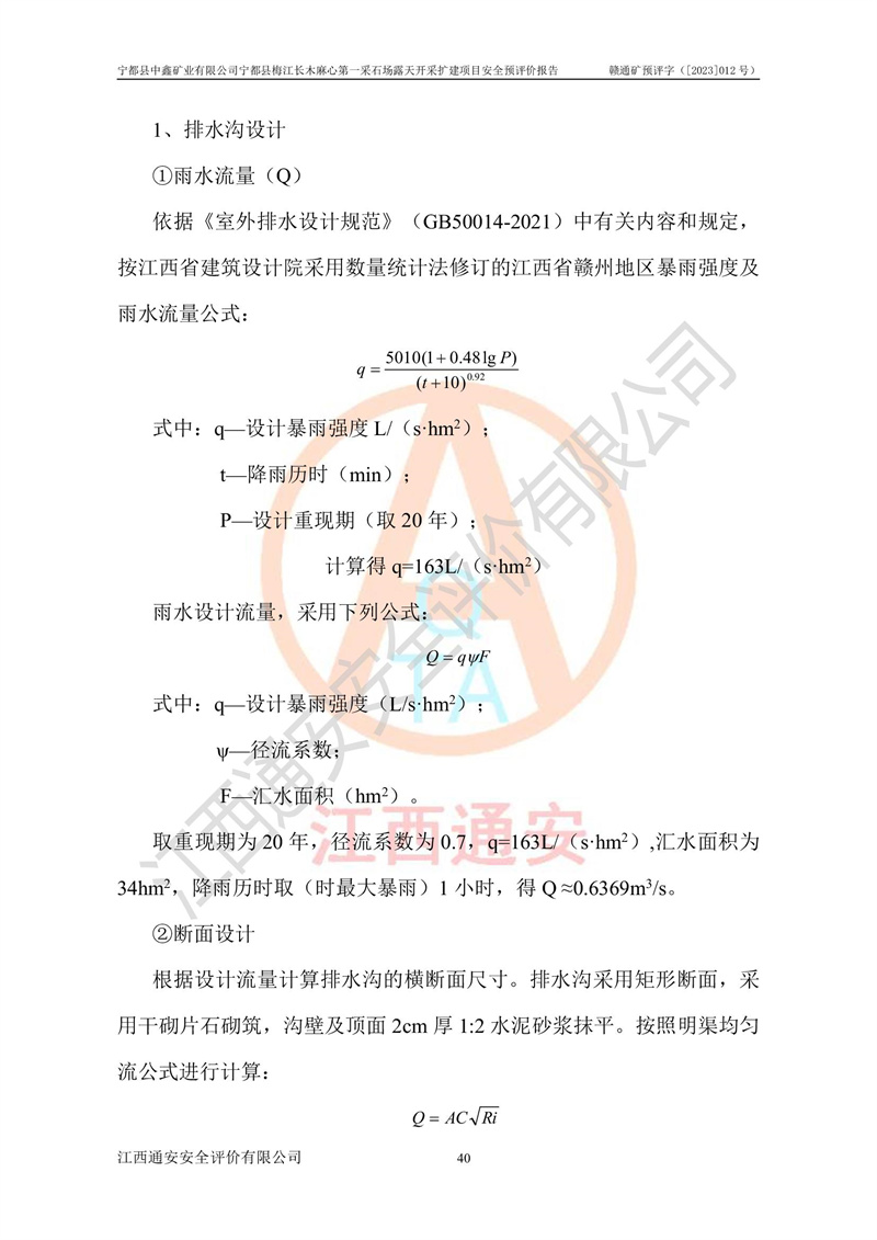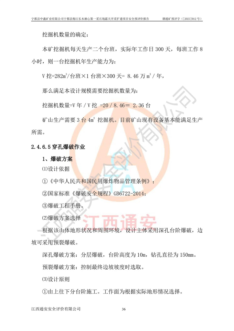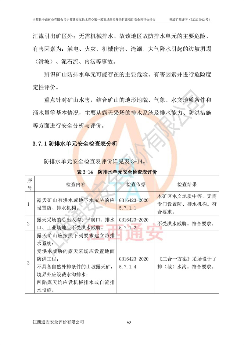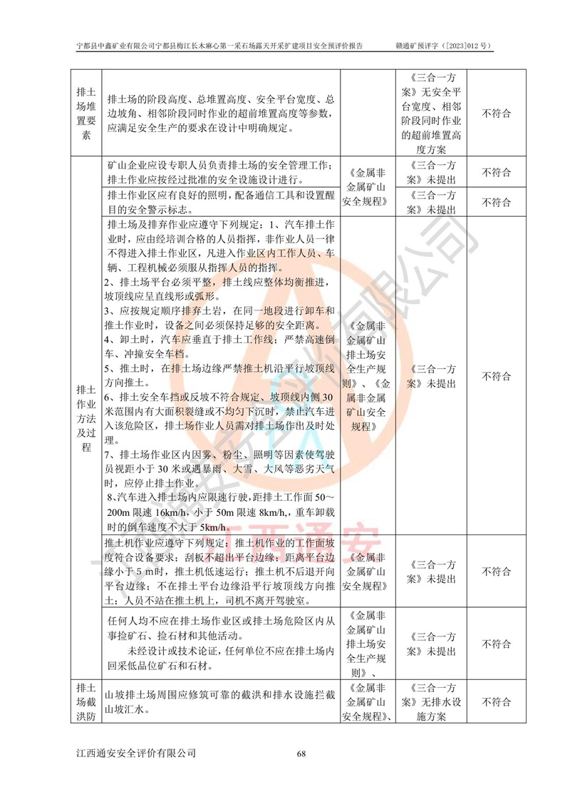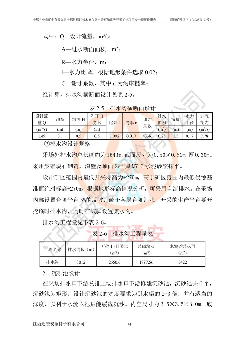 宁都县中鑫矿业有限公司宁都县梅江长木麻心**采石场矿区位于宁都县城南西140°方向,直线距离7**处,矿区大地坐标(2000坐标系):X=2923696.05~2924083.05;Y=39403805.47~39404101.48,行政区划属宁都县梅江长木村管辖。矿区交通条件一般。自矿区沿村村通公路2.5km可到319国道,319国道直达宁都县城。 宁都县中鑫矿业有限公司宁都县梅江长木麻心**采石场此次扩建,原矿区范围由4个拐点圈定,矿区面积0.1146km2,开采面积不变;原设计开采深度+400m~+340m标高,扩深至开采深度+400m~+275m,原开采规模4.9万m3/a(12.25万t/a),扩大至20万m3/a(50万t/a)。 现宁都县梅江长木麻心**采石场采矿权人为宁都县中鑫矿业有限公司,采矿许可证证号C3607302010067120067834,**期2022年12月23日至2023年12月23日。矿区范围由4个拐点圈定,矿区面积0.1146km2,开采深度+400m~+275m标高,开采矿种为建筑用花岗岩,露天开采方式,生产规模20万m3/a。矿山现在属于正常生产矿山,安全生产许可证编号:(赣)FM安许证字[2020]B0126,**期2020年10月26日至2023年10月25日,单位名称:宁都县梅江长木麻心**采石场,主要负责人:李学辉,单位地址赣州市宁都县梅江镇长木村麻心小组,经济类型:私营企业,允许开采深度:+400m~+340m,开采矿种:建筑用花岗岩,开采方式:露天开采,生产规模:4.9万m3/a,设计开采台阶:+390m、+375m、+360m、+350m、+340m等5个台阶,台阶**15m/10m,工作台阶坡面角70°,*终境界边坡角58°。 本项目已经符合编制安全预评价的前置条件。根据《中华人民共和国安全生产法》和《扩建项目安全设施“三同时”监督管理办法》的规定,宁都县中鑫矿业有限公司宁都县梅江长木麻心**采石场于2023年8月委托本公司对宁都县中鑫矿业有限公司宁都县梅江长木麻心**采石场扩建项目进行安全预评价。我公司接受委托后组建了评价项目组,2023年8月31日组织项目评价组人员到项目现场进行勘查,收集矿山安全管理和安全预评价所需的有关资料。 宁都县中鑫矿业有限公司宁都县梅江长木麻心**采石场扩建项目中存在的主要危险因素:滑坡和坍塌、爆破伤害、**伤害、高处坠落、物体打击、触电、机械伤害、 起重伤害、火灾、水灾、容器爆炸、中毒和窒息。本评价项目应重点防范的危险因素:滑坡和坍塌、爆破伤害、**伤害、高处坠落、机械伤害。宁都县中鑫矿业有限公司宁都县梅江长木麻心**采石场扩建项目从安全生产角度符合**有关安全生产法律、法规、规章、标准和规范的要求,风险可以接受。 |