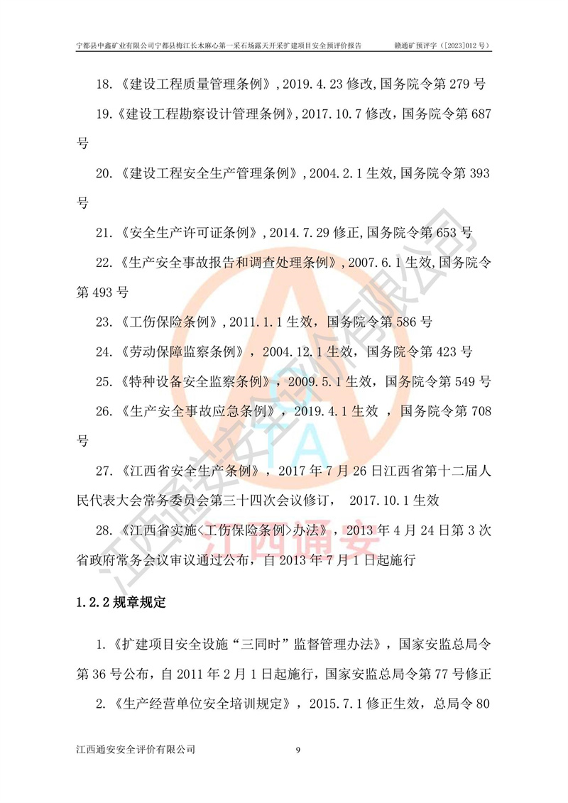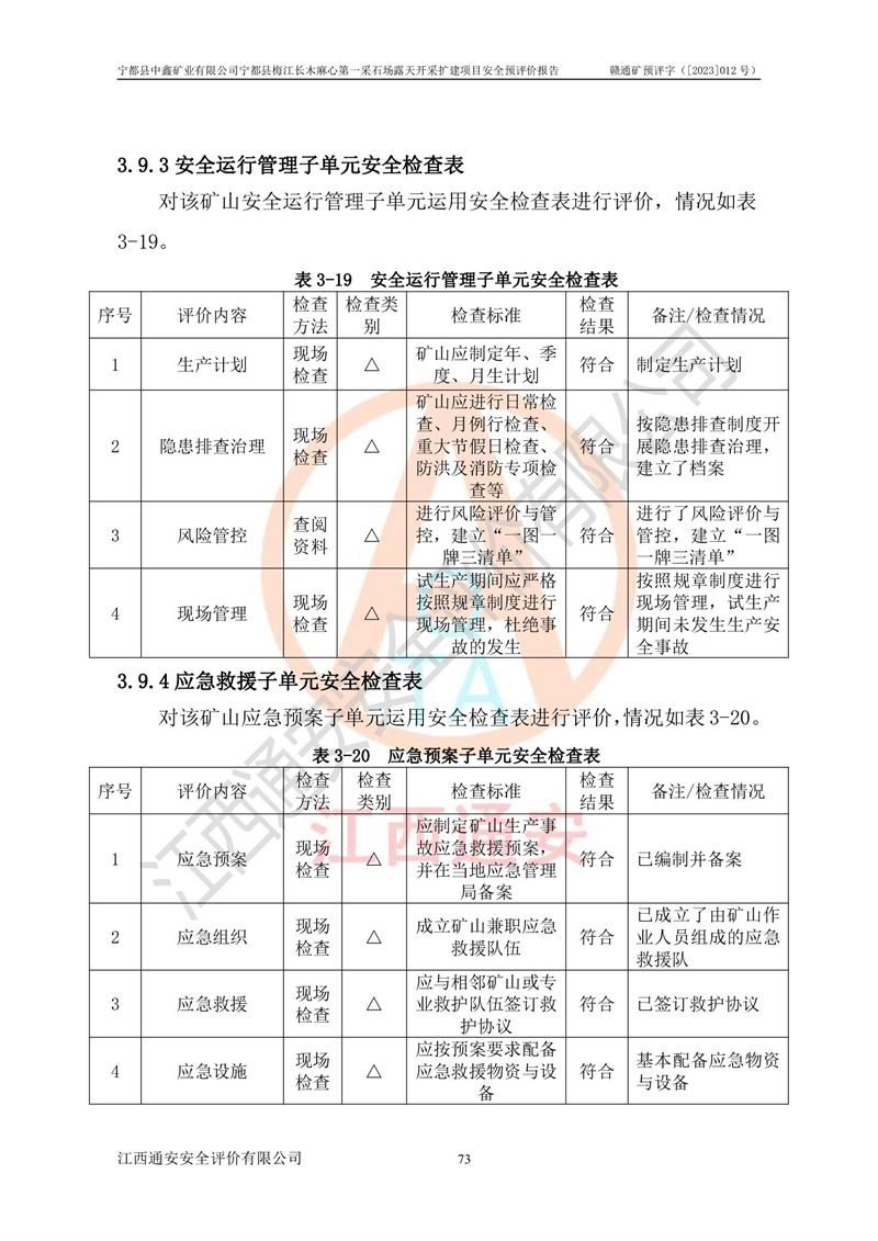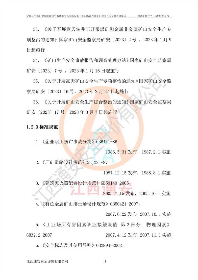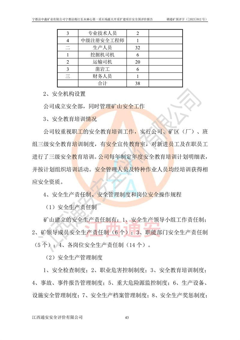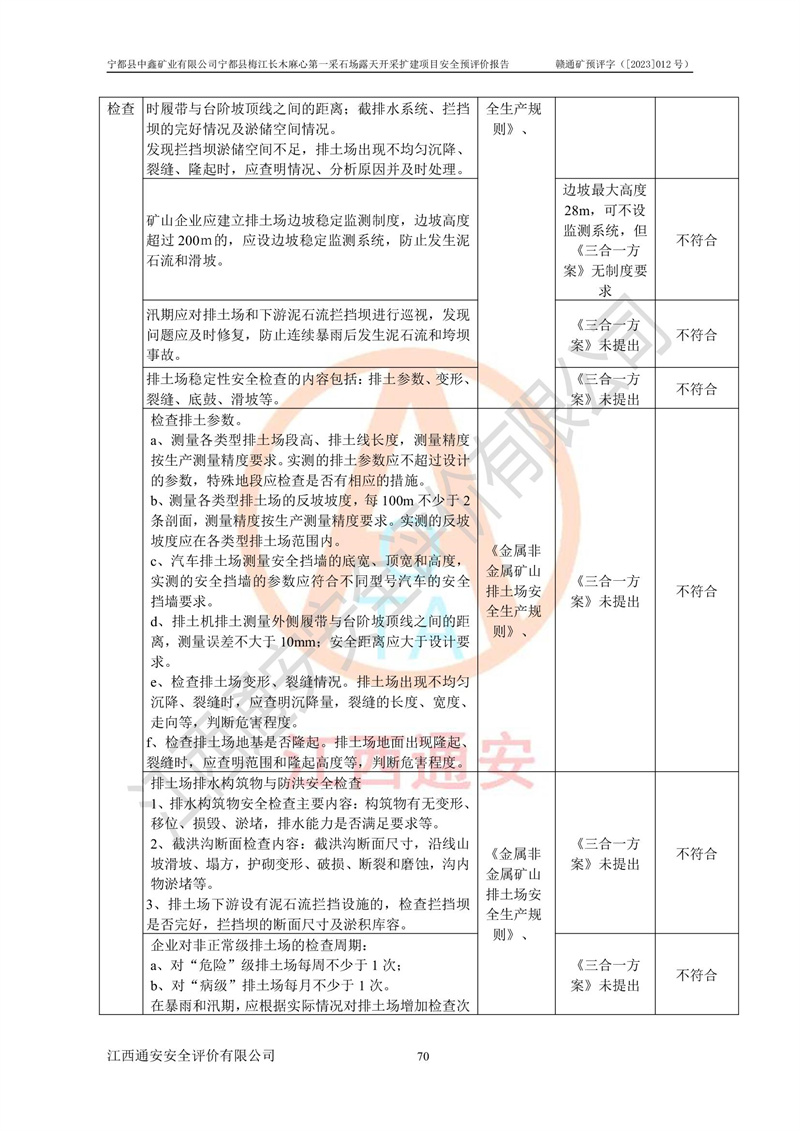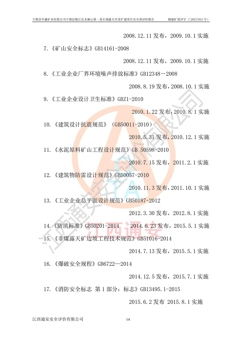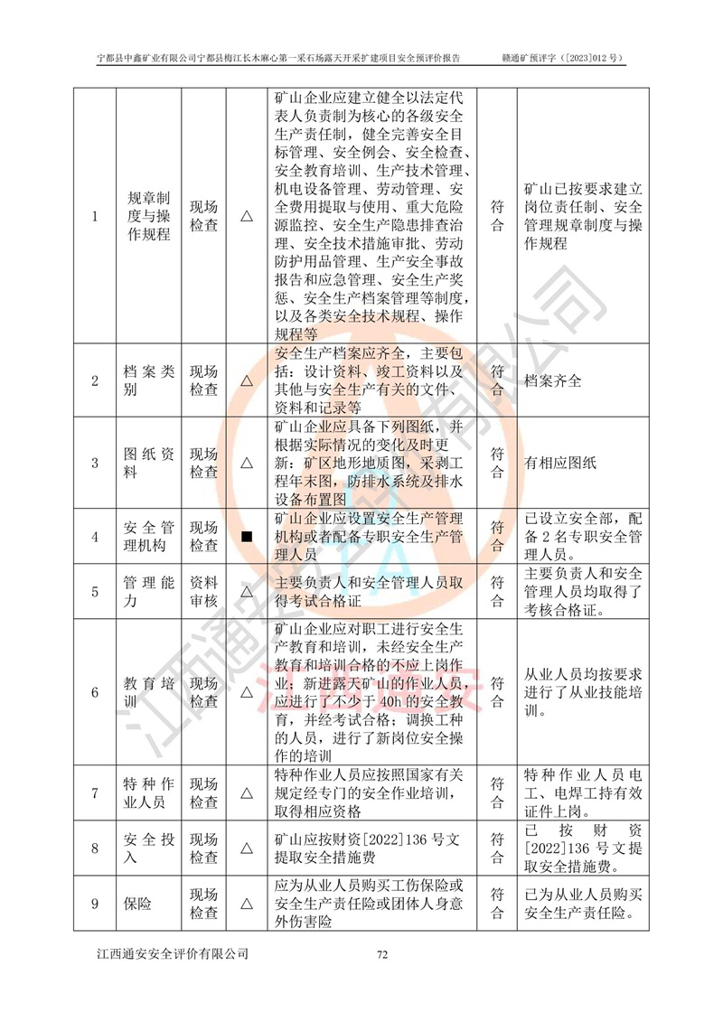宁都县中鑫矿业有限公司宁都县梅江长木麻心**采石场矿区位于宁都县城南西140°方向,直线距离7**处,矿区大地坐标(2000坐标系):X=2923696.05~2924083.05;Y=39403805.47~39404101.48,行政区划属宁都县梅江长木村管辖。矿区交通条件一般。自矿区沿村村通公路2.5km可到319国道,319国道直达宁都县城。 宁都县中鑫矿业有限公司宁都县梅江长木麻心**采石场此次扩建,原矿区范围由4个拐点圈定,矿区面积0.1146km2,开采面积不变;原设计开采深度+400m~+340m标高,扩深至开采深度+400m~+275m,原开采规模4.9万m3/a(12.25万t/a),扩大至20万m3/a(50万t/a)。 现宁都县梅江长木麻心**采石场采矿权人为宁都县中鑫矿业有限公司,采矿许可证证号C3607302010067120067834,**期2022年12月23日至2023年12月23日。矿区范围由4个拐点圈定,矿区面积0.1146km2,开采深度+400m~+275m标高,开采矿种为建筑用花岗岩,露天开采方式,生产规模20万m3/a。矿山现在属于正常生产矿山,安全生产许可证编号:(赣)FM安许证字[2020]B0126,**期2020年10月26日至2023年10月25日,单位名称:宁都县梅江长木麻心**采石场,主要负责人:李学辉,单位地址赣州市宁都县梅江镇长木村麻心小组,经济类型:私营企业,允许开采深度:+400m~+340m,开采矿种:建筑用花岗岩,开采方式:露天开采,生产规模:4.9万m3/a,设计开采台阶:+390m、+375m、+360m、+350m、+340m等5个台阶,台阶**15m/10m,工作台阶坡面角70°,*终境界边坡角58°。 本项目已经符合编制安全预评价的前置条件。根据《中华人民共和国安全生产法》和《扩建项目安全设施“三同时”监督管理办法》的规定,宁都县中鑫矿业有限公司宁都县梅江长木麻心**采石场于2023年8月委托本公司对宁都县中鑫矿业有限公司宁都县梅江长木麻心**采石场扩建项目进行安全预评价。我公司接受委托后组建了评价项目组,2023年8月31日组织项目评价组人员到项目现场进行勘查,收集矿山安全管理和安全预评价所需的有关资料。 宁都县中鑫矿业有限公司宁都县梅江长木麻心**采石场扩建项目中存在的主要危险因素:滑坡和坍塌、爆破伤害、**伤害、高处坠落、物体打击、触电、机械伤害、 起重伤害、火灾、水灾、容器爆炸、中毒和窒息。本评价项目应重点防范的危险因素:滑坡和坍塌、爆破伤害、**伤害、高处坠落、机械伤害。宁都县中鑫矿业有限公司宁都县梅江长木麻心**采石场扩建项目从安全生产角度符合**有关安全生产法律、法规、规章、标准和规范的要求,风险可以接受。 |